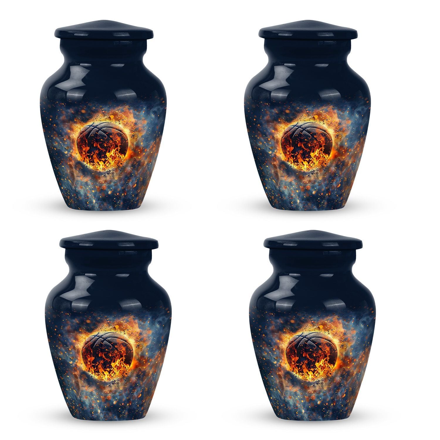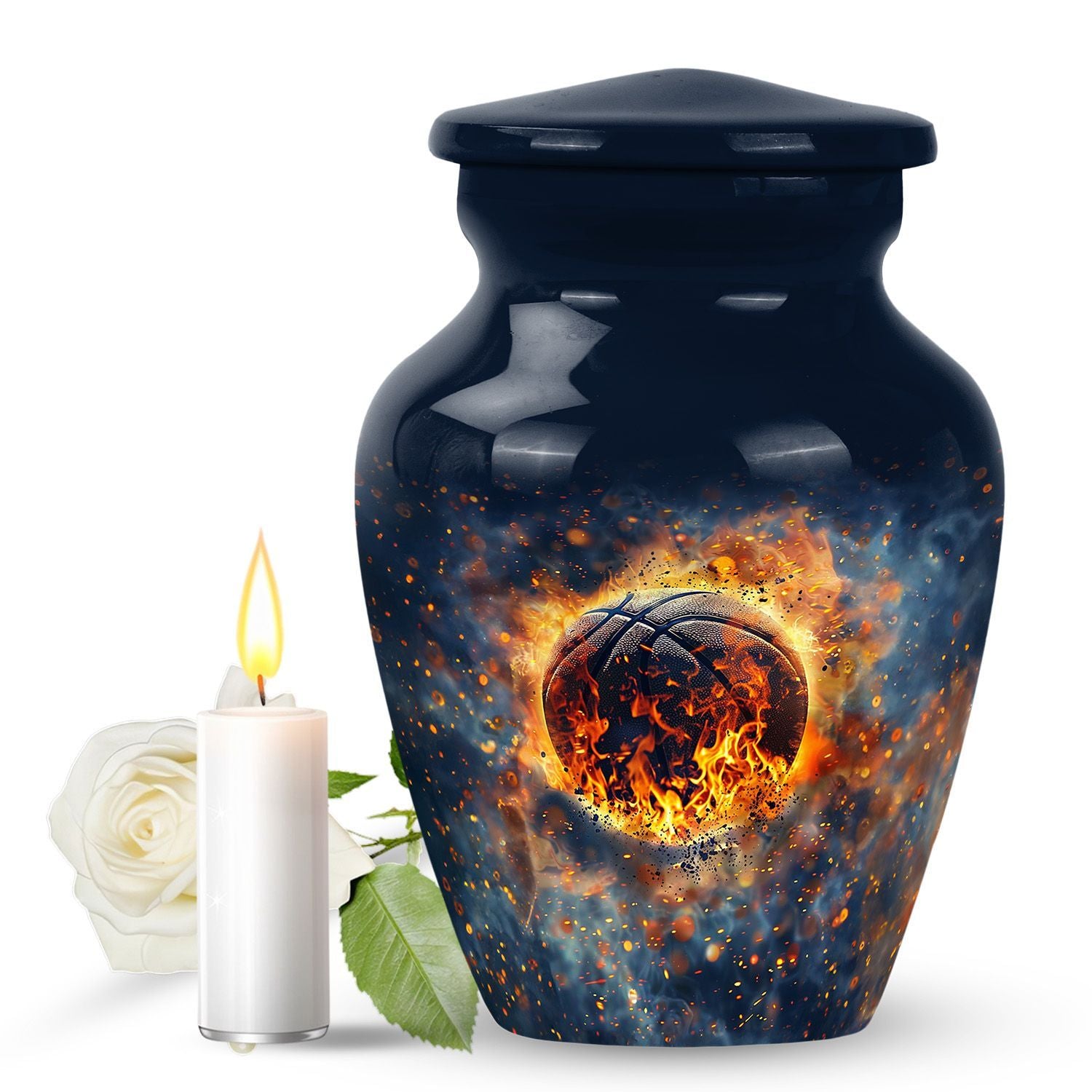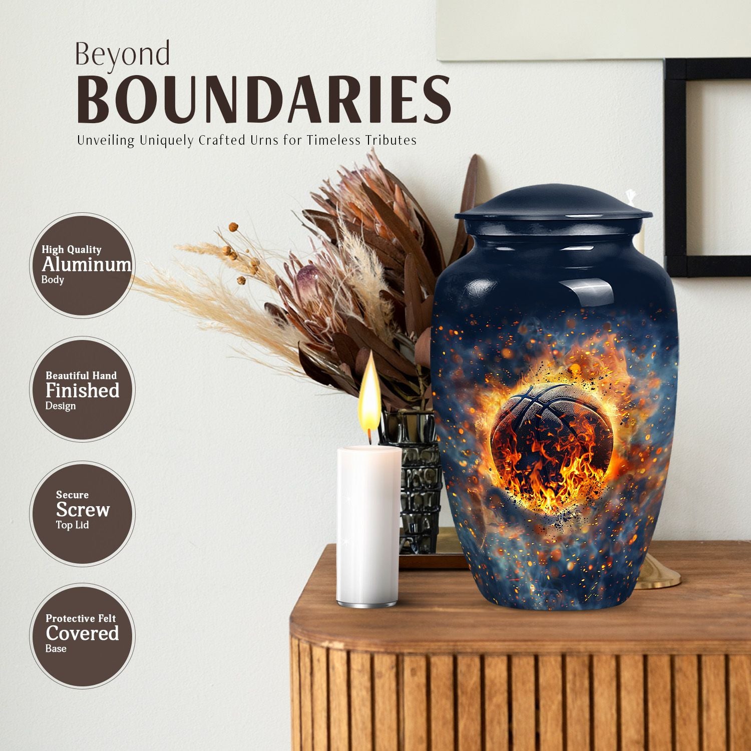 Honor your loved ones with this 10 inch, refined Basketball Urn – a testament to the eternity of their memory. Crafted meticulously from premium quality aluminium, this classic urn balances the aesthetic charm with long lasting durability and is notably large in size to accommodate up to 200 cubic inches of ashes. The breath-taking abstract theme seamlessly builds a heartfelt tribute to your cherished ones. It weighs a substantial 3.3 pounds testifying to the robust construction of this funeral decorative urn. What’s more, each urn comes accompanied with a soft velvet pouch, ensuring tender containment of the ashes. To add a personal touch, this urn can be customized with engraved names, capturing the essence of memories that last forever. Ideal for all seniors looking for memorial urns for human ashes, catering specifically to adult female, male and even used as a ceremonial mother urn. A beautiful way to remember, and a graceful centerpiece for any memorial ceremony.