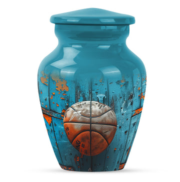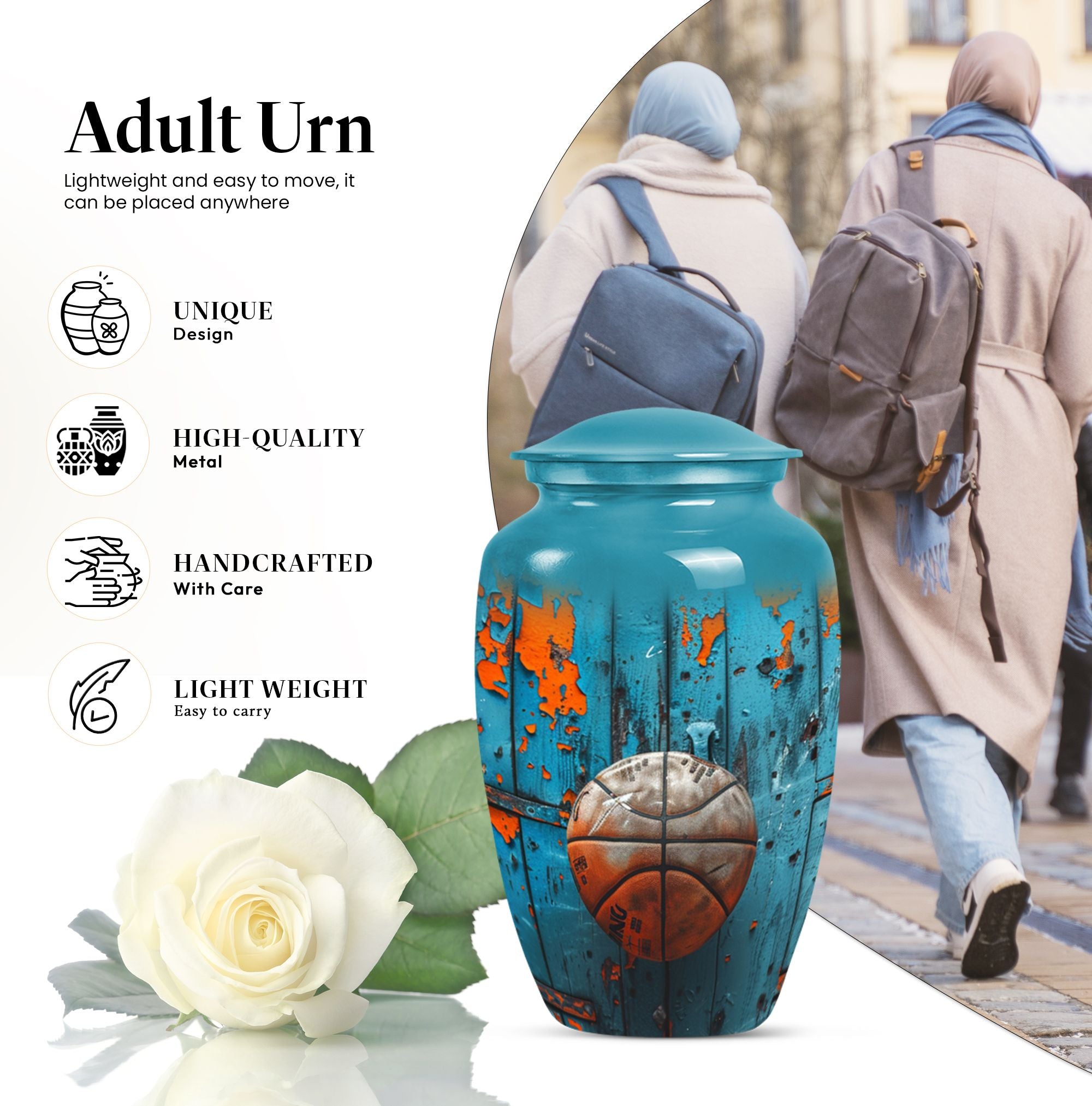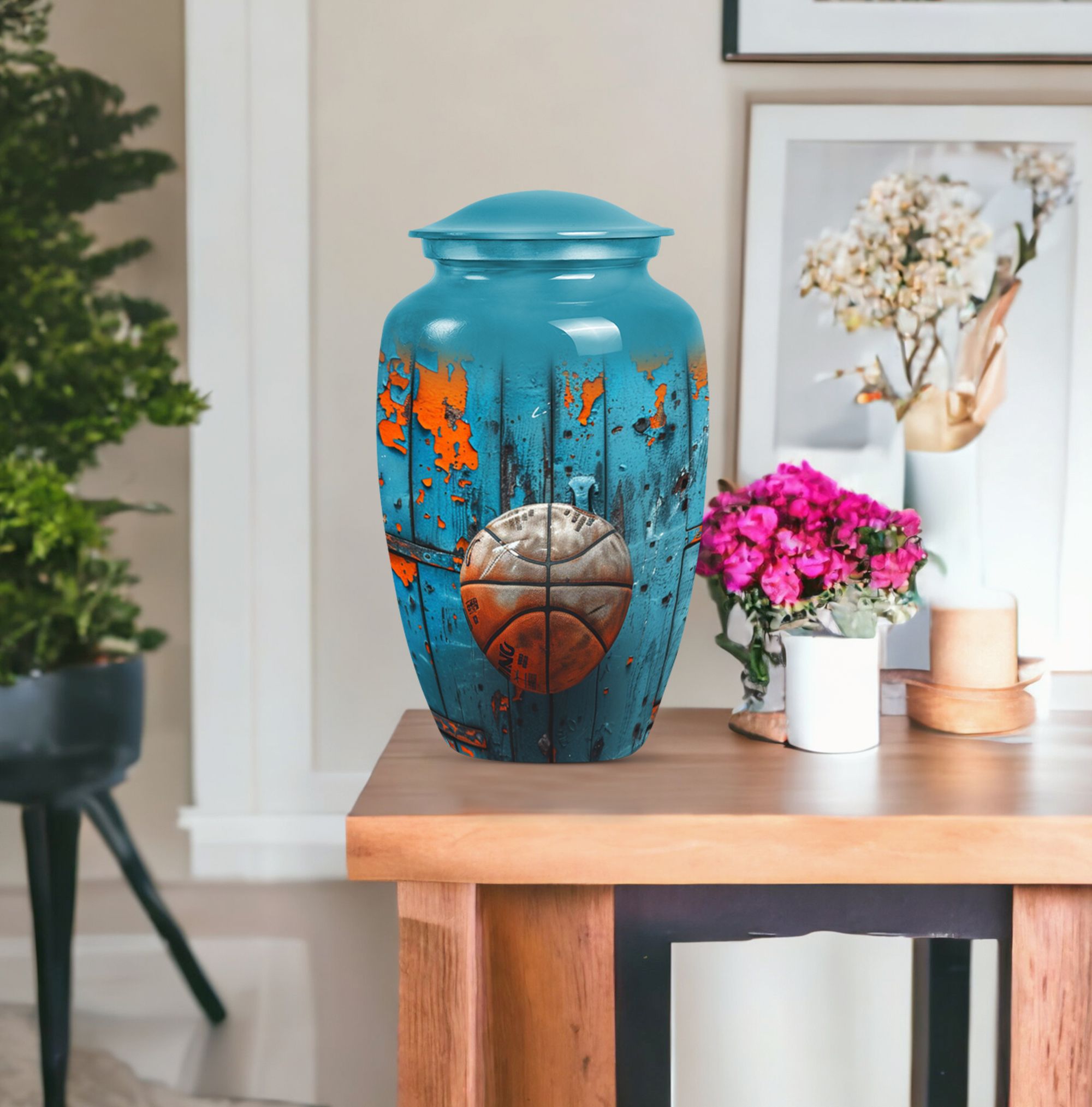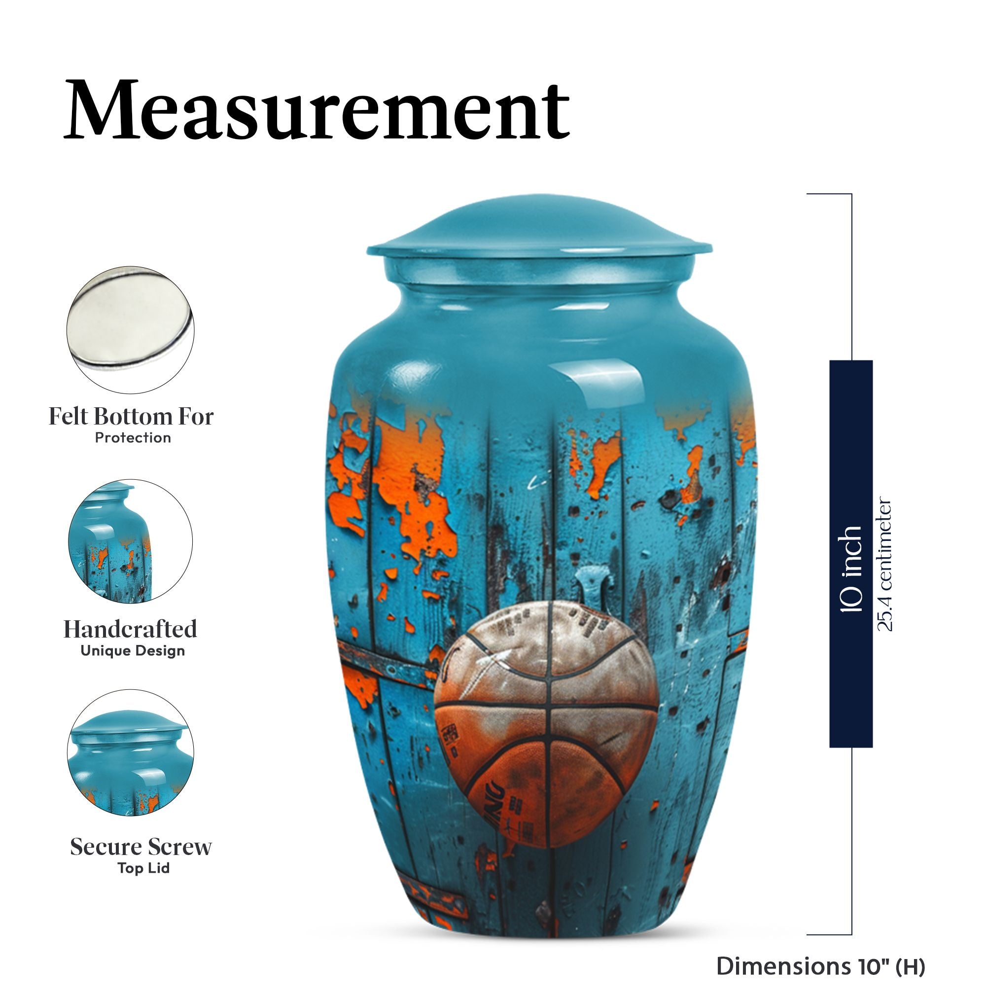 Find solace during trying times through our 10-inch Basketball Urn. It's designed as a poignant tribute to those with love for the sport, serving as an exquisite receptacle for their cherished remains. Crafted from high-quality, durable aluminium, the urn weighs 3.3 pounds and can hold up to 200 cubic inches of ashes. To facilitate a smooth personal remembrance process, the urn comes with a velvet pouch for containment of ashes, offering a comforting touch. Enhanced further with an enchanting butterfly theme, this large urn carries a depth of sentiment that's palpable. Complimentary personalization is also available - you can etch names into this classic urn. This unique keepsake serves well in funeral burial ceremonies and memorial observances. Our basketball urn is more than a vessel, it's a testament to a life cherished and remembered. Key search terms include 'basketball urn', 'funeral burial urns', 'memorial urns', 'Large Urns', 'Memorial large urns for human ashes', 'urn human ash urn ash', 'urn', and 'adult cremation urns'.