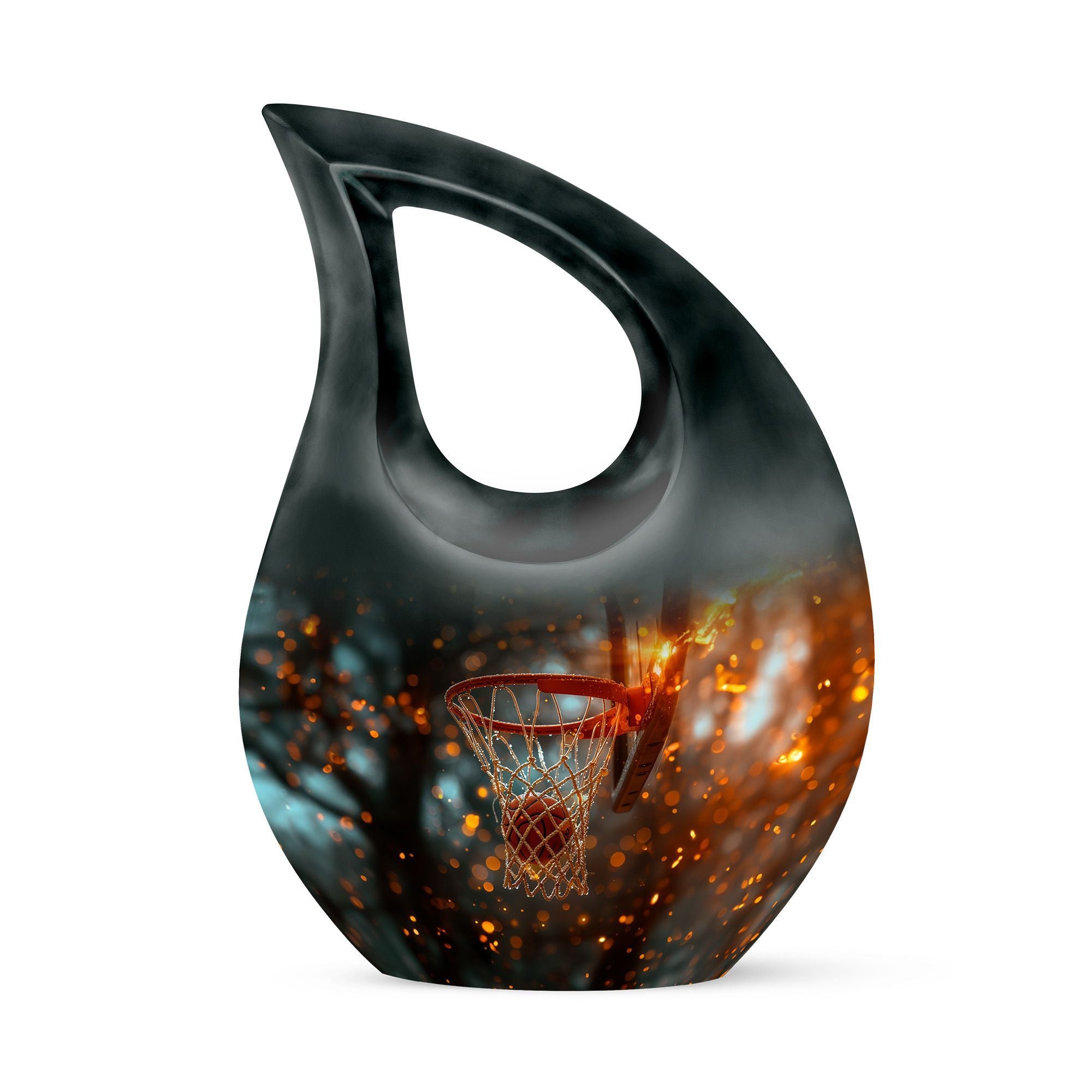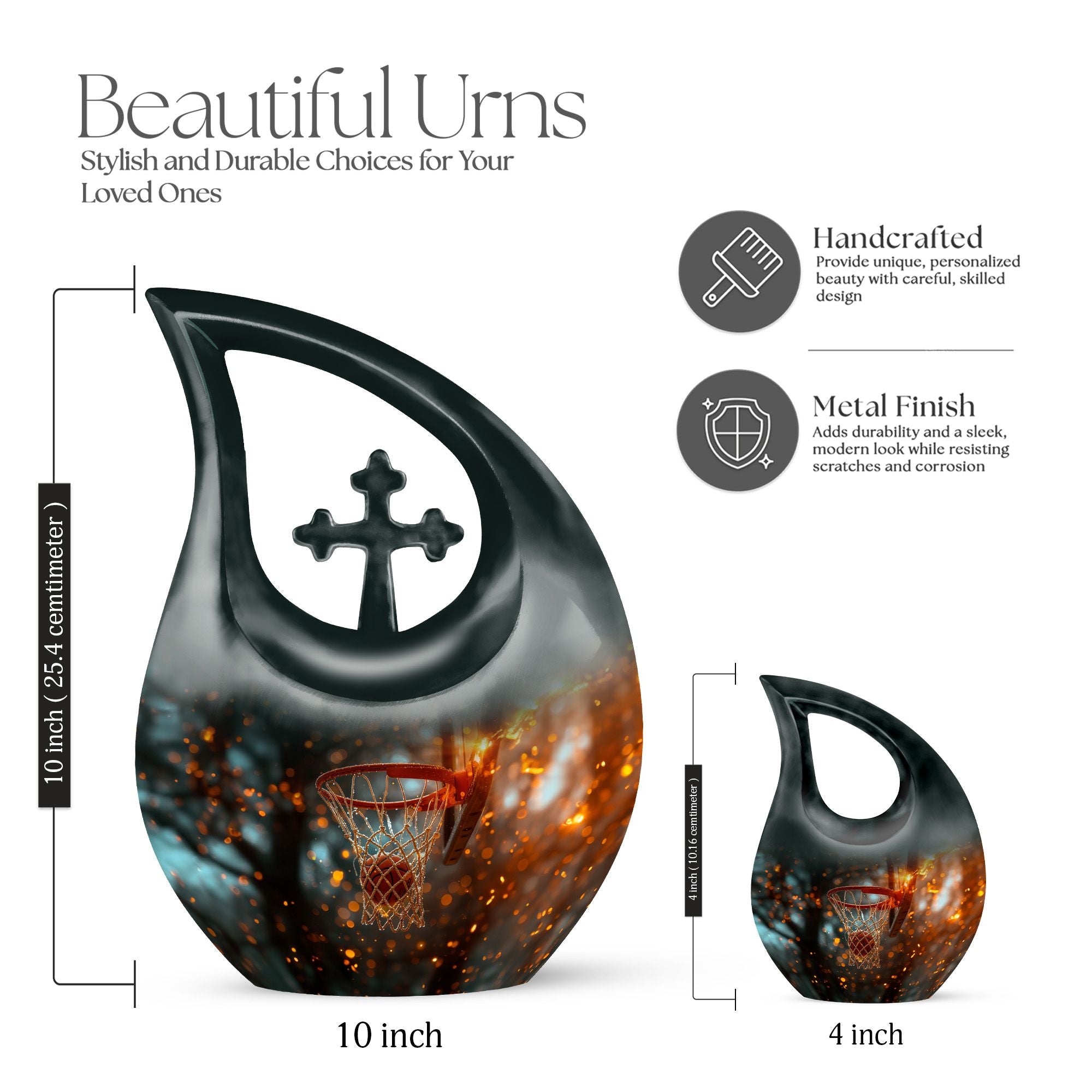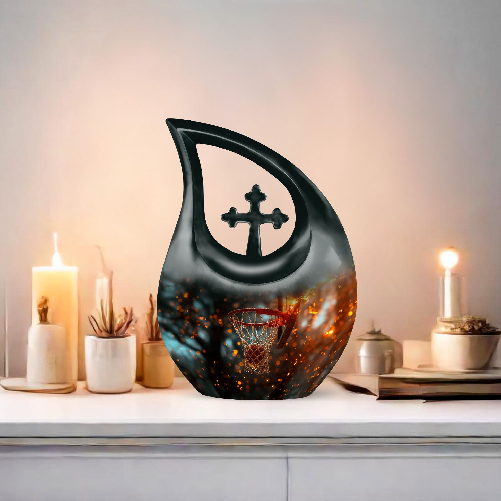 Our Basketball Urn is a perfect resting place for basketball enthusiasts, with a distinct Cross Drop design. This not-so-ordinary Large Urn measures 10 inches in height and weighs a solid 3.3 pounds. Encased in durable aluminium, the urn provides ample space with a capacity of 200 cubic inches. This premium quality item also comes with a velvet pouch for containment of ashes ensuring proper preservation. To make this more personal, we offer customization features where you can personalize it with engraved names. As our target customers often search for keywords like 'Customized Urns For Ashes For Adults', 'Unique Urns For Dad', 'Memorial Urns For Human Ashes', and 'Cremation Monuments', our urn caters to those needs filling the gap in the memorial urns market that craves for the blend of sentiment and personal touch. Please note, response to personalization requests may vary based on locale.