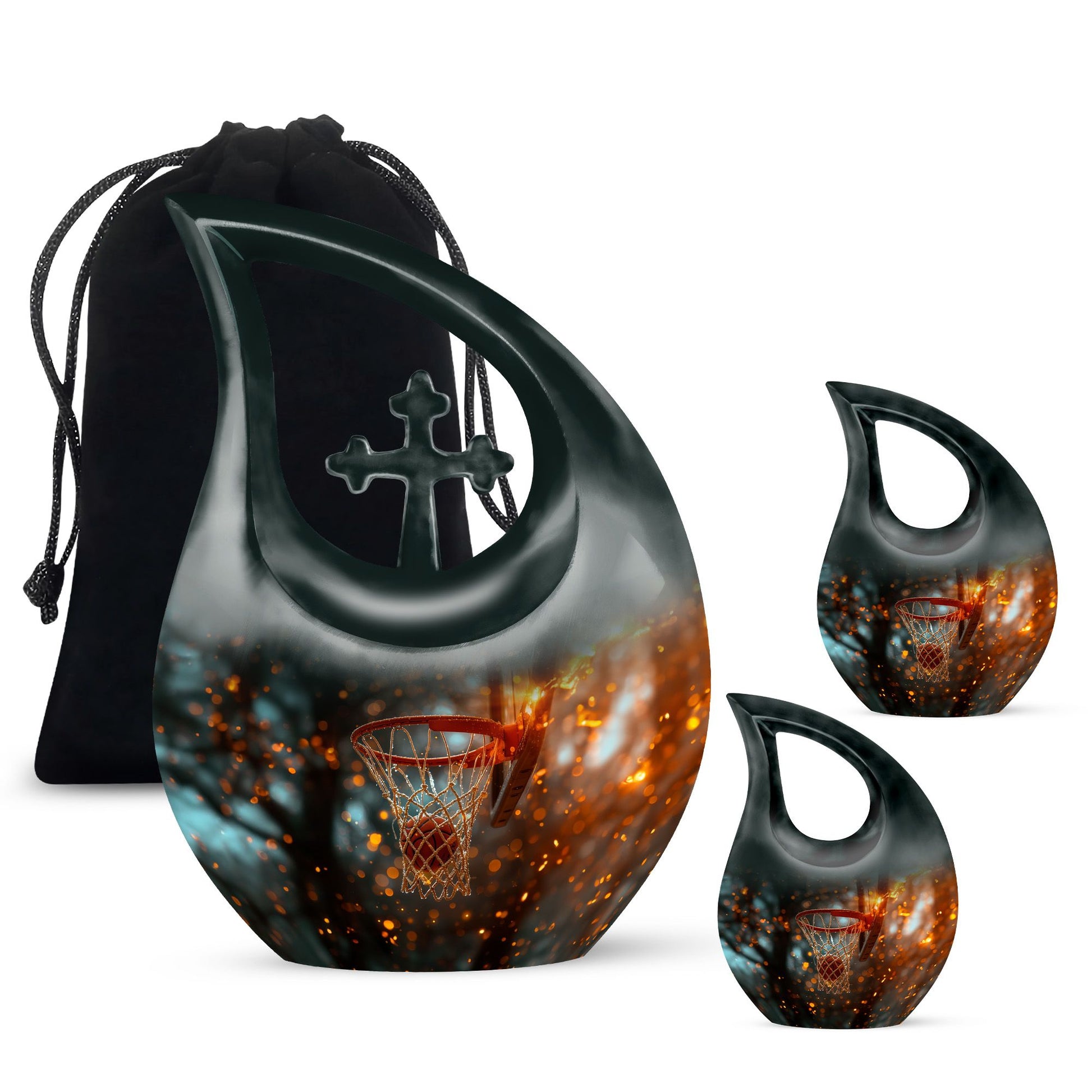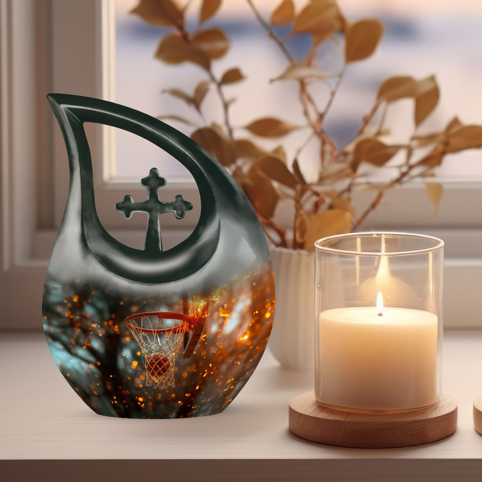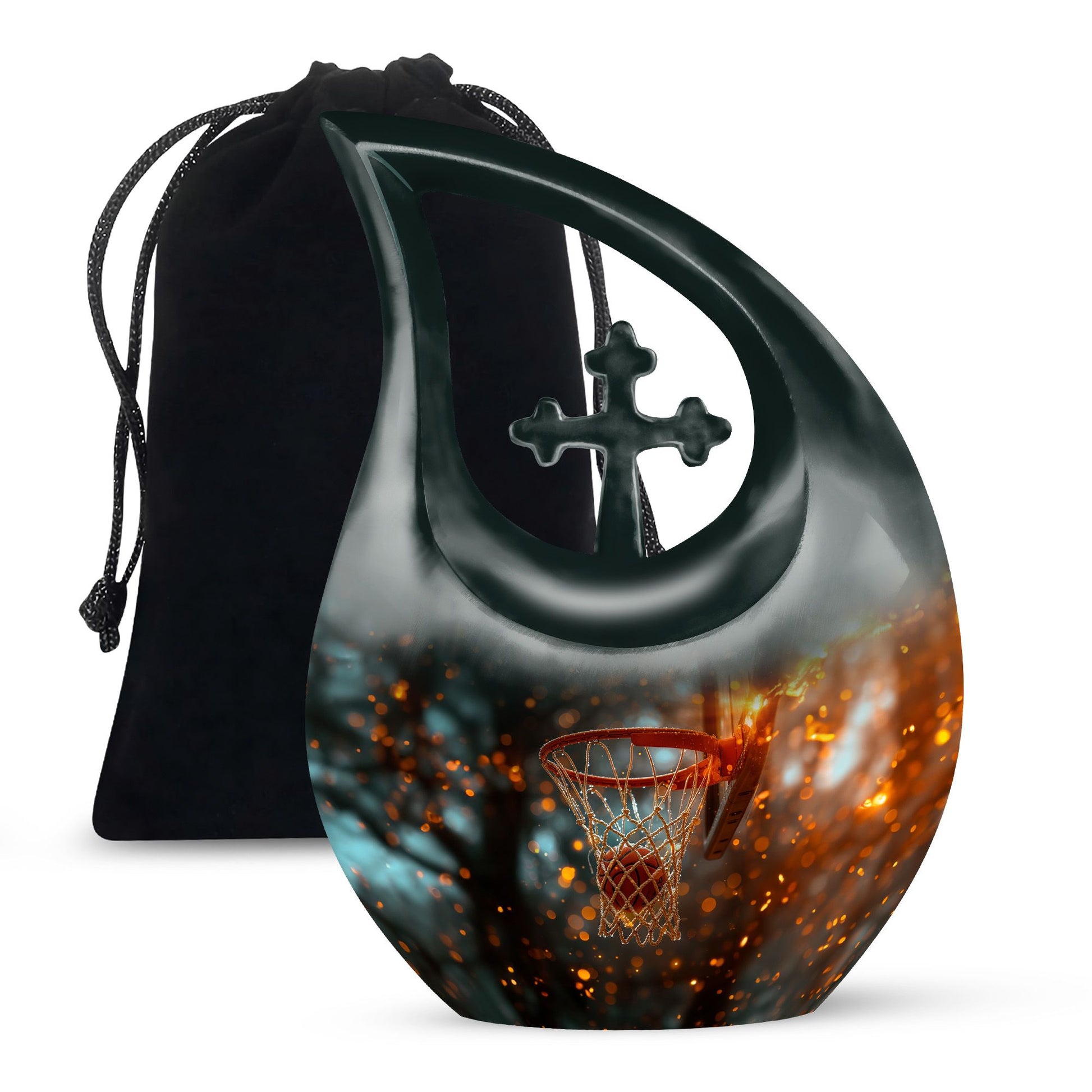 Our Basketball Urn is a perfect resting place for basketball enthusiasts, with a distinct Cross Drop design. This not-so-ordinary Large Urn measures 10 inches in height and weighs a solid 3.3 pounds. Encased in durable aluminium, the urn provides ample space with a capacity of 200 cubic inches. This premium quality item also comes with a velvet pouch for containment of ashes ensuring proper preservation. To make this more personal, we offer customization features where you can personalize it with engraved names. As our target customers often search for keywords like 'Customized Urns For Ashes For Adults', 'Unique Urns For Dad', 'Memorial Urns For Human Ashes', and 'Cremation Monuments', our urn caters to those needs filling the gap in the memorial urns market that craves for the blend of sentiment and personal touch. Please note, response to personalization requests may vary based on locale.