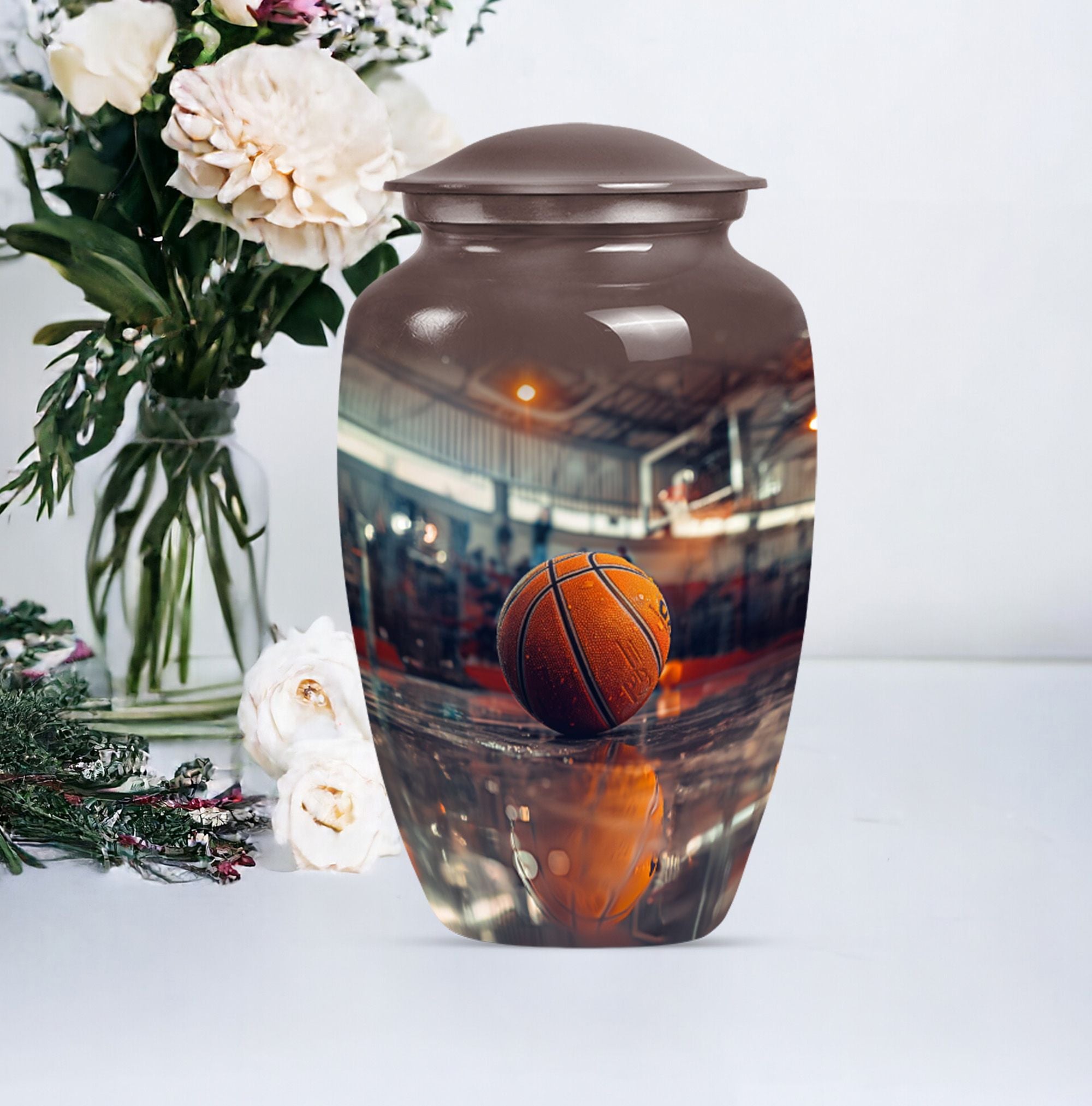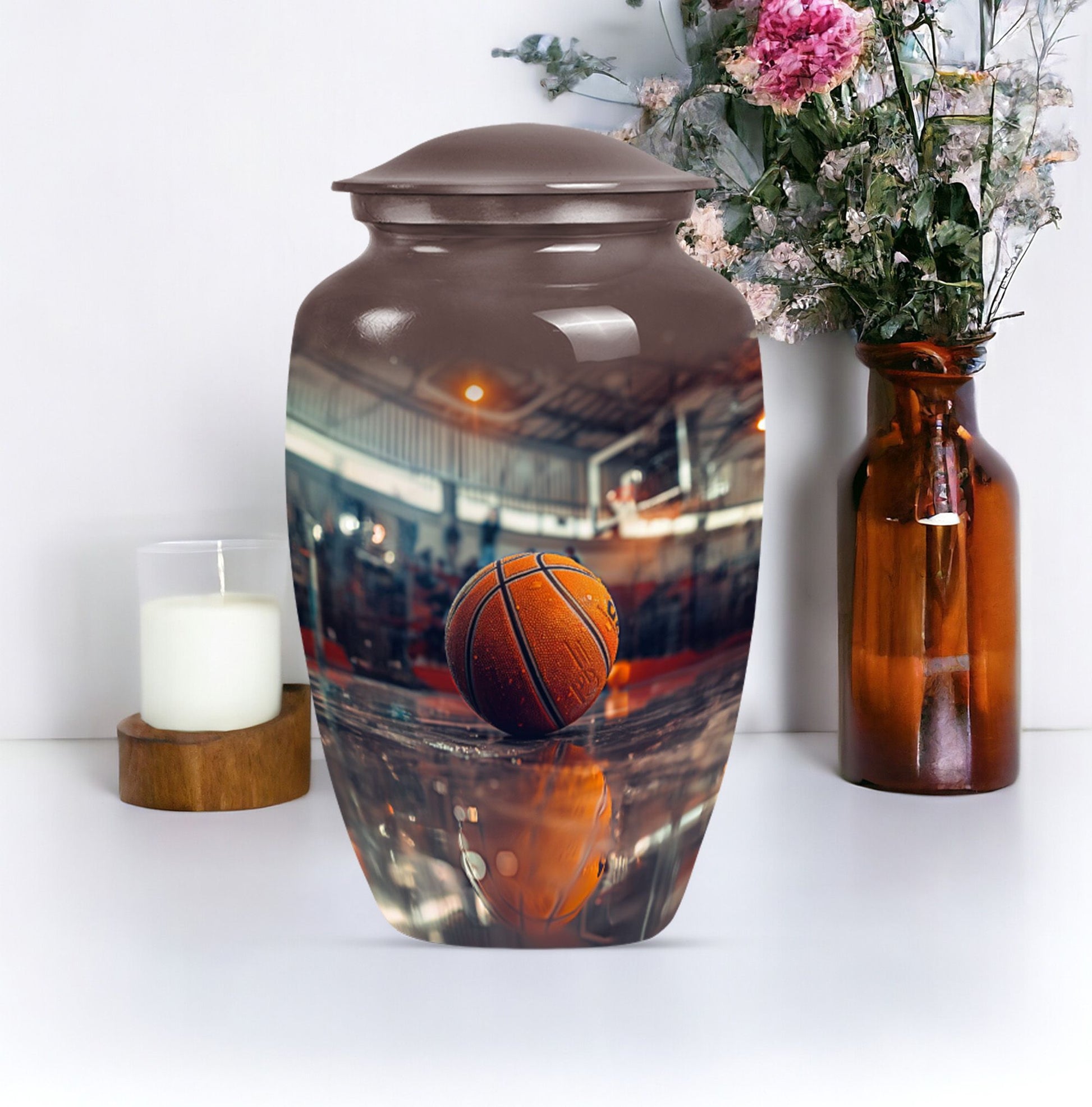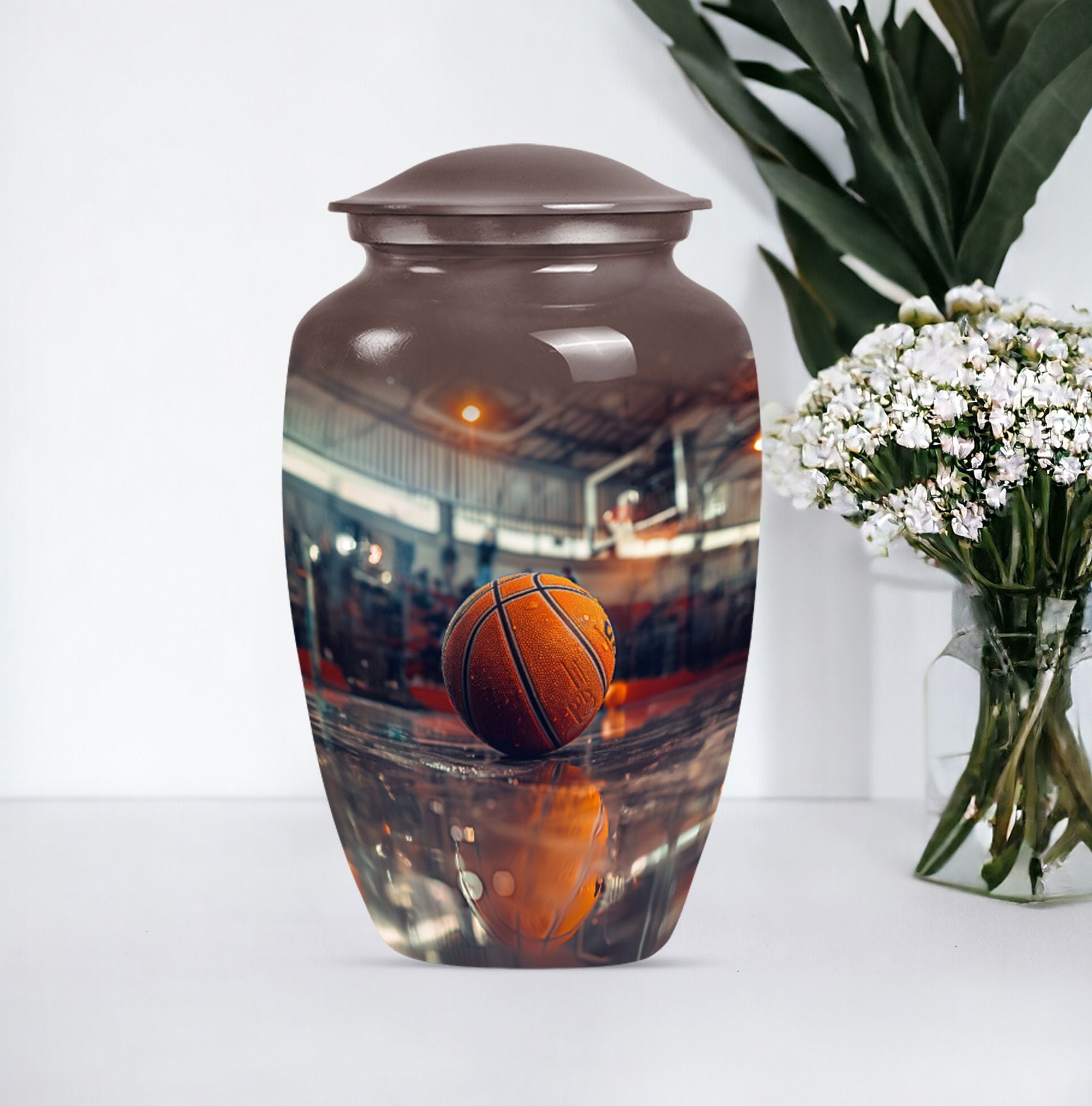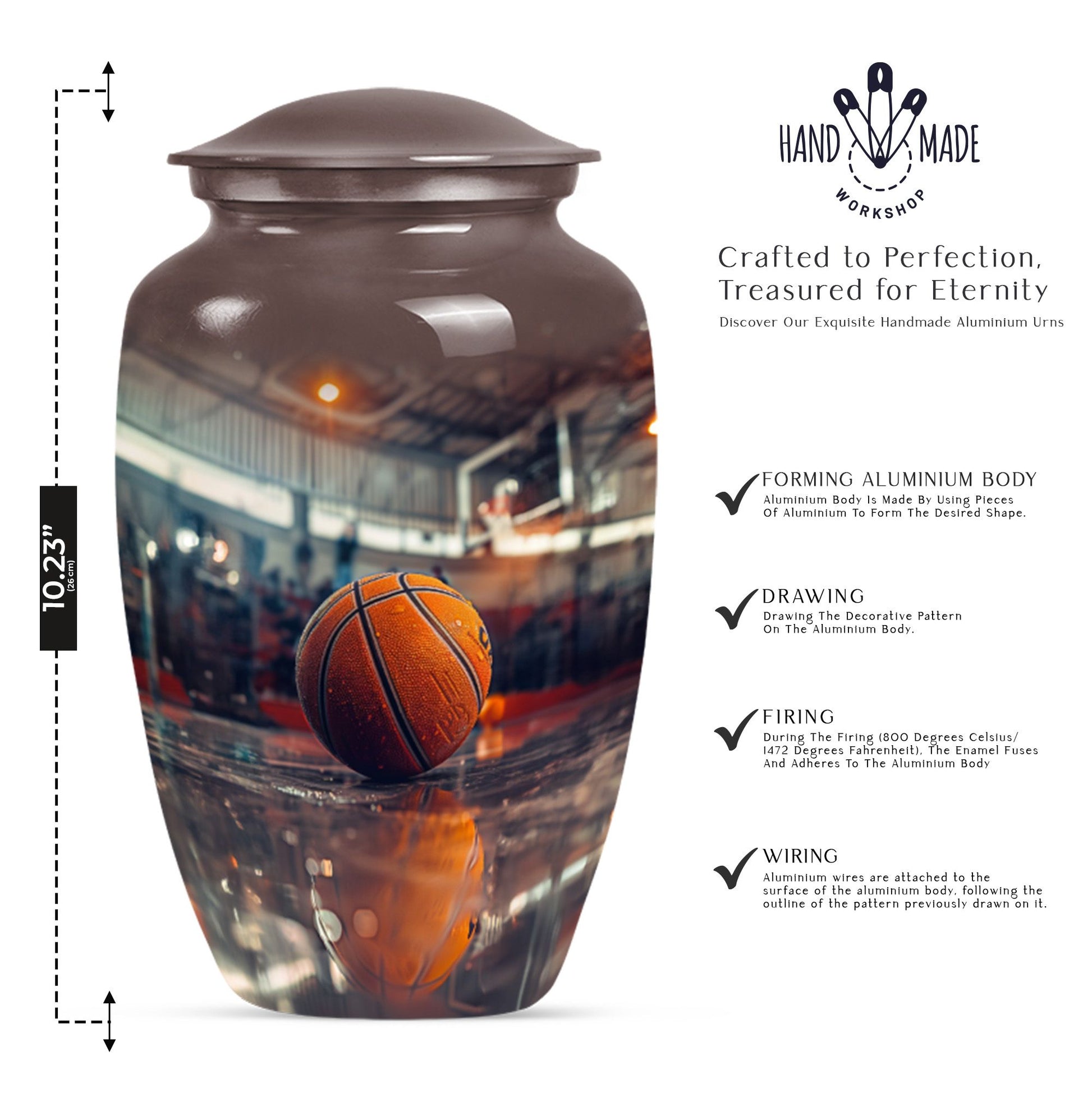Positively cherish the memory of your loved one with our valued 10-inch basketball Aluminium Urn, an adroitly constructed funeral piece for mom or any cherished female in your life. Weighing just 3.3 pounds, this ornament offers comfortable positioning wherever selected. This cremation urn with its abstract theme echoes the uniqueness of individuality, reflecting a personality that was vibrant and unconfined. It possesses a capacity of 200 cubic inches, ample space designed for secure containment of ashes which can be housed neatly in the accompanying velvet pouch provided in the package. Its size and material signify durability and a timeless appreciation of your loved one's memory. For a more intimate touch, the option to personalize with engraved names is available. This large Aluminium urn is not merely an urn. It offers a unique way to remember and honor the impactful life led by your loved one. The product is found in the Memorial Ceremony Supplies category. Relive your fond memories with our classic urn today.