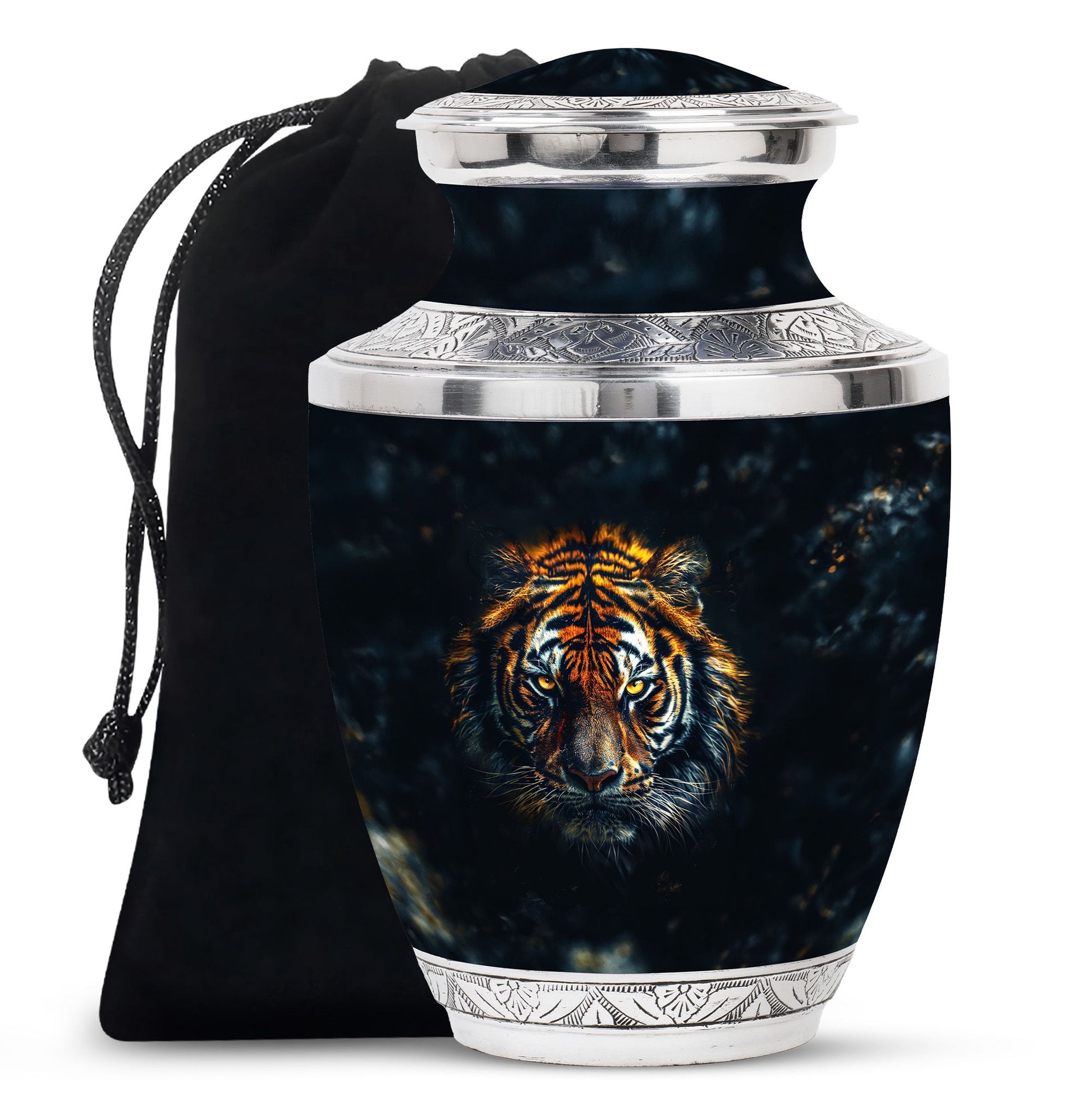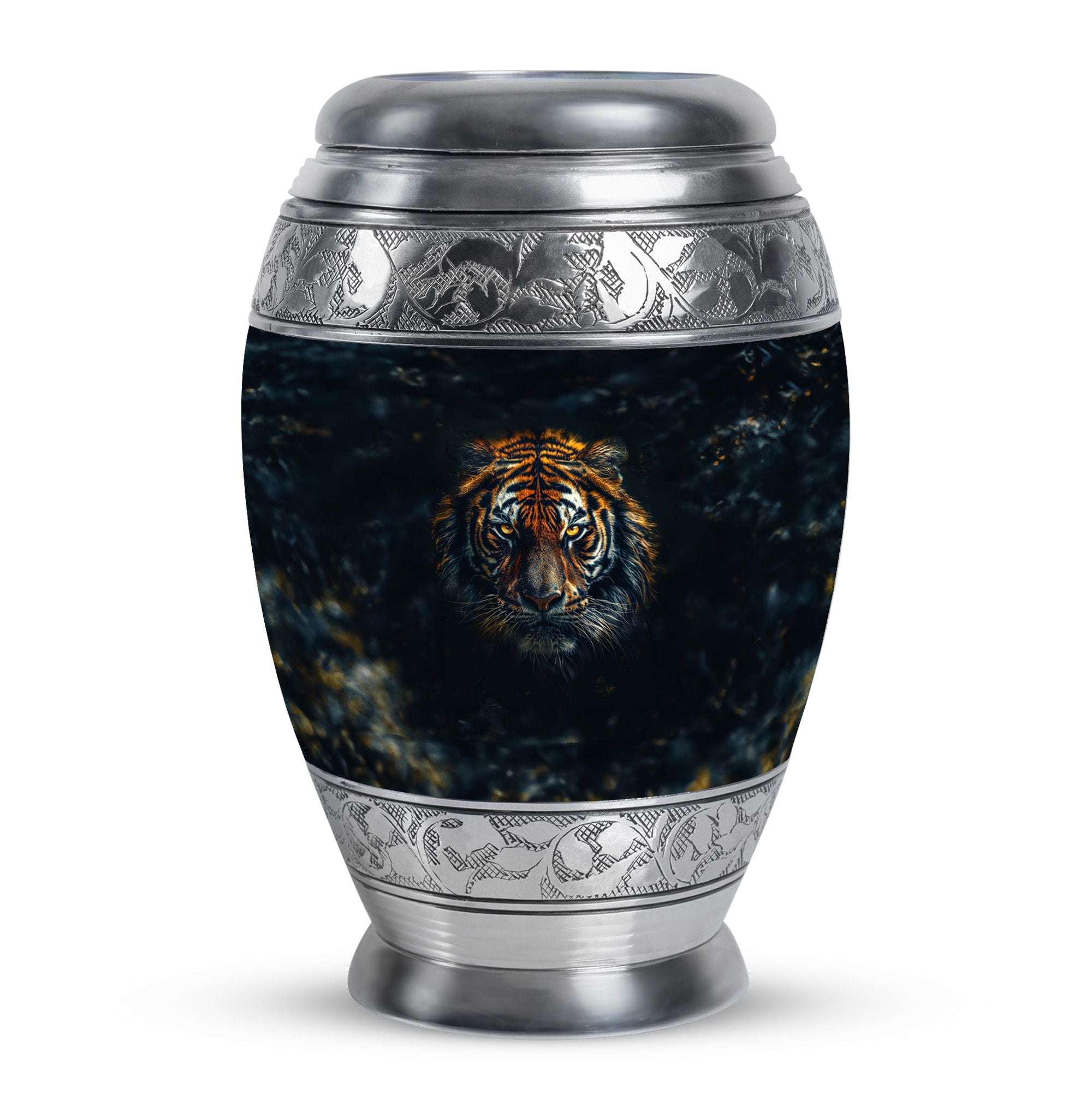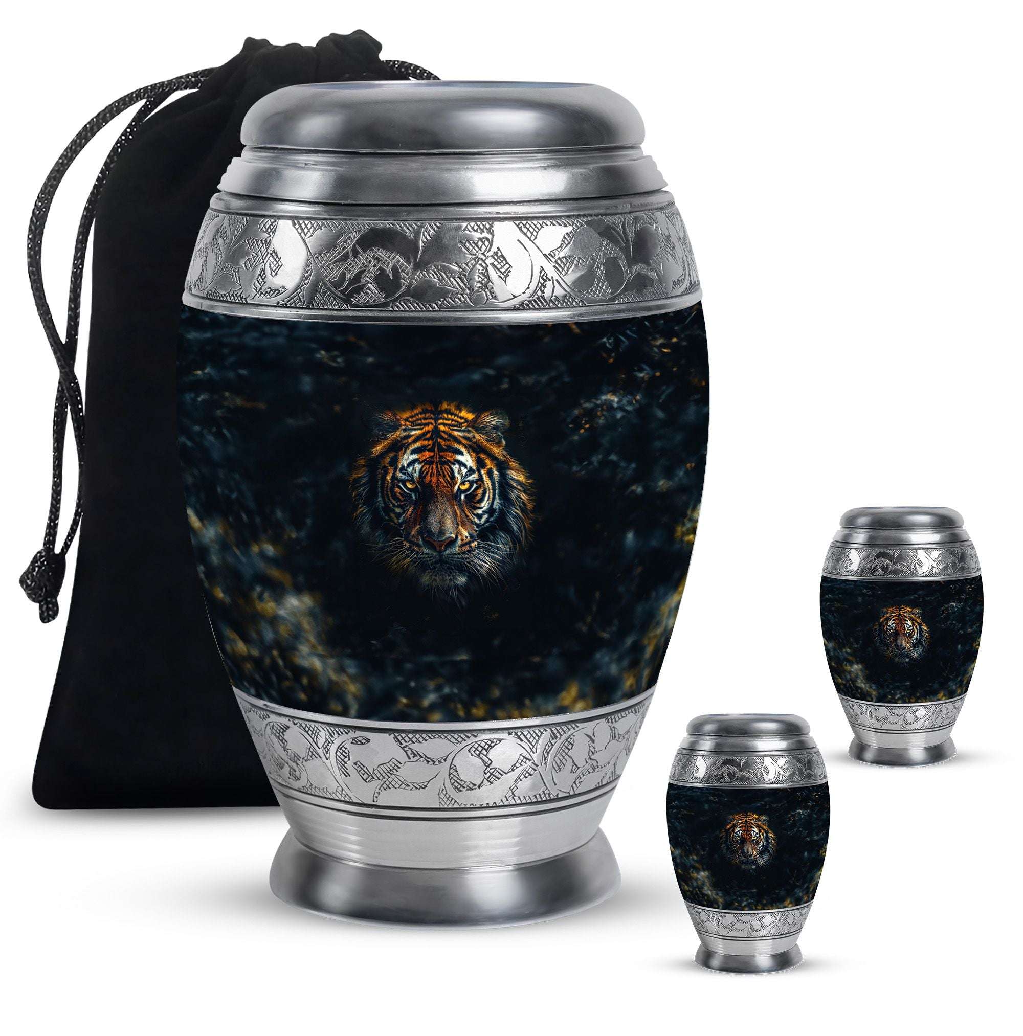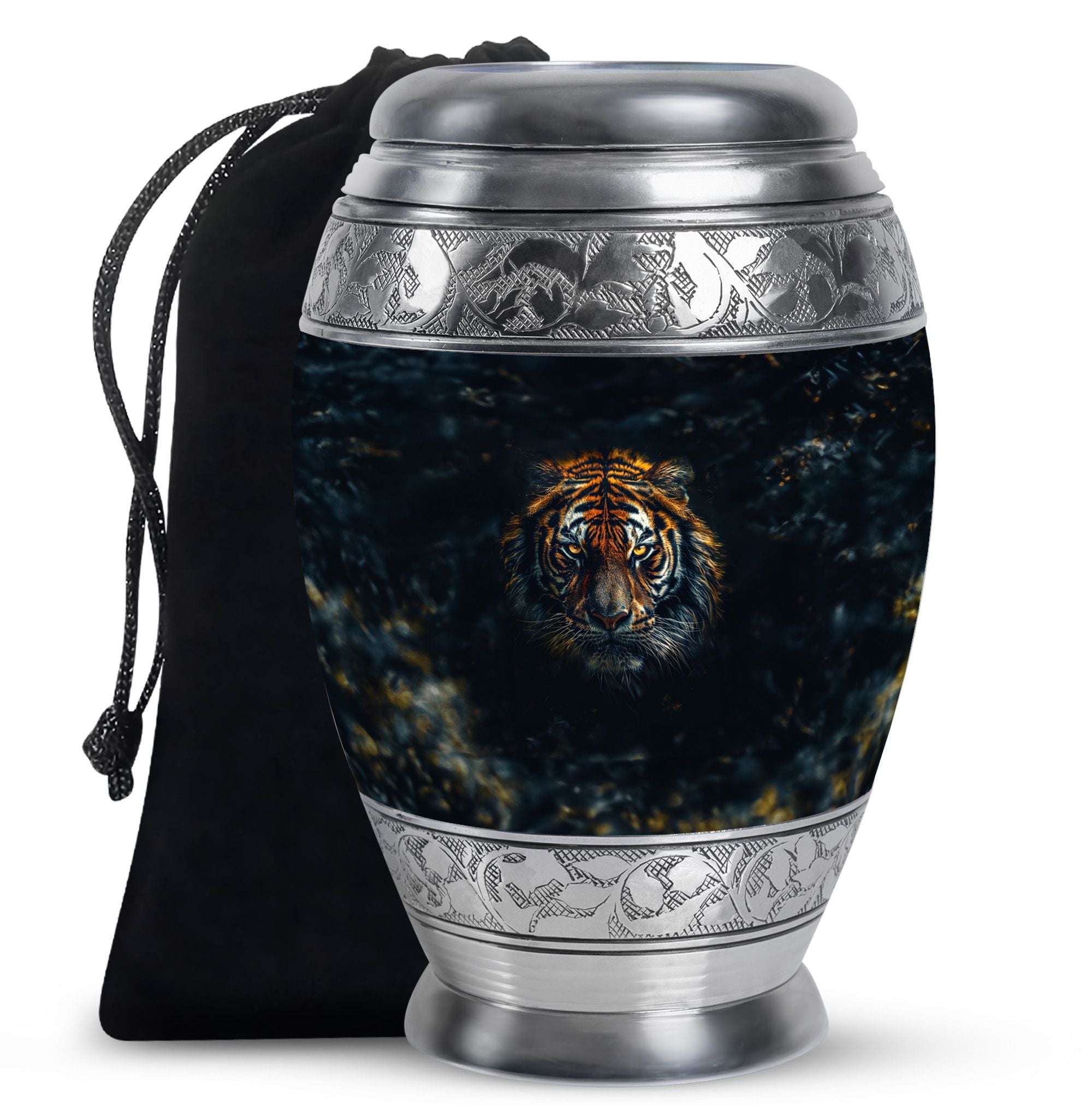 Crafted from durable aluminum, this urn features a secure screw-top lid to safeguard ashes with peace of mind. The striking tiger design makes it a unique option among funeral urns for adult ashes, blending artistry with symbolic meaning. It is versatile, suitable for use as a funeral decor urn – memorial urn, or as a centerpiece in the home. Families can also pair this piece with cremation urns large & small combo sets for shared remembrance.