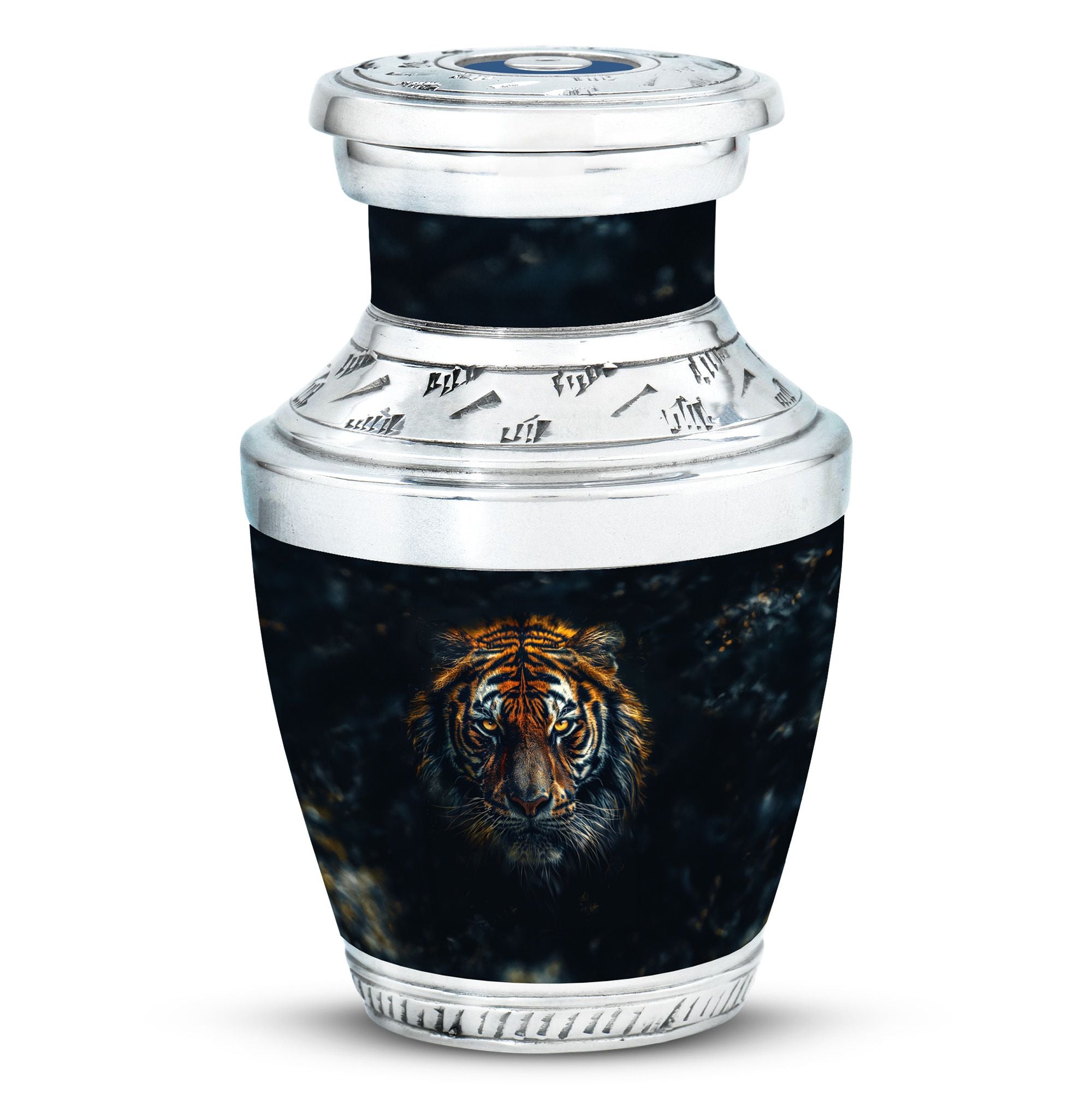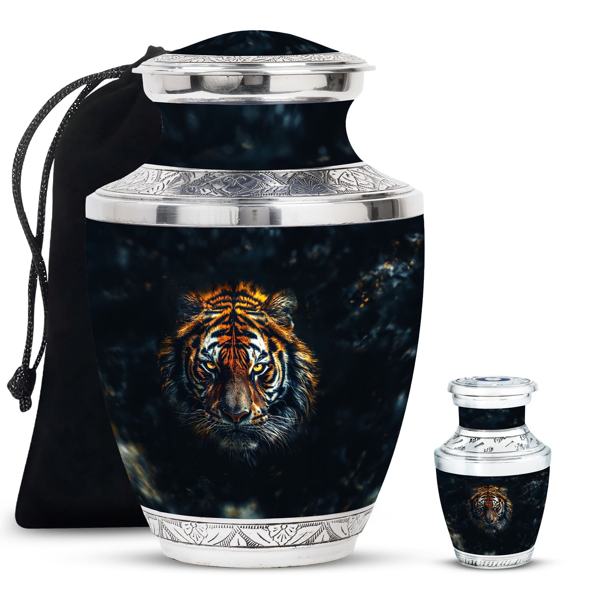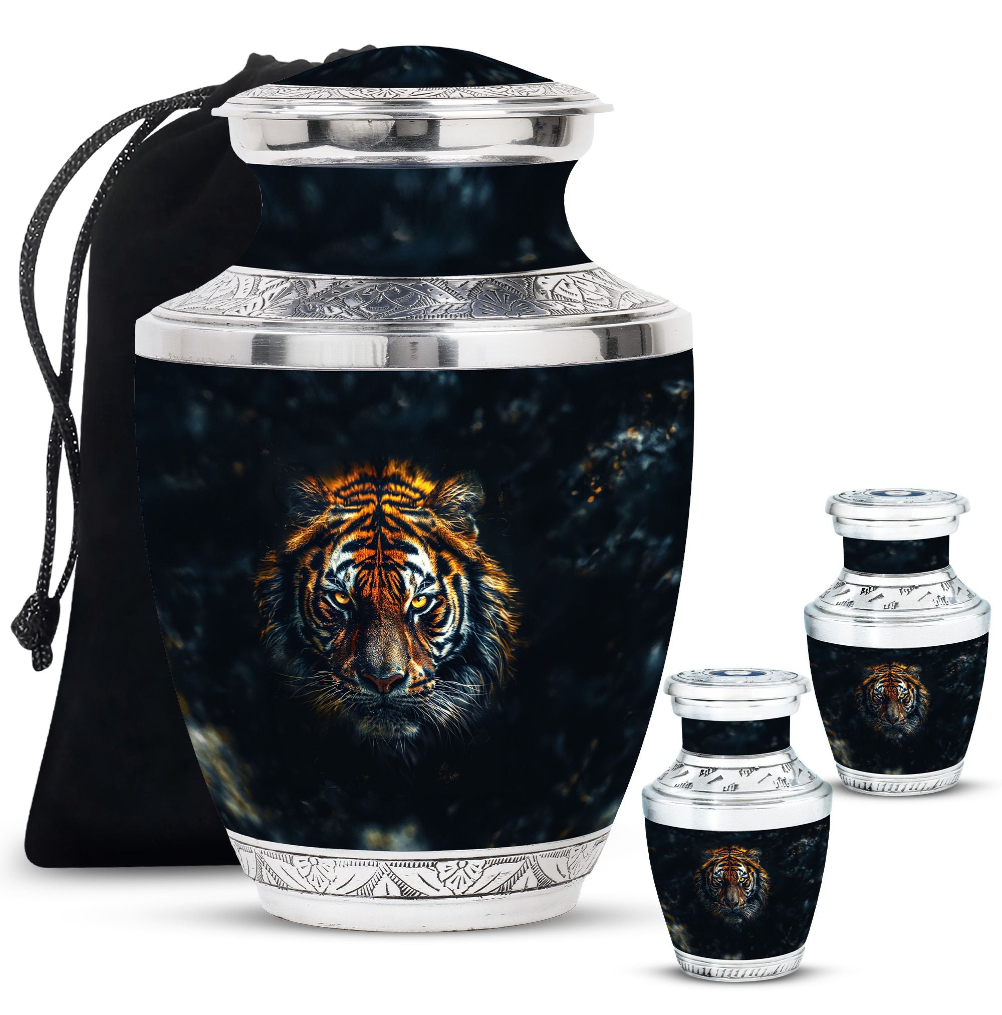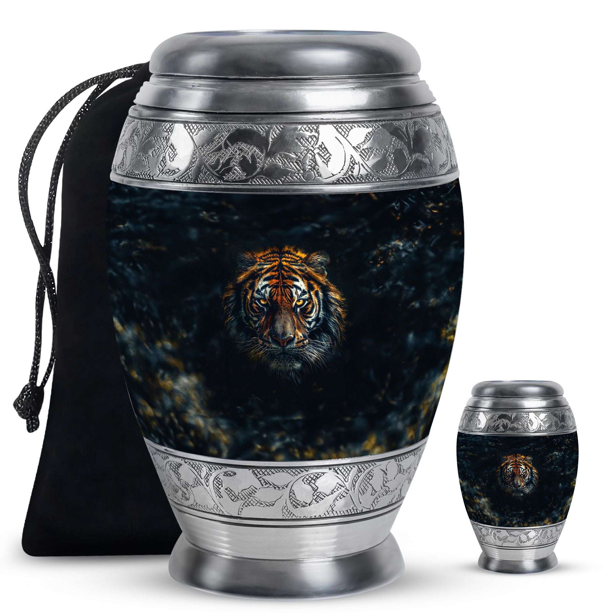 Crafted from durable aluminum, this urn features a secure screw-top lid to safeguard ashes with peace of mind. The striking tiger design makes it a unique option among funeral urns for adult ashes, blending artistry with symbolic meaning. It is versatile, suitable for use as a funeral decor urn – memorial urn, or as a centerpiece in the home. Families can also pair this piece with cremation urns large & small combo sets for shared remembrance.