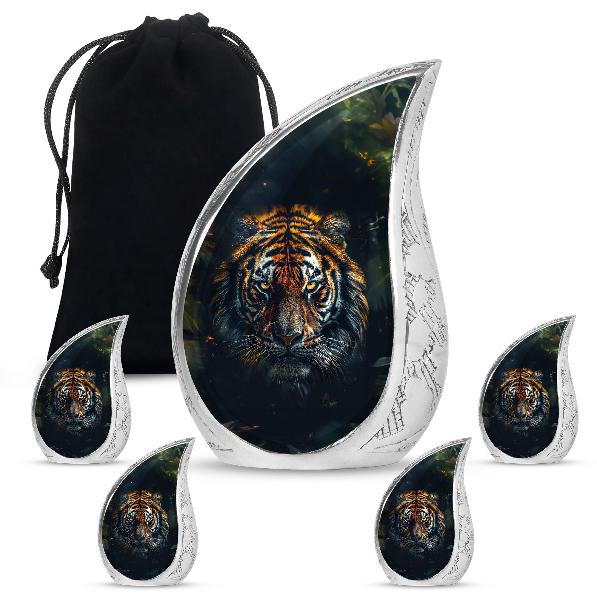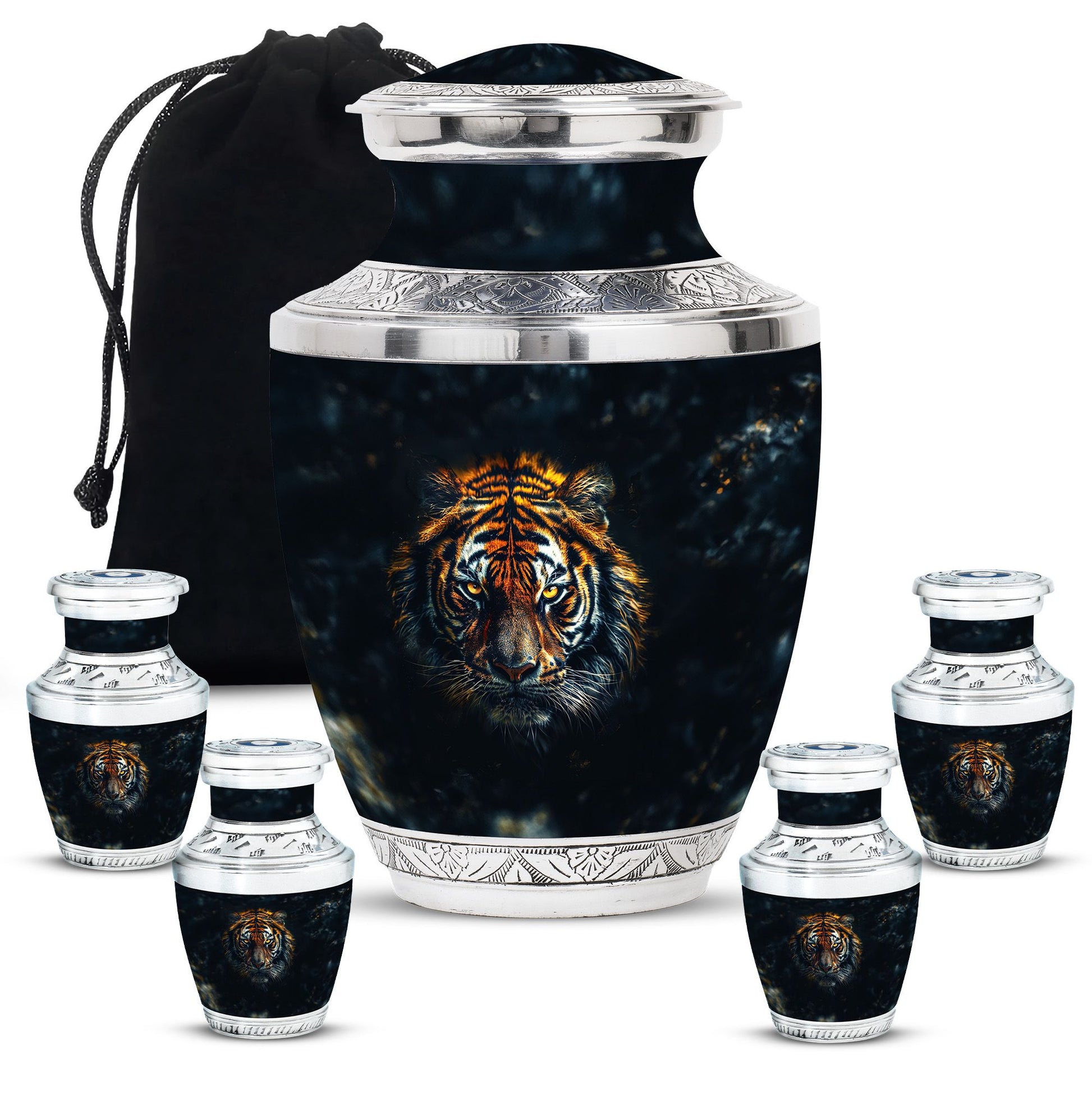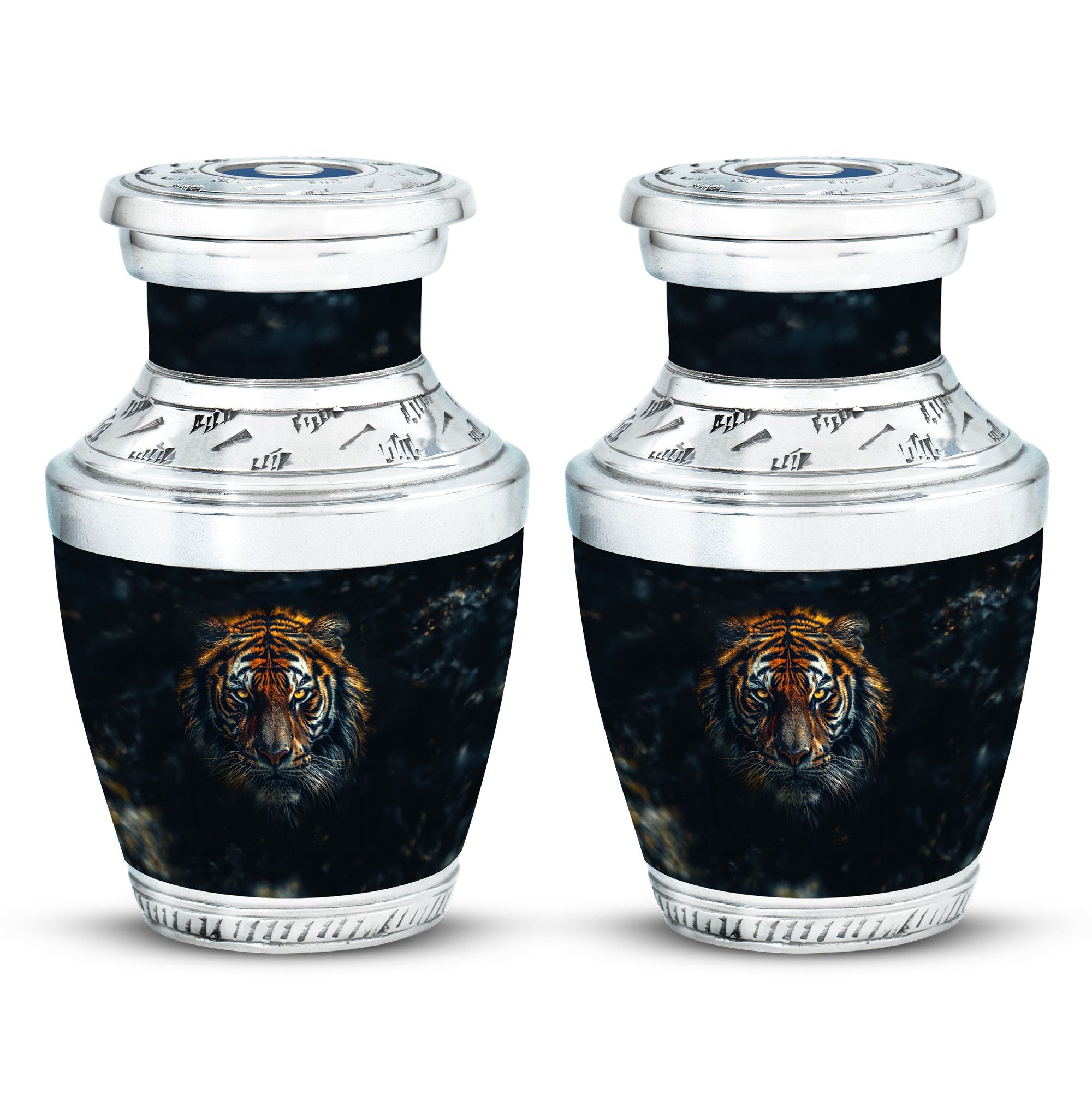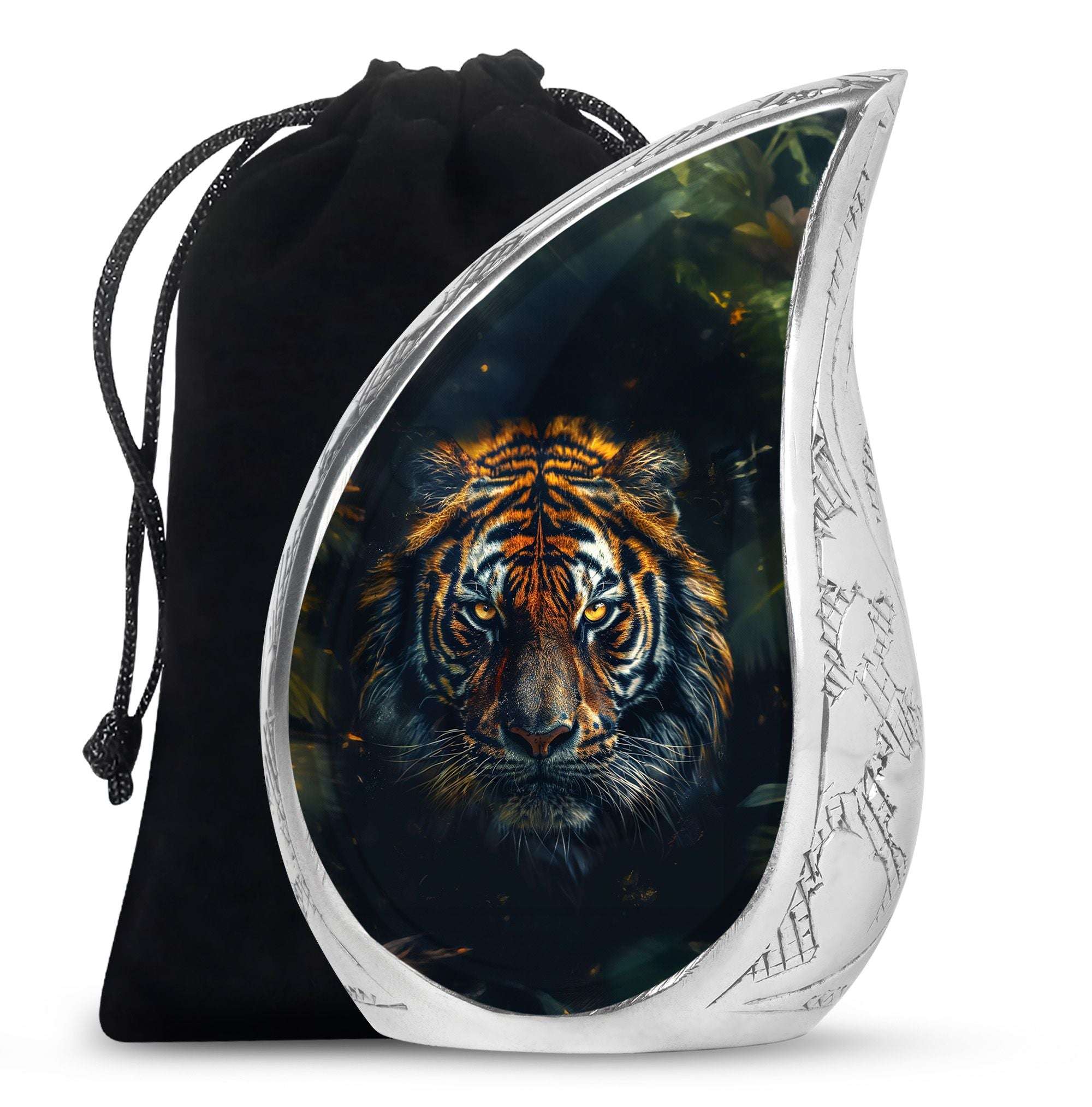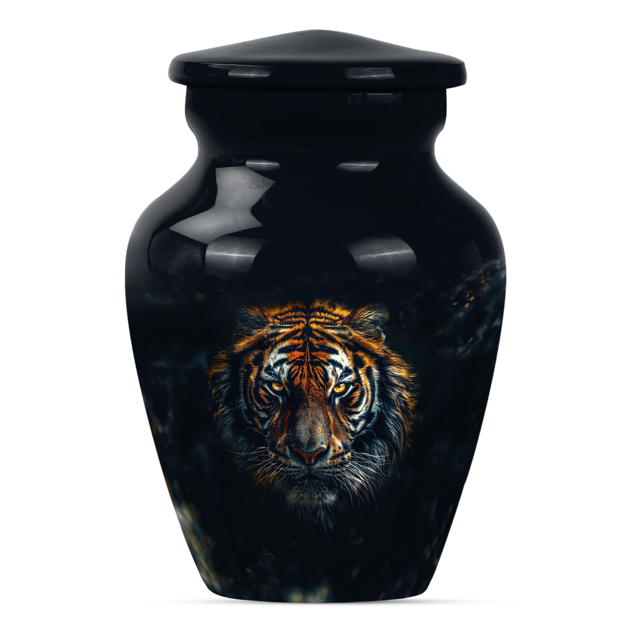 Crafted from durable aluminum, this urn features a secure screw-top lid to safeguard ashes with peace of mind. The striking tiger design makes it a unique option among funeral urns for adult ashes, blending artistry with symbolic meaning. It is versatile, suitable for use as a funeral decor urn – memorial urn, or as a centerpiece in the home. Families can also pair this piece with cremation urns large & small combo sets for shared remembrance.