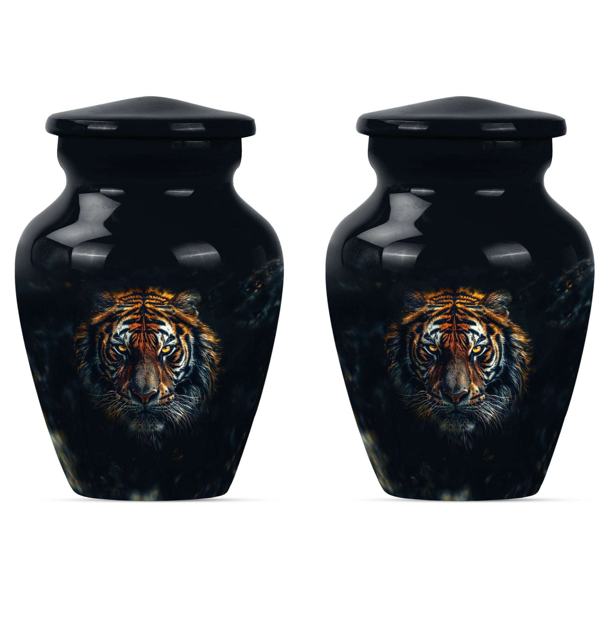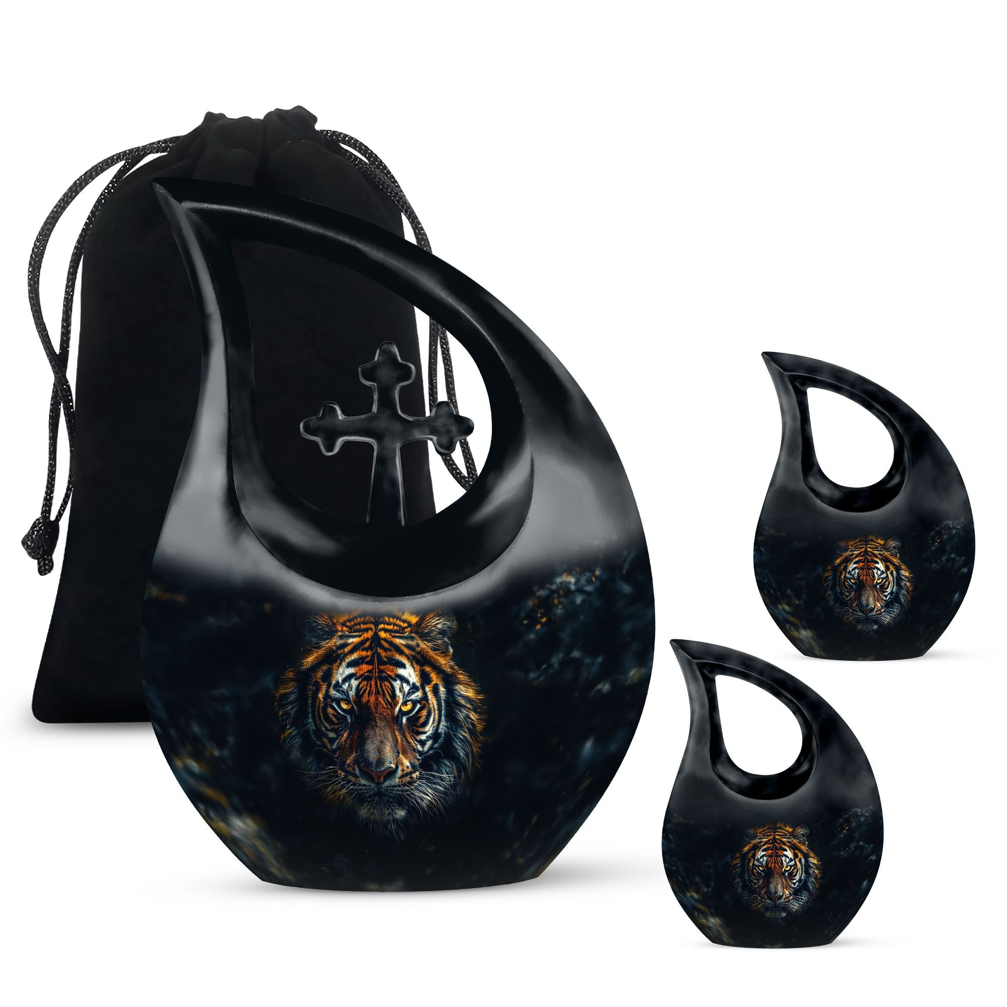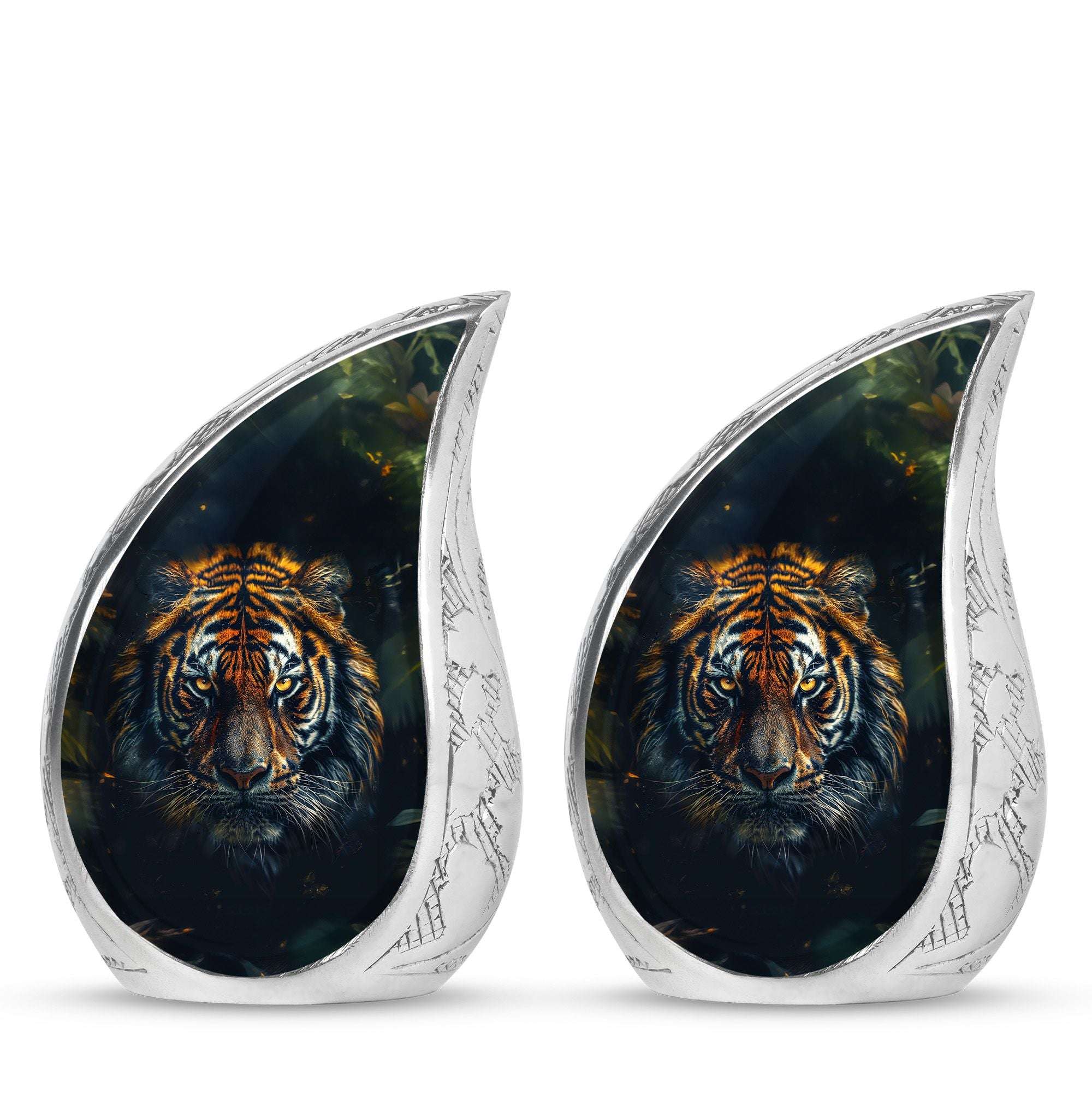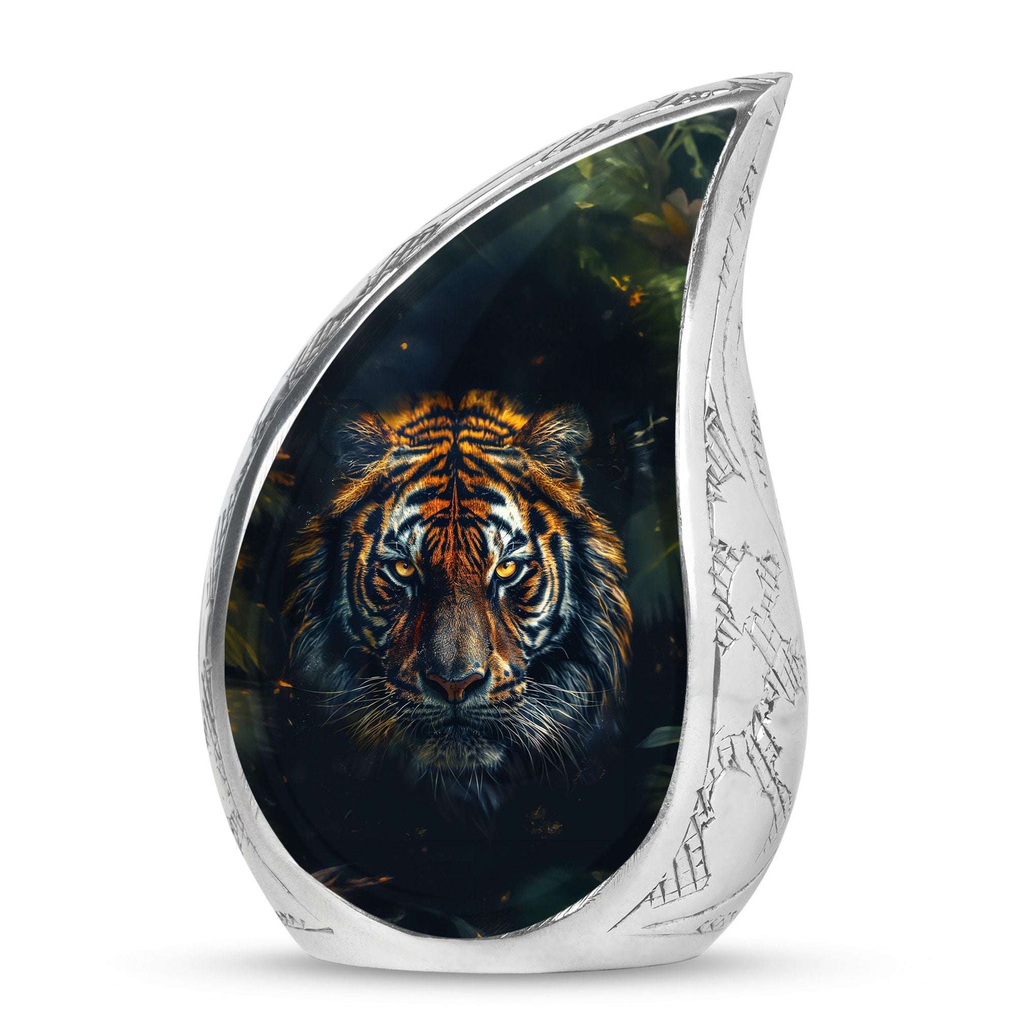 Crafted from durable aluminum, this urn features a secure screw-top lid to safeguard ashes with peace of mind. The striking tiger design makes it a unique option among funeral urns for adult ashes, blending artistry with symbolic meaning. It is versatile, suitable for use as a funeral decor urn – memorial urn, or as a centerpiece in the home. Families can also pair this piece with cremation urns large & small combo sets for shared remembrance.