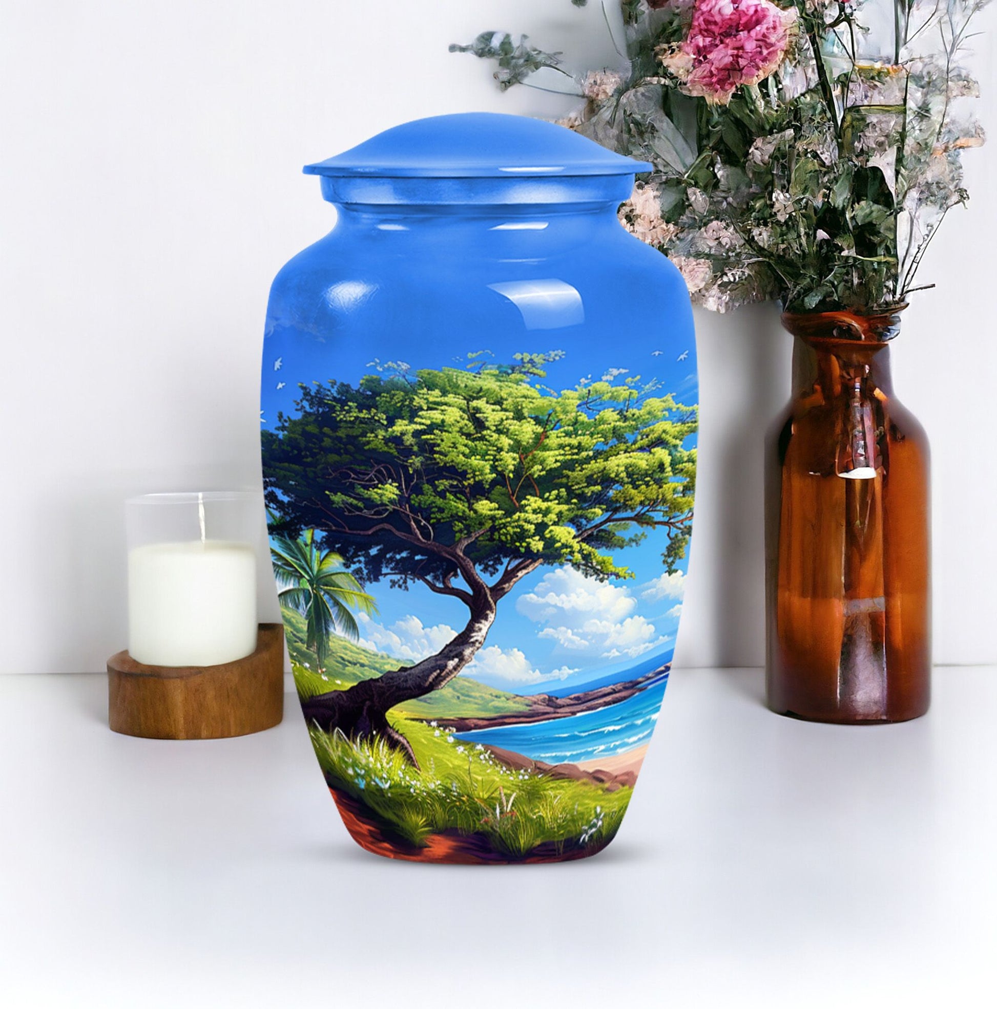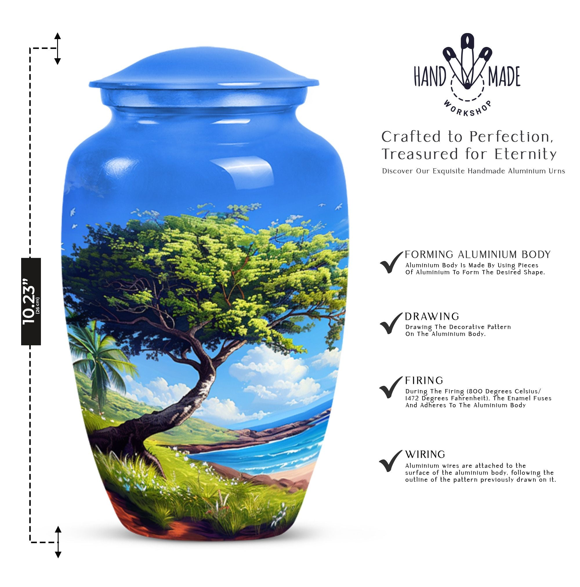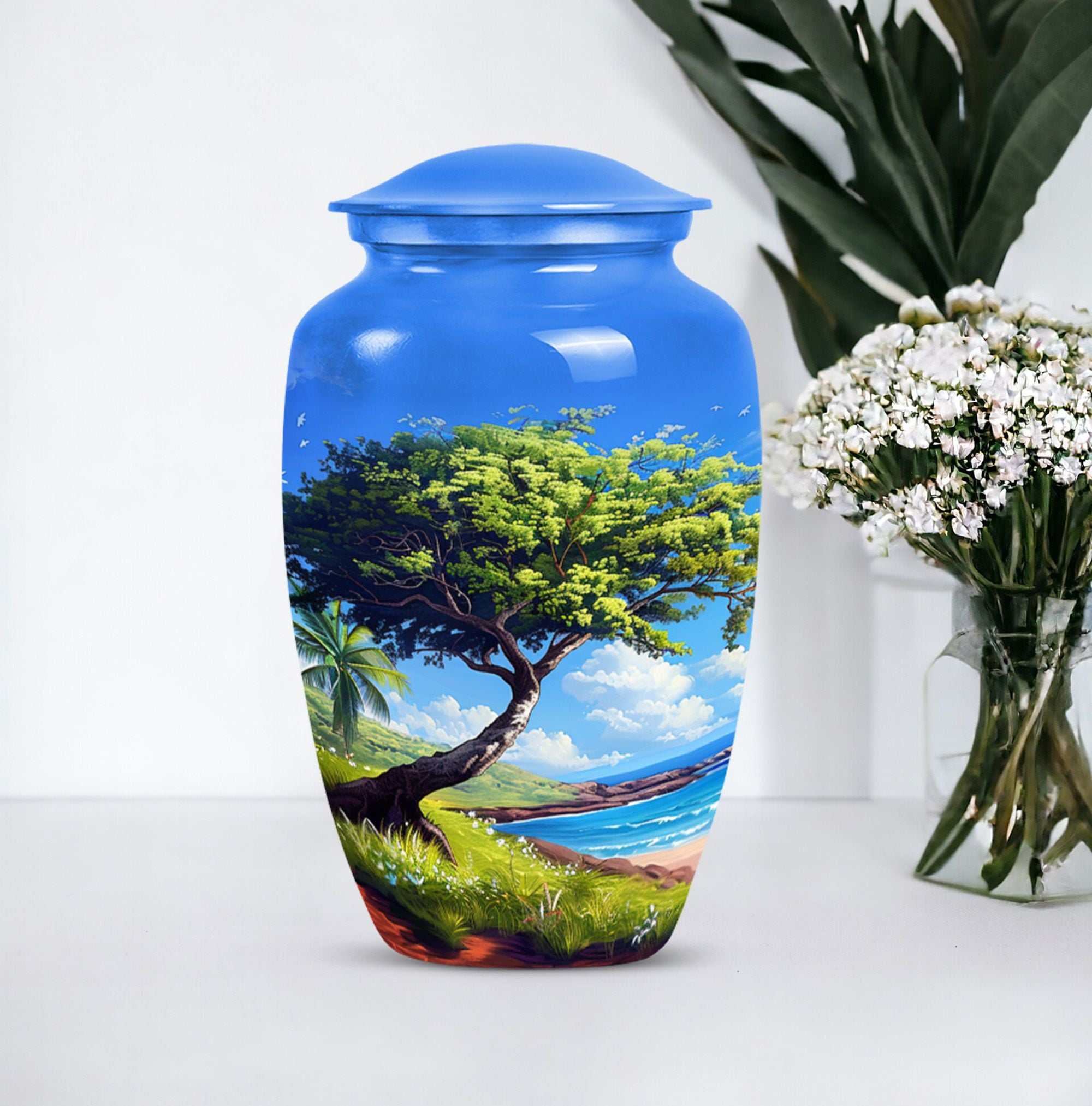 Heading toward a peaceful resting place, our befitting 'Beach Urn' is a timeless piece reserved for the unique role of safeguarding your cherished loved one's ashes. Encased from highly durable aluminium, this large urn measures a resolute 10 inches in height and weighs in at a substantive 3.3 pounds. It exhibits an eternally exquisite 'Classic Urn' style coupled with a serene floral theme. The 'memorial urns' safeguard up to 200 cubic inches, allowing for substantial containment and respectful remembrance. For an added layer of faith, the package includes a velvet pouch where the ashes find their affectionate enclosure. Furthermore, we offer the option to personalize the urn by engraving names, subtly marking a special bond that surpasses time. Imbued with a rare blend of solidity and elegance, this funeral urn make a fitting tribute to the adult male, father, or any loved one, encapsulating fond memories, reverence, and love. As pilgrimage to a soothing beach, let your affection sail peacefully with our Beach urn.