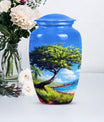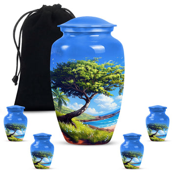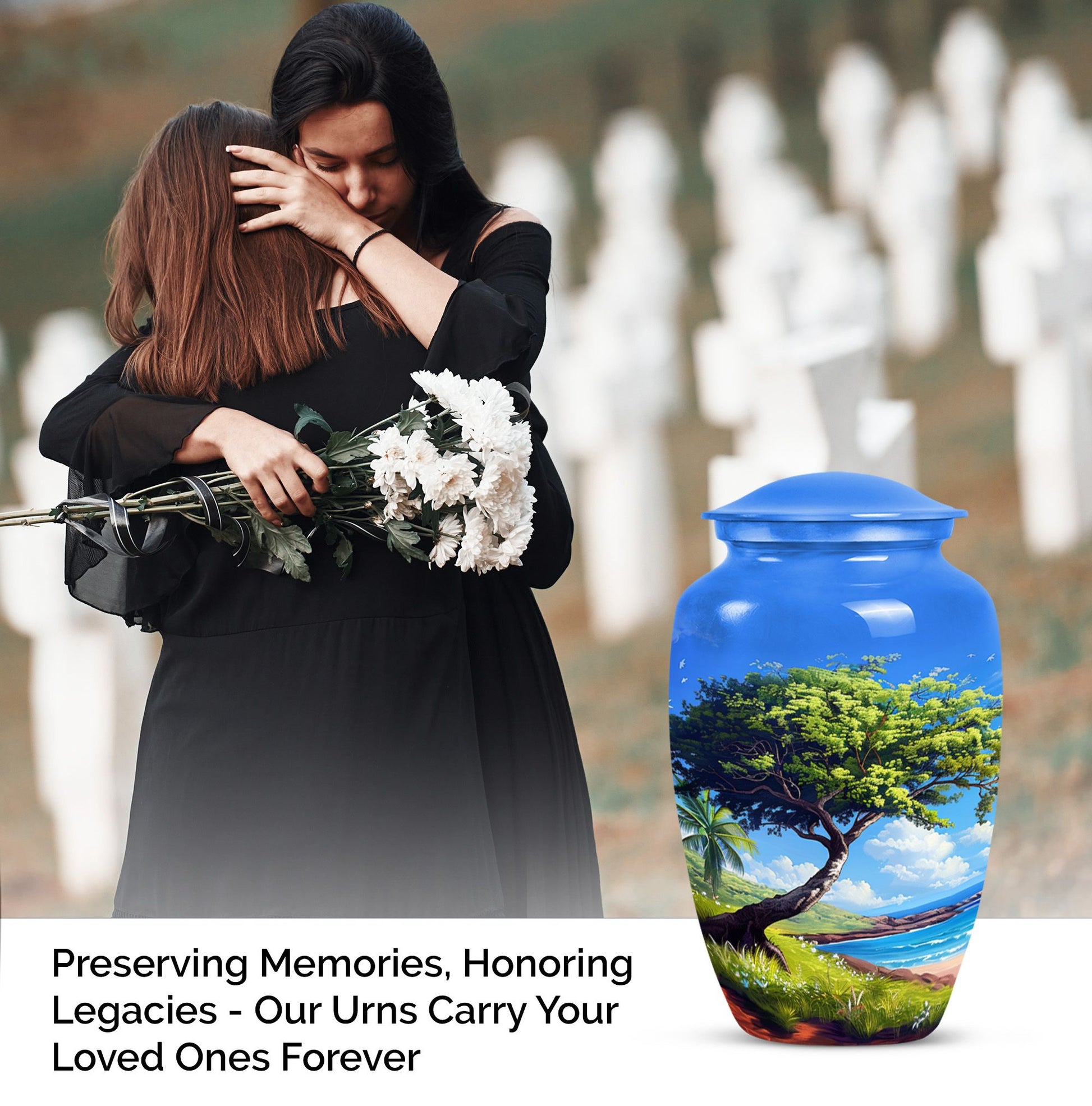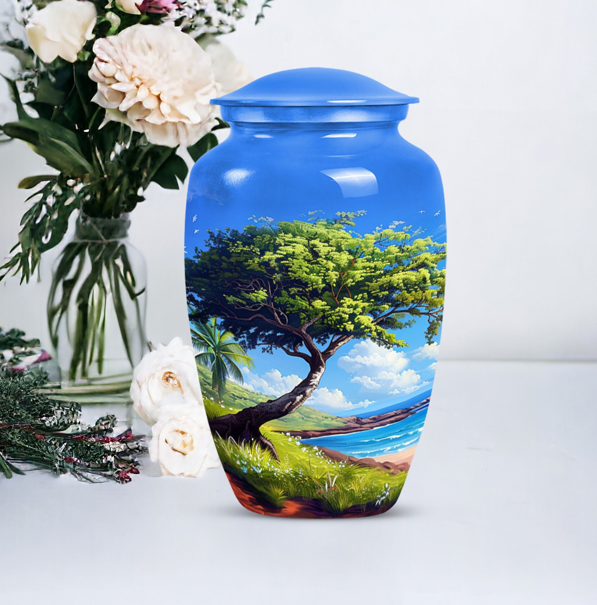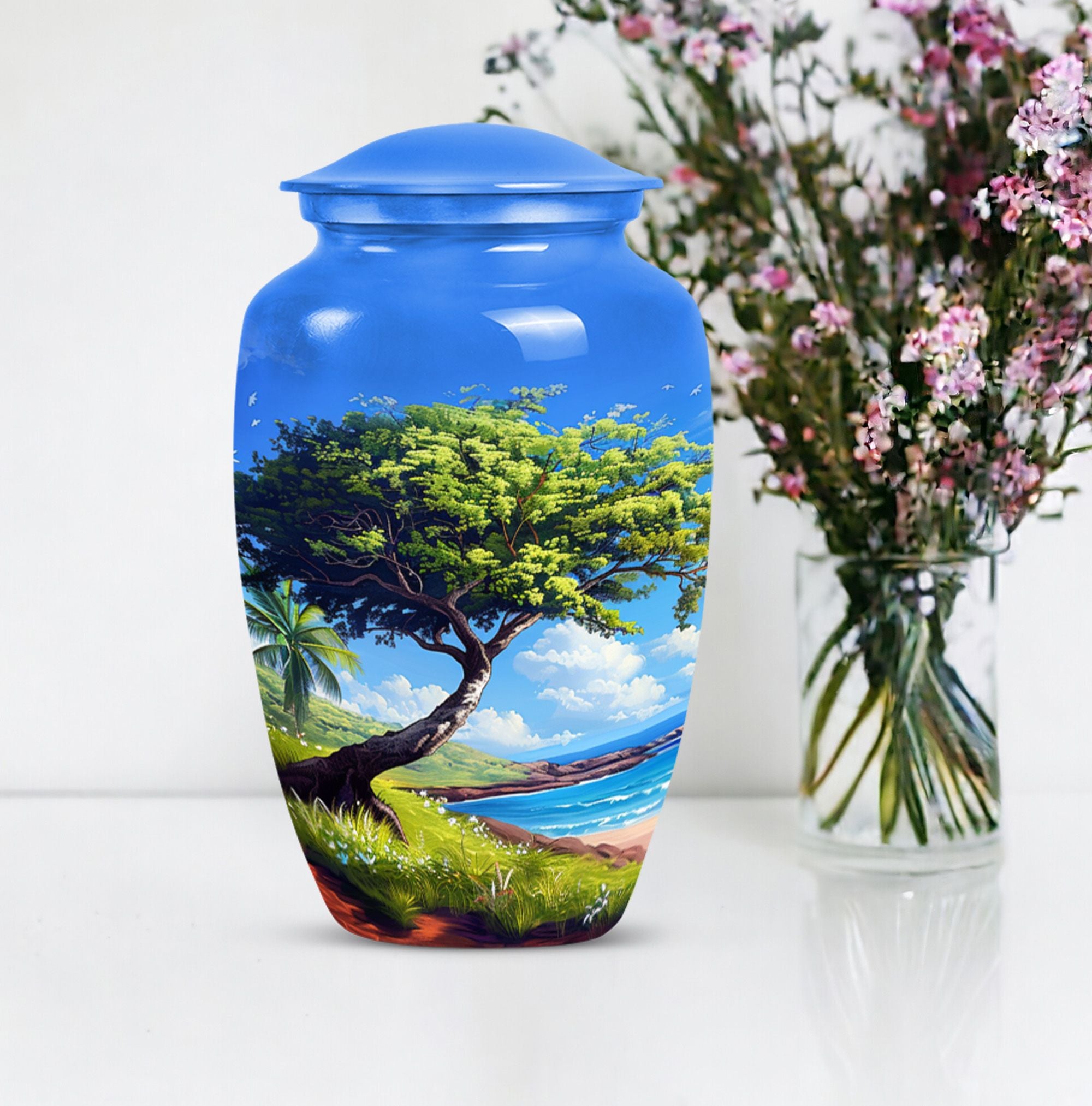 Heading toward a peaceful resting place, our befitting 'Beach Urn' is a timeless piece reserved for the unique role of safeguarding your cherished loved one's ashes. Encased from highly durable aluminium, this large urn measures a resolute 10 inches in height and weighs in at a substantive 3.3 pounds. It exhibits an eternally exquisite 'Classic Urn' style coupled with a serene floral theme. The 'memorial urns' safeguard up to 200 cubic inches, allowing for substantial containment and respectful remembrance. For an added layer of faith, the package includes a velvet pouch where the ashes find their affectionate enclosure. Furthermore, we offer the option to personalize the urn by engraving names, subtly marking a special bond that surpasses time. Imbued with a rare blend of solidity and elegance, this funeral urn make a fitting tribute to the adult male, father, or any loved one, encapsulating fond memories, reverence, and love. As pilgrimage to a soothing beach, let your affection sail peacefully with our Beach urn.