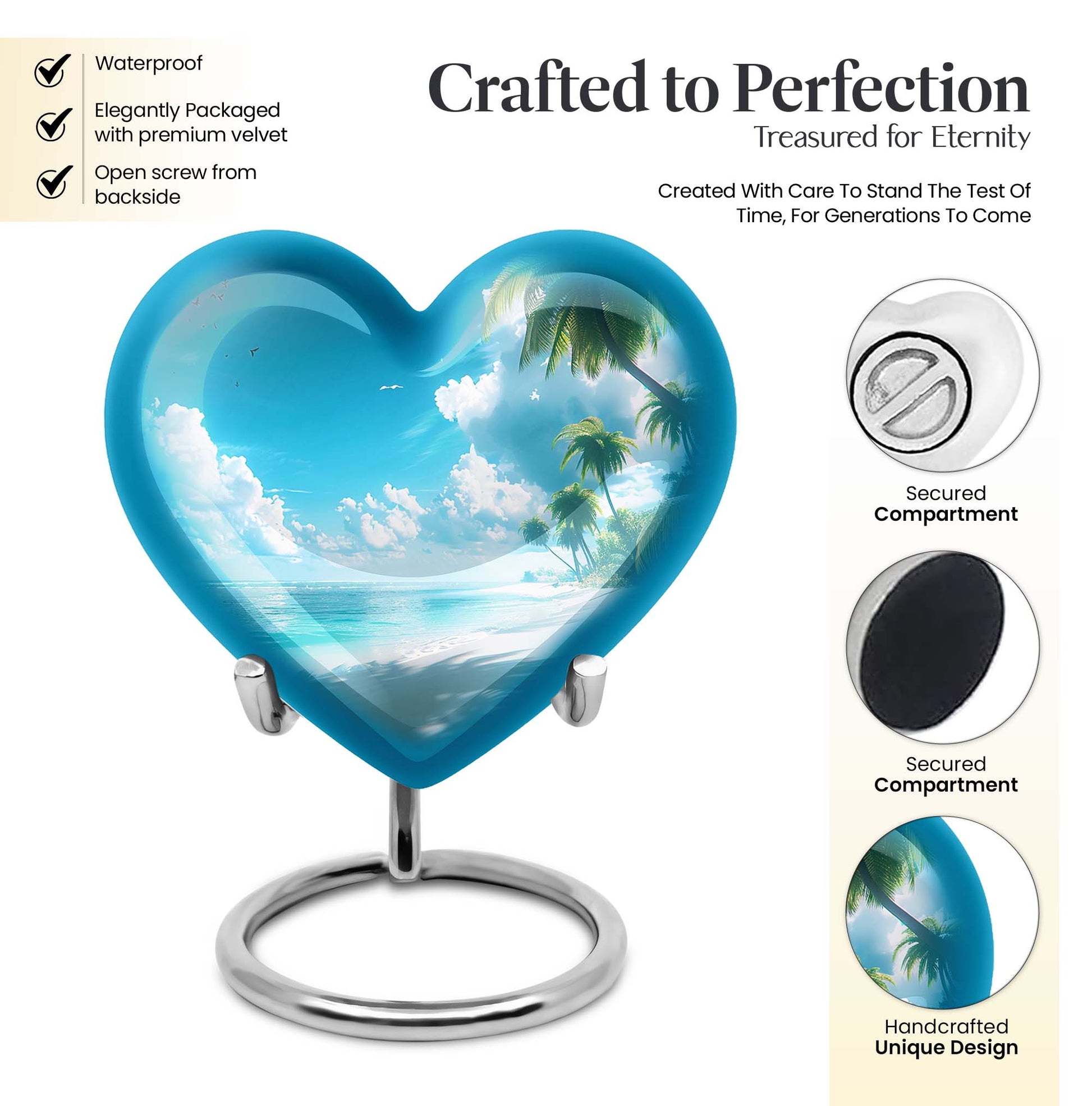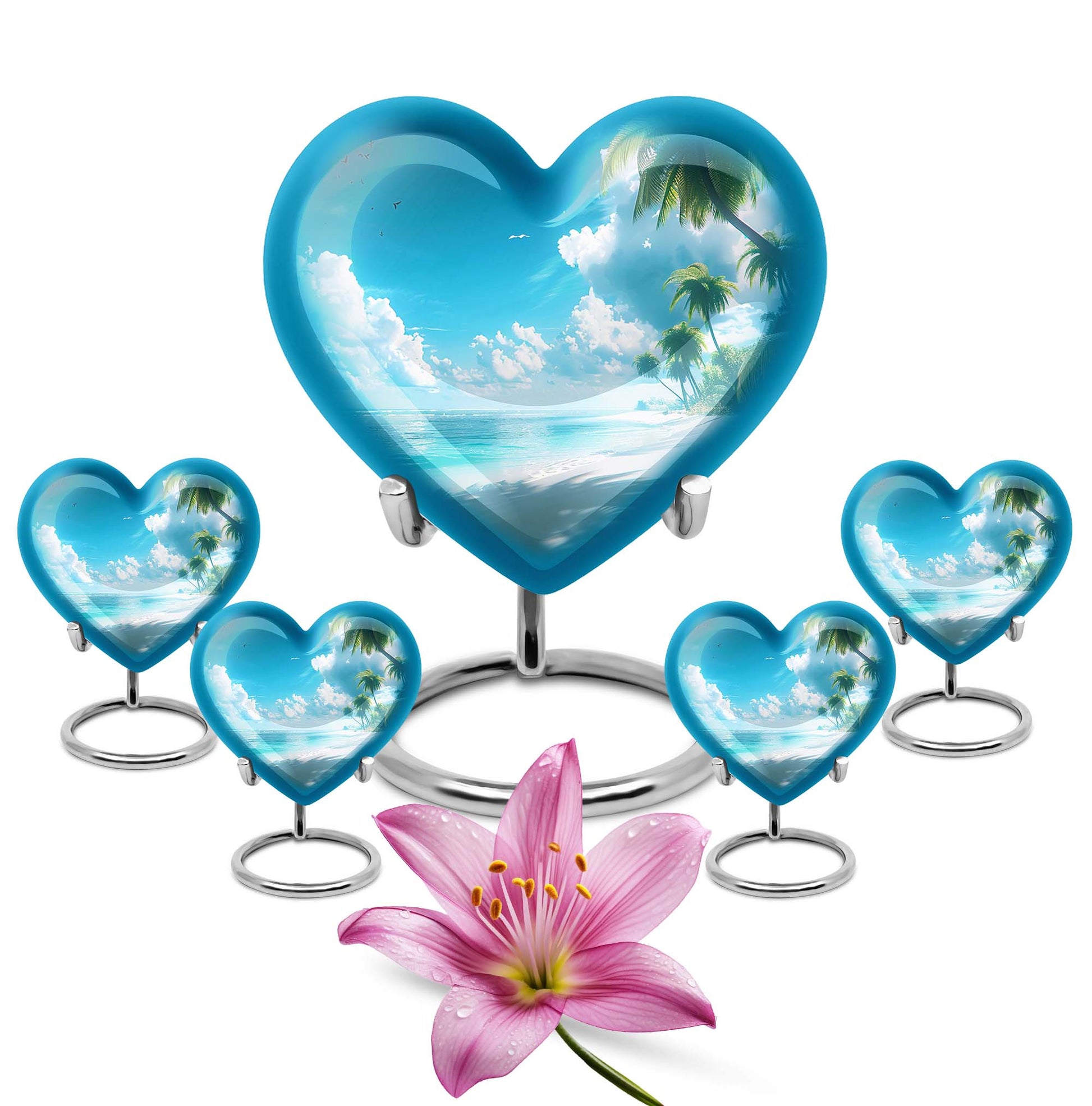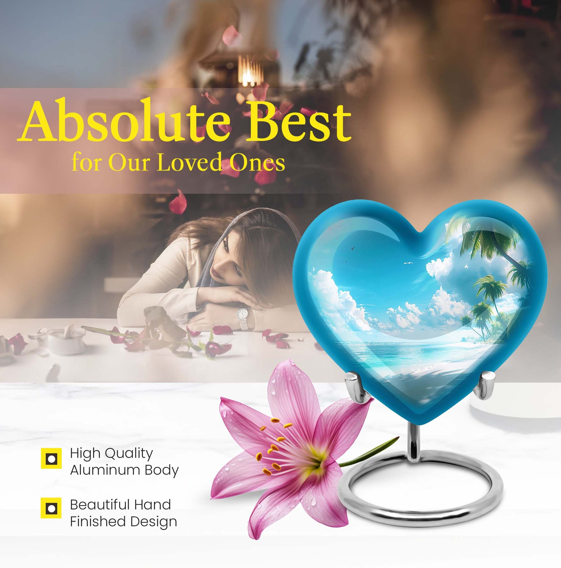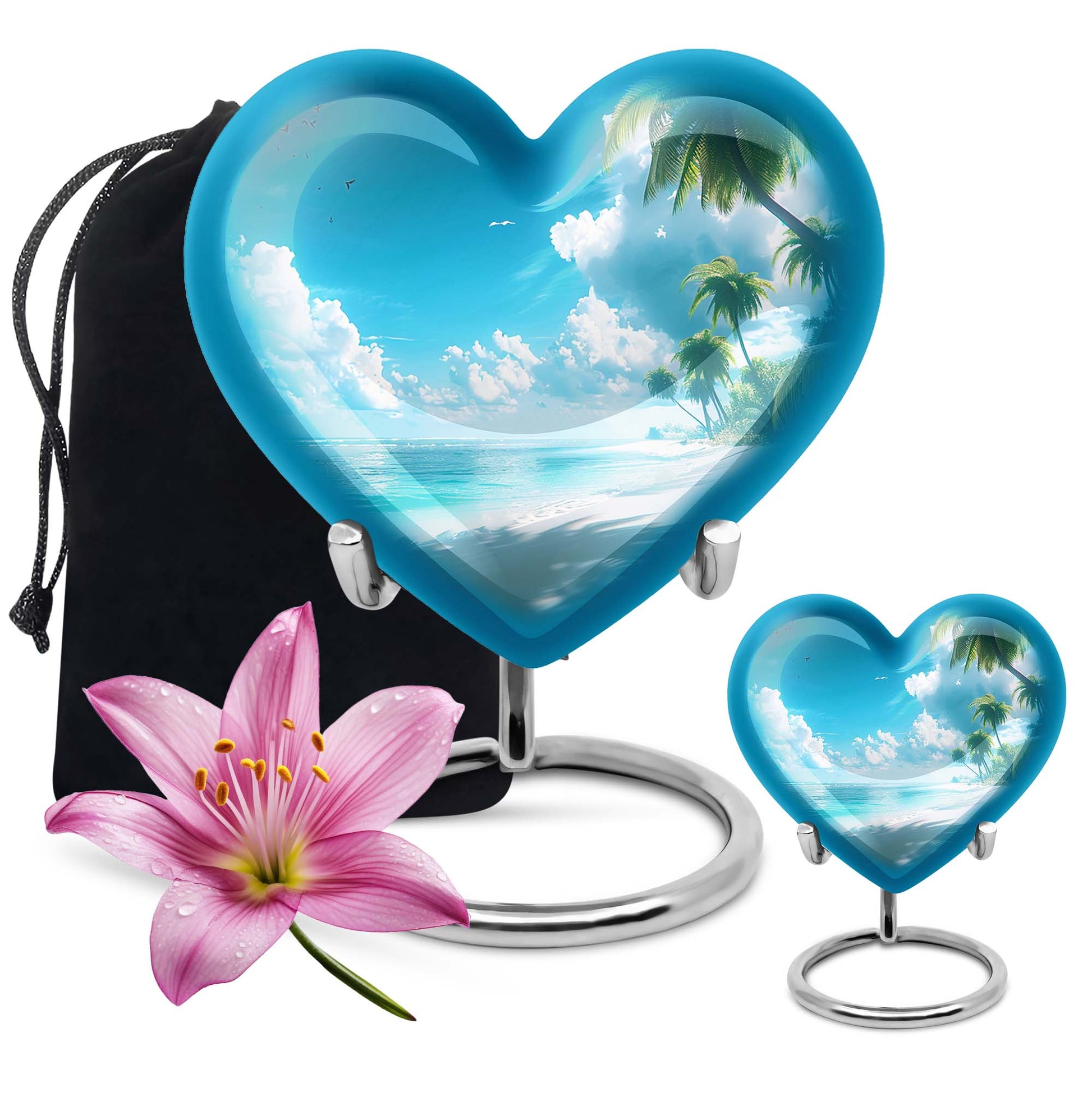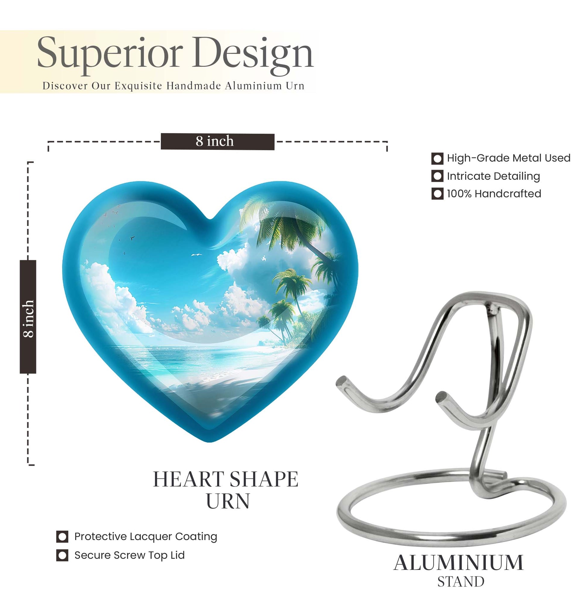 Commemorate your loved ones and keep them close to your heart with this exquisitely crafted 10-Inch Beach Urn. This large urn is meticulously fabricated using the finest Aluminium, lending it an enduring quality. Weighing a mere 3.3 pounds, it is aptly sized for your convenience. Irrespective of whether you seek 'funeral urns for burial' or 'cremation urn for Dad', our Beach Urn capably addresses your needs. This heart urn, with its dimension of 10 inches in height and a capacity of 200 cubic inches, resonates with heartfelt symbolism. Discretely secure the ashes in the provided velvet pouch, enhancing the sanctity of the urn. Our urns can be personalized with the engraved names of the departed - a stoic reminder of their eternal presence. Befitting the remembrance of lived moments, the urn effloresces life's essence with its floral theme. This 'memorial urn' is more than just an 'urn for human adult'; it's a tribute to the unceasing bonds that outlive time itself. Veering away from traditional 'burial urns for cremation ashes', our 'adult burial cremation urns' affirm the adage, 'love never dies'.