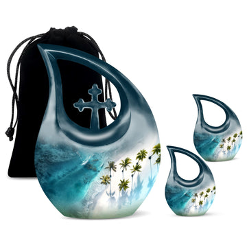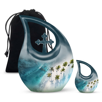 Construct the ideal memorial for your cherished loved one with our Beach Urn, a unique find among memorial urns. Made from durable aluminium, this 10-inch urn is not only stylish but also sturdy, with a weight of 3.3 pounds. Standout with its 'Cross Drop' design, our urn is fitting for those seeking a peaceful and serene memorial piece. It holds up to 200 cubic inches of ashes and comes in a velvet pouch for safe containment. This large urn can be customized to suit your personal preference – you can engrave names to make this tribute even more meaningful and personal. Suitable even for those searching for small urns for ashes, mini urns for ashes, or Purple urns. This urn is a beautiful blend of devotion, style, and durability, creating the perfect resting place for your loved one. Note: While 'Design' is not emphasized, its tangible attributes are.