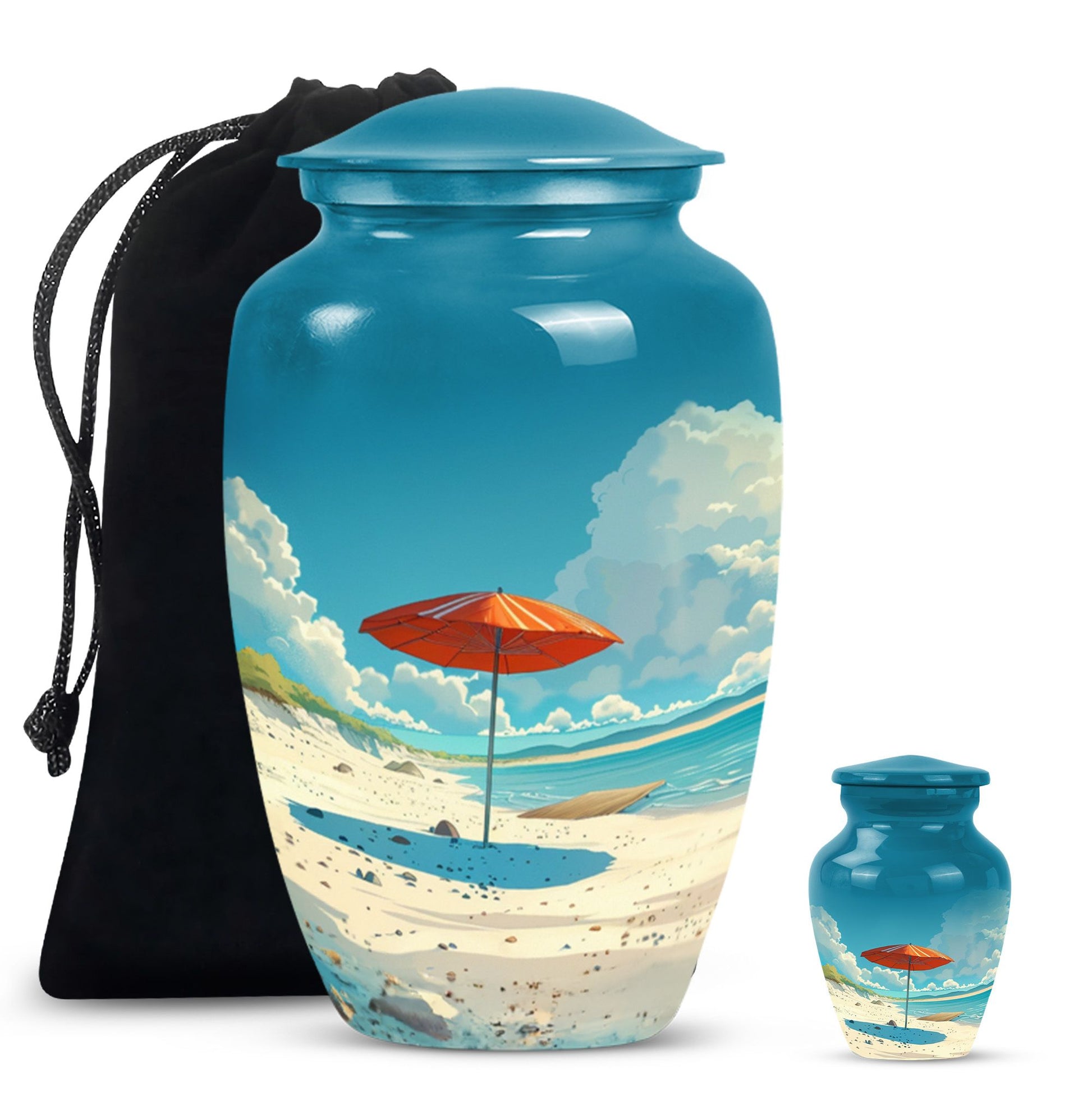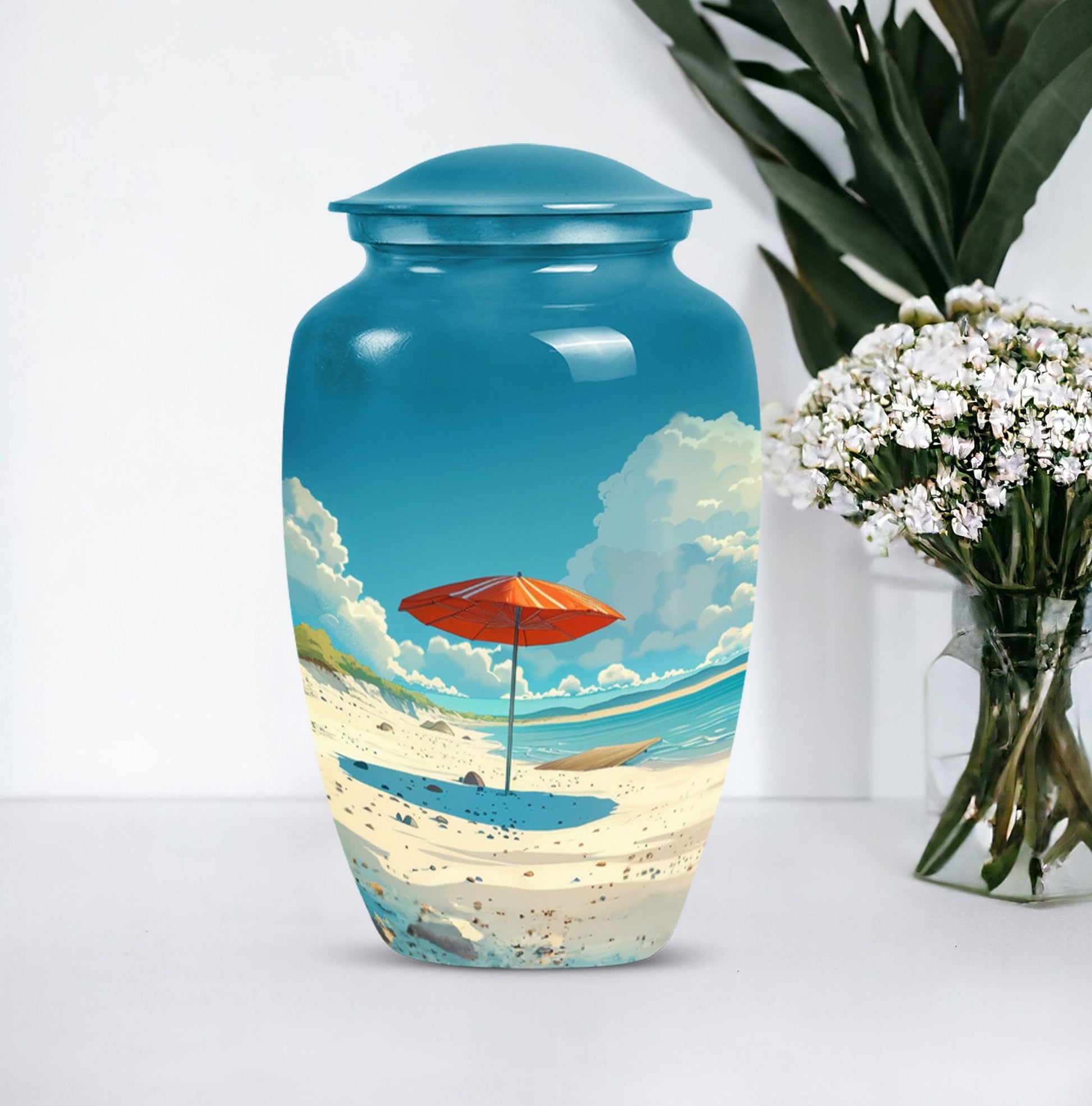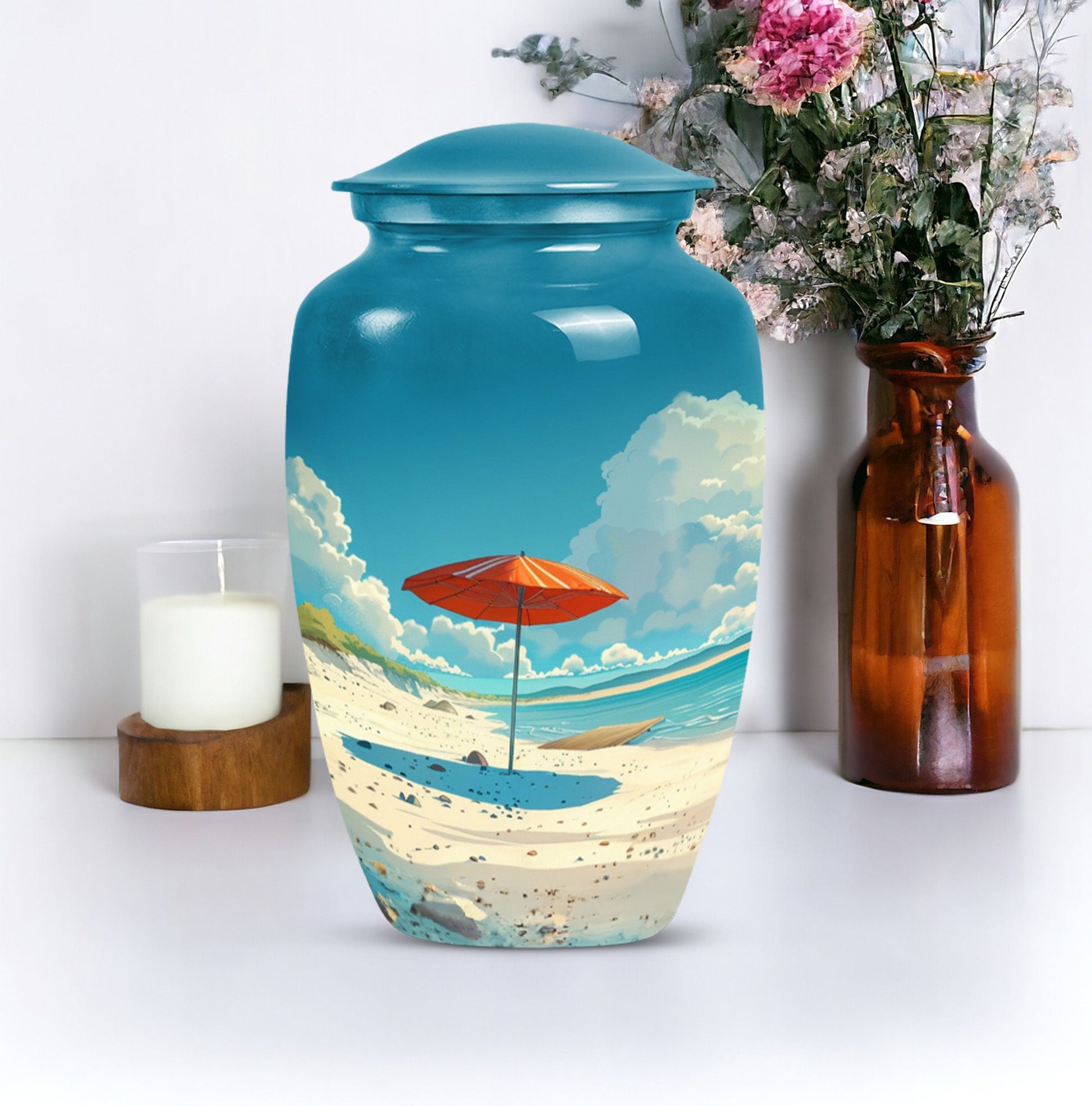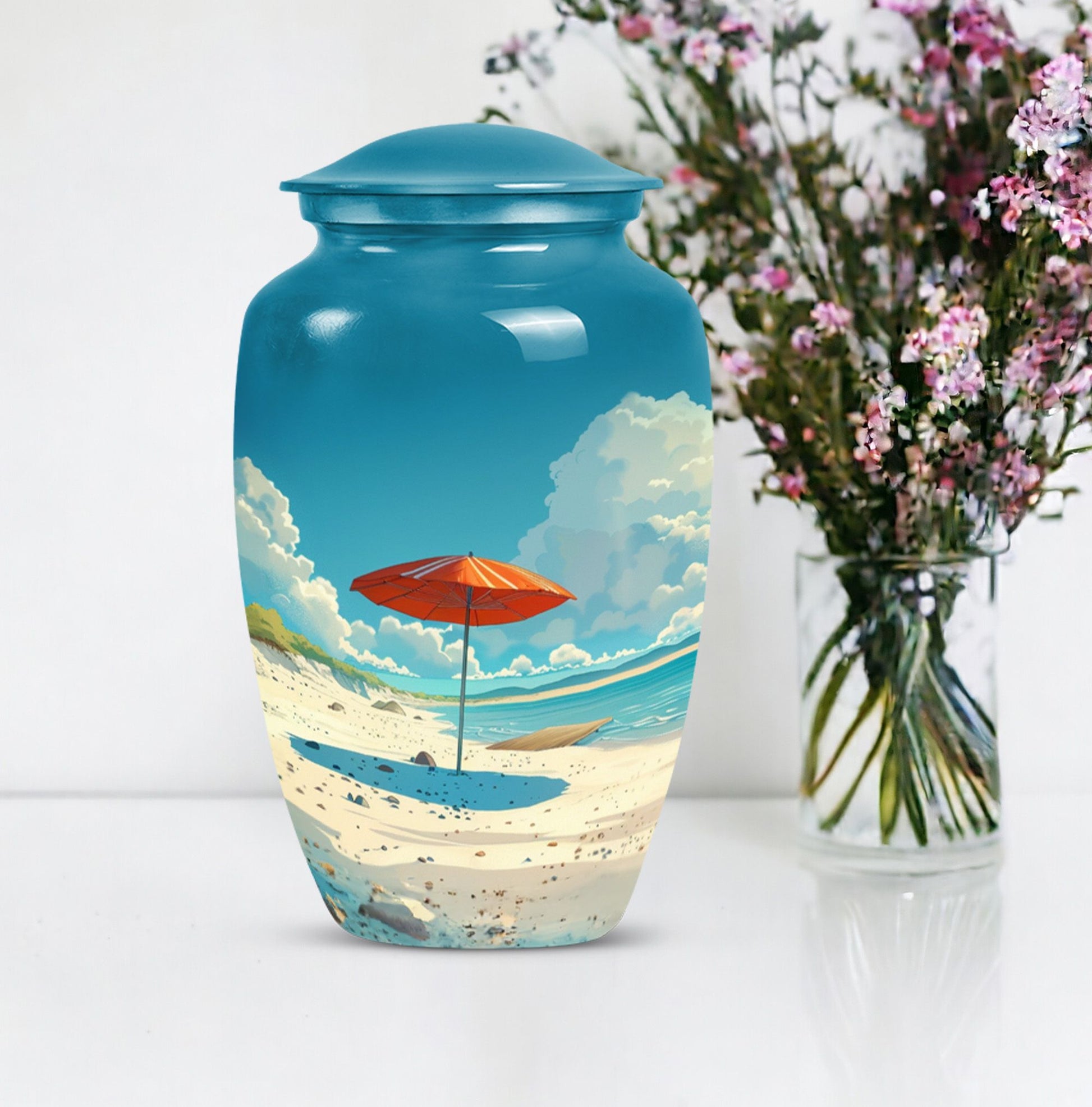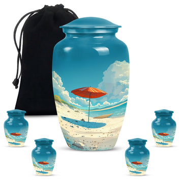 Cherish your loved one's memory with our compelling Beach Urn. This timeless and classic large urn stands 10 inches tall, crafted of resilient aluminium material. With a capacity of 200 cubic inches, it's ideal for containing human ashes. Weighing a modest 3.3 pounds, it can be conveniently transported for memorial ceremonies or burials. A unique feature is the inclusion of a velvet pouch, lending an extra layer of respect and privacy to the ashes' containment. For a personal touch, the urn allows for customization; you can honor your departed by engraving their names on it. It's graced with a delicate floral theme, setting a serene and harmonious tone fitting for a final resting place. This cremation urn serves as a poignant tribute, making it an ideal choice for funeral processional needs. This urn is exceptional in the realm of memorial funeral urns, seamlessly merging tradition with significance.