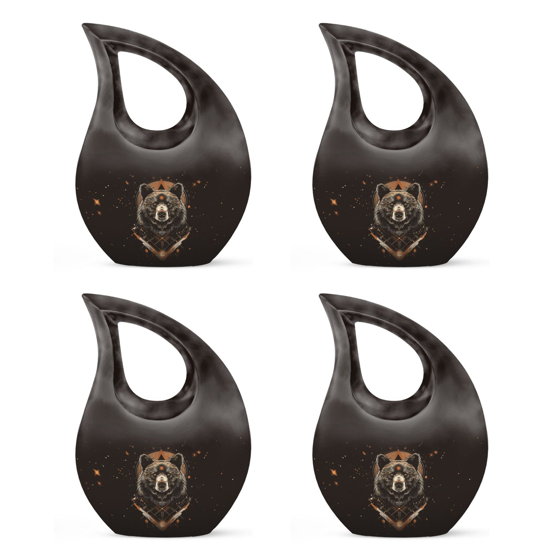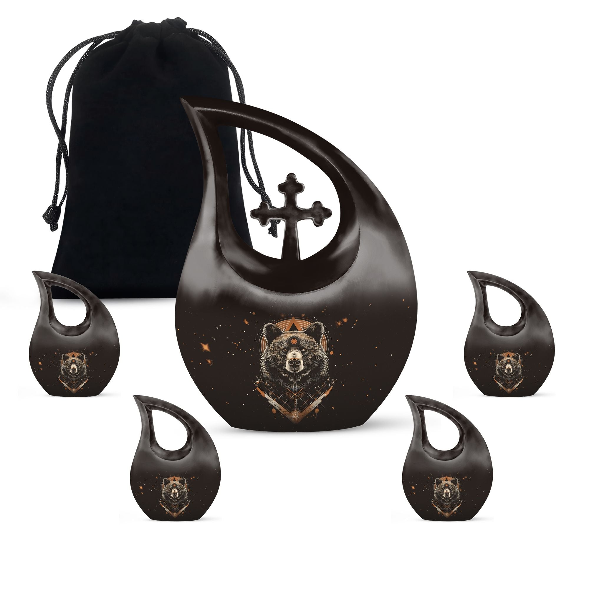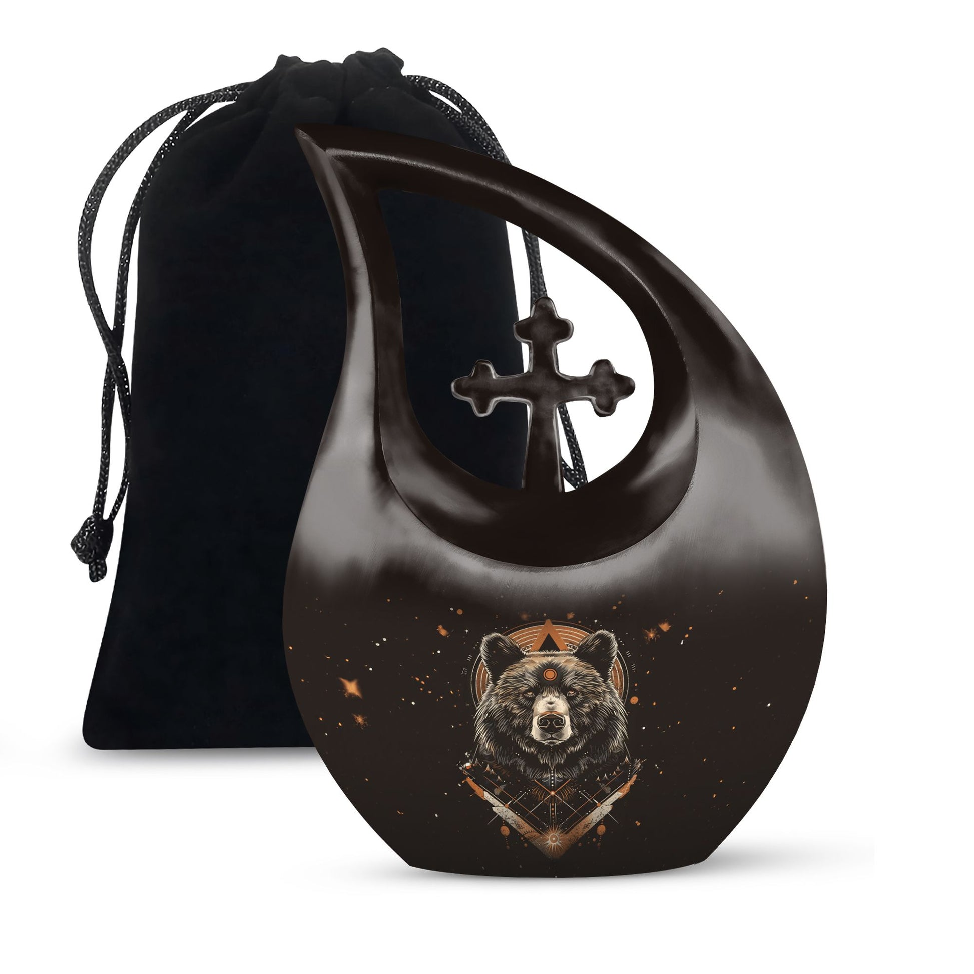 Introducing our distinguished Bear Urn, an exceptional selection when shopping for urns online. Fashioned from robust aluminium, this memorial urn measures 10 inches in height and weighs a sturdy 3.3 pounds. Its size not only adds to its exquisite presence but allows a substantial capacity of 200 cubic inches, making it one of our most popular large urns. Each package is complemented with a soft velvet pouch, a thoughtful containment for cherished ashes. This cremation box for adults boasts a unique 'Cross Drop' theme, evoking a sense of serenity and honor. You can make this urn truly reflective of your loved one by personalizing it with engraved names. This urn is not only a respectful resting place but a keepsake memory box. Popular search queries by adults and seniors in this category include 'cool urns' and 'metal urns for ashes'. So why search further when you can commemorate your treasured one with our Bear themed urn.