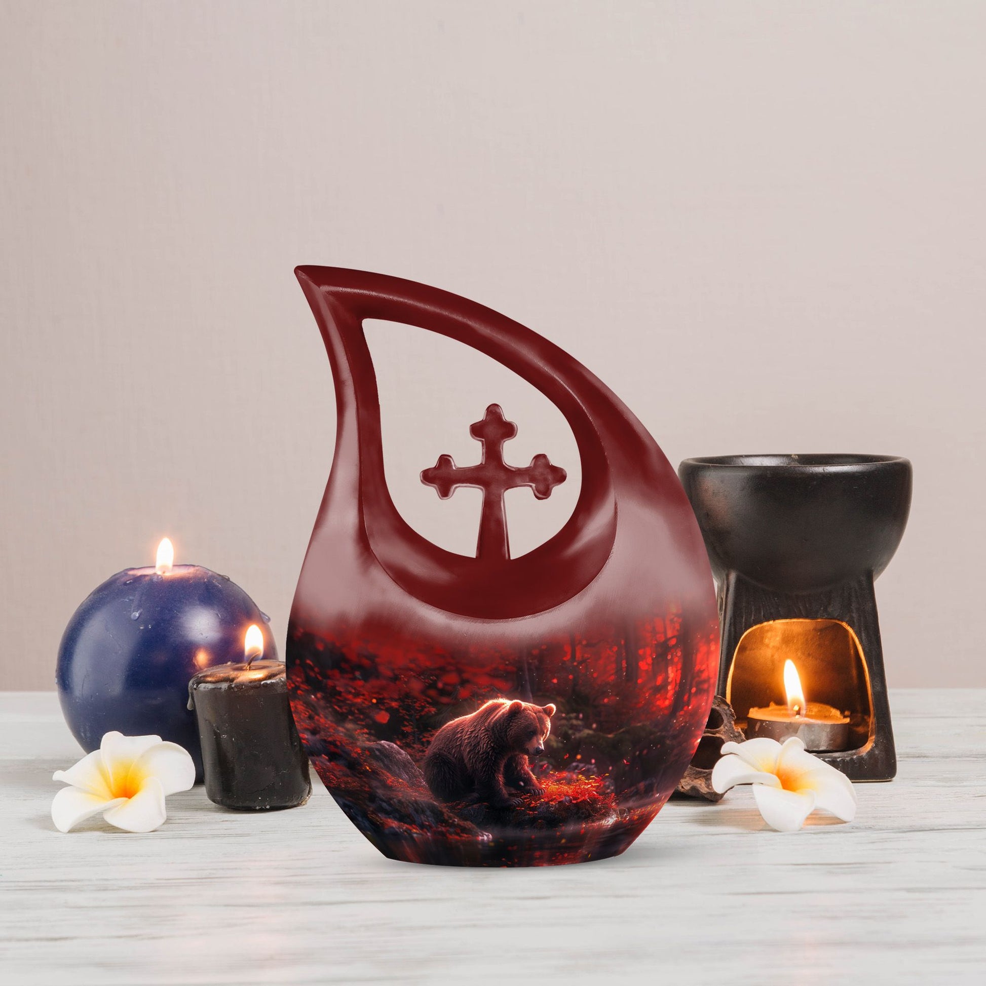This large decorative urn features detailed bear artwork symbolizing strength, protection, and eternal love. Expertly crafted from durable aluminum, it serves as a cremation urn adult large option that blends beauty with reliability. The secure screw-top lid ensures ashes are safely preserved, while its elegant, natural design complements both modern and traditional memorial settings. Whether you need cremation urns large, a large funeral urn, or cremation urns for large human ashes adult, this piece provides both functionality and heartfelt expression. Families needing flexible memorial solutions can choose matching keepsake options, including keepsake set of 1, keepsake set of 4, or large with 4 keepsake combinations.