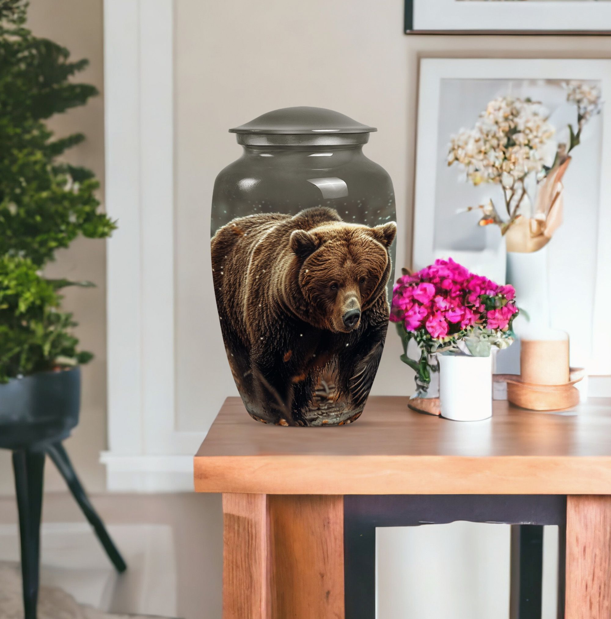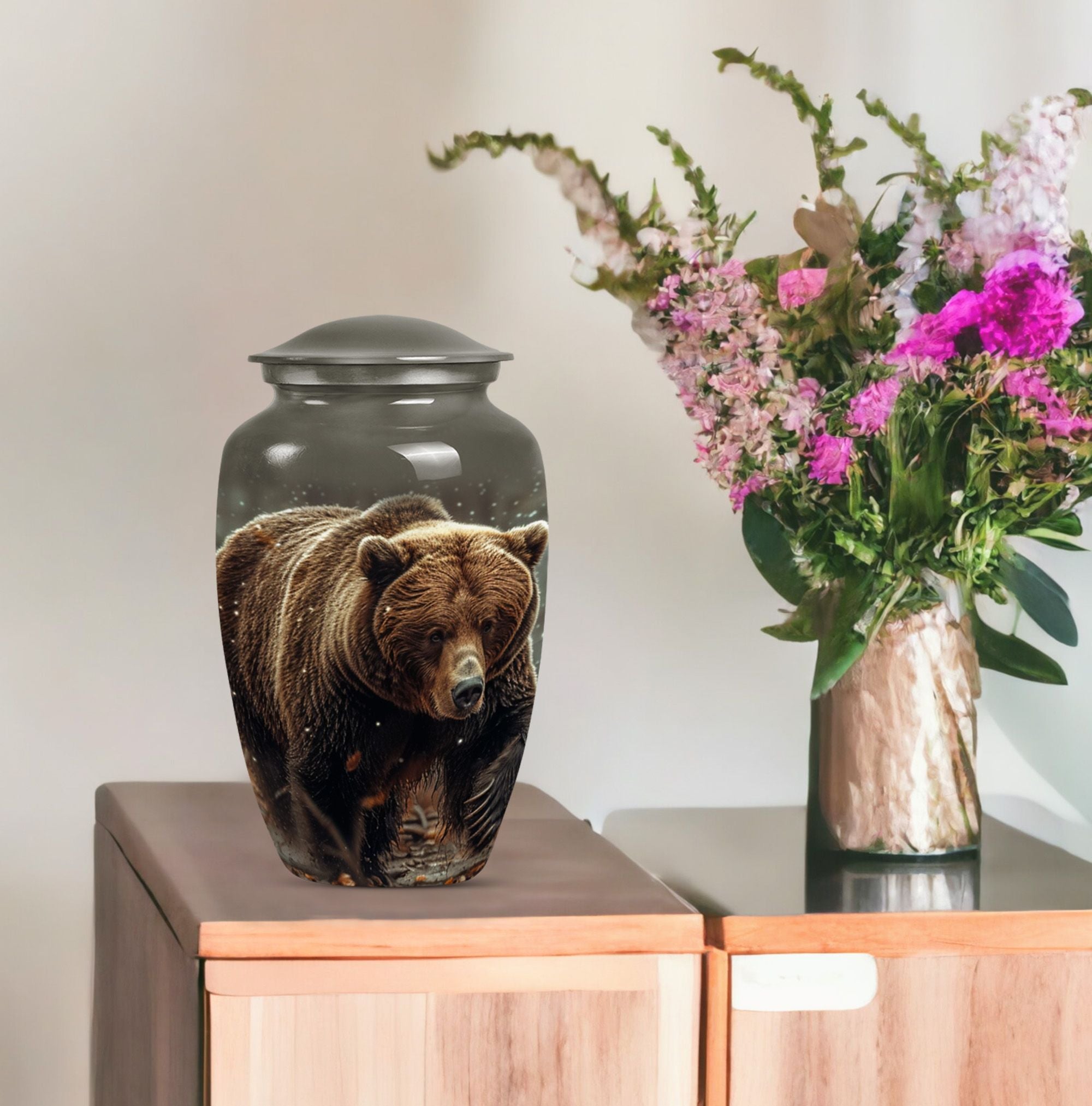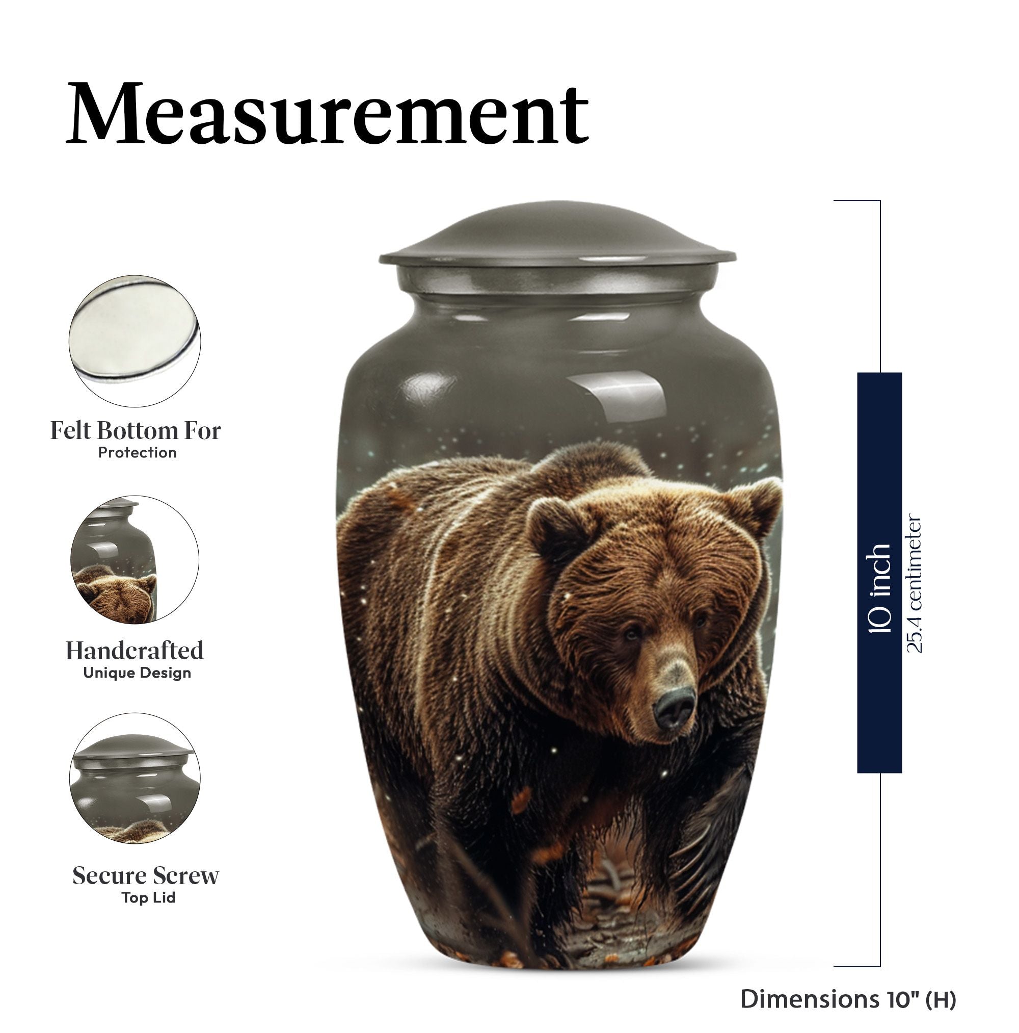 Unveil a cherishable treasure to honor your loved ones with our Purple Meadow, a 10-inch tall, large-sized Bear Urn. Crafted of high-quality aluminium, this funeral urn for human ashes adult combines durability and exquisite aesthetics. With a holding capacity of 200 cubic inches, it comfortably accommodates human ashes, making it an ideal commemoration piece. Our Bear Urn is no ordinary urn; it combines the unparalleled Classic Urn layout with the enchanting Purple Meadow theme. Its weight of 3.3 pounds adds to its sturdy structure. The urn is carefully packed within a velvet pouch ensuring secure containment. Further, a unique feature that adds a personal touch is its customization. Our urn lets you personalize with engraved names, connecting you deeper with the departed soul. It serves a dual purpose – as a significant memorial urn for burial in ground and also as a large metal urn to hold ashes. Offering solace in your grieving moments, this cremation urn is more than just an urn; it's a sacred vessel of memories and love.