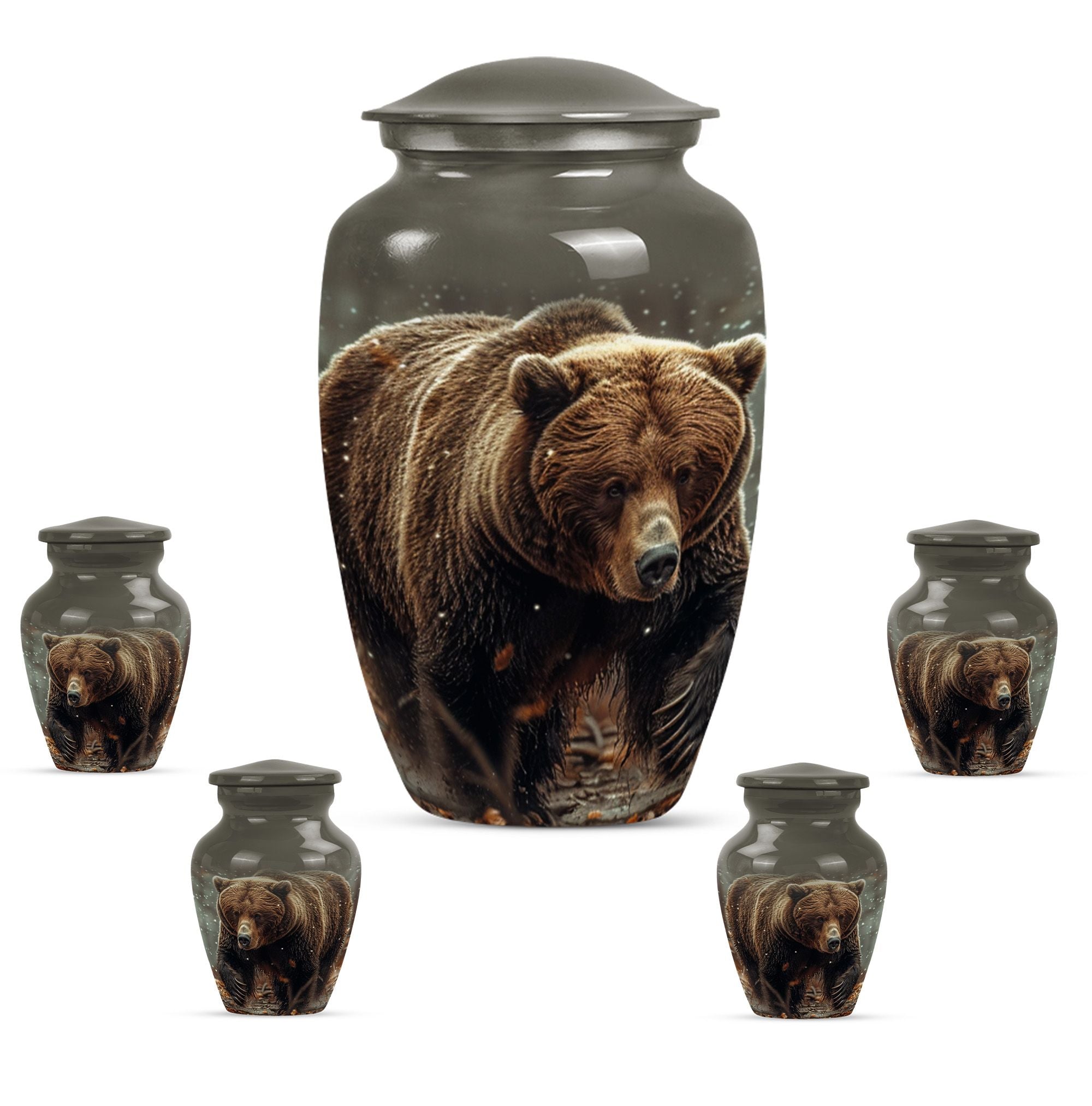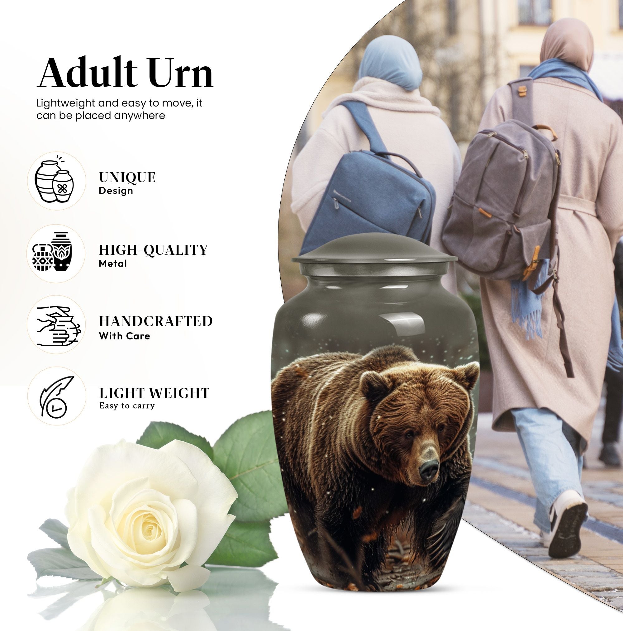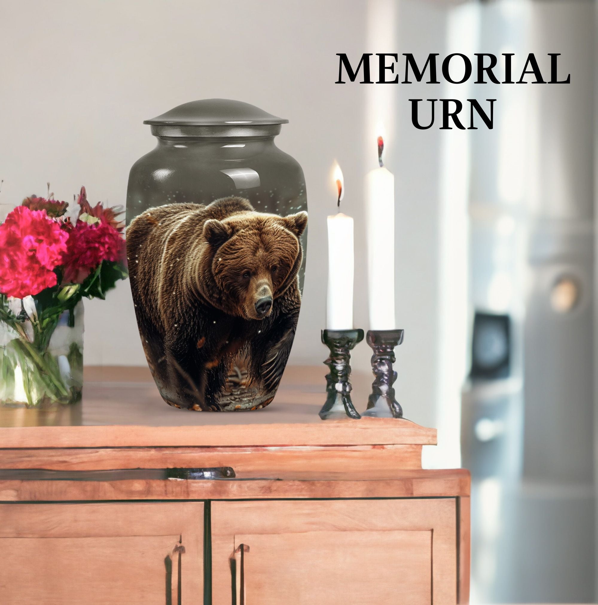Unveil a cherishable treasure to honor your loved ones with our Purple Meadow, a 10-inch tall, large-sized Bear Urn. Crafted of high-quality aluminium, this funeral urn for human ashes adult combines durability and exquisite aesthetics. With a holding capacity of 200 cubic inches, it comfortably accommodates human ashes, making it an ideal commemoration piece. Our Bear Urn is no ordinary urn; it combines the unparalleled Classic Urn layout with the enchanting Purple Meadow theme. Its weight of 3.3 pounds adds to its sturdy structure. The urn is carefully packed within a velvet pouch ensuring secure containment. Further, a unique feature that adds a personal touch is its customization. Our urn lets you personalize with engraved names, connecting you deeper with the departed soul. It serves a dual purpose – as a significant memorial urn for burial in ground and also as a large metal urn to hold ashes. Offering solace in your grieving moments, this cremation urn is more than just an urn; it's a sacred vessel of memories and love.