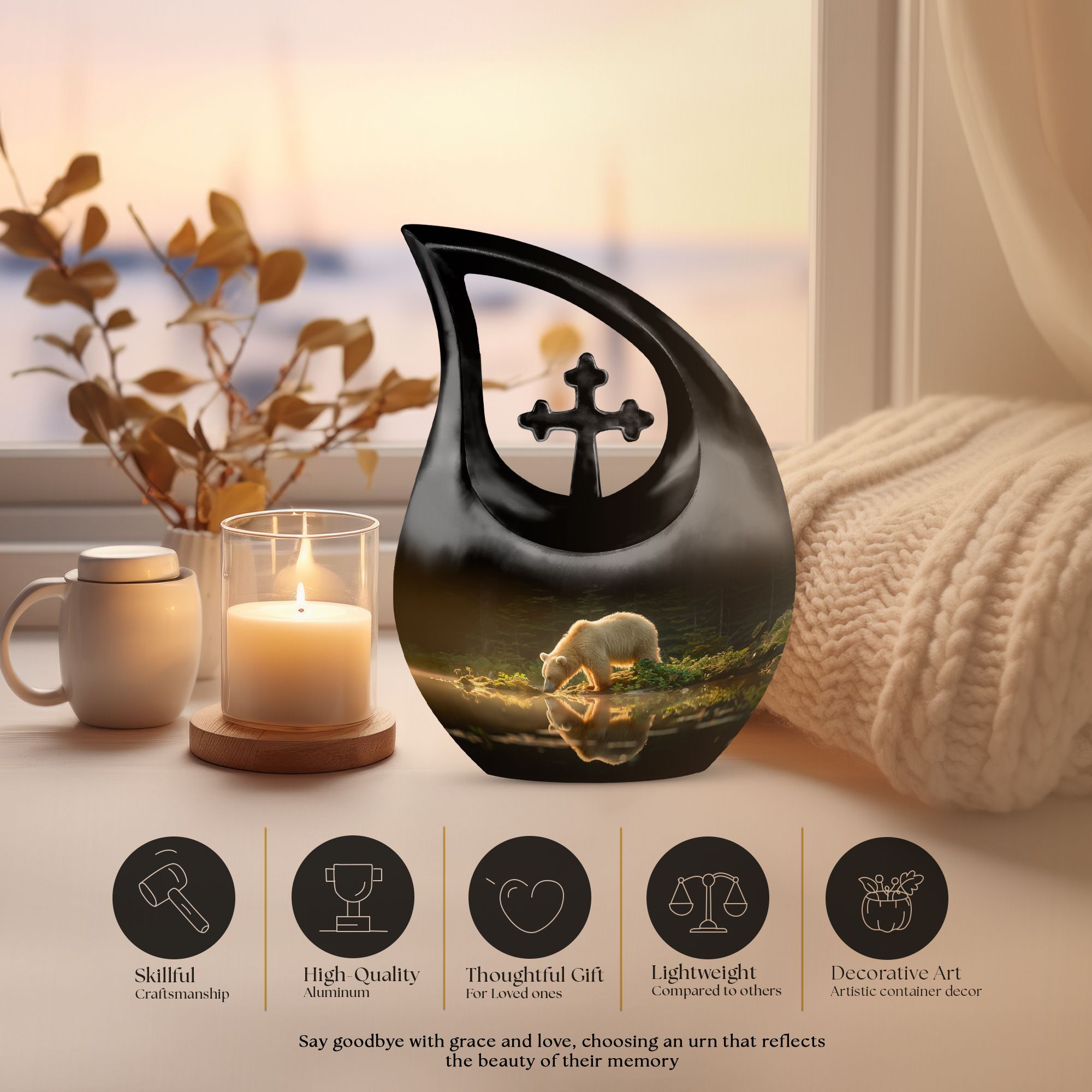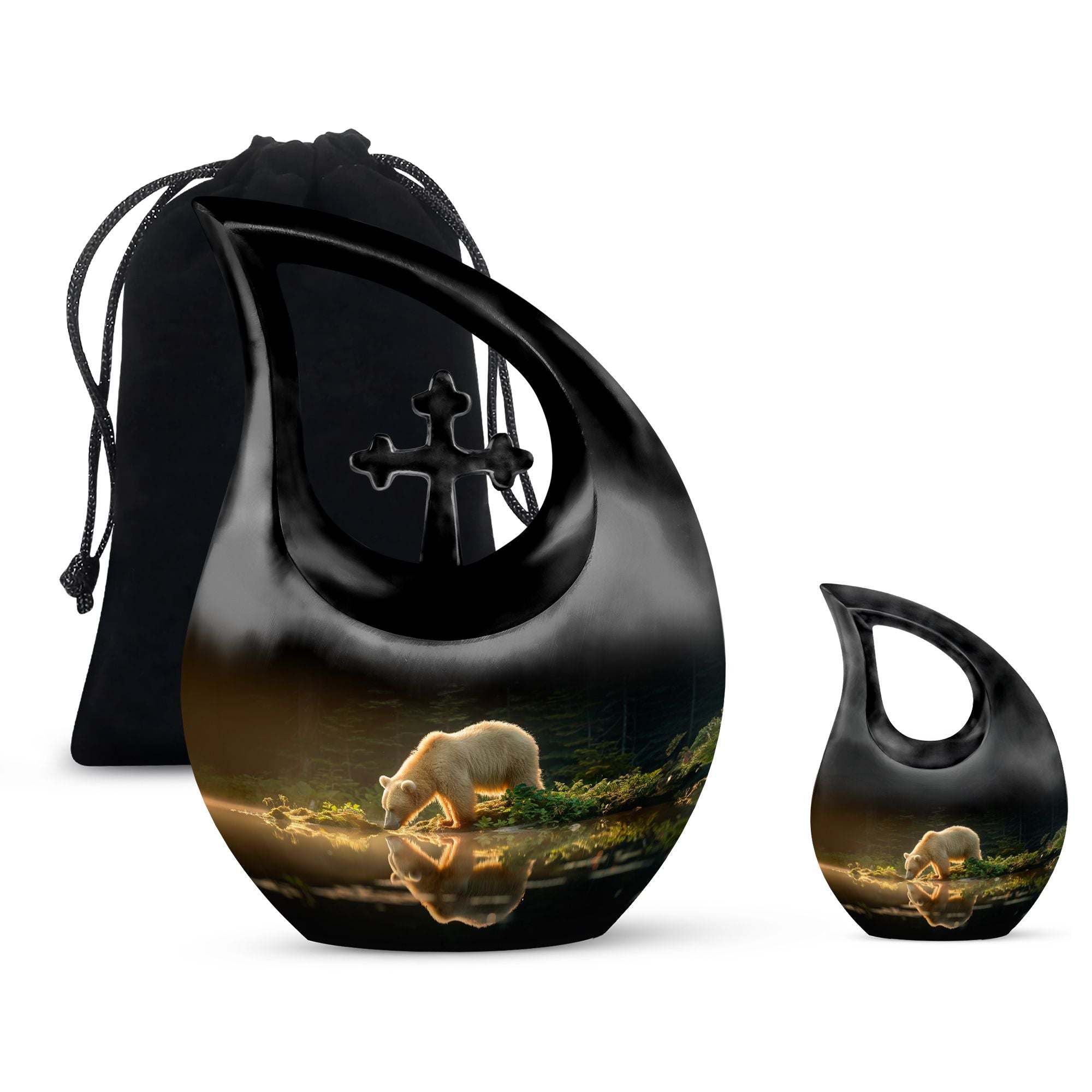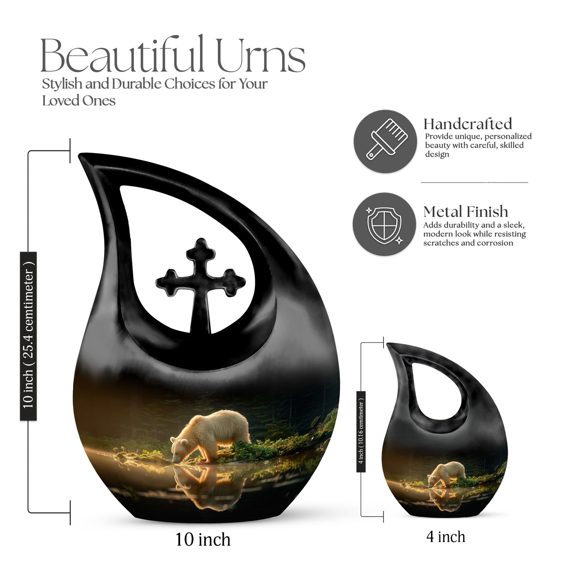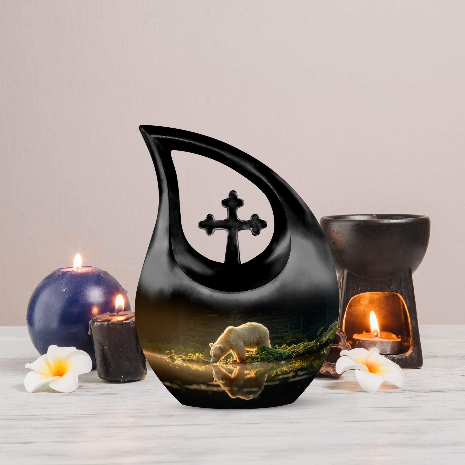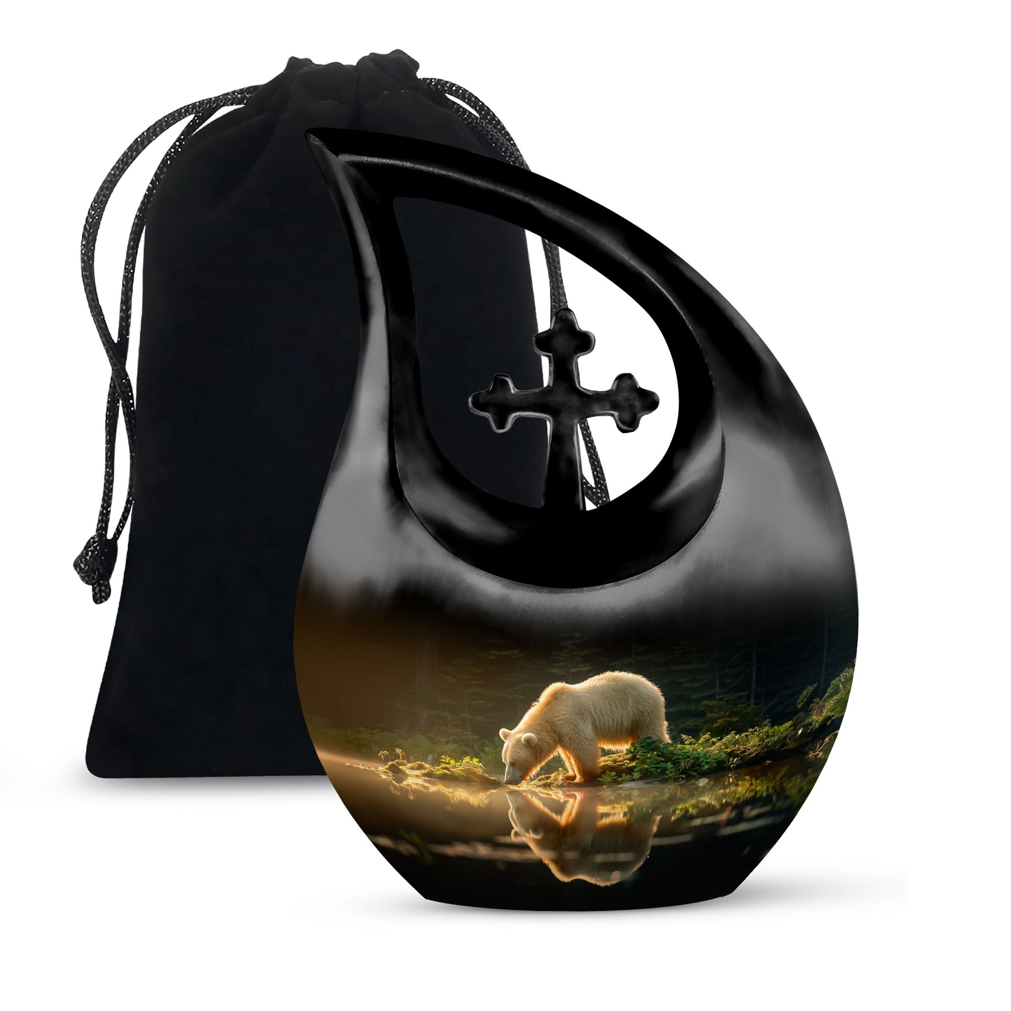 Presenting a thoughtfully designed Bear Urn, an ideal keepsake for ashes for a man. This robust memorial urn, blending size and integrity, stands 10 inches tall. The durable aluminium construction can hold up to 200 cubic inches, offering lasting reliability. Each urn is finished in a singular 'Cross Drop' theme, symbolizing solace and hope. A companion urn meant for preserving cherished memories in an elegant form. Additionally, each urn comes with a velvet pouch to preserve and protect your loved one's ashes. The full weight is only 3.3 pounds, ensuring it's substantial yet manageable to handle. You can uniquely personalize it with the names of your departed loved ones, adding a touch of tenderness to the design. Despite its profound significance, this urn also resonates well with classy decor, ensuring it doesn't draw undue attention. Few items of this category offer such a comprehensive blend of design, quality and emotion. Honor your loved one's memory with this curated memorial keepsake available for purchase. Explore urn vaults for sale, discover more cool urns, and find a companion in grieving with our large urn collection.