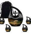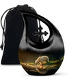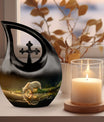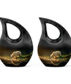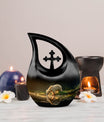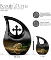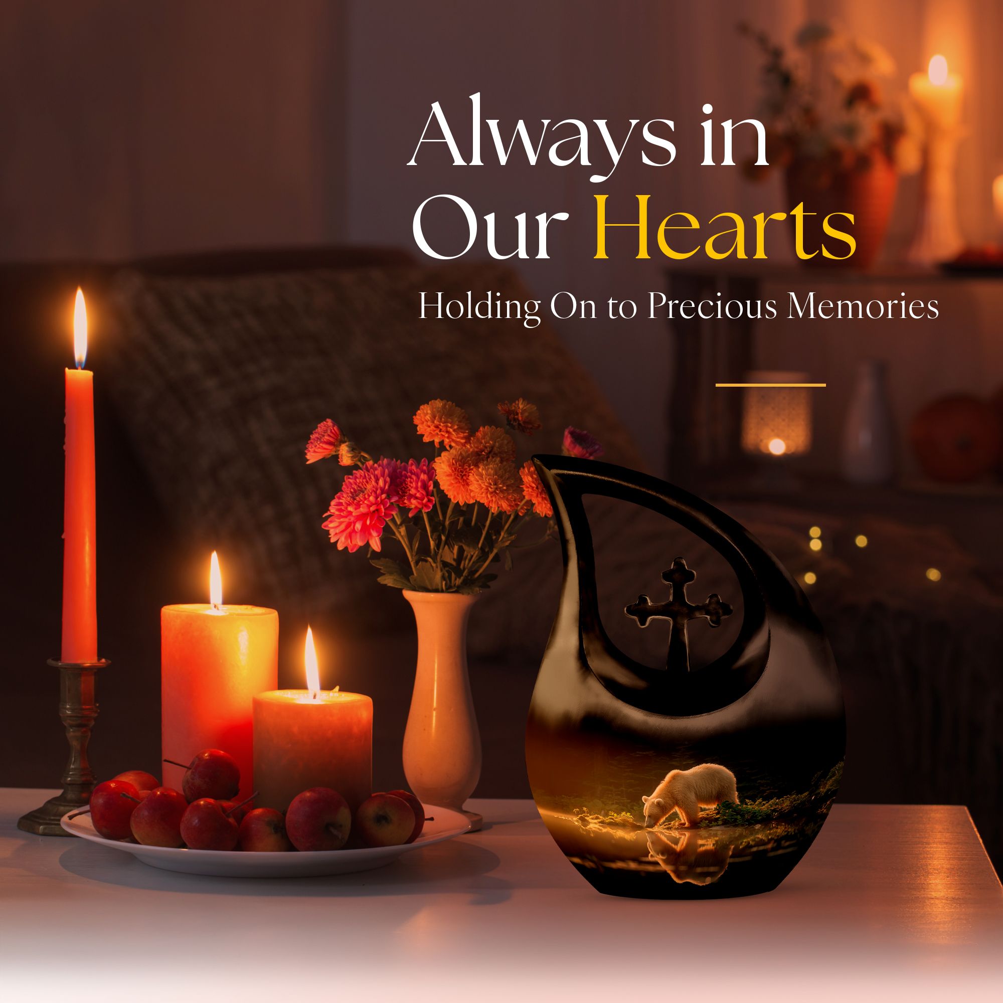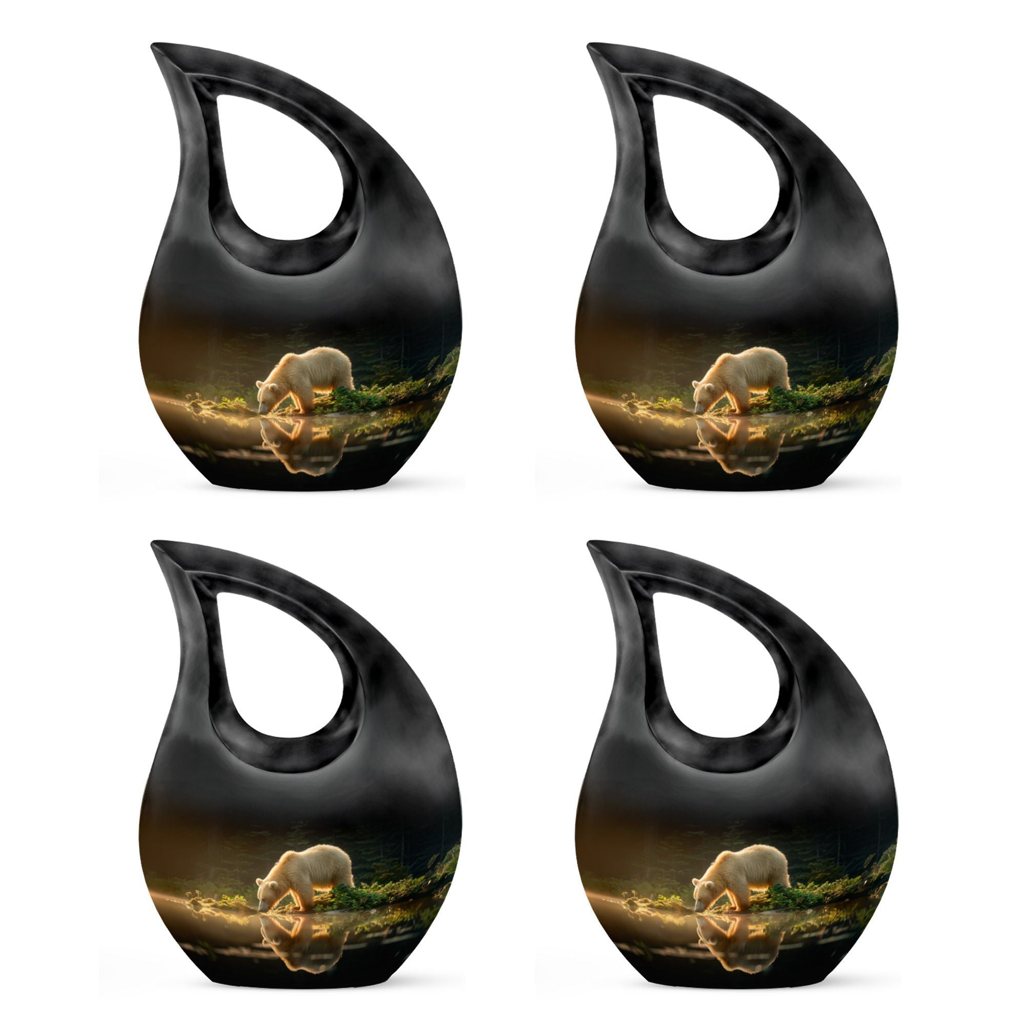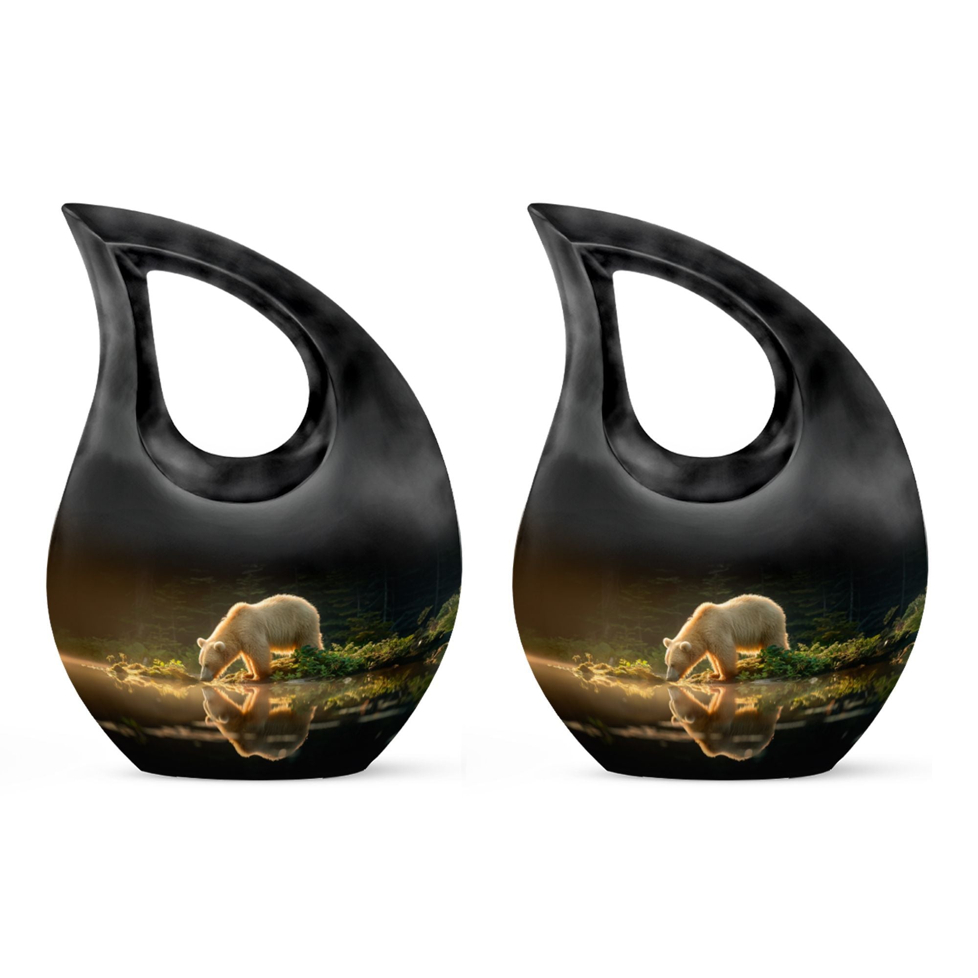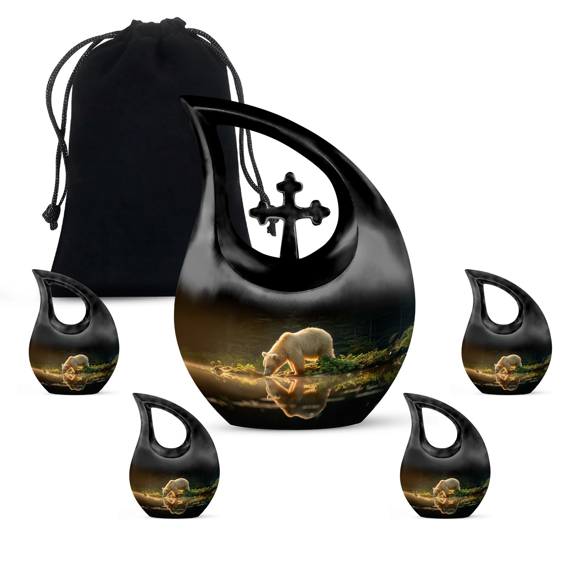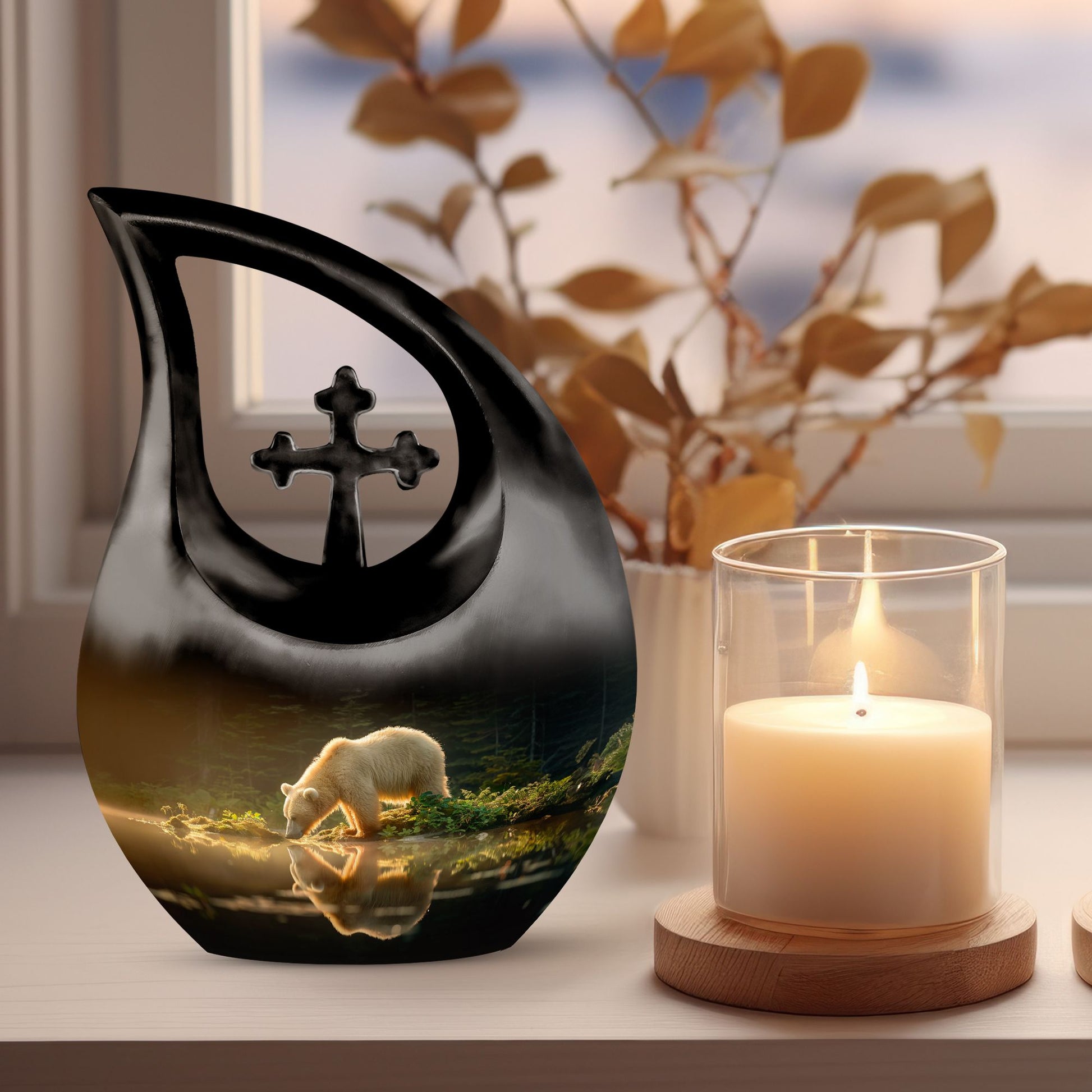 Presenting a thoughtfully designed Bear Urn, an ideal keepsake for ashes for a man. This robust memorial urn, blending size and integrity, stands 10 inches tall. The durable aluminium construction can hold up to 200 cubic inches, offering lasting reliability. Each urn is finished in a singular 'Cross Drop' theme, symbolizing solace and hope. A companion urn meant for preserving cherished memories in an elegant form. Additionally, each urn comes with a velvet pouch to preserve and protect your loved one's ashes. The full weight is only 3.3 pounds, ensuring it's substantial yet manageable to handle. You can uniquely personalize it with the names of your departed loved ones, adding a touch of tenderness to the design. Despite its profound significance, this urn also resonates well with classy decor, ensuring it doesn't draw undue attention. Few items of this category offer such a comprehensive blend of design, quality and emotion. Honor your loved one's memory with this curated memorial keepsake available for purchase. Explore urn vaults for sale, discover more cool urns, and find a companion in grieving with our large urn collection.