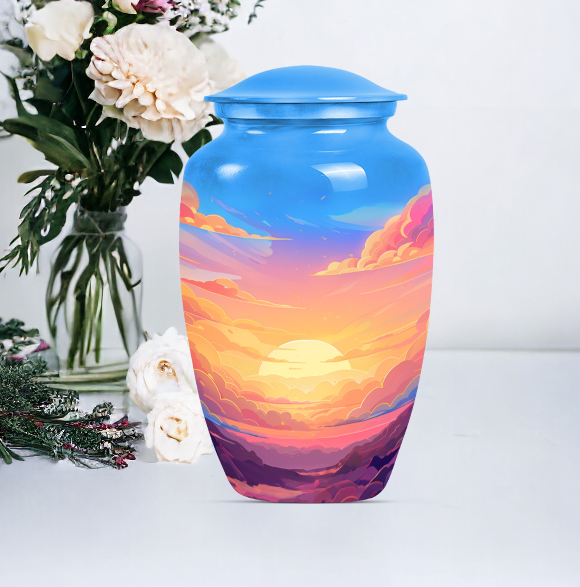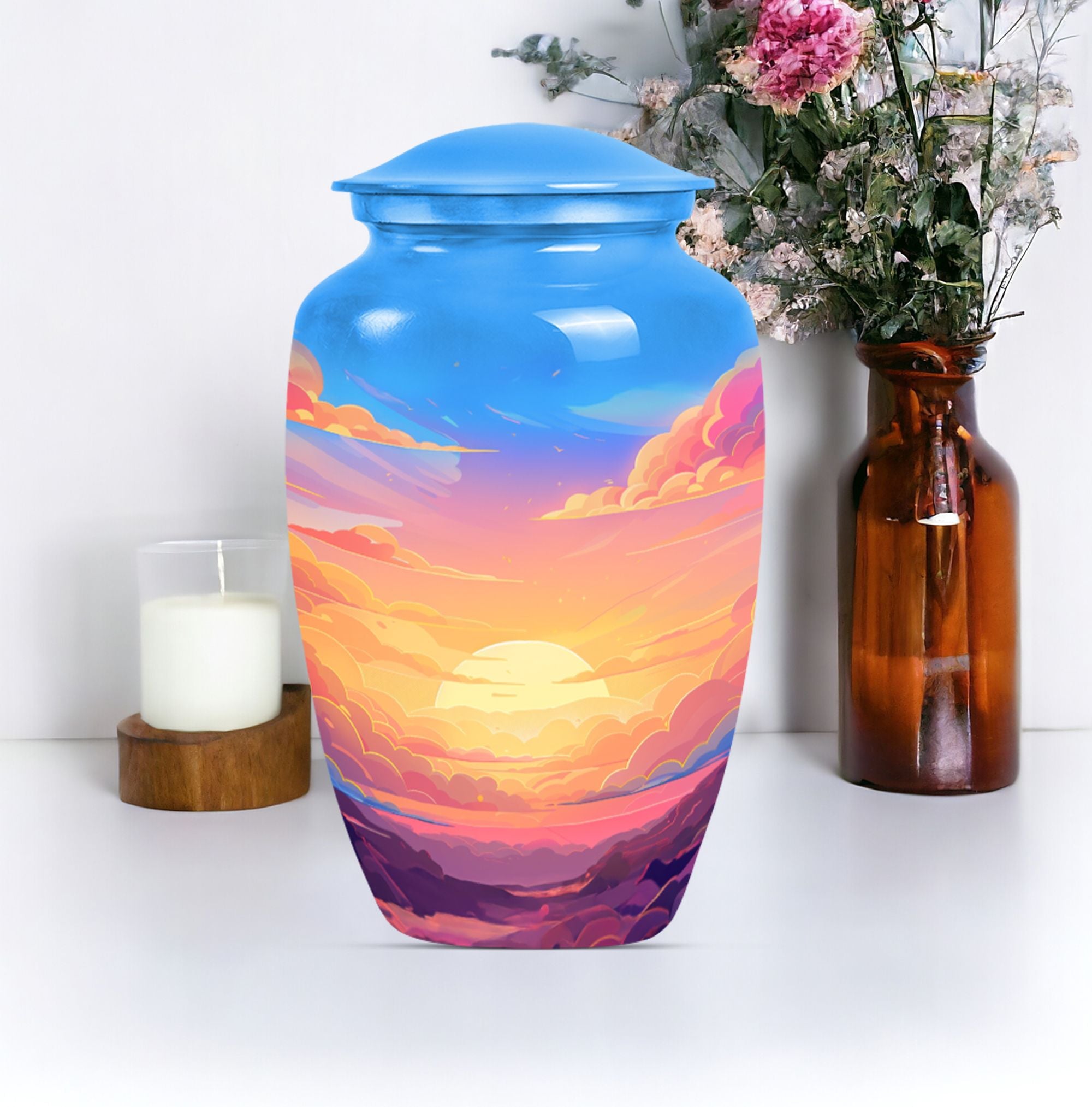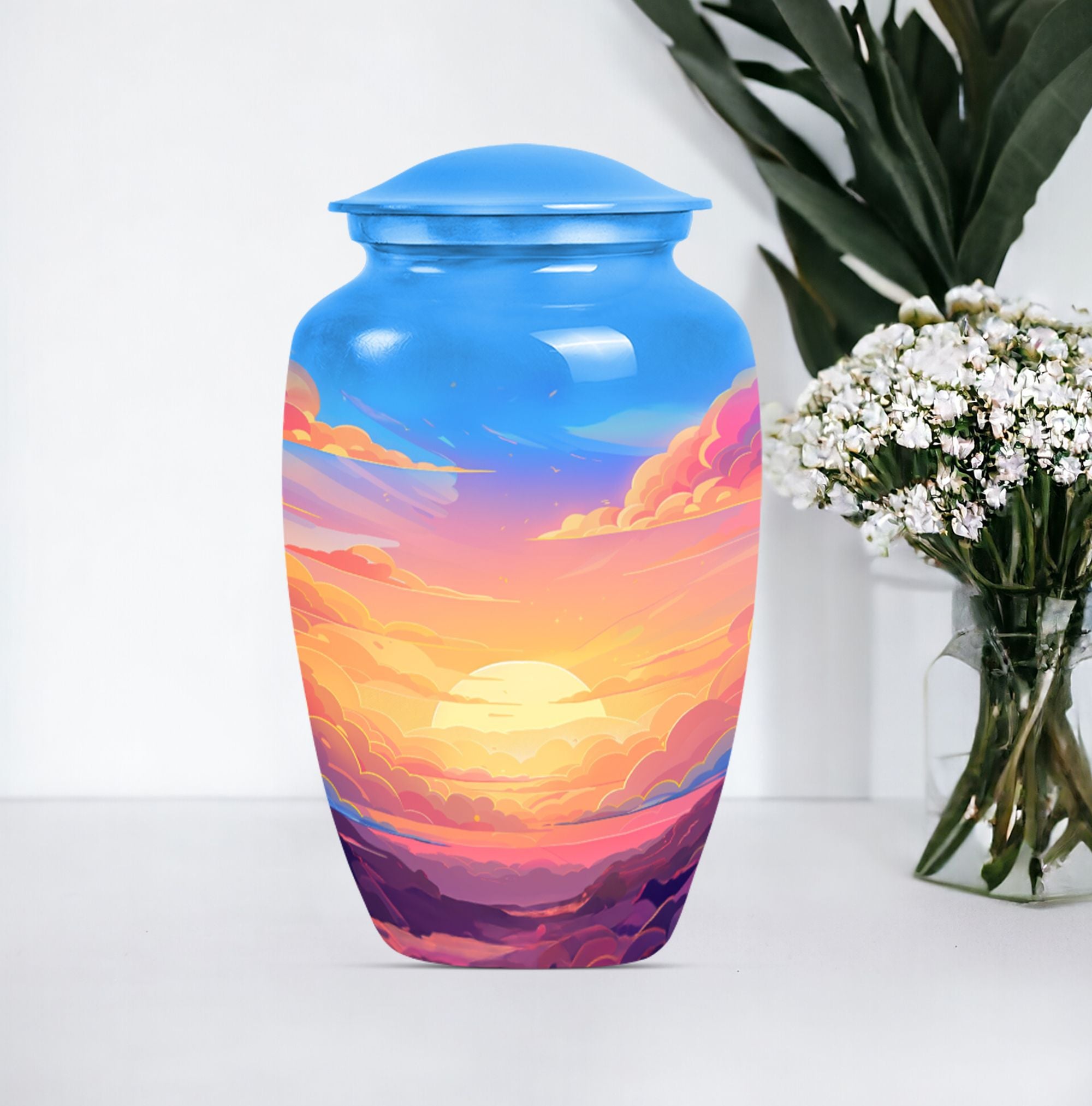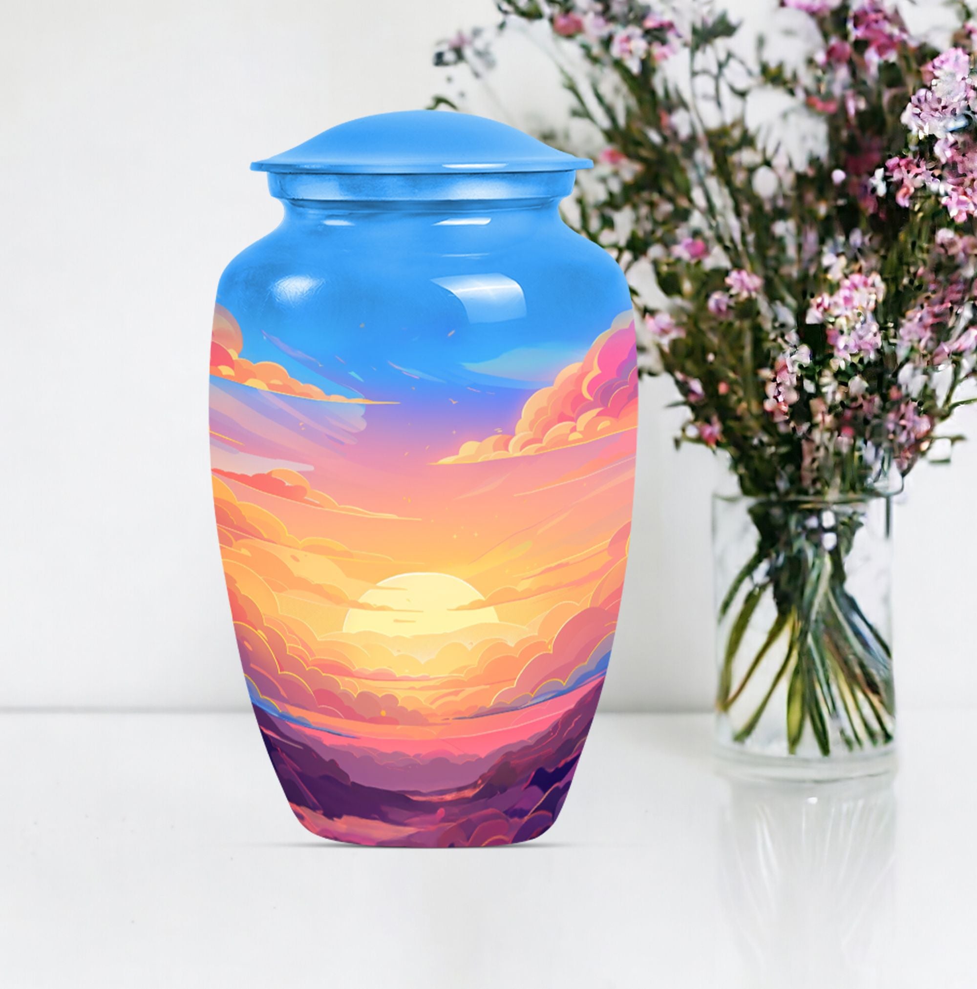 Express your everlasting love and honor your beloved mom bigheartedly with our 10-inch Classic Clouds Urn. This meticulously handcrafted aluminum funeral urn is not only capacious, accommodating up to 200 cubic inches of ashes, but weighs a modest 3.3 pounds, assuring effortless handling and placement. A comforting symbol of transcendence and freedom, the butterfly theme adds a touch of serenity. Each purchase is accompanied by a velvet pouch augmenting safe containment of the cherished remains. To make it even more special, we offer customization - personalize this large urn with your loved one's name. This unique memorial urn breathes out a distinct feel, far from the common 'earns for ashes' or 'custom cremation urns' you see online. Our Clouds Urn makes an ideal silent companion to preserve the physical presence of the departed. This is more than just a 'memorial adult urn' or 'human urn ash adult.' It's an emotionally evocative piece that captures quintessential elements of the rememberance, love, and miss.