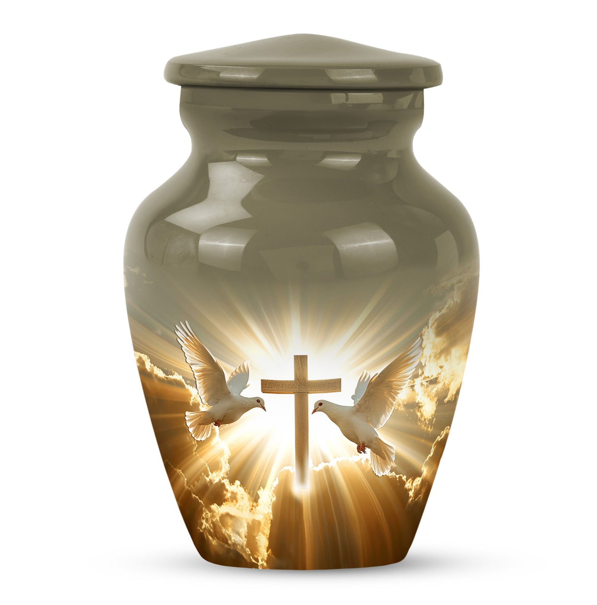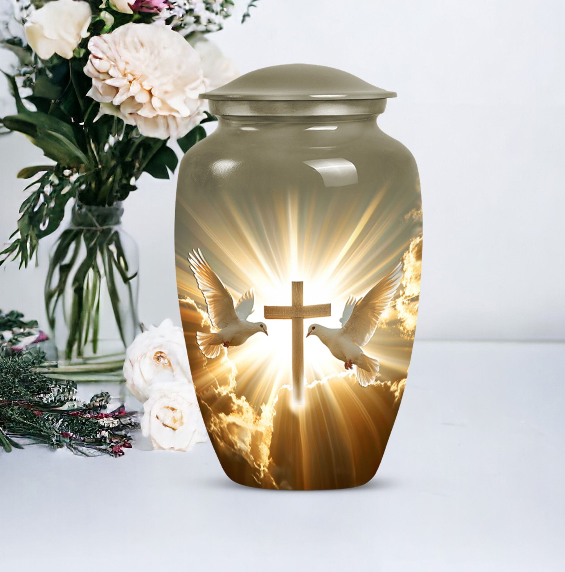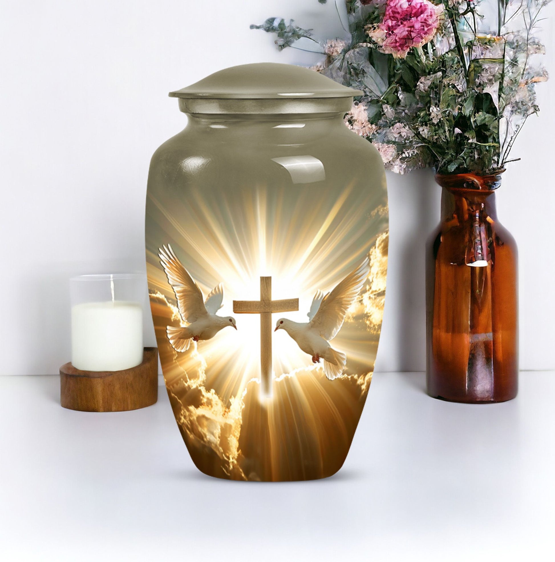 Adorned elegantly with flowering etchings on robust Aluminum, this 10-inch large urn captures the sense of serenity and beauty ideal for a cherished keepsake. Weighing 3.3 pounds, this sizable dove urn is designed with reverence to safely preserve a capacity of 200 cubic inches of beloved one's ashes. This memorial urn, often searched as 'memorial human urns for ashes', 'memorial funeral urns for ashes', and 'ashes of love', offers not only a resting place but a celebration of a person's life, treasuring them in an eternal memory. The package includes a velvet pouch, especially for containment of ashes, projecting care into every detail of this beloved object. Customizability is offered so you can personalize with engraved names, further adding an intimate touch to this cremation object. This is more than just an 'adult burial urn'; it's a tribute, a love messenger, solidifying memories into an object of reverence.