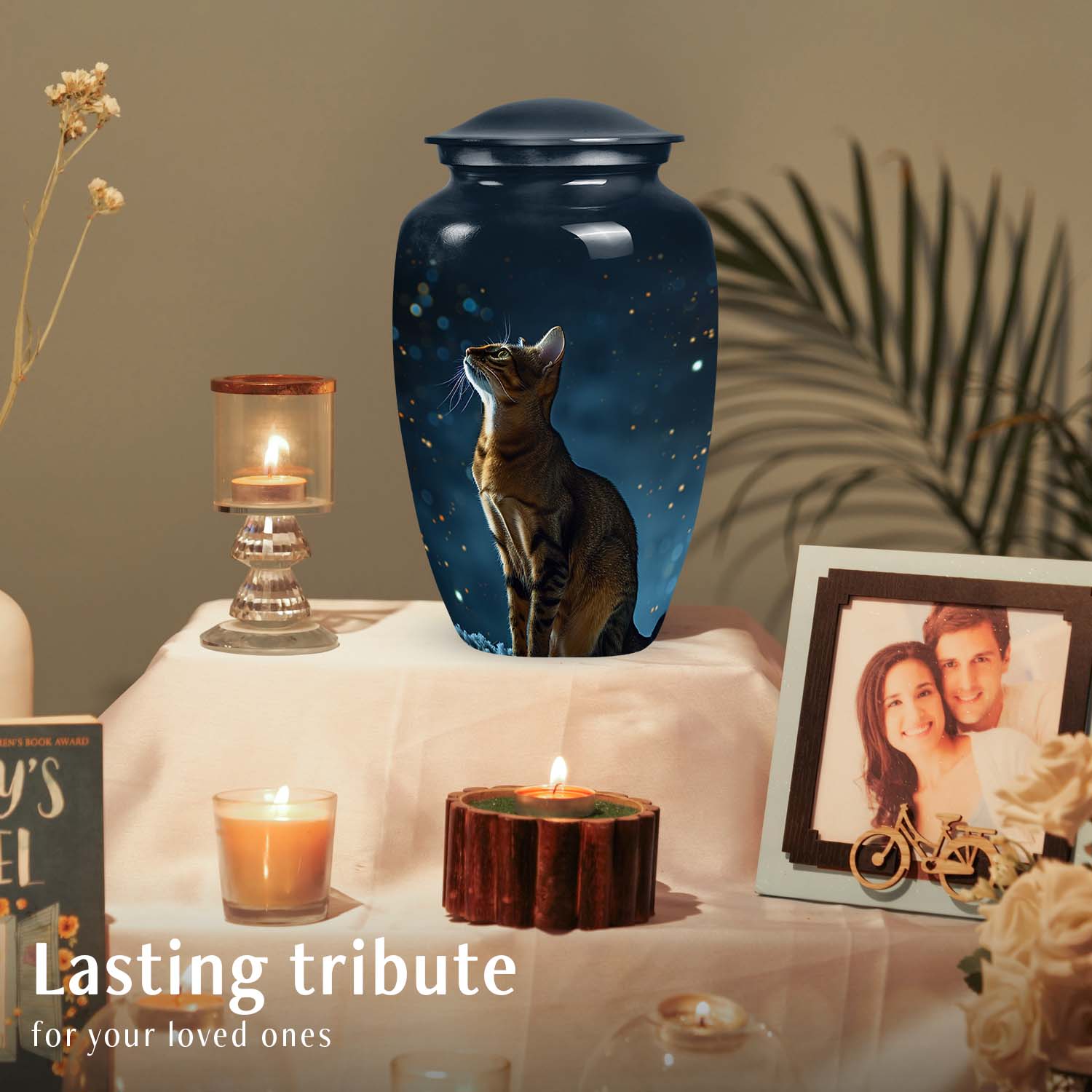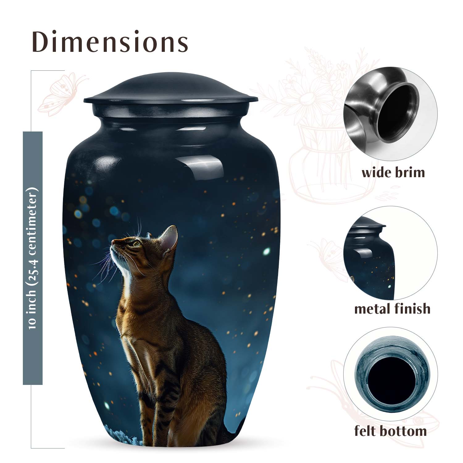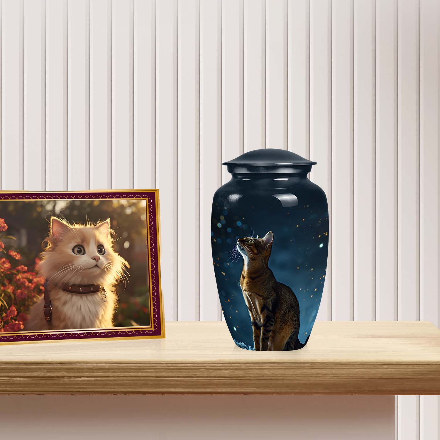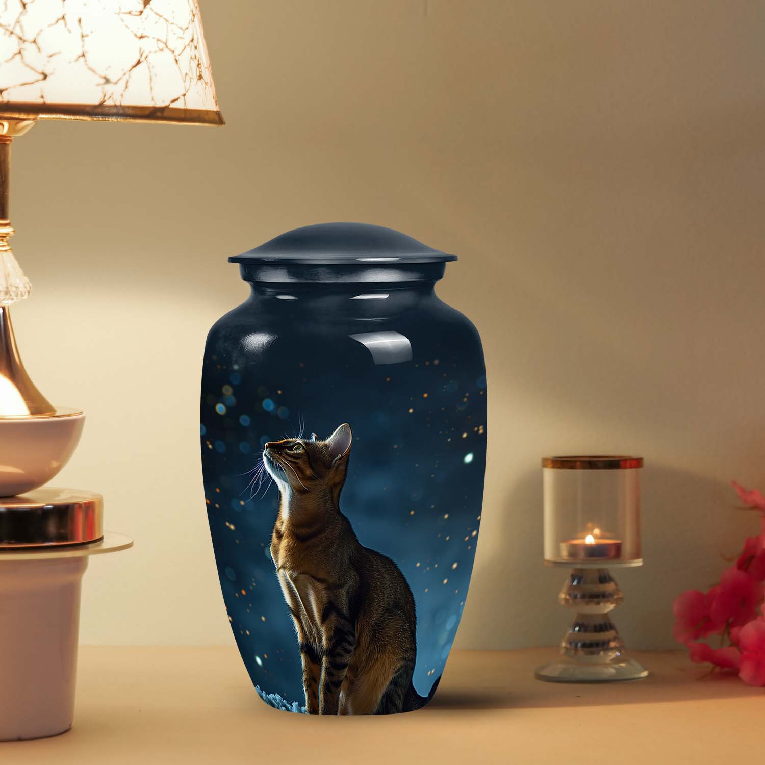 Crafted by skilled artisans, this urn features a deep midnight-blue finish highlighted with cosmic tones and soft starlit accents. The intricate engraving of a cat gazing toward the stars evokes love, hope, and remembrance. Designed as part of our custom pet urns for cats collection, it can be personalized with engraved names, celestial motifs, or touching quotes. Each urn is a masterpiece of emotion and artistry — perfect for indoor display or as an outdoor cat urn in a protected memorial space.