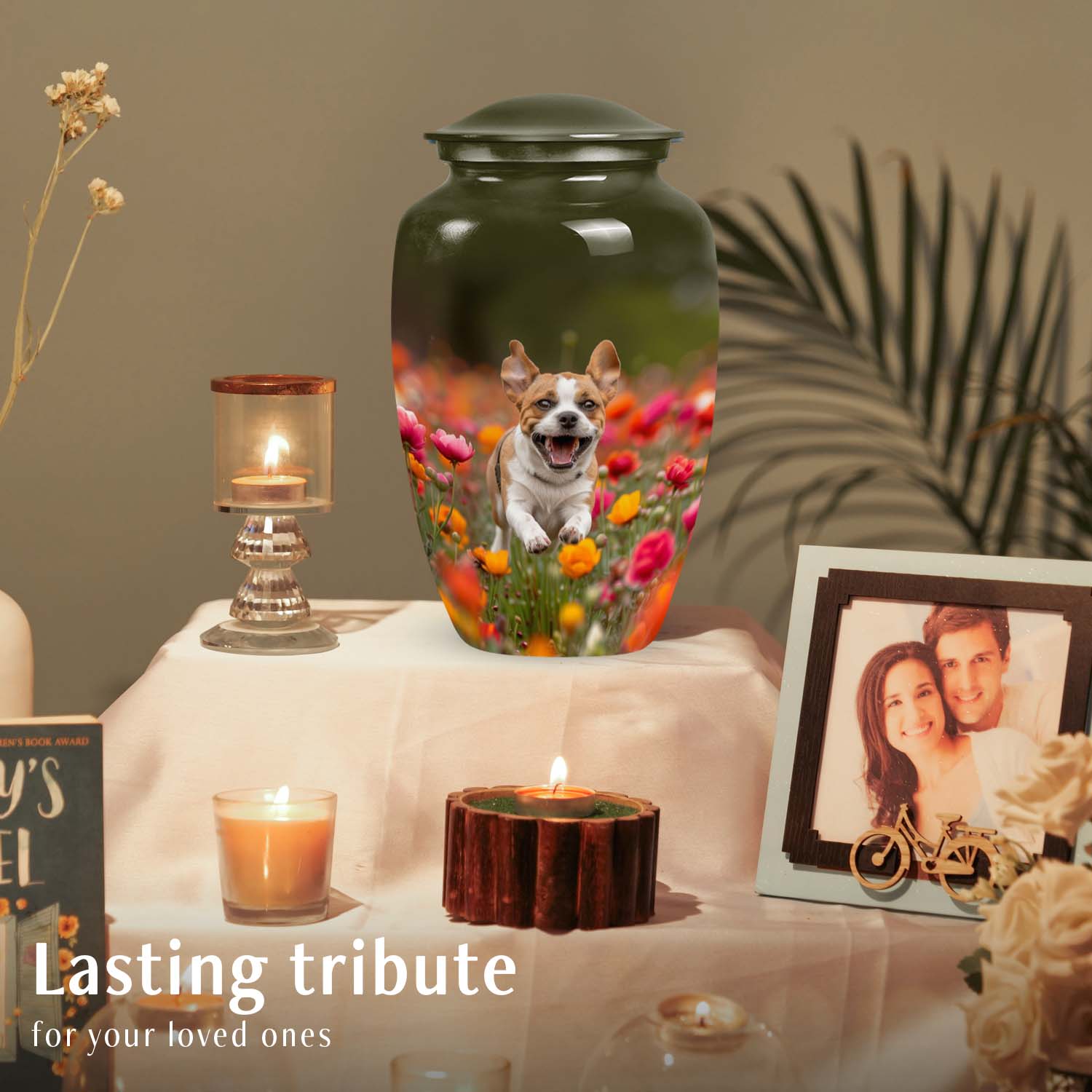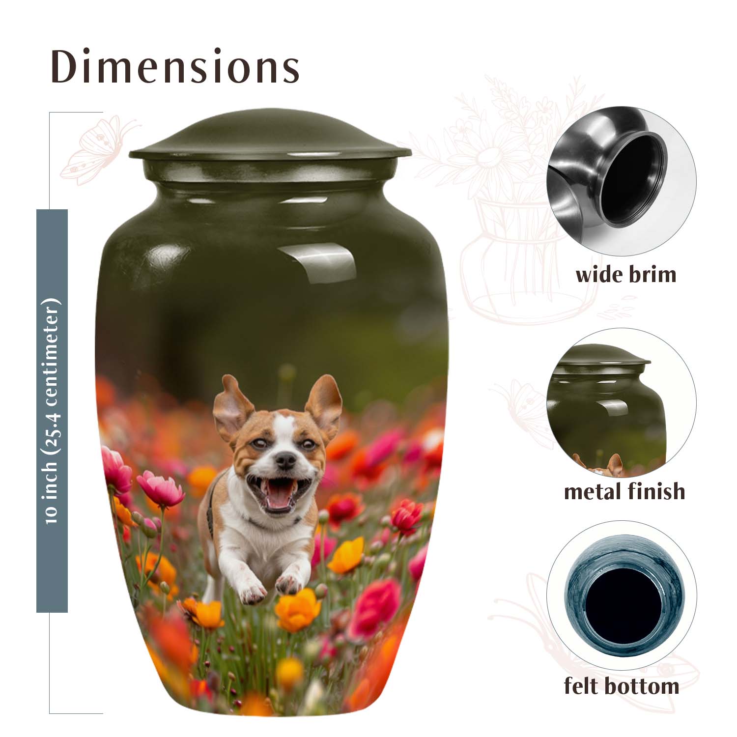 Honor the memory of your beloved Beagle with this beautifully crafted pet cremation urn. Featuring a heartwarming image of a joyful Beagle running through a vibrant field of flowers, this urn captures the spirit of happiness and loyalty that your pet brought to your life.