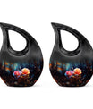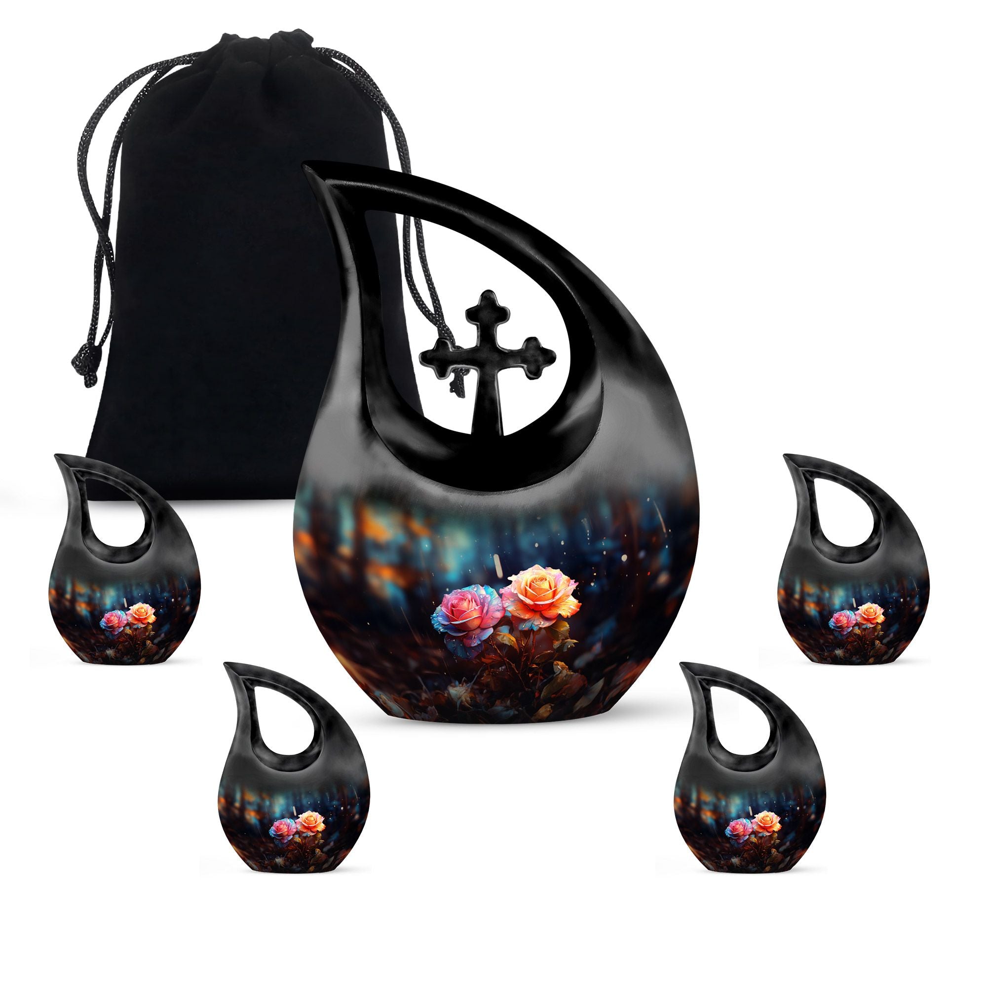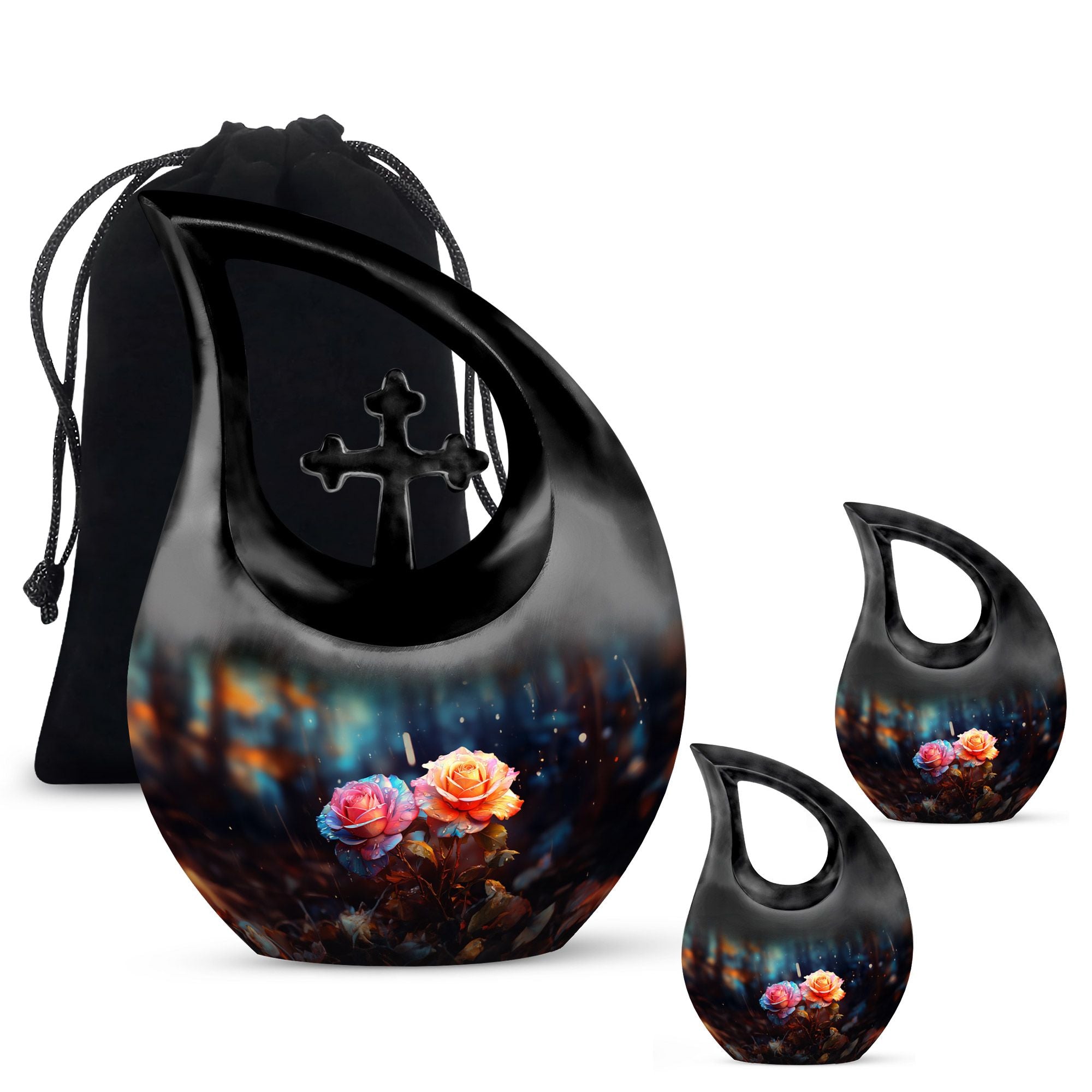 Black Teardrop Funeral Urns For Men - Pink and Orange Rose Art & Cross