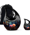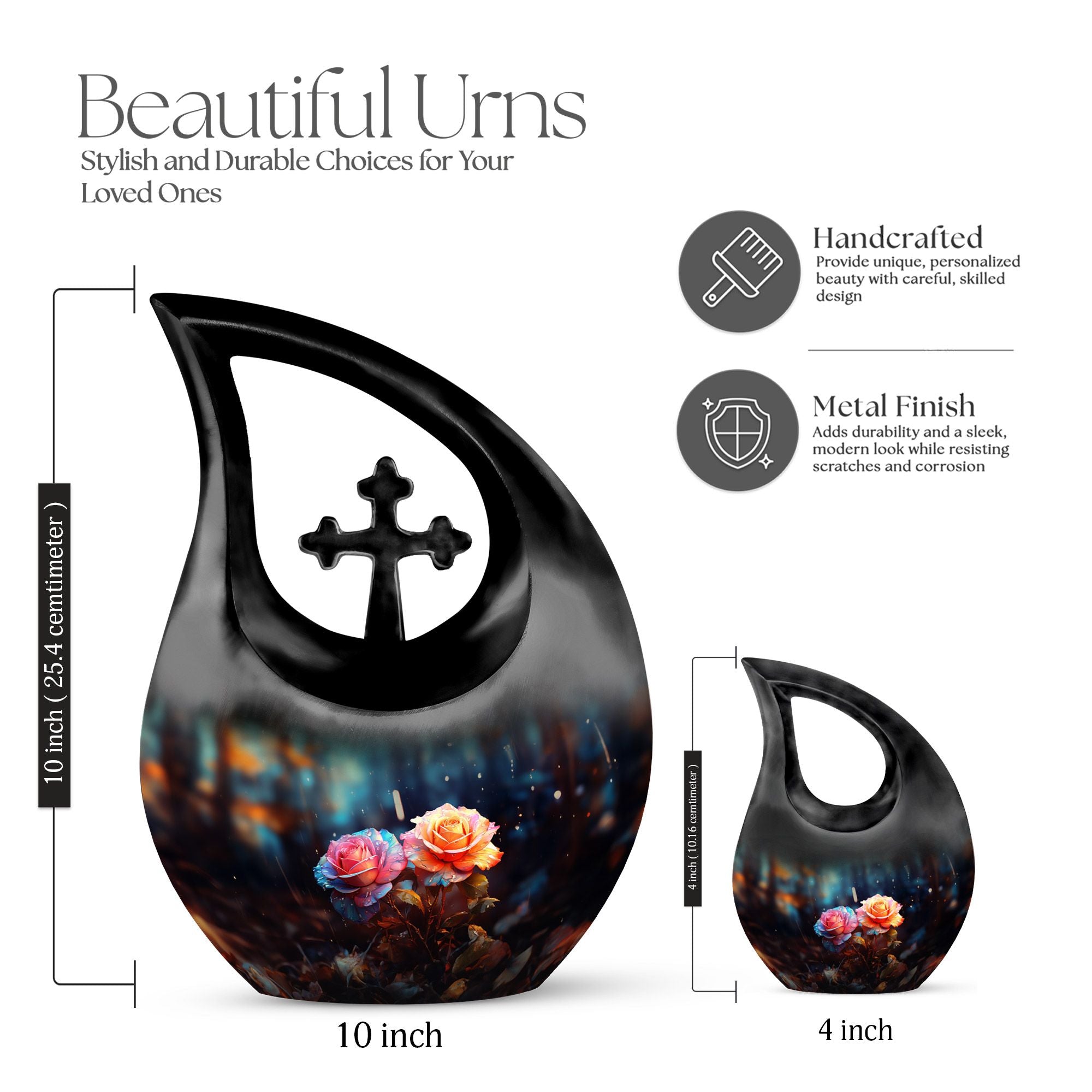 Meticulously handcrafted from durable aluminum, this cremation urn features a sleek black teardrop silhouette complemented by vibrant rose detailing. The radiant pink and orange hues represent love and renewal, while the cross stands as a timeless symbol of faith and hope. Perfect as an urn for human ashes adult men or as one of the cremation urns women appreciate for its balanced elegance, it offers a secure and meaningful resting place for your loved one’s remains. The threaded screw-top lid ensures ashes remain safely preserved, offering peace of mind and enduring dignity.