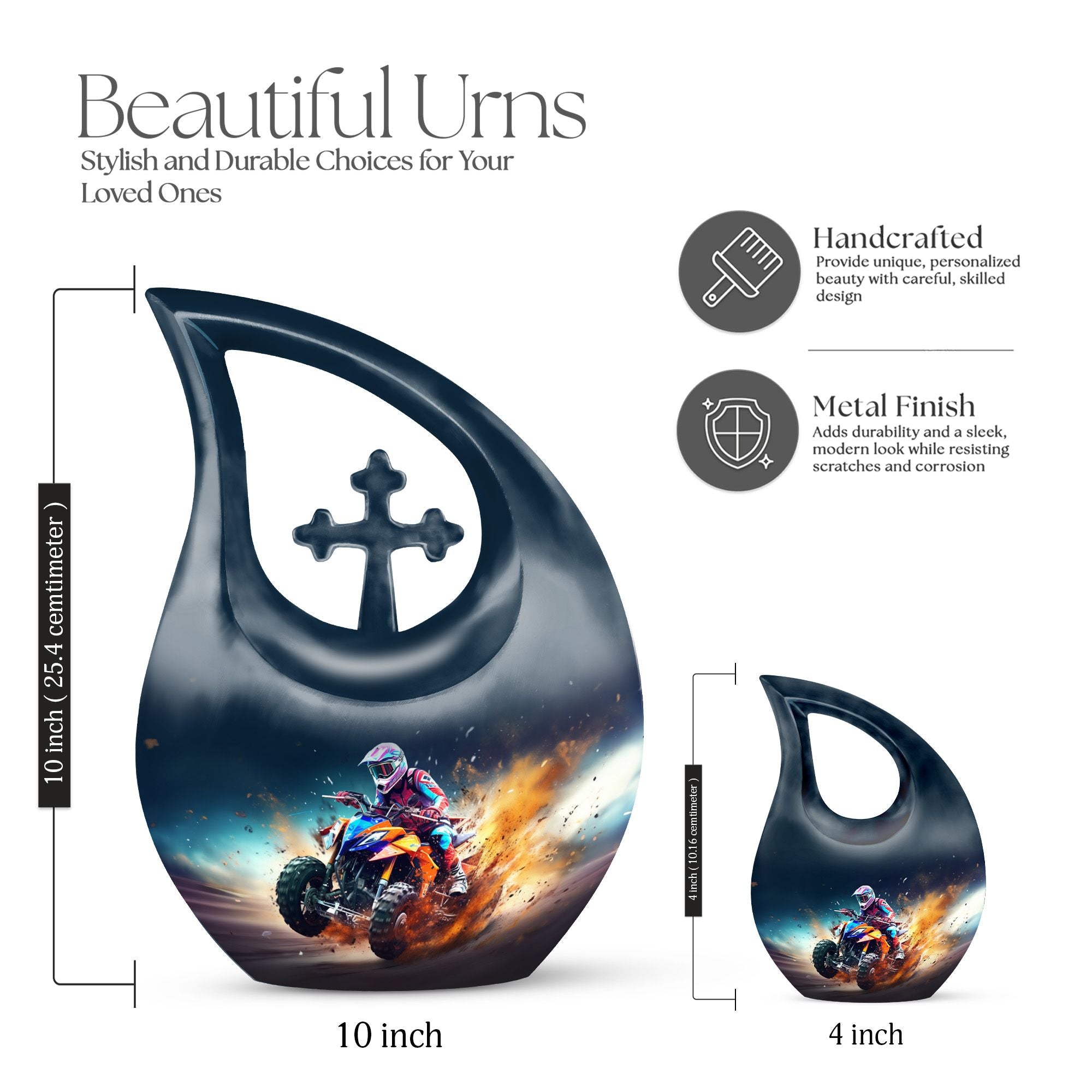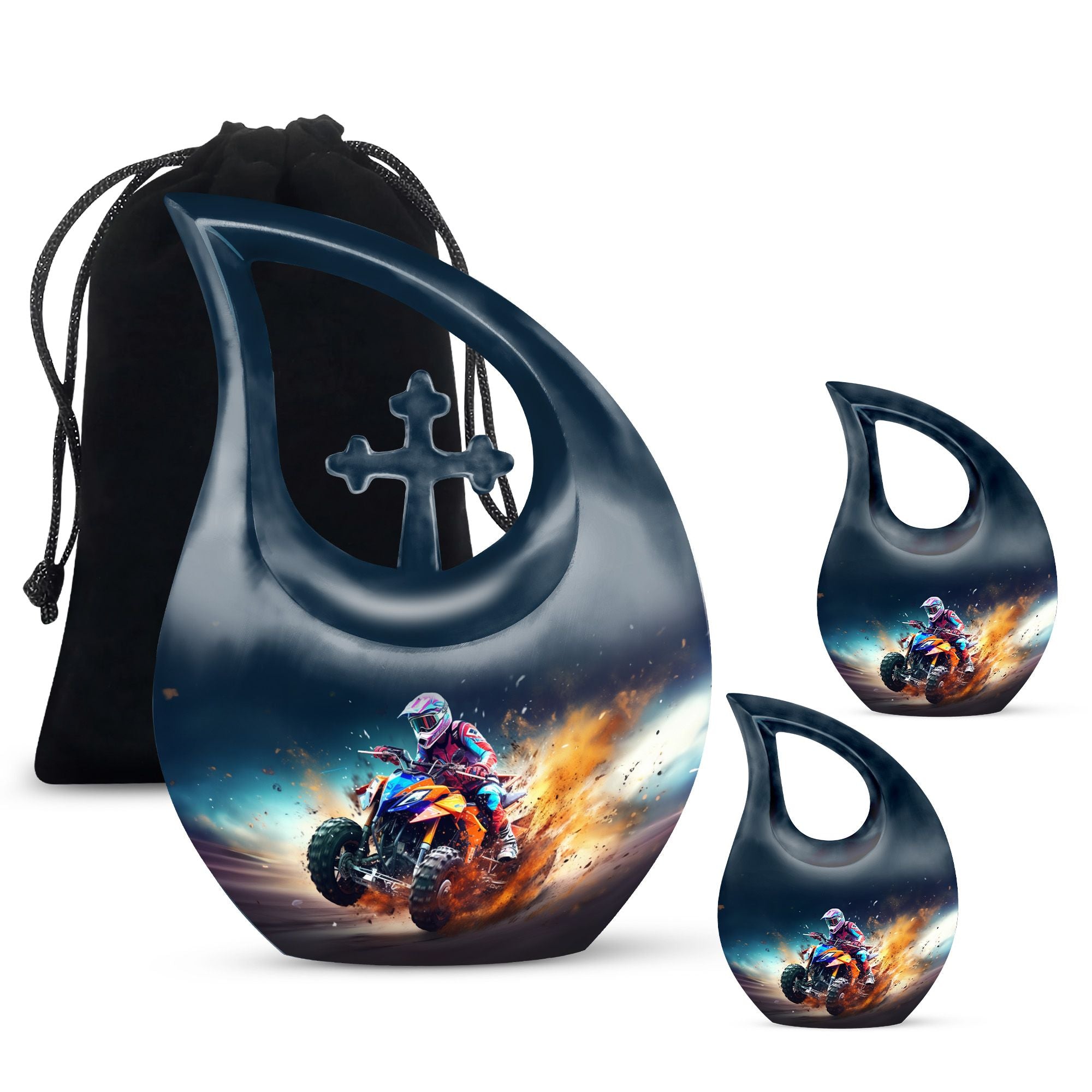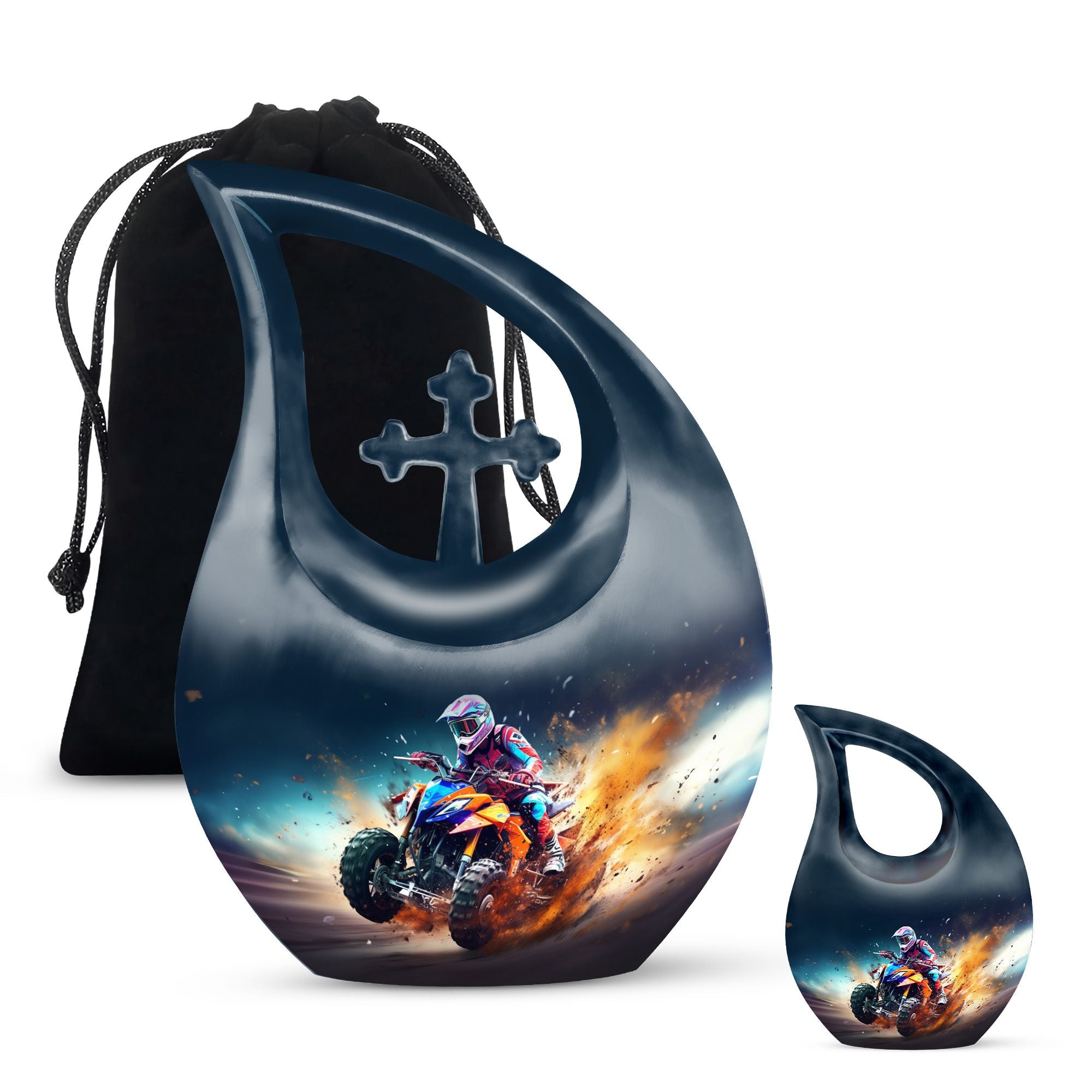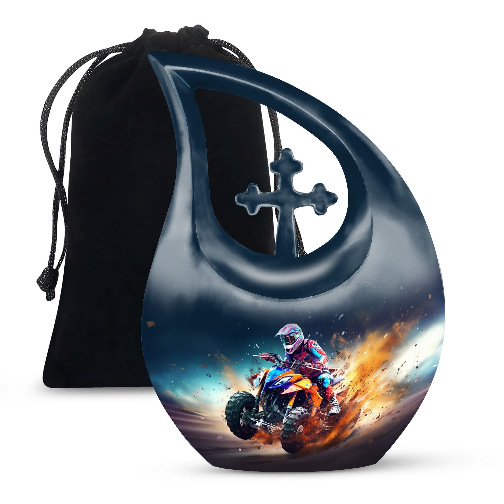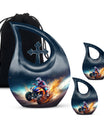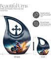 Honor your loved one's memory with our distinctive Bike Race Urn, a unique memorial urn that pairs providence with aesthetic appeal. Crafted from durable aluminium, this cremation box for ashes showcases a riveting Cross Drop motif, an esteemed symbol of devotion and faith. With its authoritative size of 10 inches, the urn bears a weight of 3.3 pounds, making for a remarkable yet manageable keepsake. It boasts a generous internal volume with a capacity of 200 cubic inches, suitable even for large urns needs. For an added heartfelt touch, avail the facility to personalize this sacred repository with engraved names. The urn is securely packaged with a luxurious velvet pouch, ensuring discreet and safe containment of the ashes. Perfect for biking enthusiasts and believers alike, this urn offers a gateway of cherishing beloved memories. Continue to commemorate their love for Bike Racing and enthusiasm for life. Ideal for those searching for low-cost cremation urn, cremation keepsakes, and meaningful funeral options.