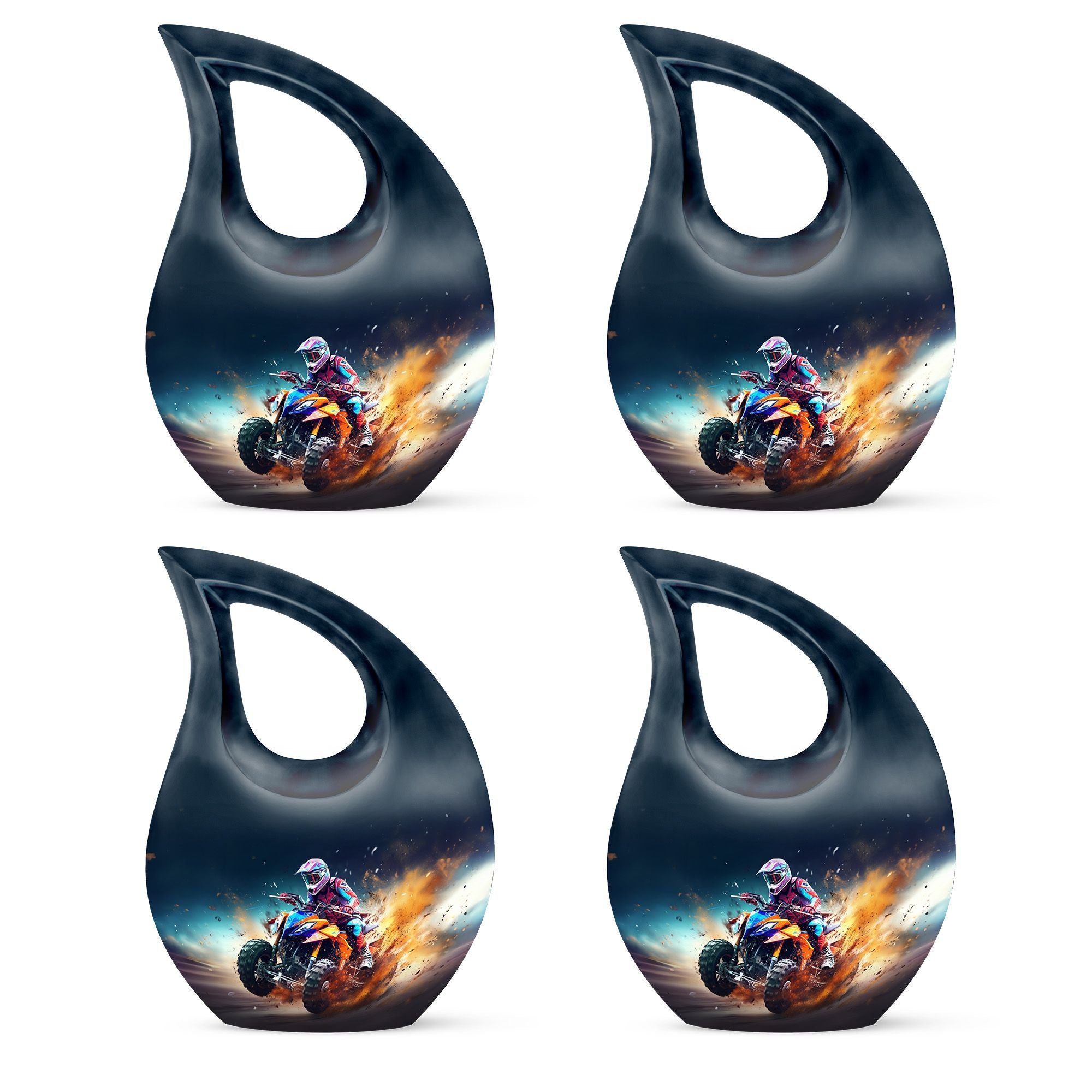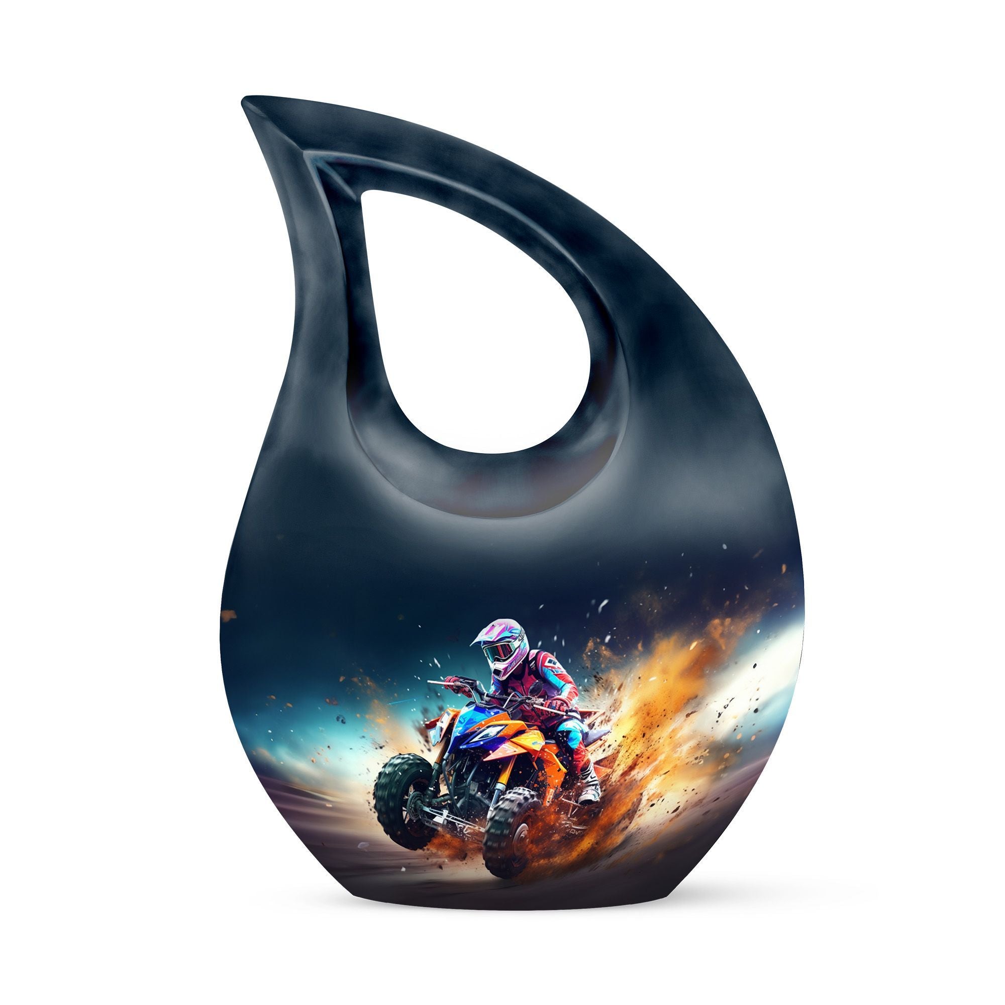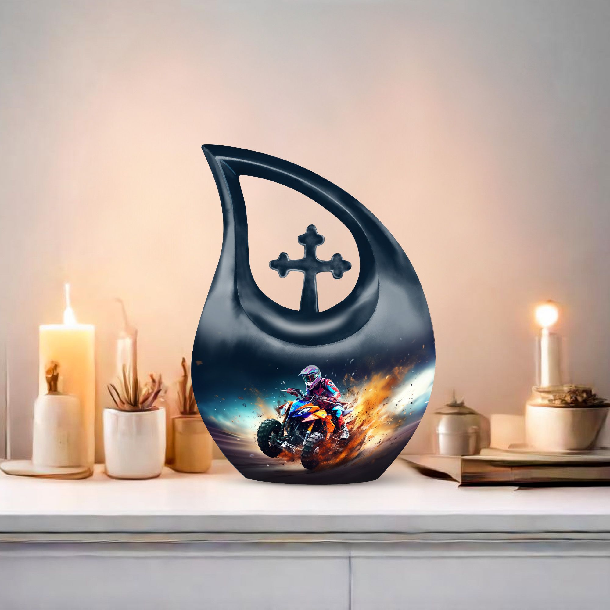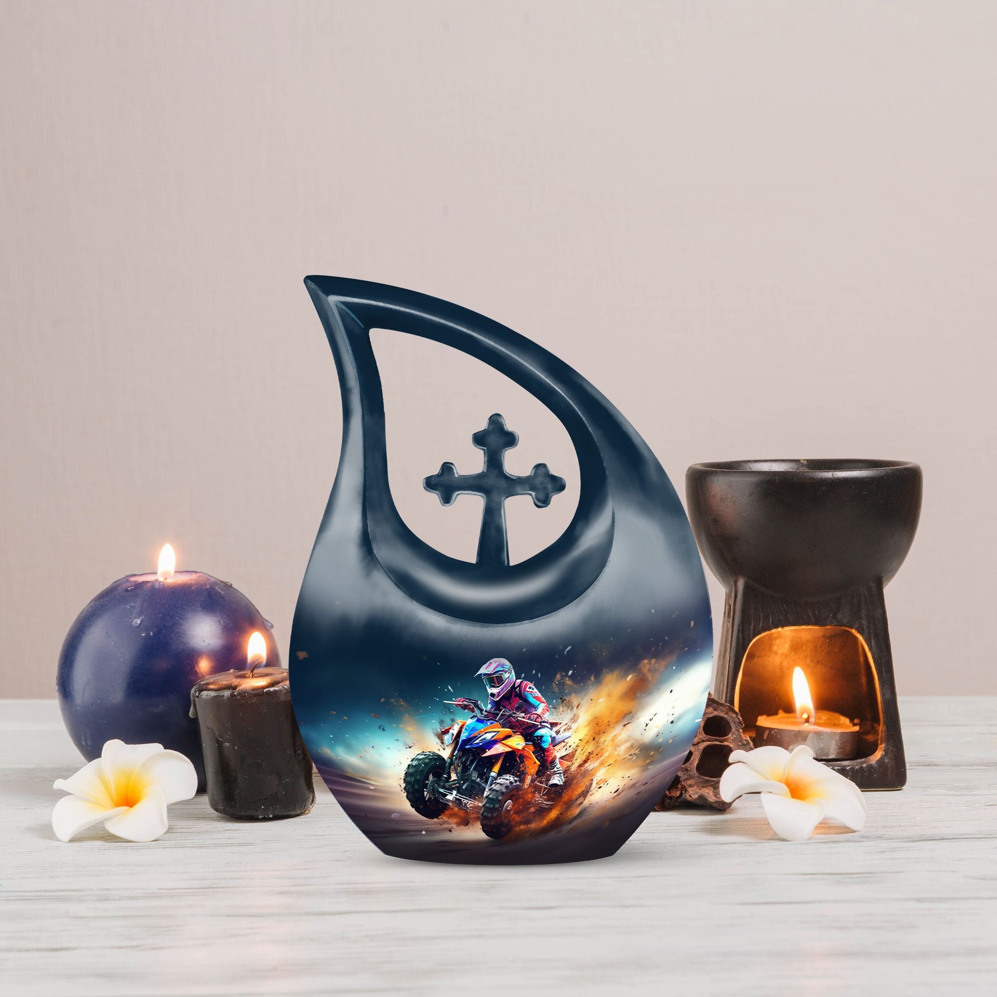 Honor your loved one's memory with our distinctive Bike Race Urn, a unique memorial urn that pairs providence with aesthetic appeal. Crafted from durable aluminium, this cremation box for ashes showcases a riveting Cross Drop motif, an esteemed symbol of devotion and faith. With its authoritative size of 10 inches, the urn bears a weight of 3.3 pounds, making for a remarkable yet manageable keepsake. It boasts a generous internal volume with a capacity of 200 cubic inches, suitable even for large urns needs. For an added heartfelt touch, avail the facility to personalize this sacred repository with engraved names. The urn is securely packaged with a luxurious velvet pouch, ensuring discreet and safe containment of the ashes. Perfect for biking enthusiasts and believers alike, this urn offers a gateway of cherishing beloved memories. Continue to commemorate their love for Bike Racing and enthusiasm for life. Ideal for those searching for low-cost cremation urn, cremation keepsakes, and meaningful funeral options.