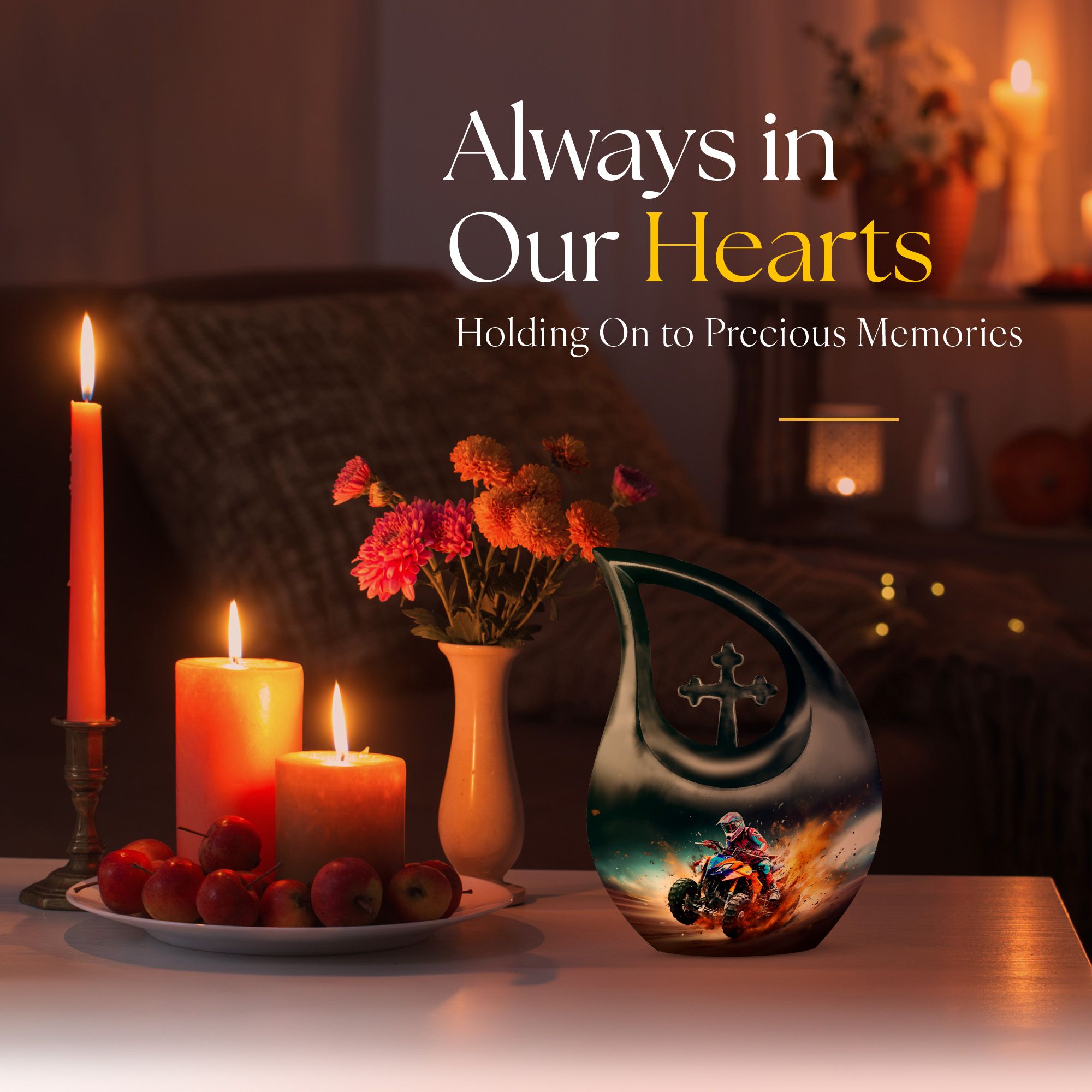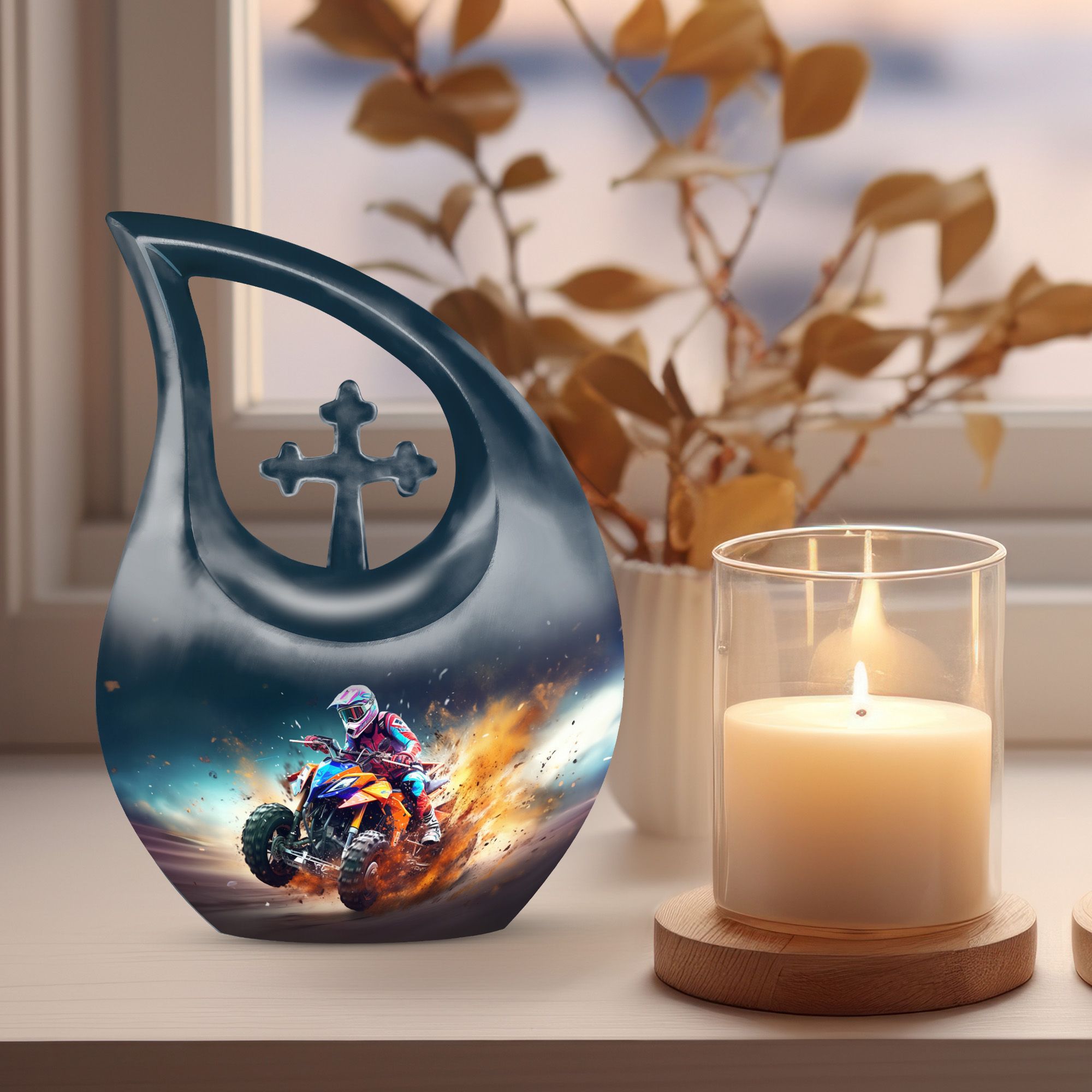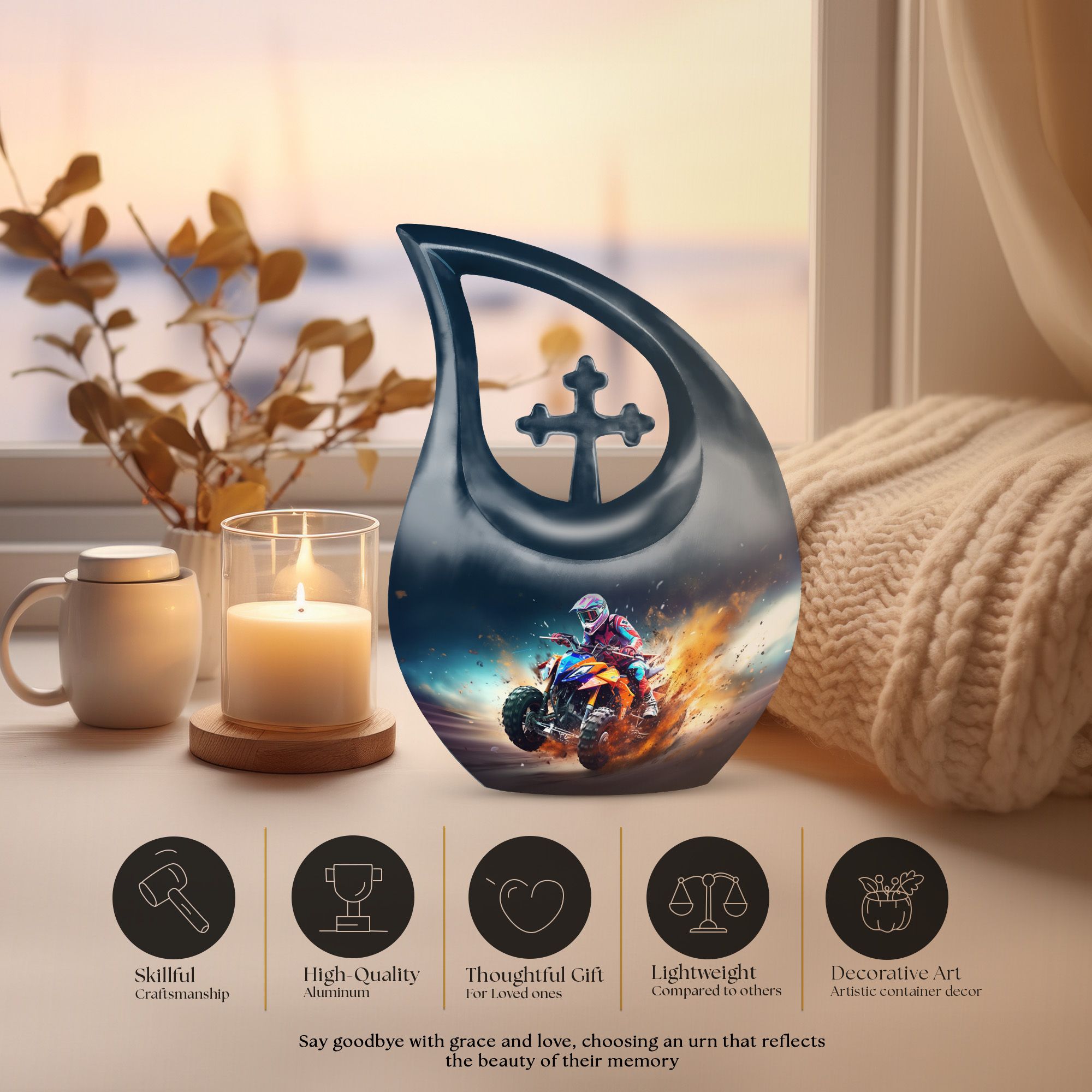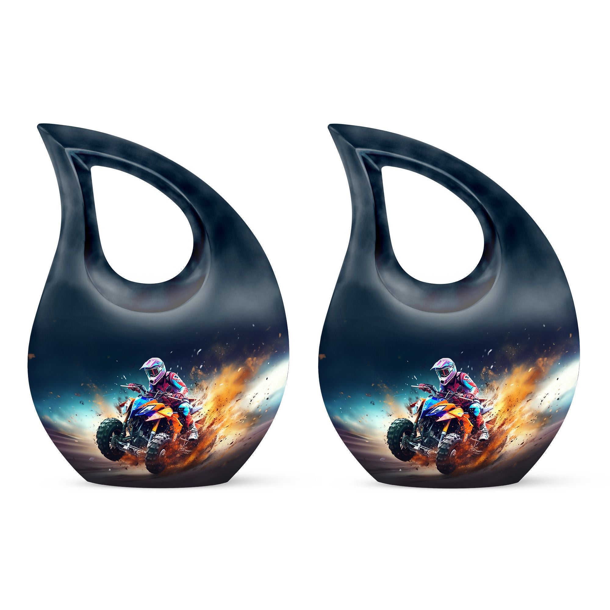 Honor your loved one's memory with our distinctive Bike Race Urn, a unique memorial urn that pairs providence with aesthetic appeal. Crafted from durable aluminium, this cremation box for ashes showcases a riveting Cross Drop motif, an esteemed symbol of devotion and faith. With its authoritative size of 10 inches, the urn bears a weight of 3.3 pounds, making for a remarkable yet manageable keepsake. It boasts a generous internal volume with a capacity of 200 cubic inches, suitable even for large urns needs. For an added heartfelt touch, avail the facility to personalize this sacred repository with engraved names. The urn is securely packaged with a luxurious velvet pouch, ensuring discreet and safe containment of the ashes. Perfect for biking enthusiasts and believers alike, this urn offers a gateway of cherishing beloved memories. Continue to commemorate their love for Bike Racing and enthusiasm for life. Ideal for those searching for low-cost cremation urn, cremation keepsakes, and meaningful funeral options.
