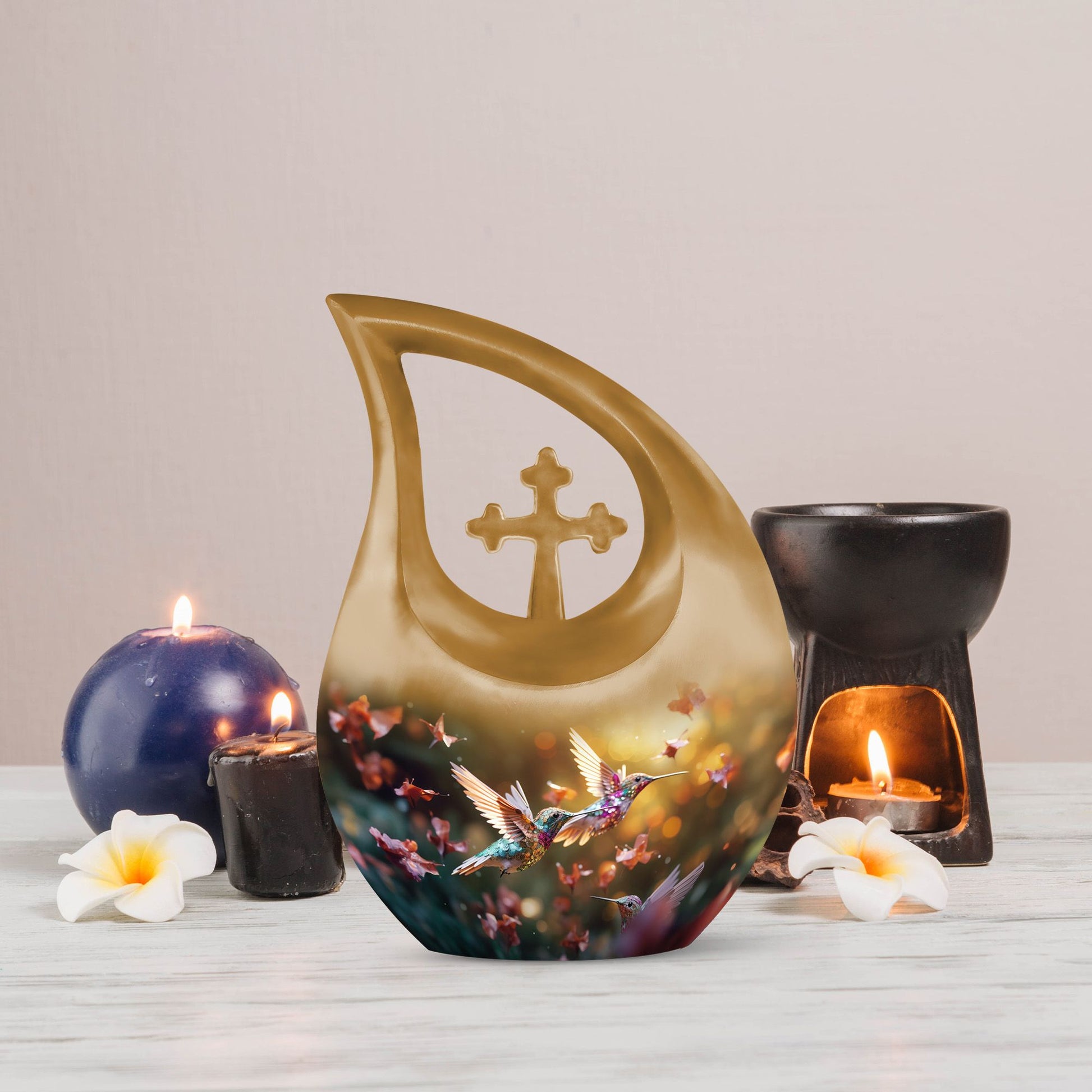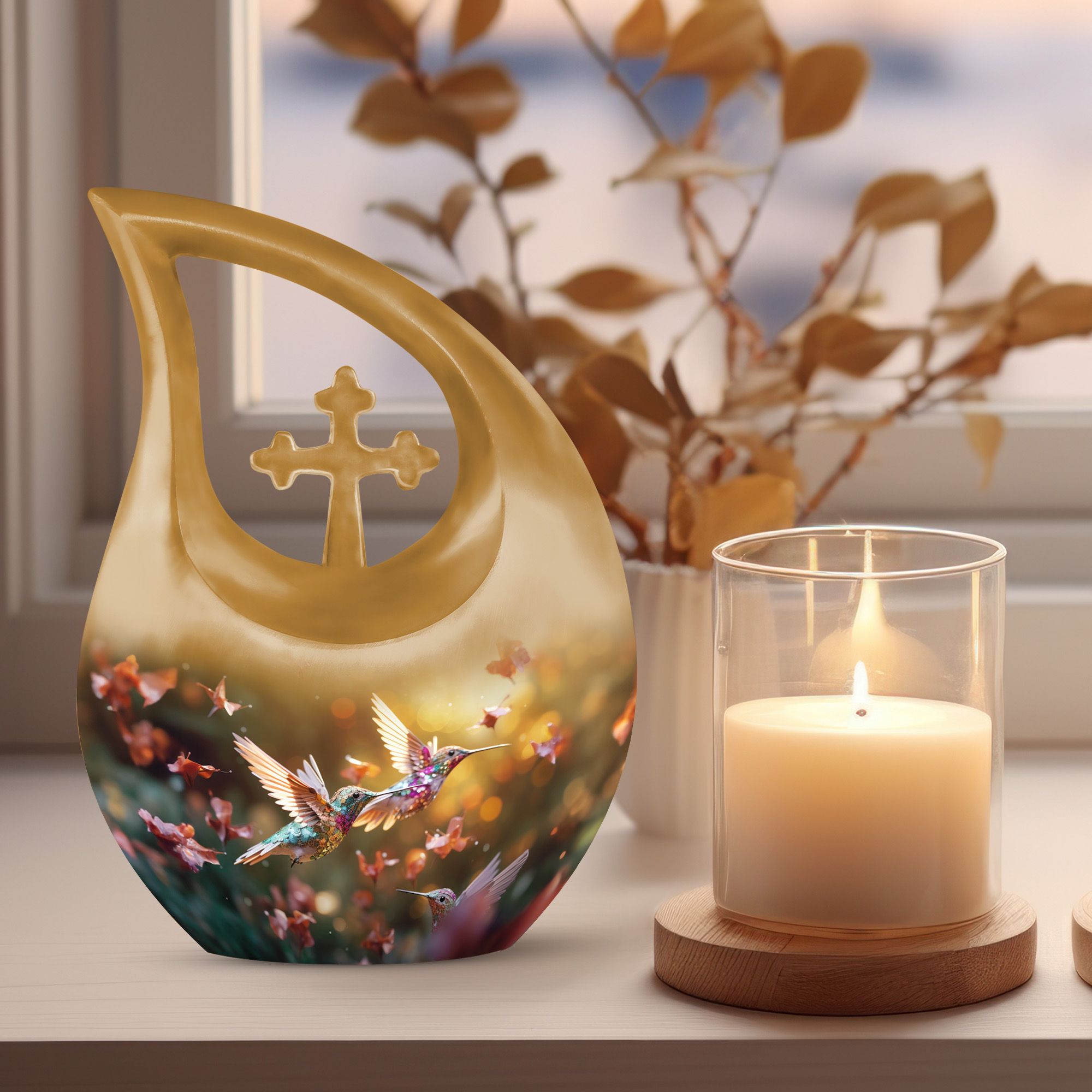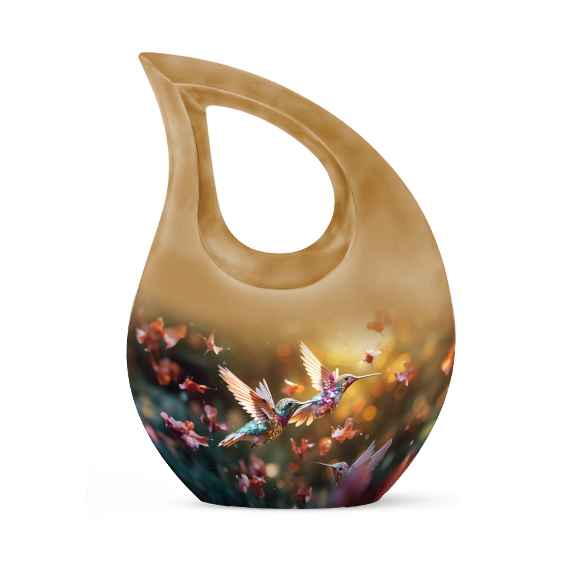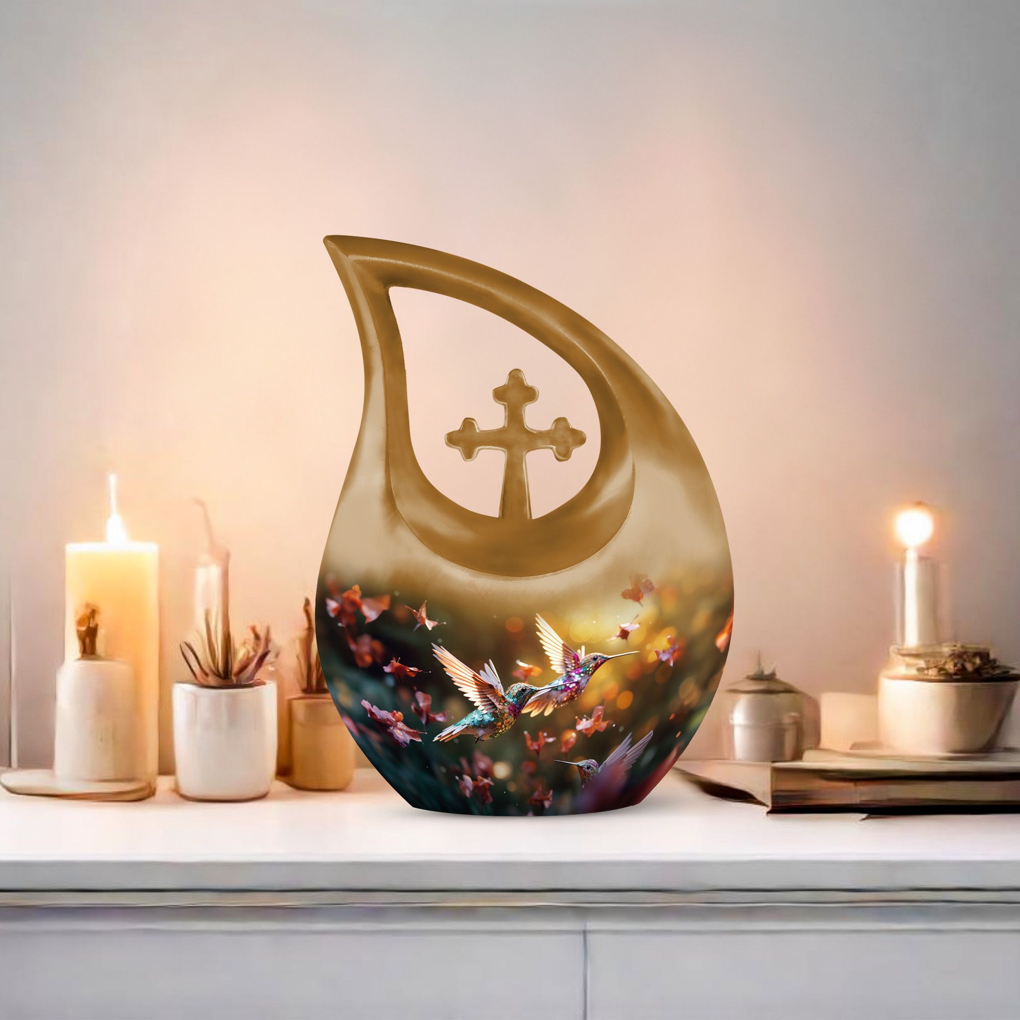 Celebrate a life well lived with the Hummingbird Cremation Urn, a heartfelt tribute designed to honor your loved one with grace and serenity. The delicate hummingbird motif reflects beauty, peace, and eternal love—making it perfect for those who brought joy and warmth to every heart. Crafted to hold large human ashes, this urn ensures their memory stays forever close. Expertly designed for durability and elegance, this urn blends timeless artistry with lasting quality. Each piece is made from premium aluminum and finished with intricate detailing that makes it a standout among large cremation urns. Whether you seek urns for ashes adult male large or large urns for human ashes adult female, this design complements any memorial décor. Its smooth surface and polished texture add sophistication, while the secure screw-top lid ensures the ashes remain safe and protected. Features: Material: Aluminium Dimensions: Height 10 inches Capacity: 200 cubic inches Lid: Secure screw-top lid Design: Elegant hummingbird pattern with soft, serene colors Use: Suitable for adult male or female This large urn for human ashes serves as a beautiful centerpiece for home display or as a cherished piece for burial or columbarium placement. The hummingbird design symbolizes freedom and eternal peace—making it a meaningful choice among urns for human ashes large adult collections. Give your loved one the dignity and elegance they deserve with this adult large urn, a stunning blend of artistry, symbolism, and devotion that keeps their memory alive forever.