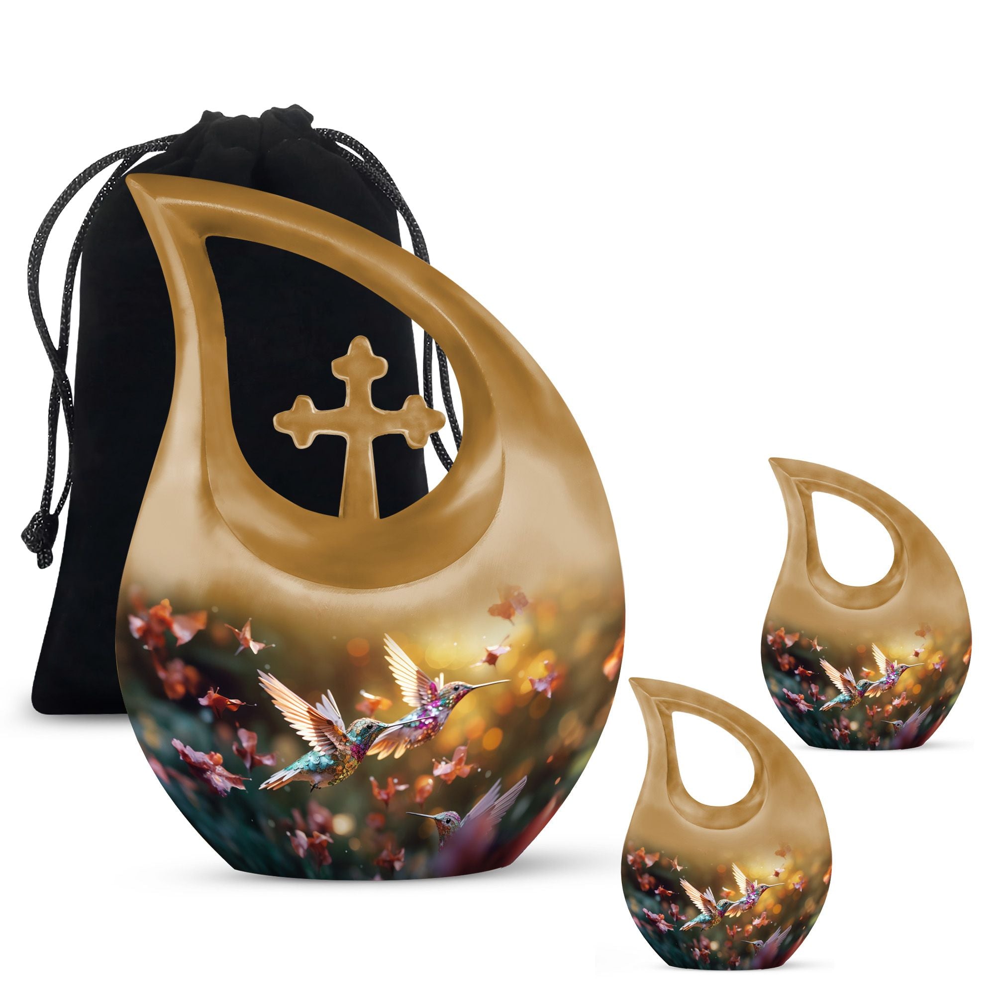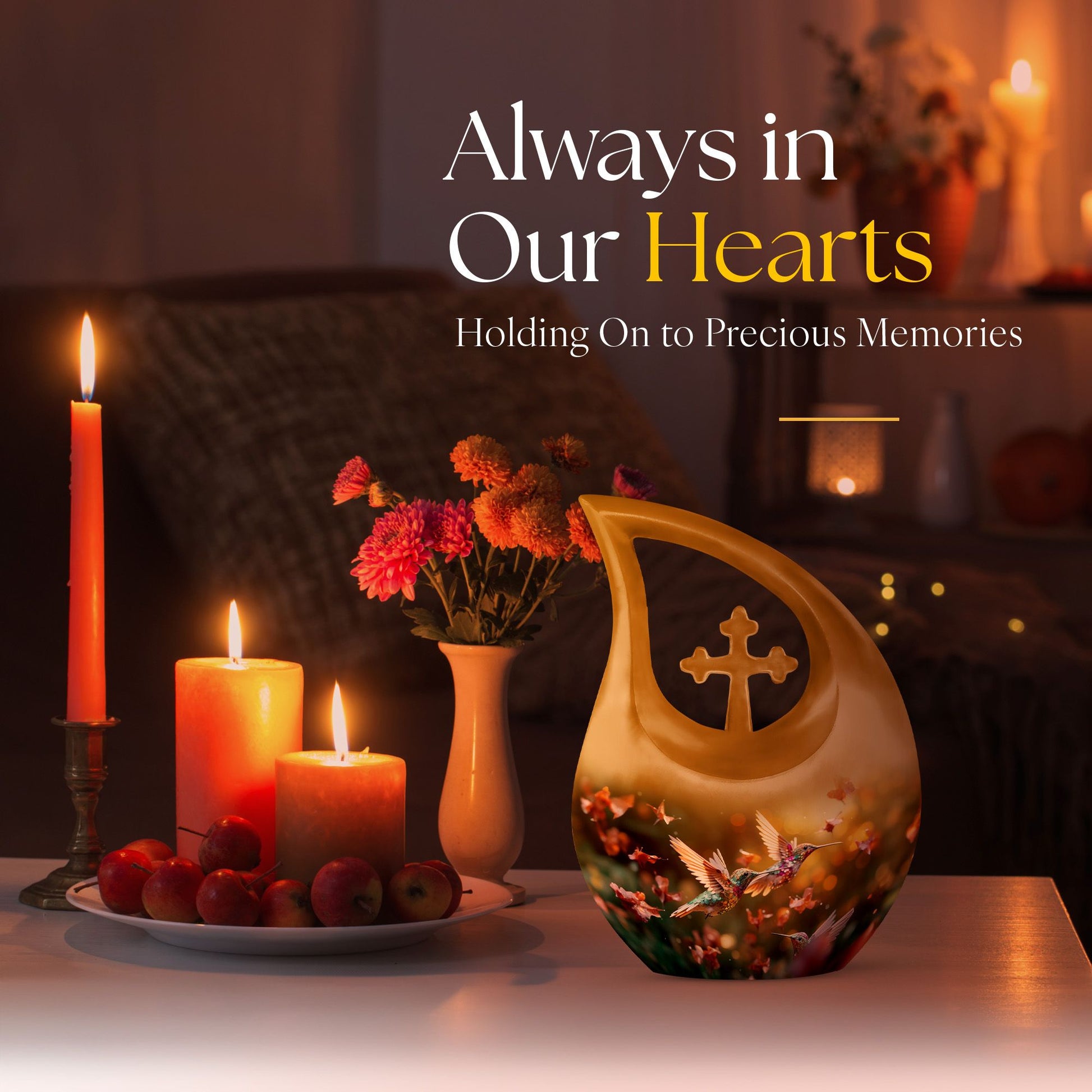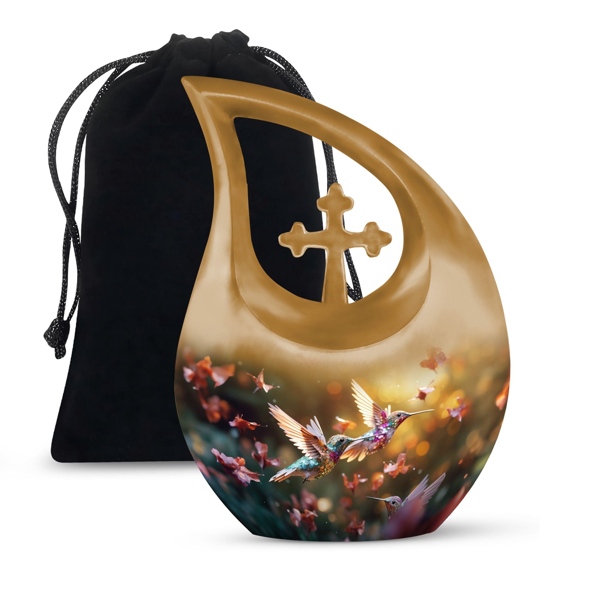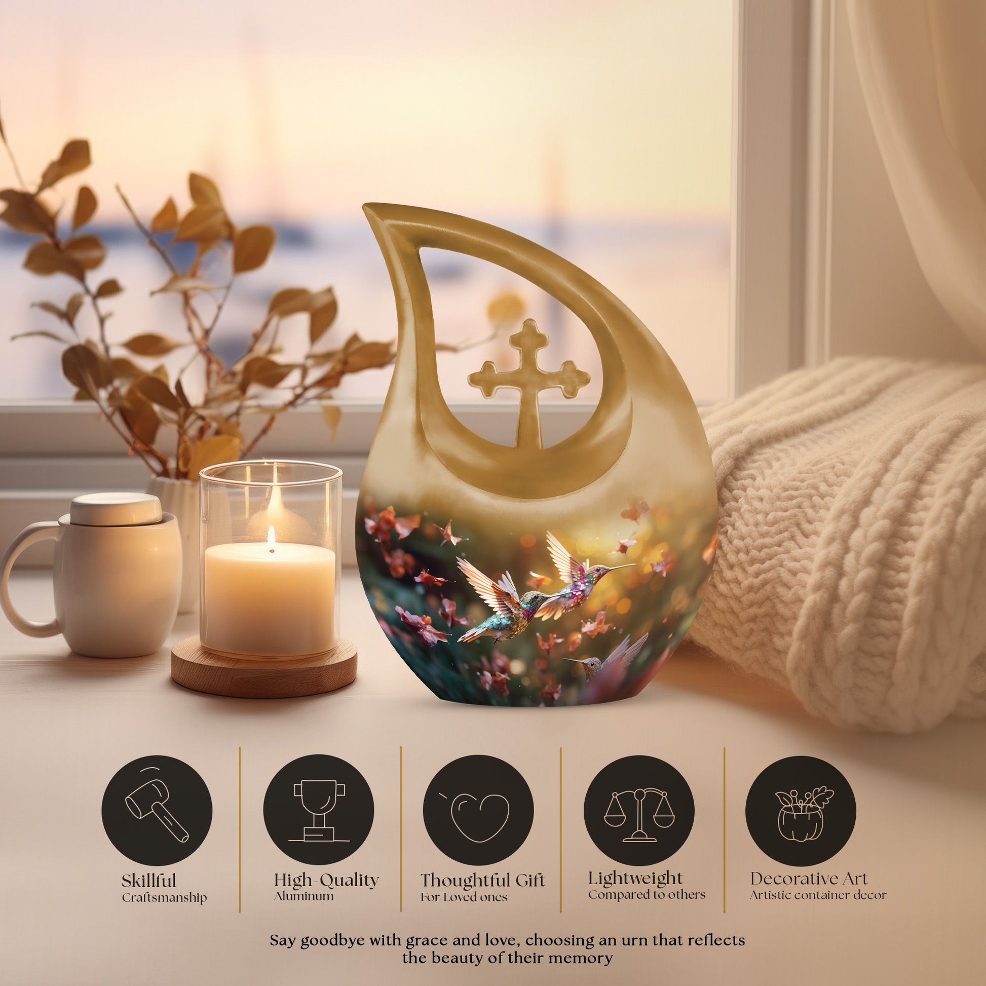 Celebrate a life well lived with the Hummingbird Cremation Urn, a heartfelt tribute designed to honor your loved one with grace and serenity. The delicate hummingbird motif reflects beauty, peace, and eternal love—making it perfect for those who brought joy and warmth to every heart. Crafted to hold large human ashes, this urn ensures their memory stays forever close. Expertly designed for durability and elegance, this urn blends timeless artistry with lasting quality. Each piece is made from premium aluminum and finished with intricate detailing that makes it a standout among large cremation urns. Whether you seek urns for ashes adult male large or large urns for human ashes adult female, this design complements any memorial décor. Its smooth surface and polished texture add sophistication, while the secure screw-top lid ensures the ashes remain safe and protected. Features: Material: Aluminium Dimensions: Height 10 inches Capacity: 200 cubic inches Lid: Secure screw-top lid Design: Elegant hummingbird pattern with soft, serene colors Use: Suitable for adult male or female This large urn for human ashes serves as a beautiful centerpiece for home display or as a cherished piece for burial or columbarium placement. The hummingbird design symbolizes freedom and eternal peace—making it a meaningful choice among urns for human ashes large adult collections. Give your loved one the dignity and elegance they deserve with this adult large urn, a stunning blend of artistry, symbolism, and devotion that keeps their memory alive forever.