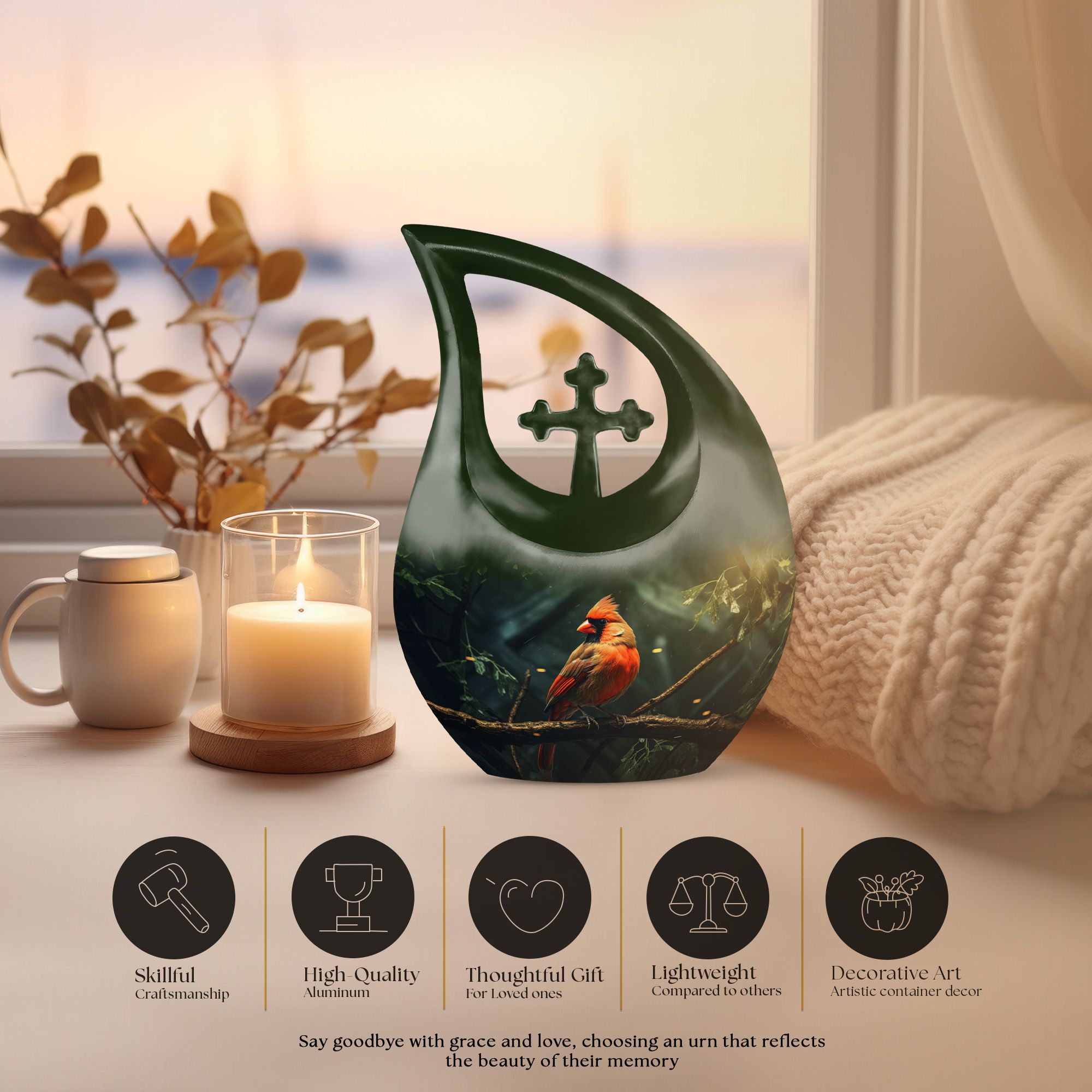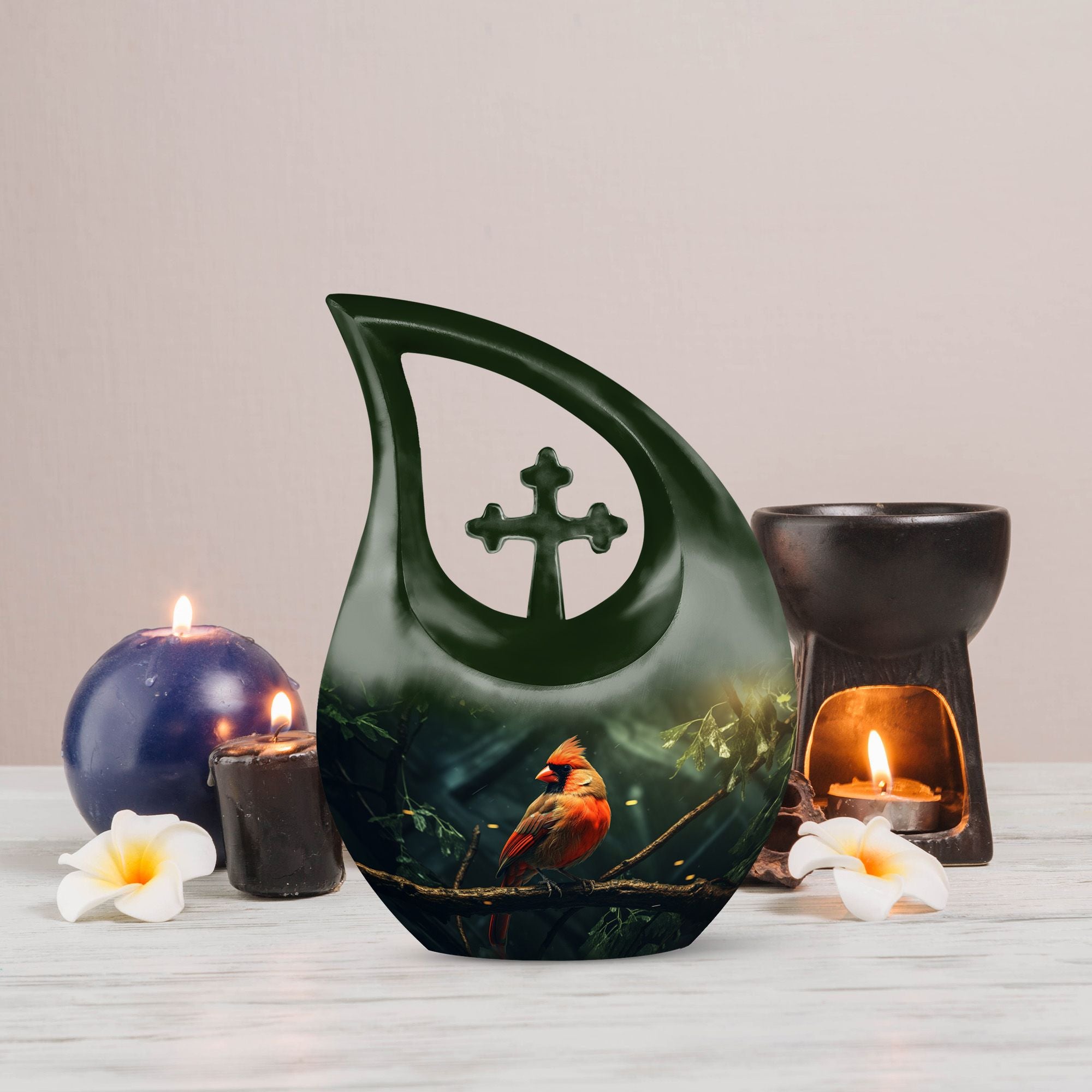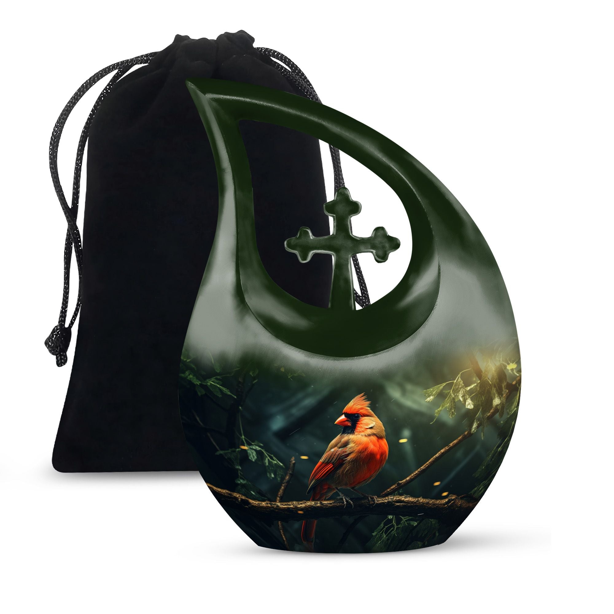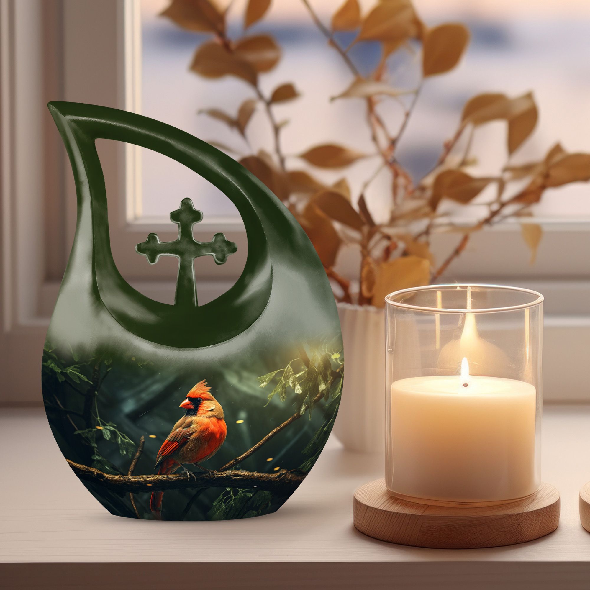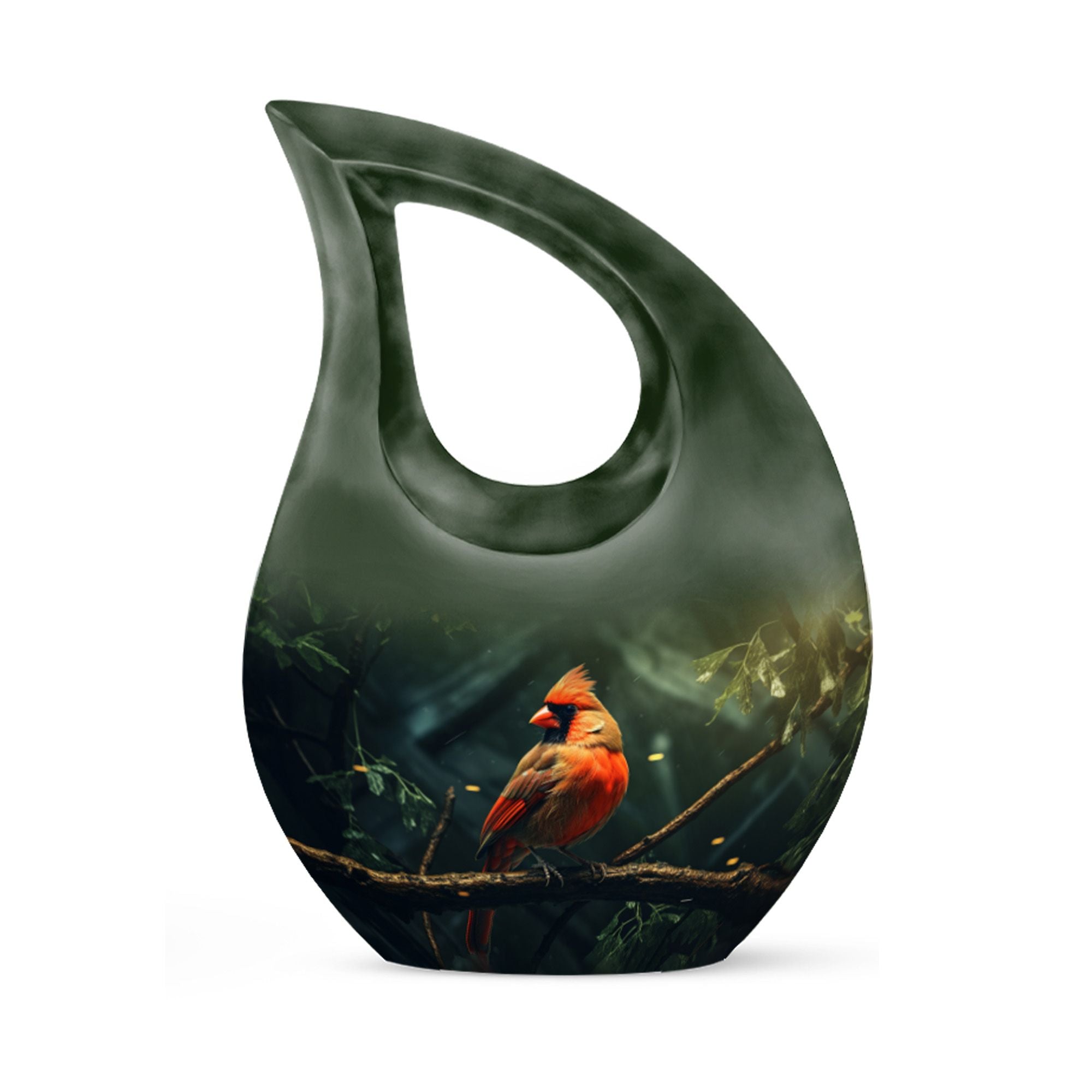 The Cardinal Cremation Urn represents eternal love and remembrance, offering a peaceful tribute for those who meant the world to you. The rich deep green color and detailed red cardinal symbolize hope, renewal, and enduring presence—perfect for families seeking cremation urns for human ashes adult female or burial urns for human ashes adult male.