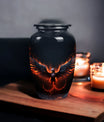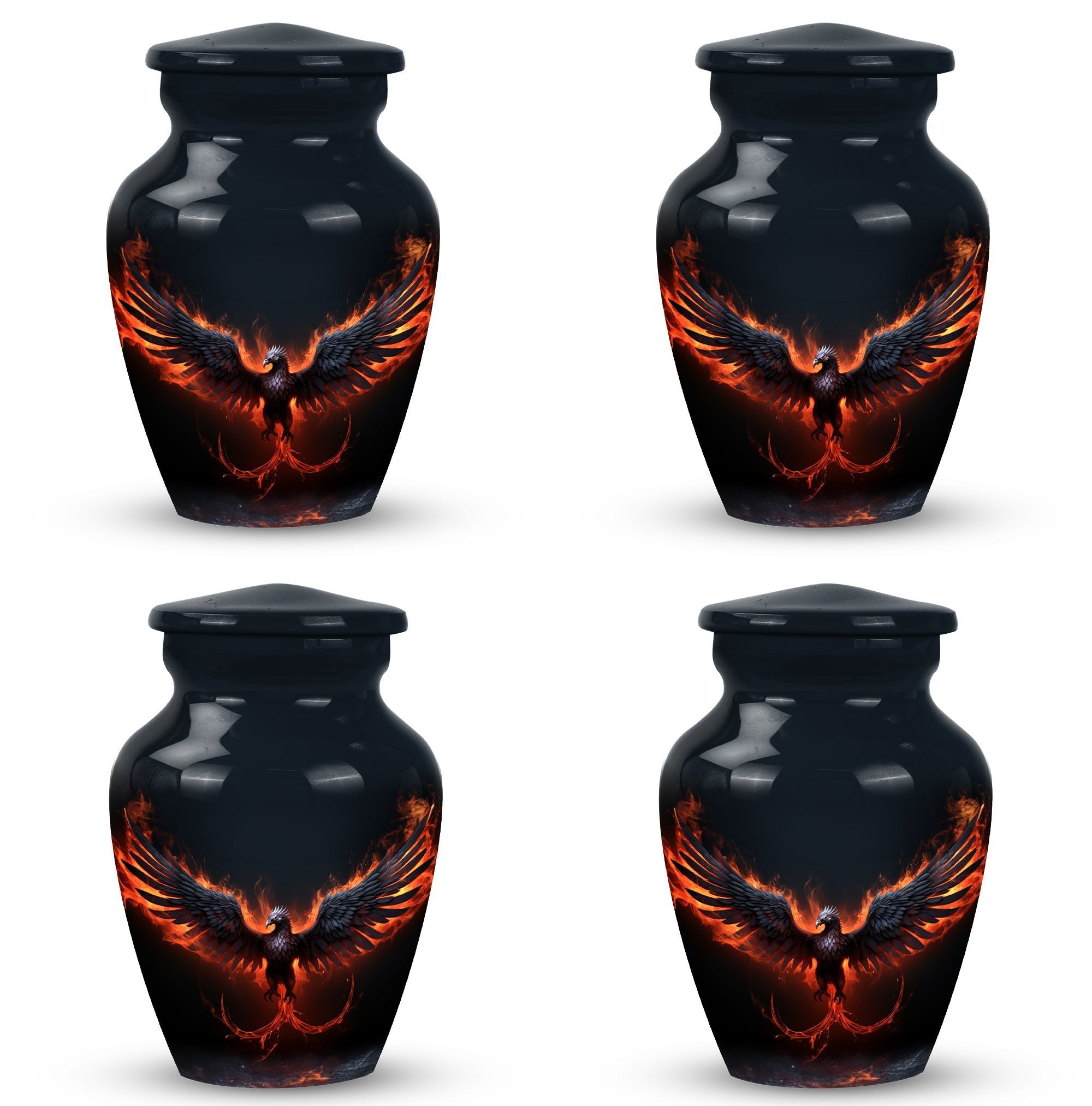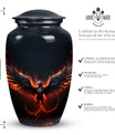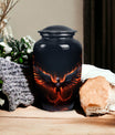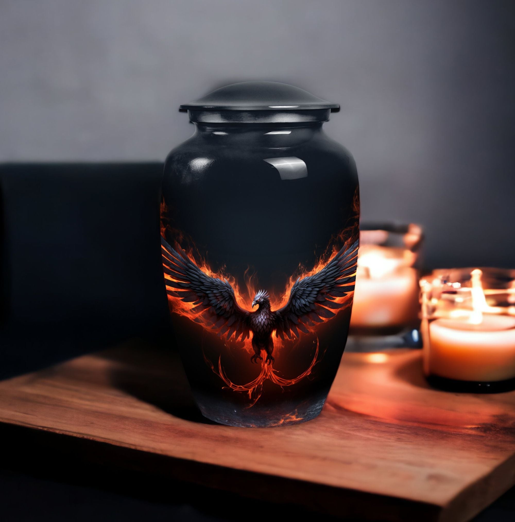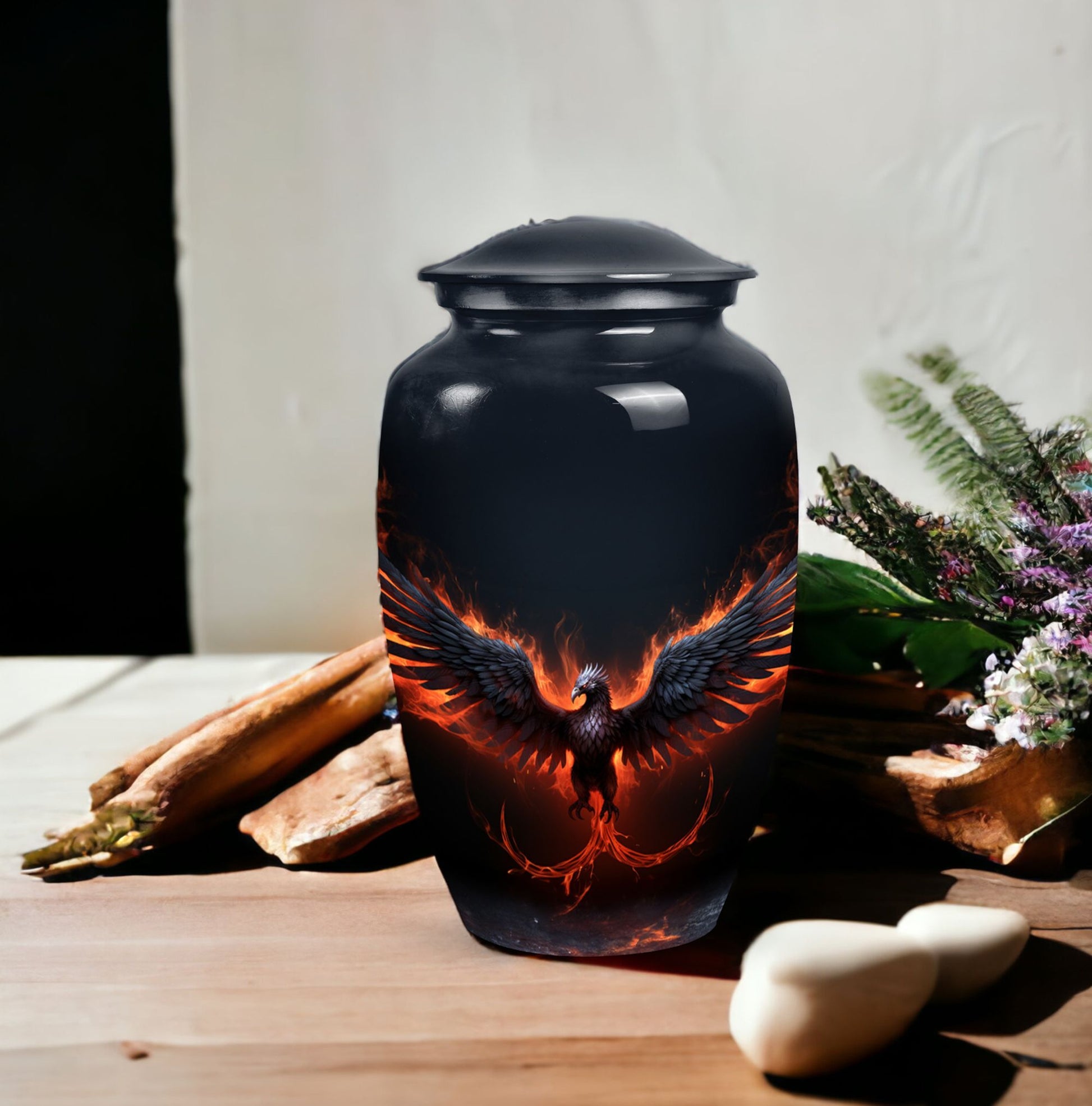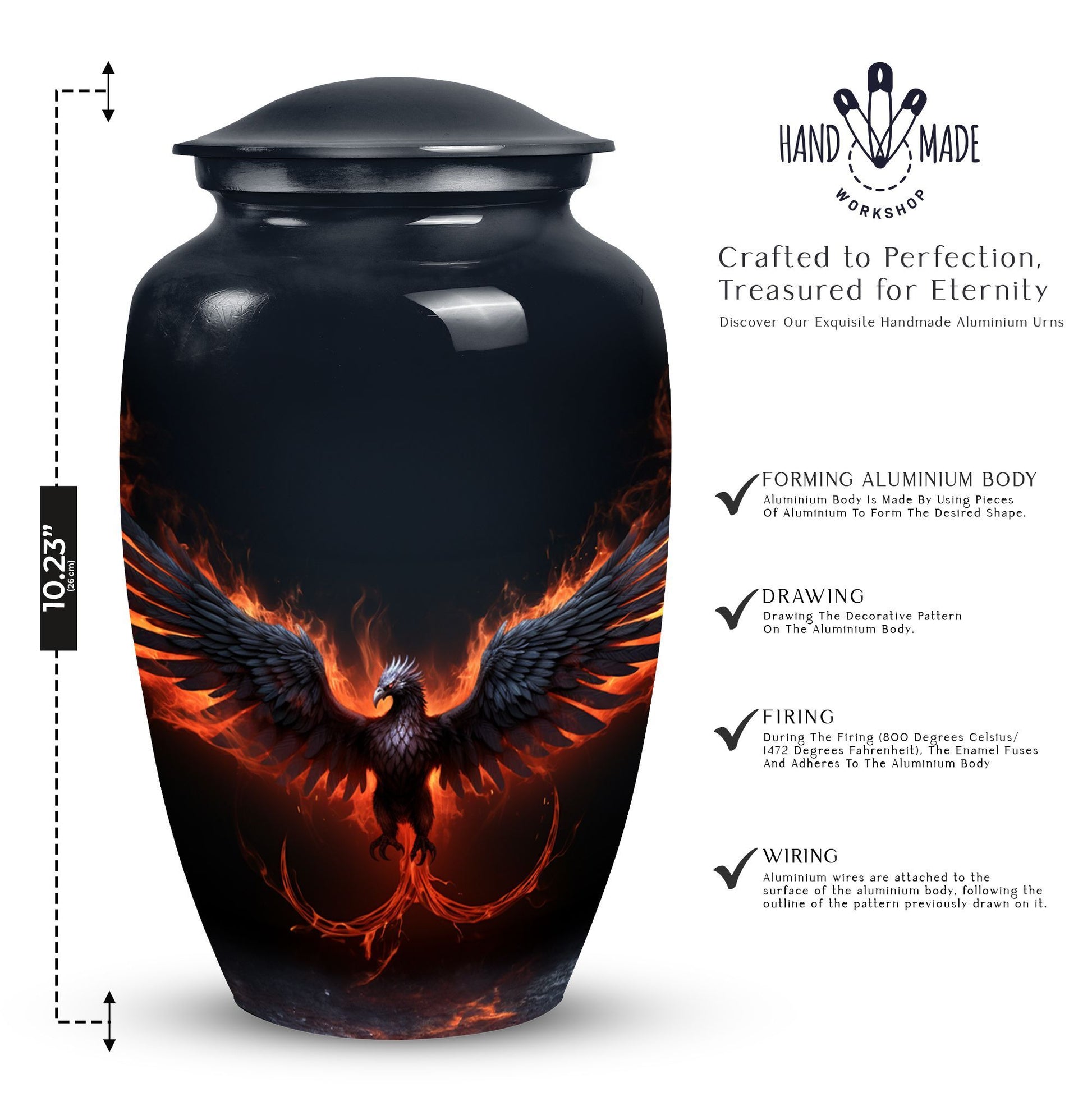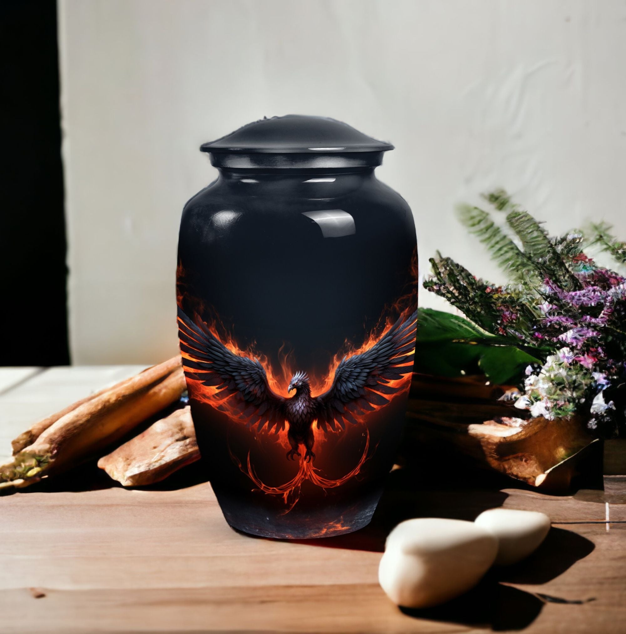 Discover beauty in remembrance with our Black Phoenix Memorial Urn, an evocative ashes container harking back to the timeless, Classic Urn design aesthetic. With a tasteful balance of form and functionality, this Large Urn elegantly houses up to 200 cubic inches of ashes. A convenient 10 inches in height and weighing a substantial 3.3 pounds, each urn is meticulously crafted from high-quality Aluminium. Carefully encased within a velvet pouch, your loved one's remains will find a dignified final resting place. Add a touch of personal homage with our customization option; engrave the names of your cherished ones for a truly unique memorial. This stunning cremation urn transcends ordinary Human Urns and transforms memorial observances. Notably designed for adults, its 3-inch size is reminiscent of larger urns for human ashes that are typically sought after in the market, making it an unparalleled choice in the realm of Memorial Ceremony Supplies. Please note that this urn container's distinctive charm lies not just in its design, but in its very essence - an embodiment of love, memory, and respect.