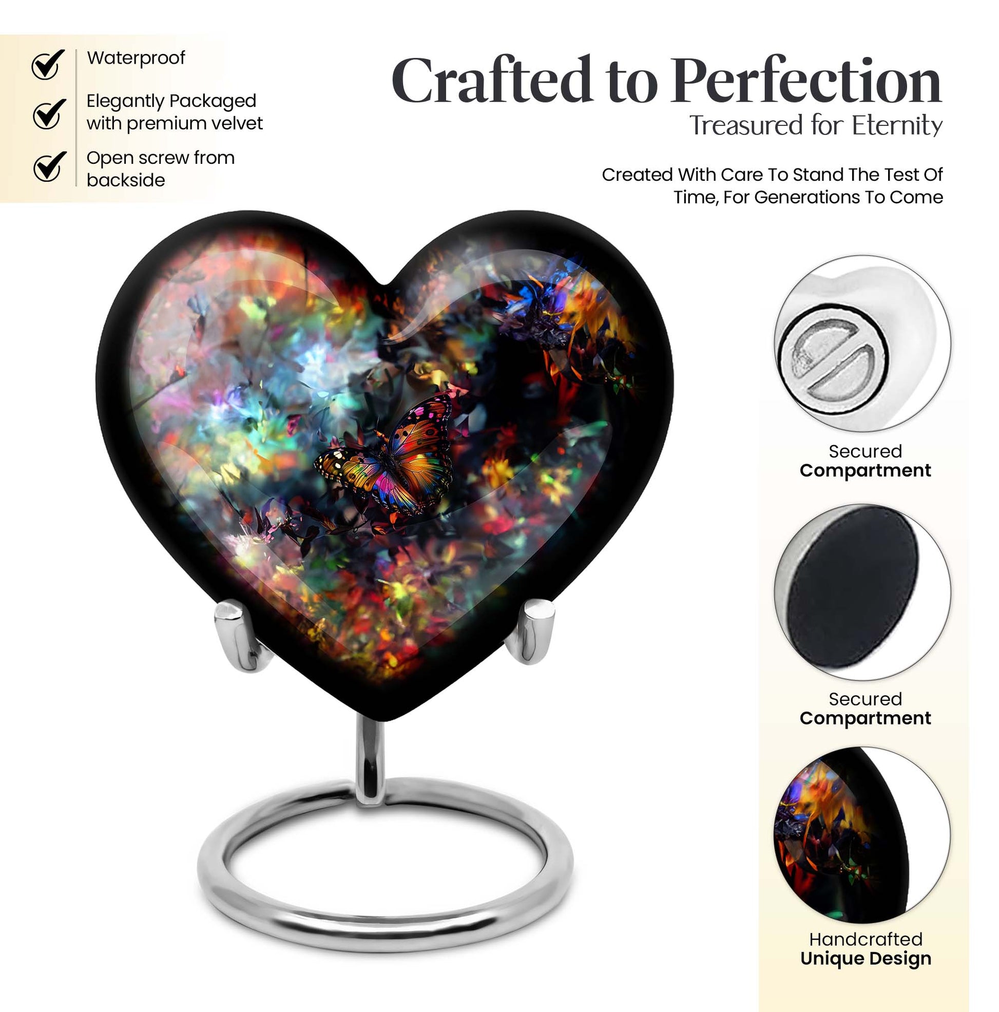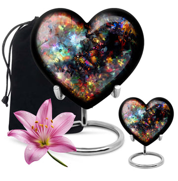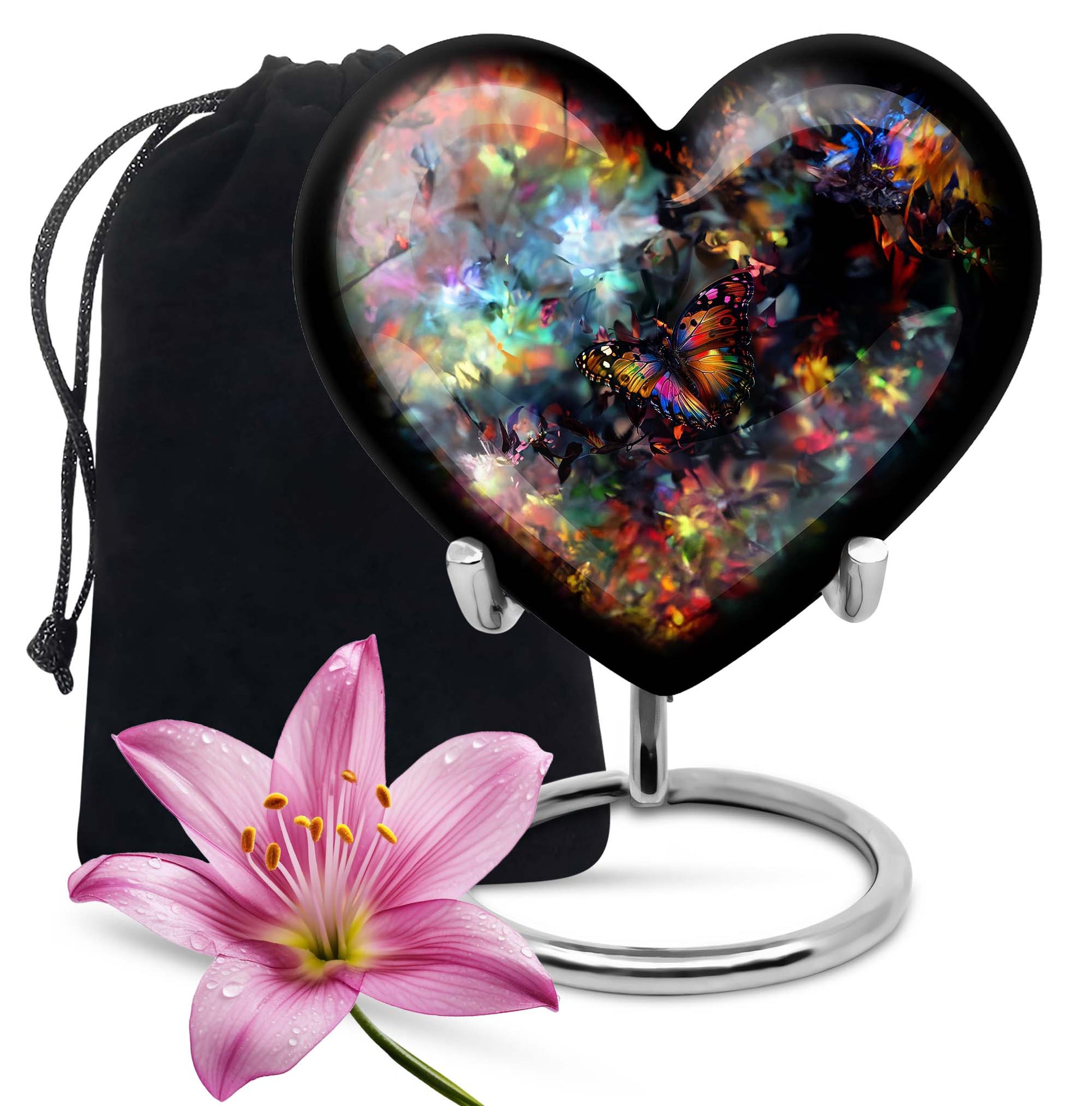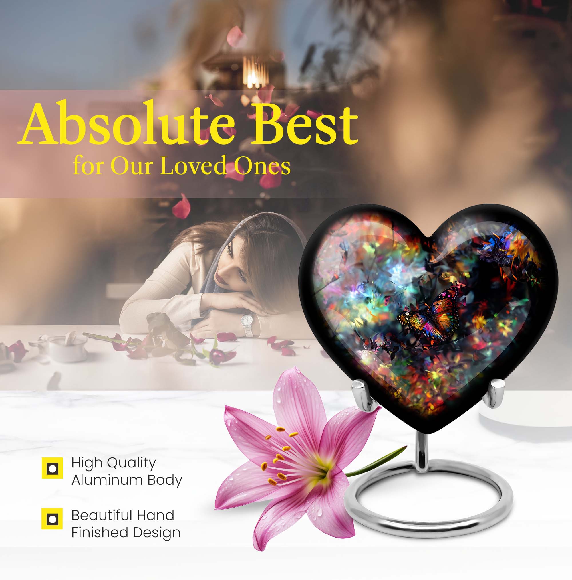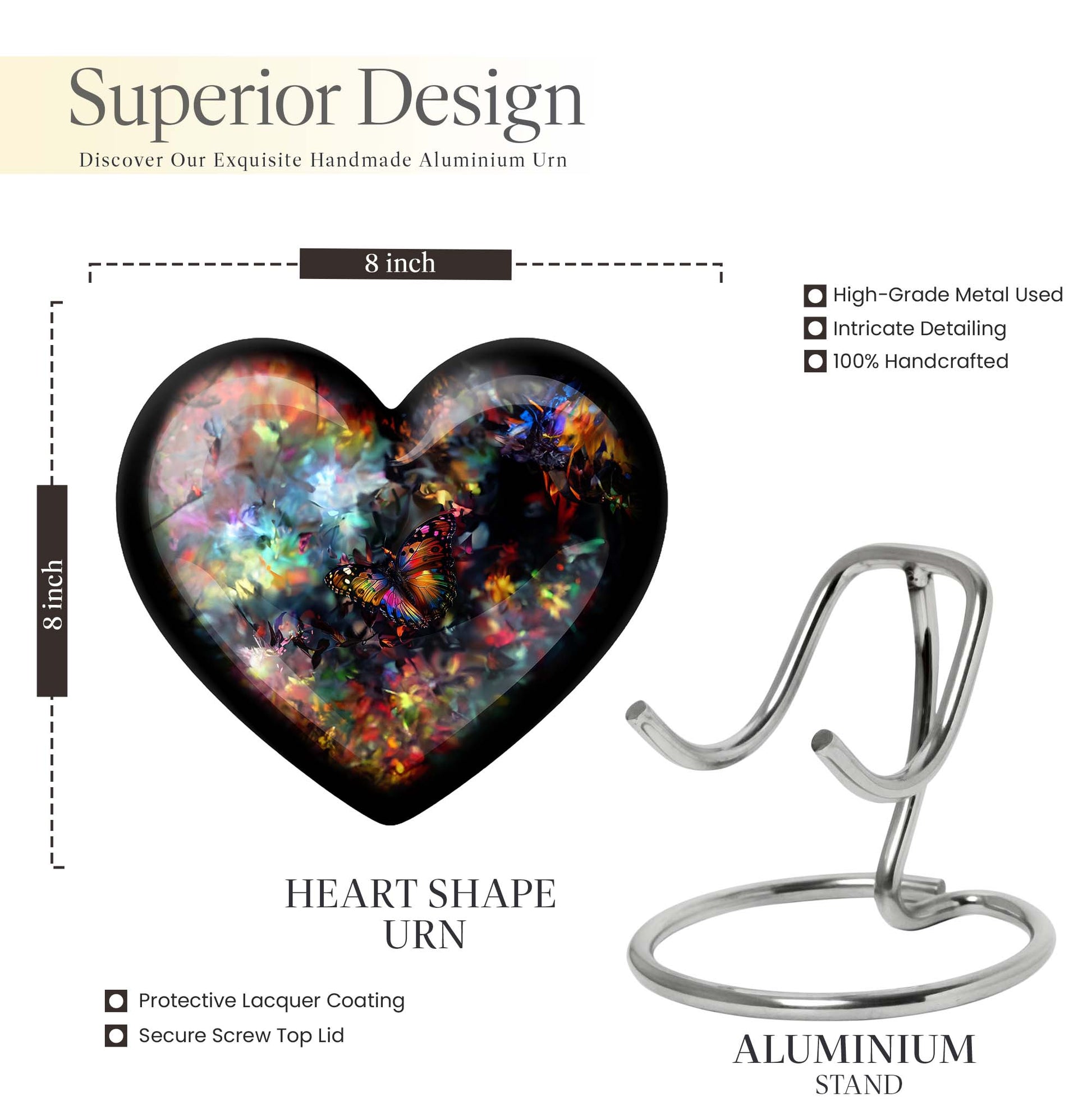 Honor the memory of your dear one with our Butterfly Medium Urn, handcrafted with dedication and attention to detail. This 10-inch heart-shaped urn, richly adorned with the howling wolf theme, serves as an ideal resting place for your loved one's ashes. The urn, weighing 3.3 pounds, holds a capacity of 200 cubic inches, providing ample space for adult human ashes. Made from high-quality aluminium, this cremation urn offers permanence and stalwartness necessary for a cherished memorial. Along with the urn, we provide a velvet pouch, a soft and secure containment for the ashes. Customization is available for those who wish to make it even more personal and reflective of their loved one, with the option to engrave names onto the urn. Diversify your search for a memorial medium urn or funeral burial urns and consider our unique butterfly urn. A remarkable blend of aesthetic and practical, the urn is likely to satisfy those looking for something outside the ordinary in cremation urns for human ashes.