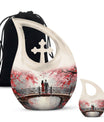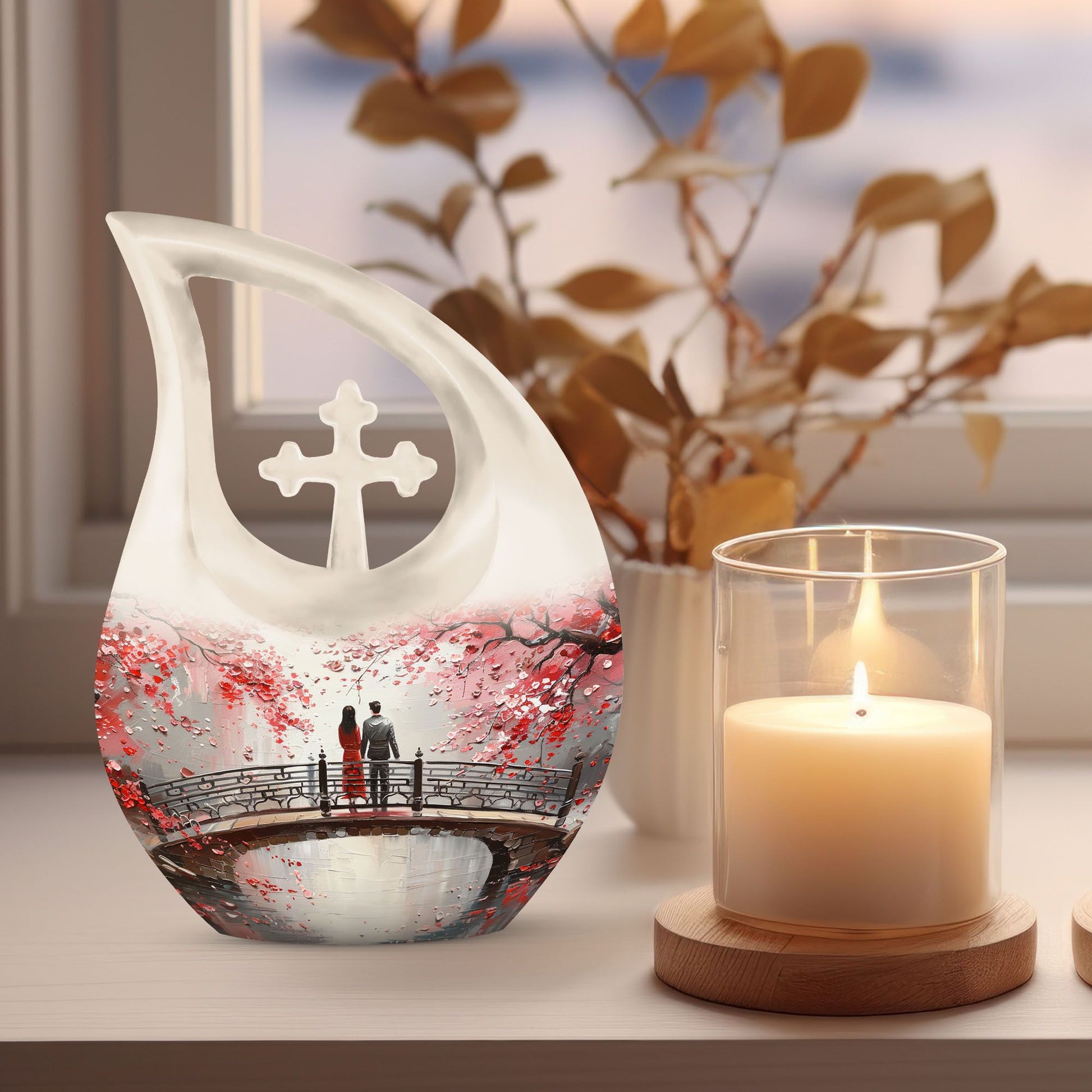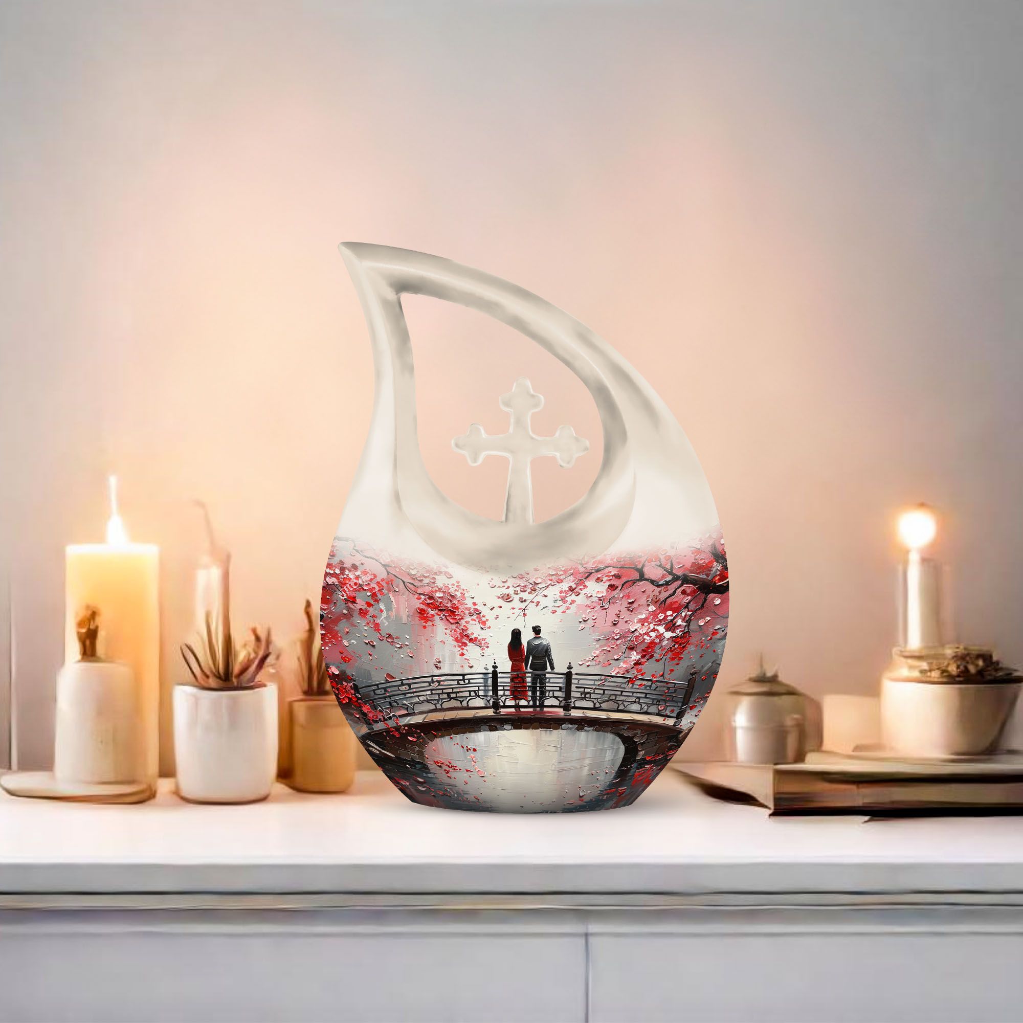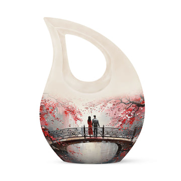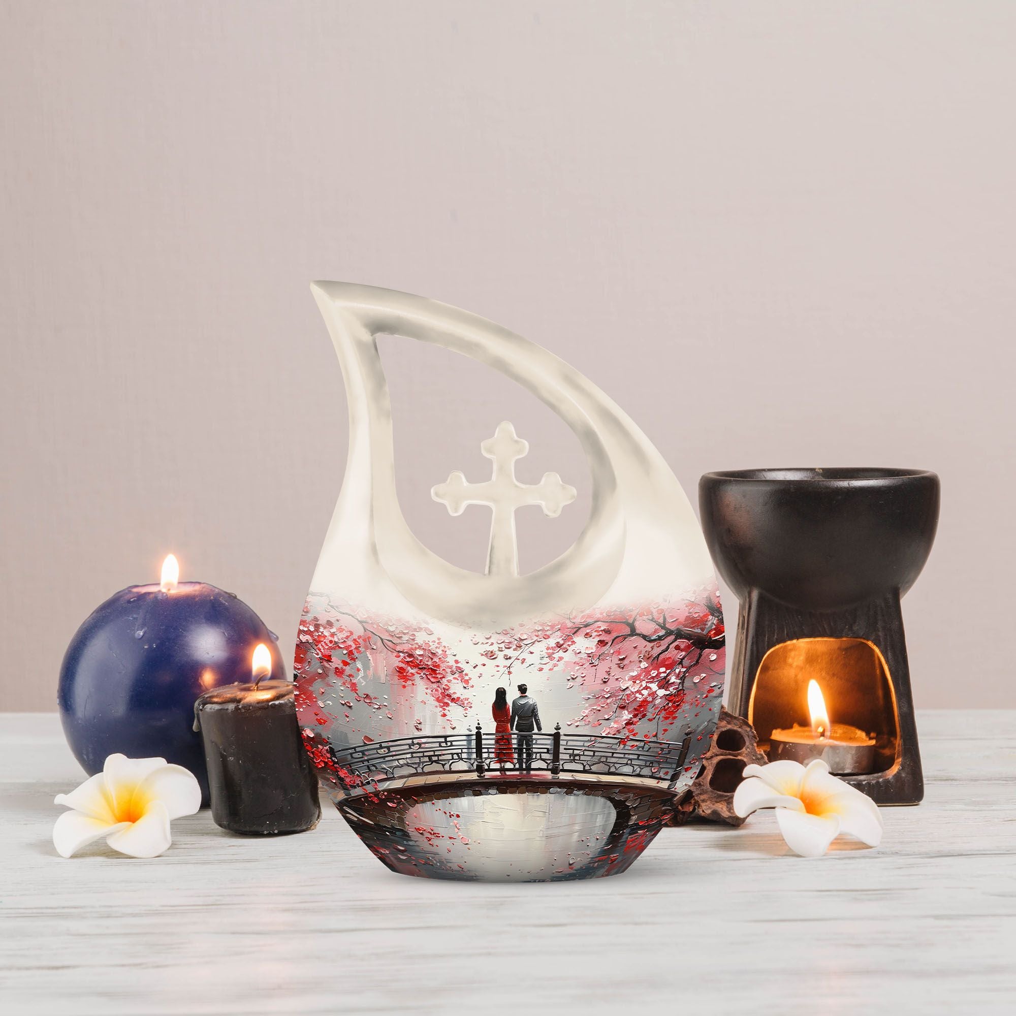The Lovers Memorial Urn for Ashes beautifully represents the eternal bond shared between two souls. Inspired by the symbolism of a bridge — connecting hearts across time and distance — this urn for men & women serves as a deeply meaningful tribute to love that endures beyond life. Its tranquil design and heartfelt artistry make it a comforting choice for couples or individuals who lived a life of shared devotion.