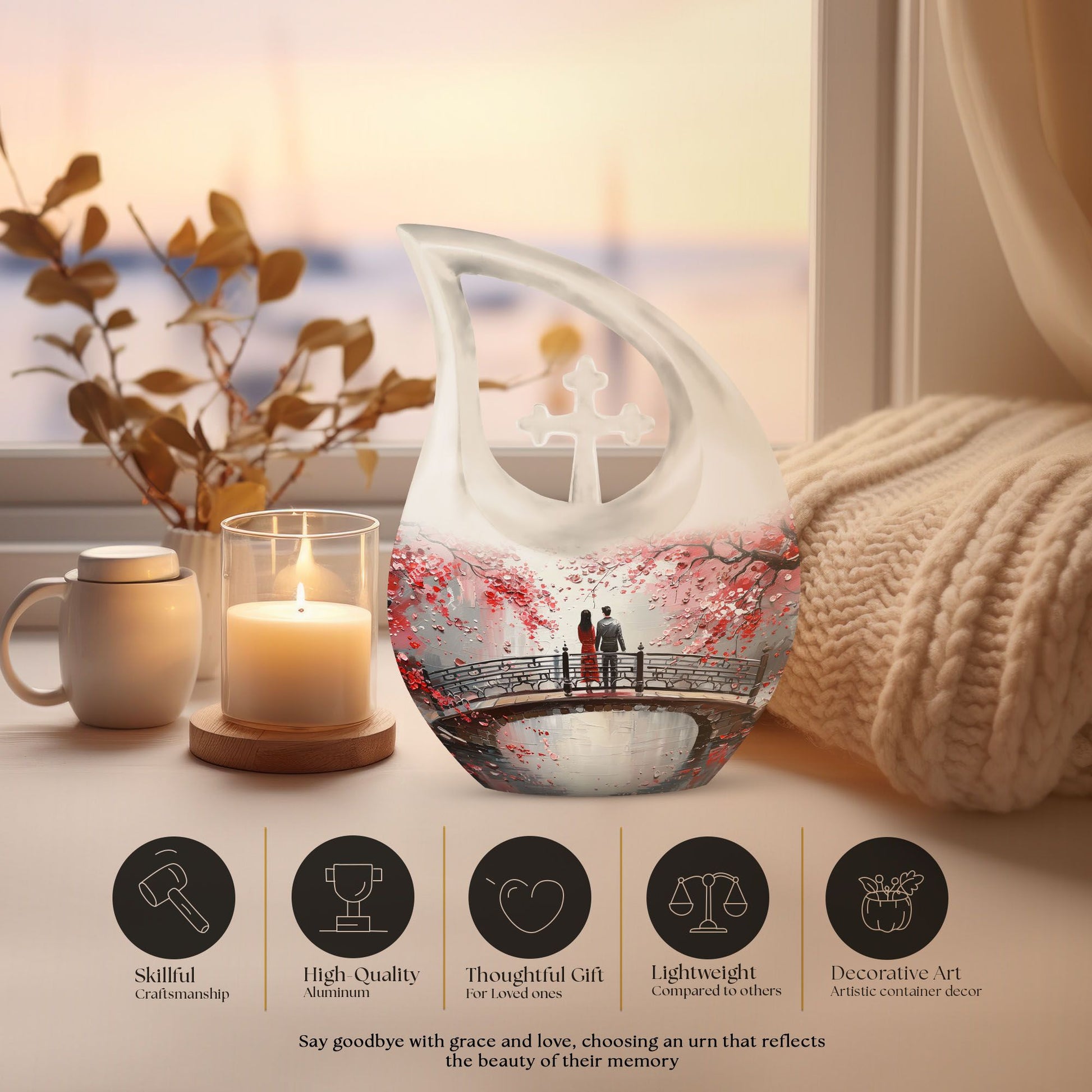 Expertly handcrafted from premium aluminum, this lovers bridge cremation urn for ashes features a soft sunset background over a bridge silhouette, symbolizing unity and eternal connection. The smooth surface and secure screw-top lid ensure ashes are preserved safely, while the detailed artwork adds warmth and sophistication. Perfect for home memorials or burial ceremonies, this urn is ideal as an urn for ashes for men, funeral urns for women, or urn for women & men memorial piece.