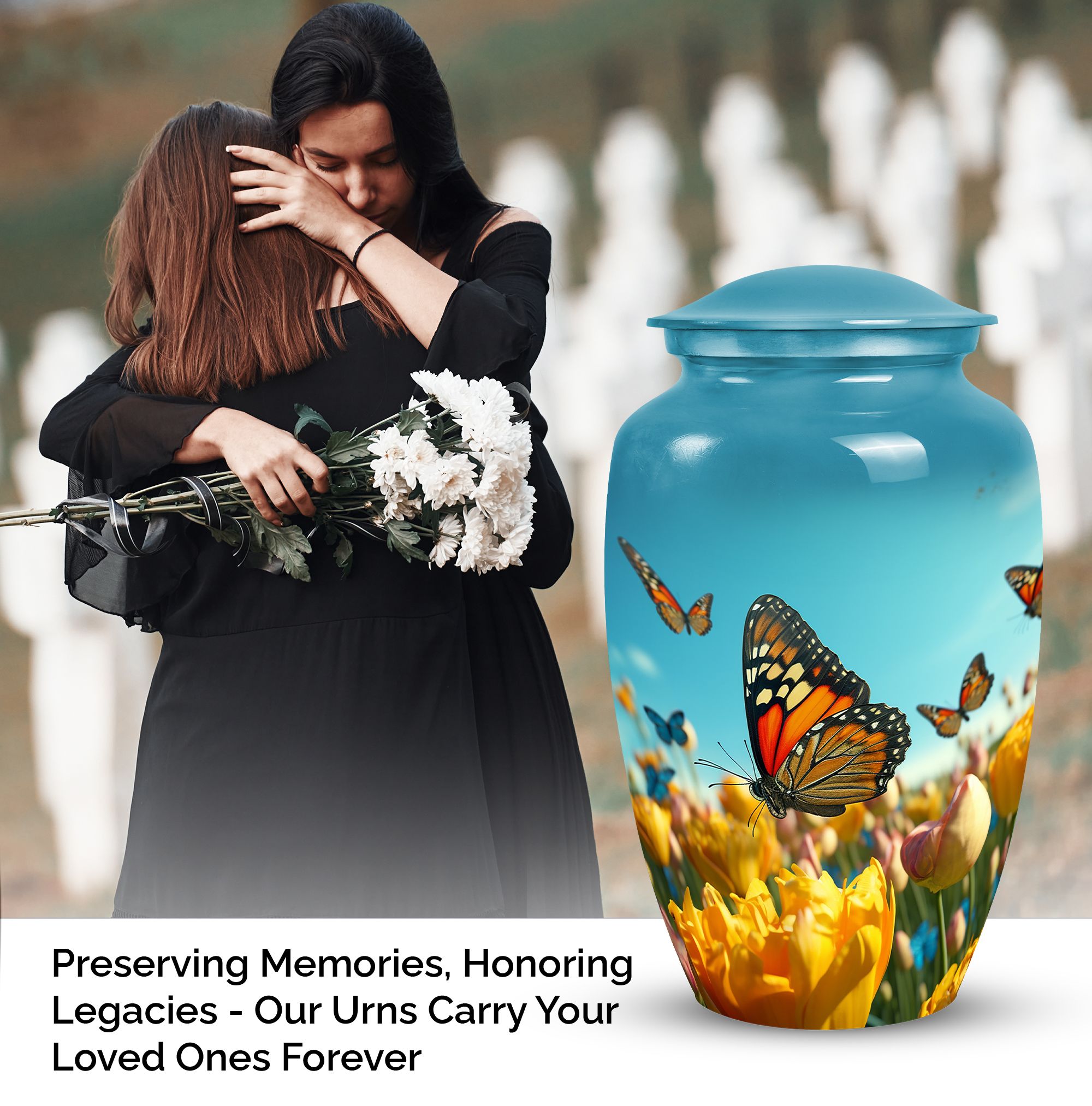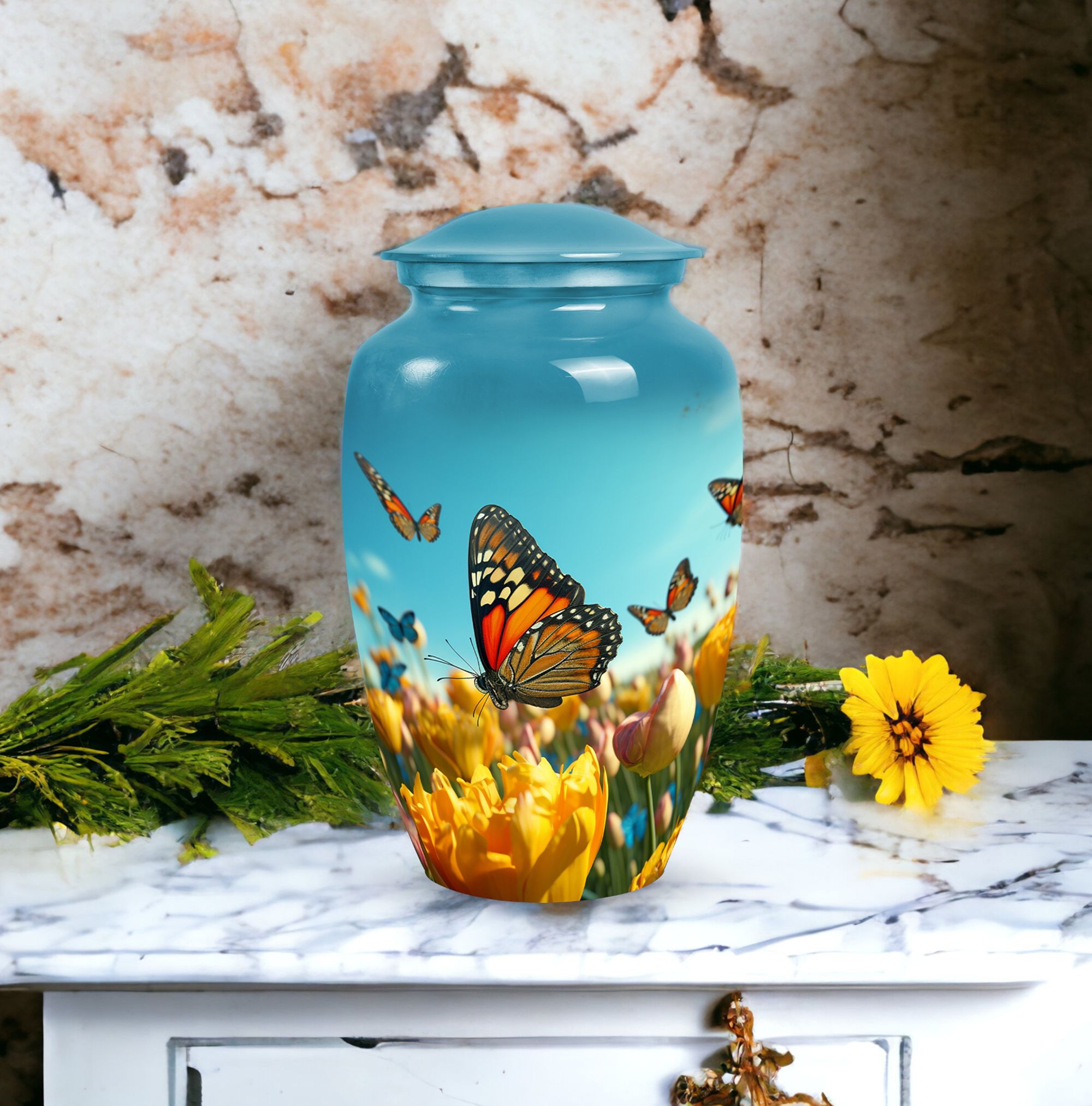 The Monarch Butterfly in Blue Sky Memorial Urn – Sunflower Cremation Urn For Mom is a heartfelt tribute that blends the warmth of sunflowers with the grace of butterflies. This artistic sky urn symbolizes renewal, love, and eternal peace, making it an ideal choice for honoring a beloved mother or father.
