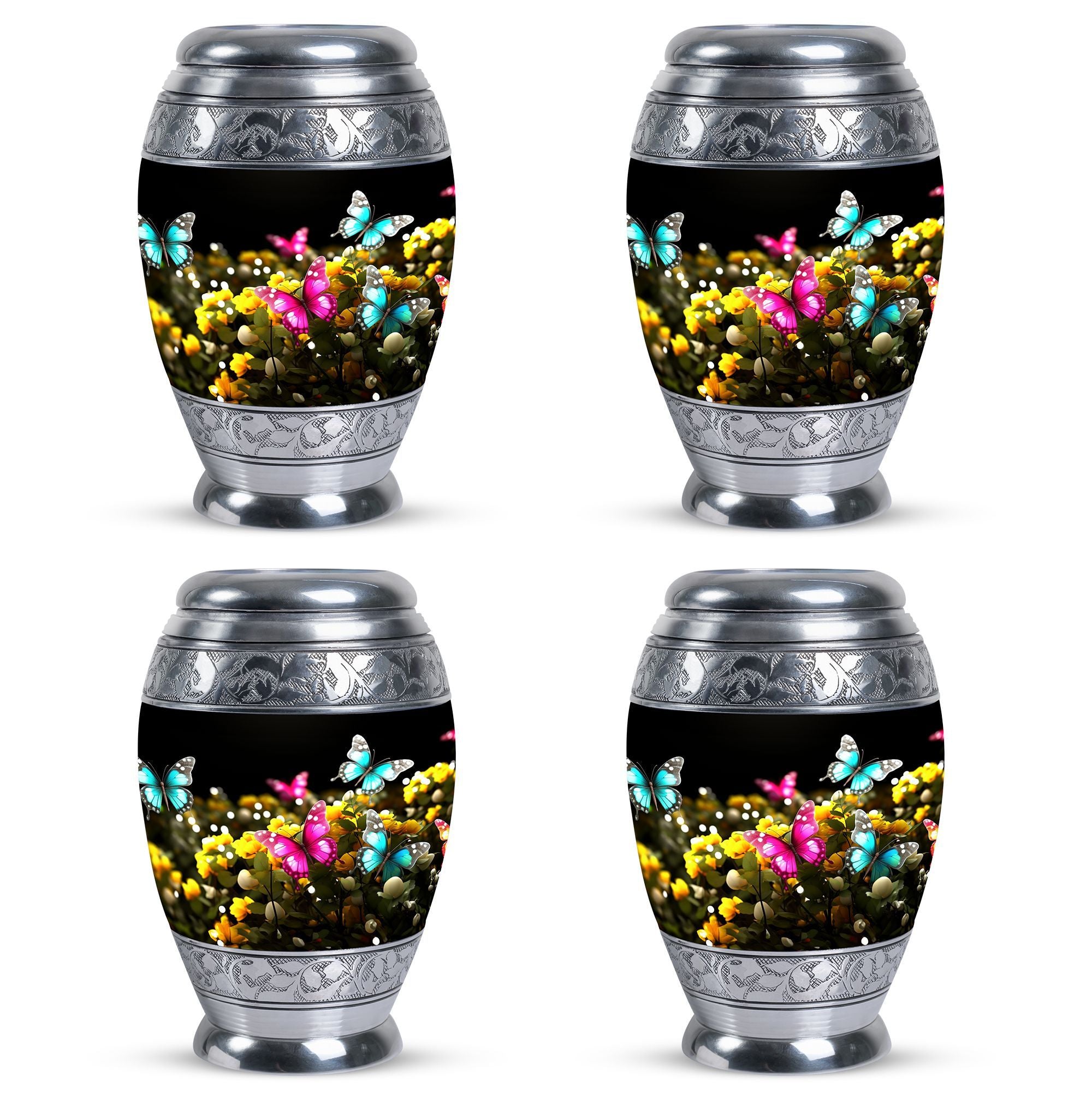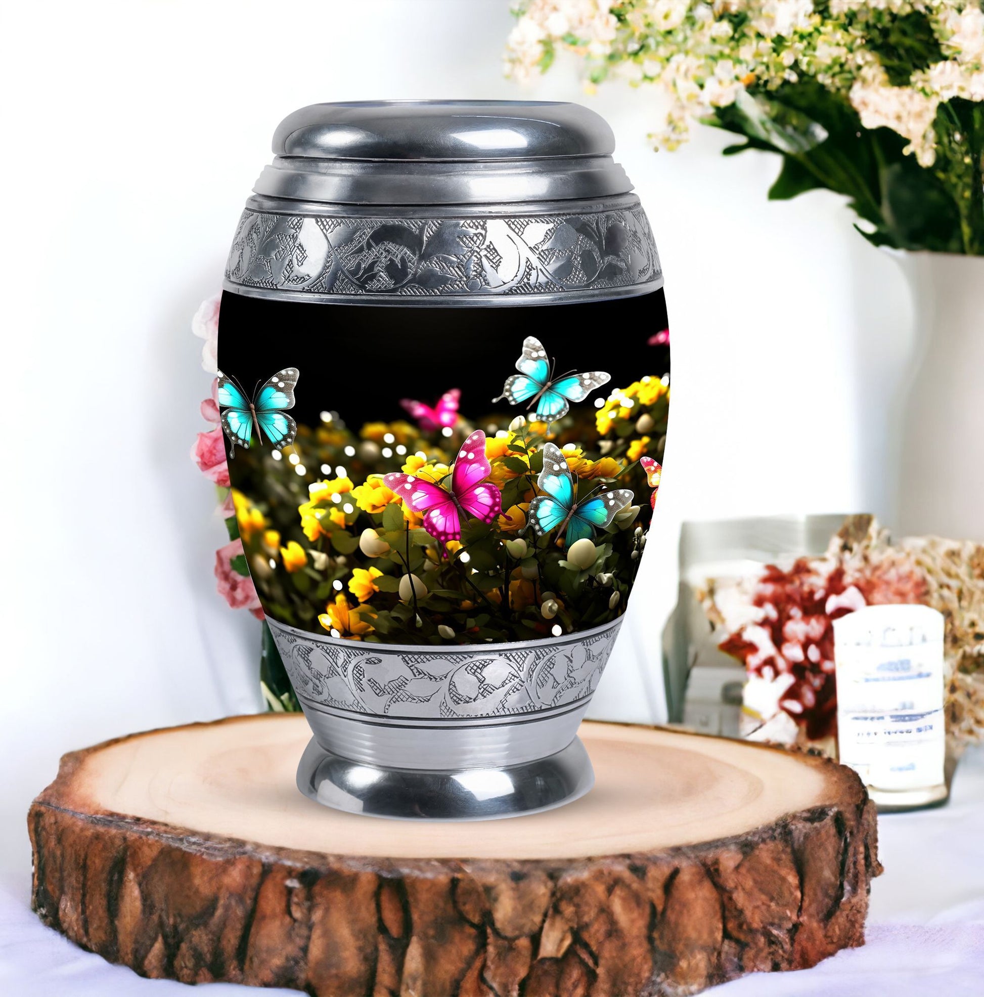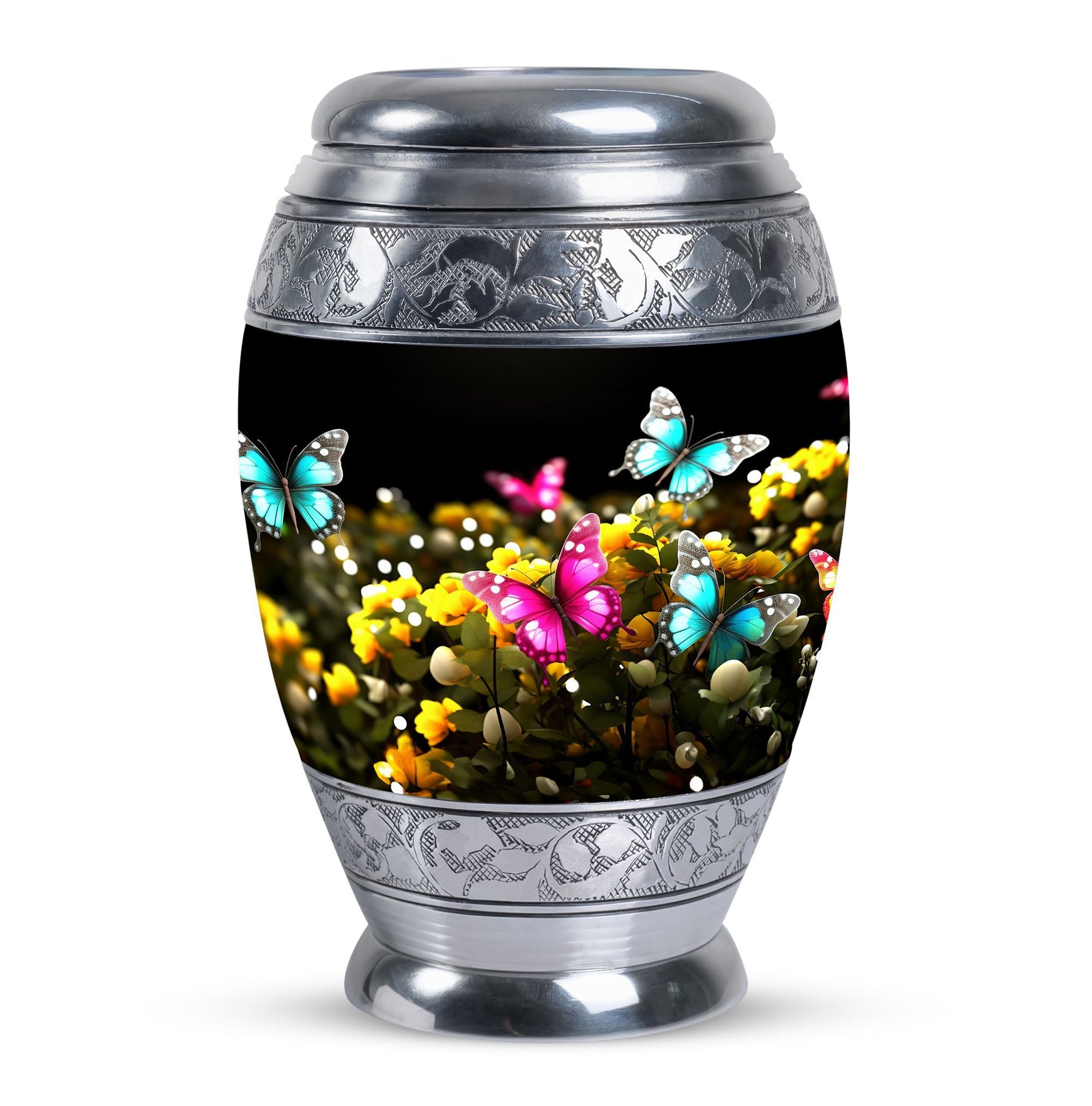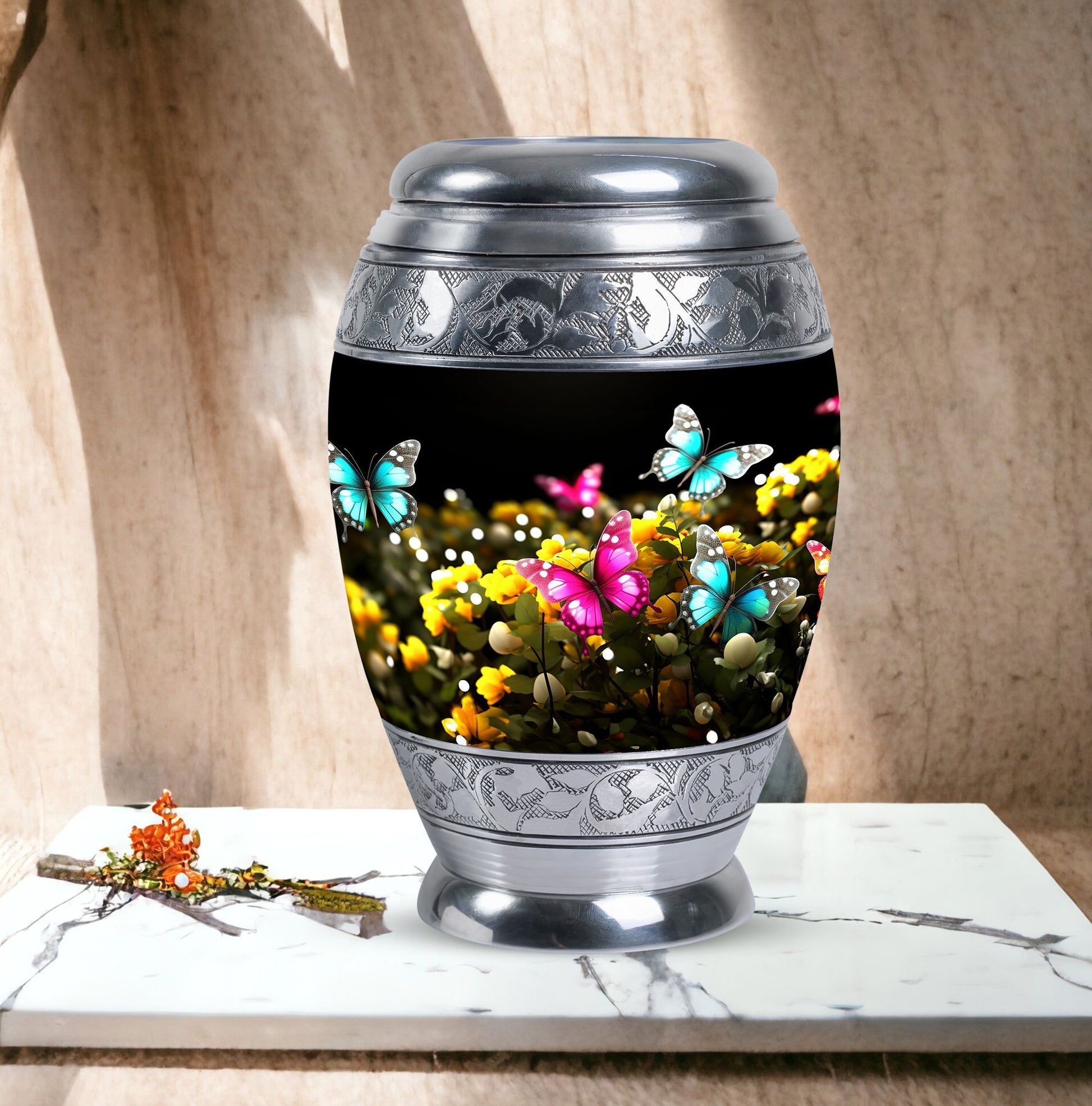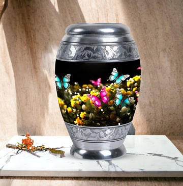 Introducing our 3-Inch Classic Large Urn, a beautifully executed cremation urn in an elegant Blue Butterfly design. Crafted from quality aluminium, it stands 10 inches in height, and weighs a sturdy 3.3 pounds. This tastefully-designed keepsake boasts a capacity of 200 cubic inches, ready to comfortably contain your cherished memorials. This urn offers an option for personalization, with the possibility to engrave names, making it a truly unique remembrance. Our Classic Urn stands out from other variants with its sophisticated touch and heartwarming presence. This graceful cremation urn comes with a velvet pouch, ensuring a dignified containment of ashes. With its classy aesthetics and high-quality material, it makes a perfect option as a Modern Urn or Burial Urn for ashes. Our urns are not just containers; they are beautiful, personalized pieces that respect, celebrate, and remember a loved life. Commemorate your loved ones with our Large Classic Urn.