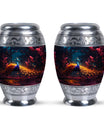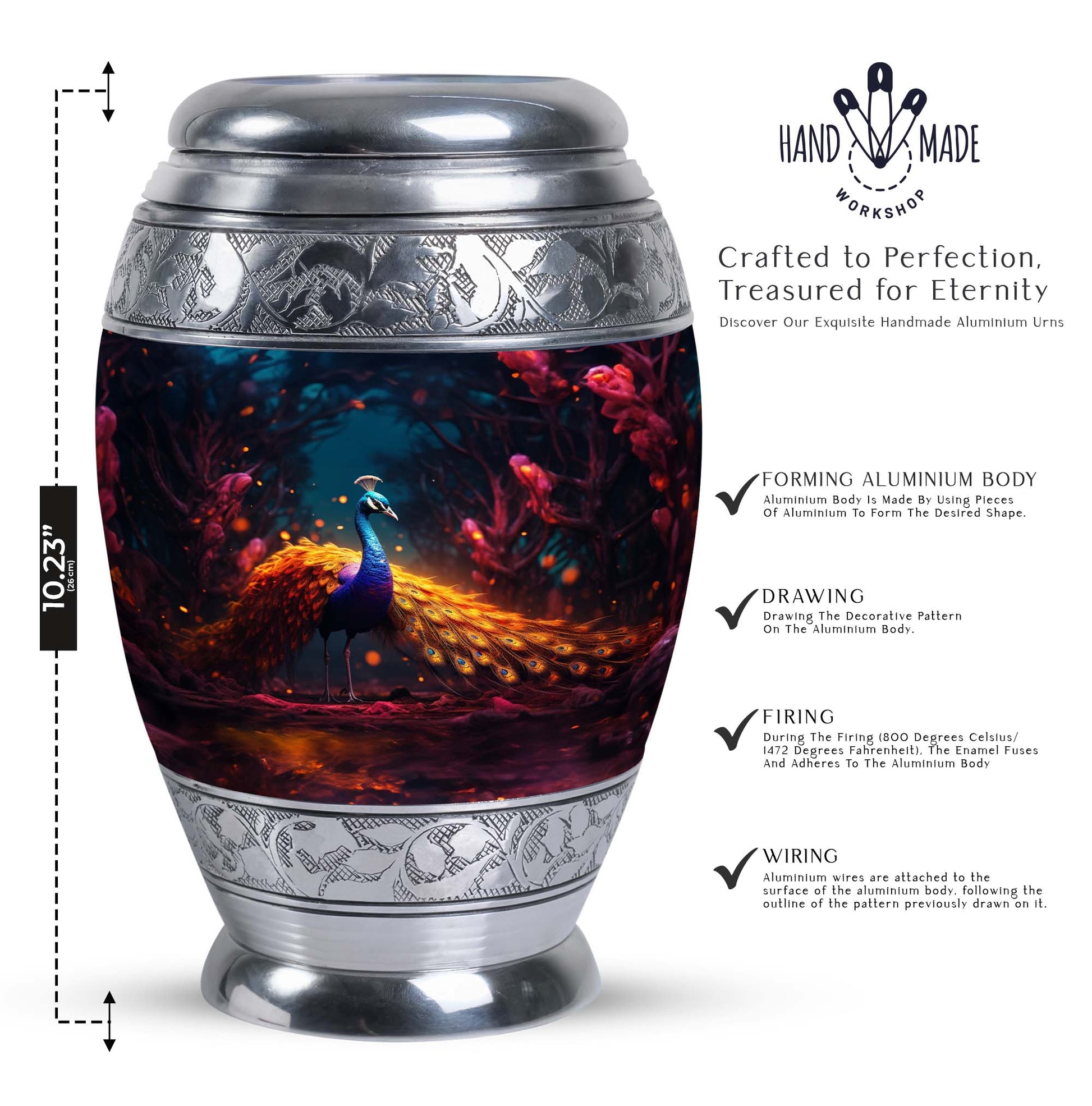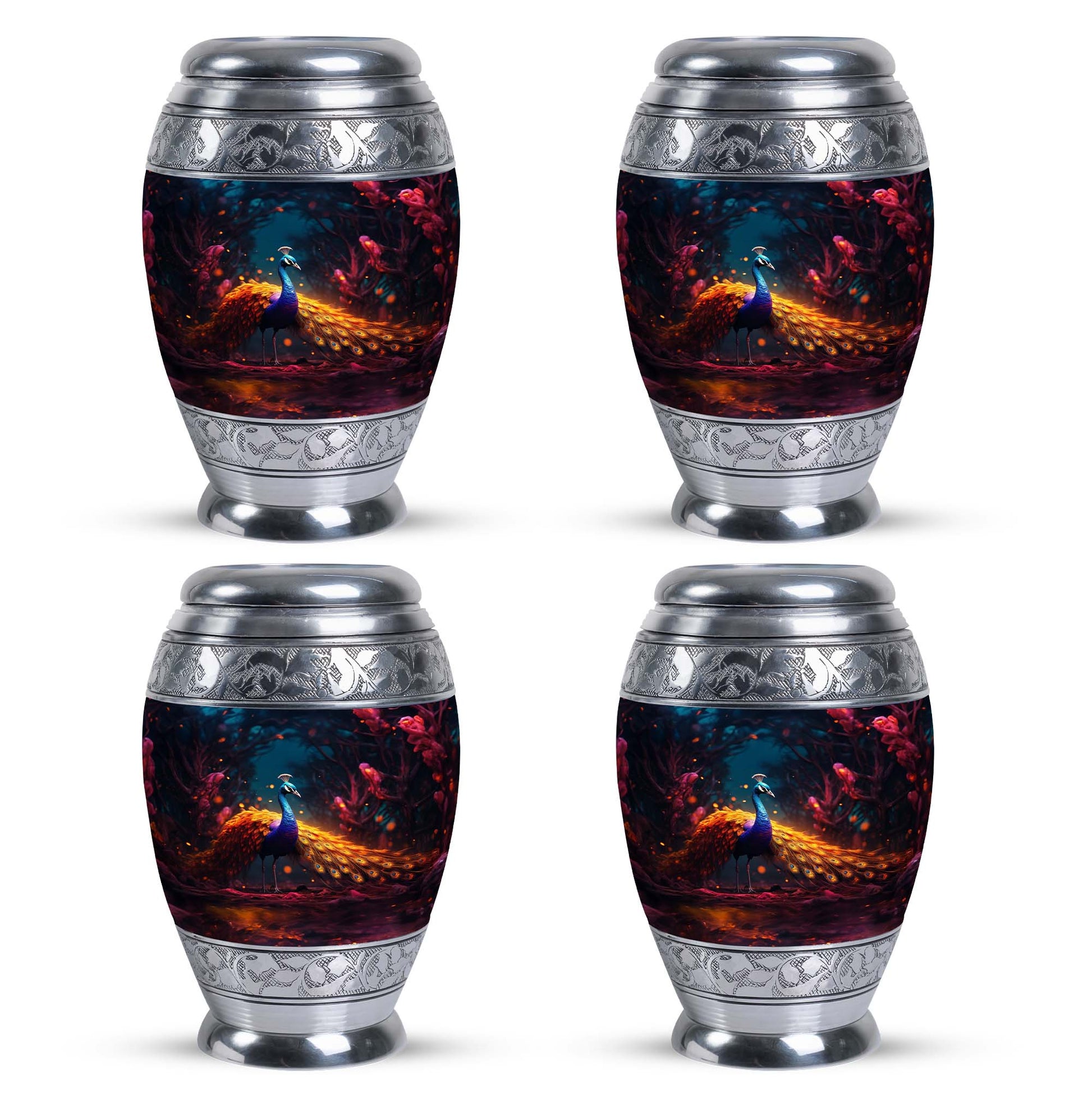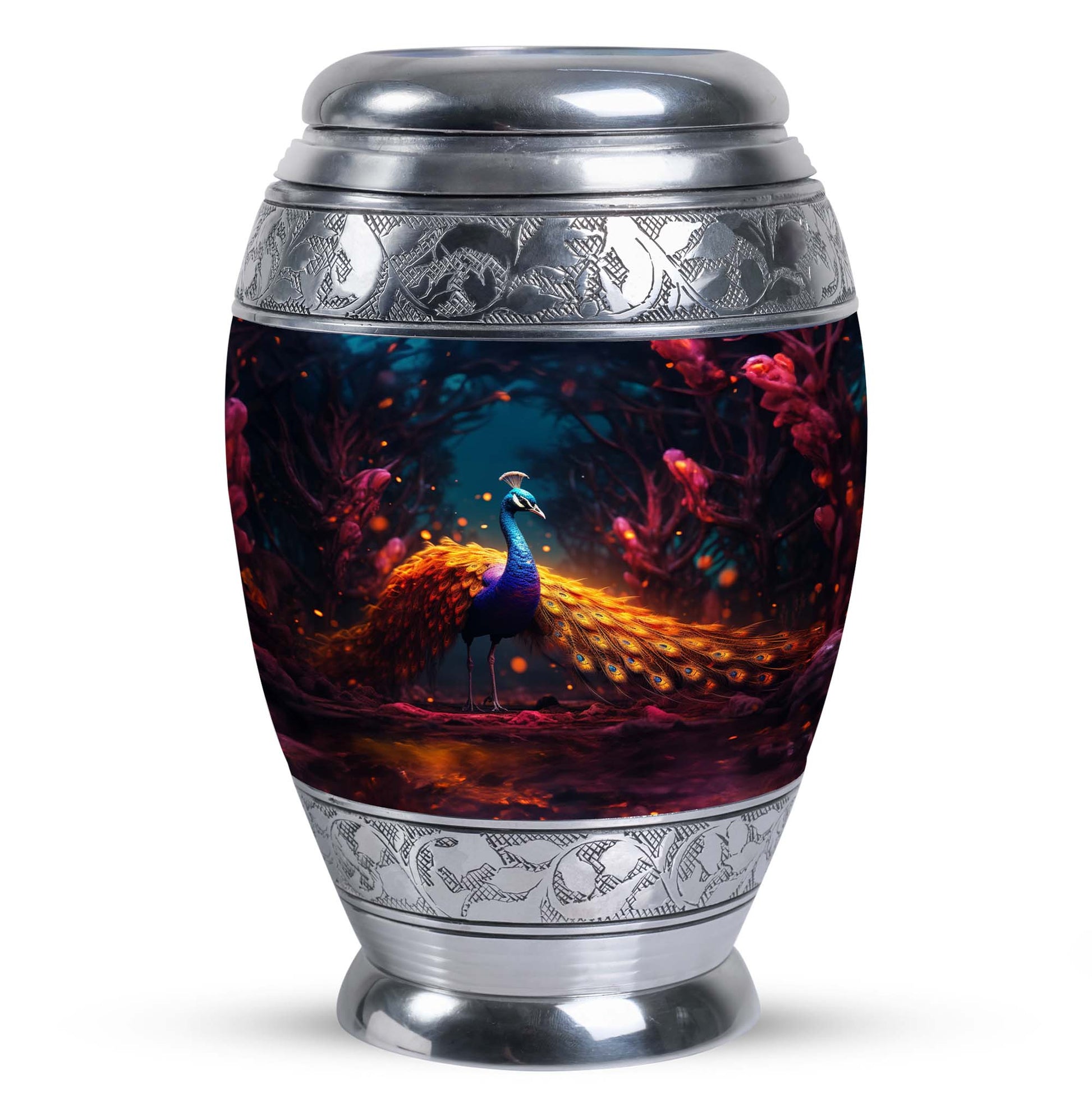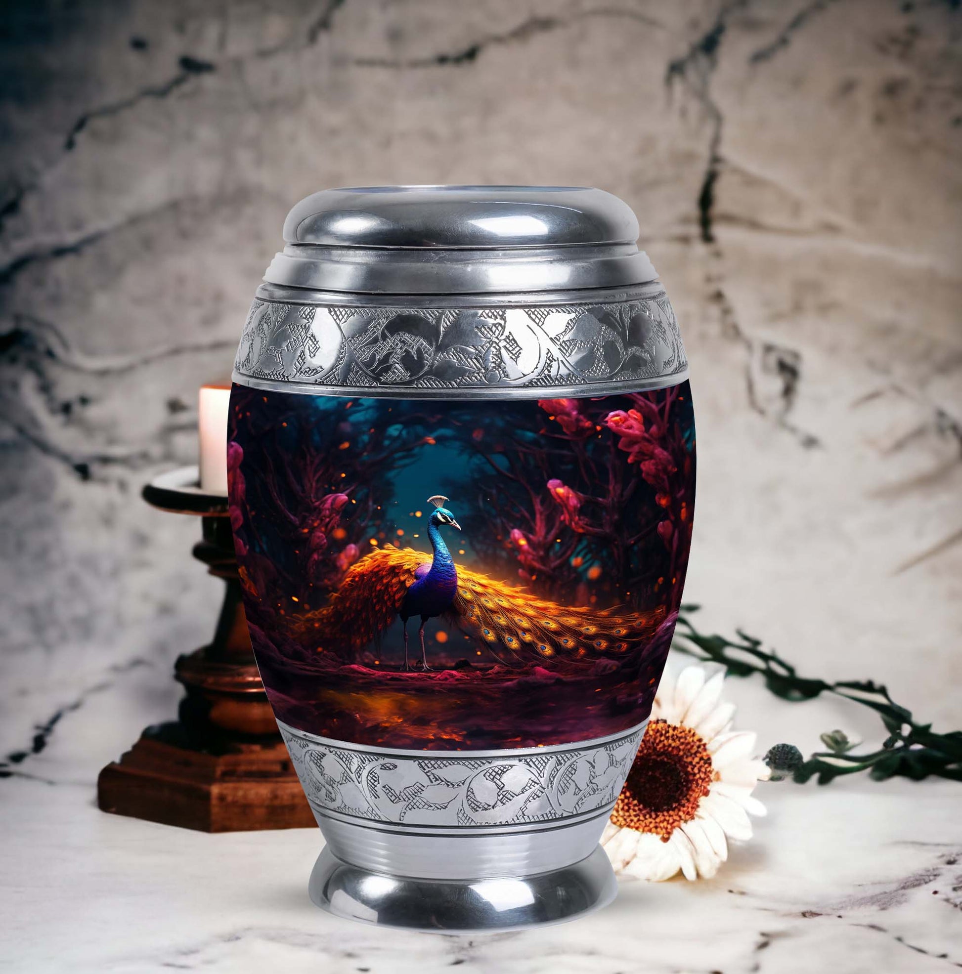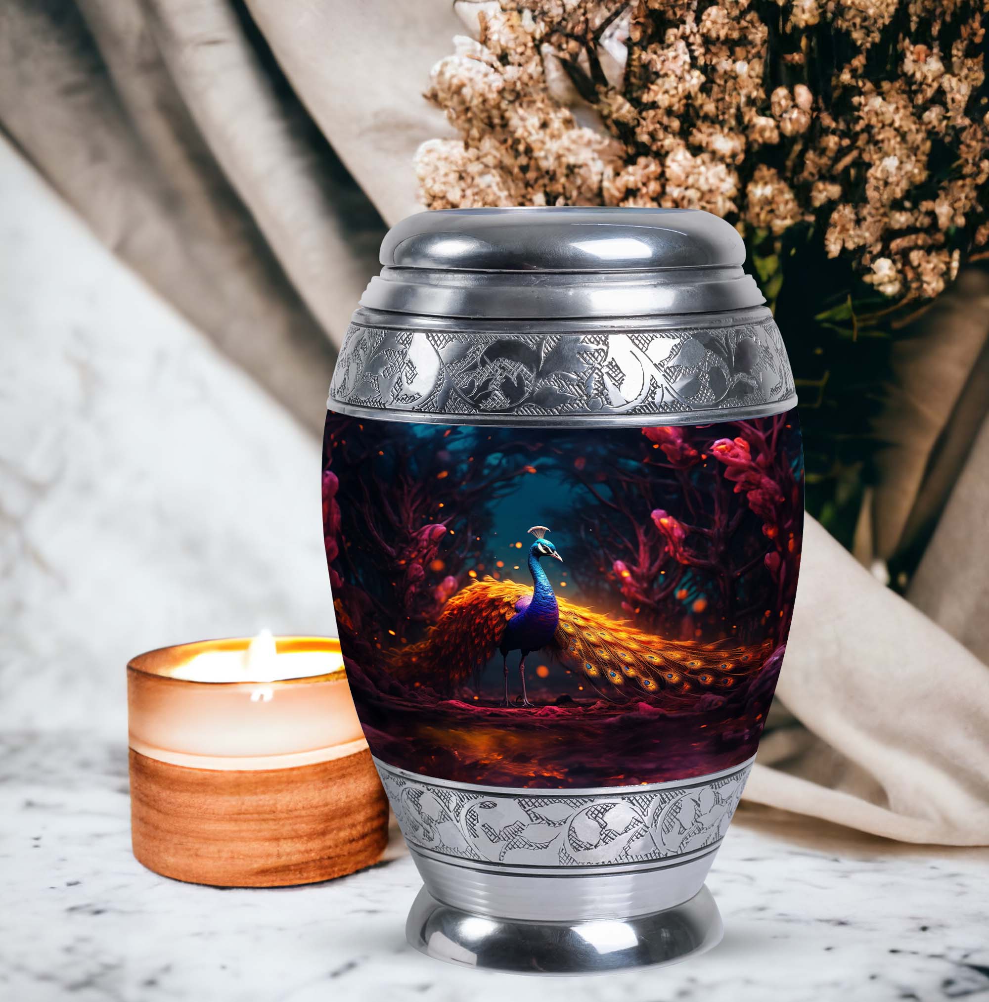Presenting our meticulously crafted Blue Peacock Aluminum Urn for human ashes - an eloquent tribute and resting place for your loved one. Encompassing a striking blue peacock hue, this large urn exhibits a timeless, classic urn design apt for fitting remembrance. This personalized urn offers a generous capacity of 200 cubic inches, ample space for preserving the ashes of a cherished soul. Its robust construction of high-quality aluminum ensures longevity while keeping the urn's weight at a manageable 3.3 pounds. Standing at 10 inches in height, it adds an imposing yet tranquil presence to any room decor. Accompanied by a soft velvet pouch for dedicated containment of ashes, it enhances the sense of honor, fostering easy transport or storage when needed. Unique secondary keywords like 'Metal Cremation Urns', 'Urns for Human Remains', add to the uniqueness of our product, catering to those in search of memorable memorial ceremony supplies. Enrich the remembering process with our custom urns, crafted for personalized comfort and heartfelt memories, allowing individuals to personalize with engraved names. A comforting commemoration for adults and seniors alike.