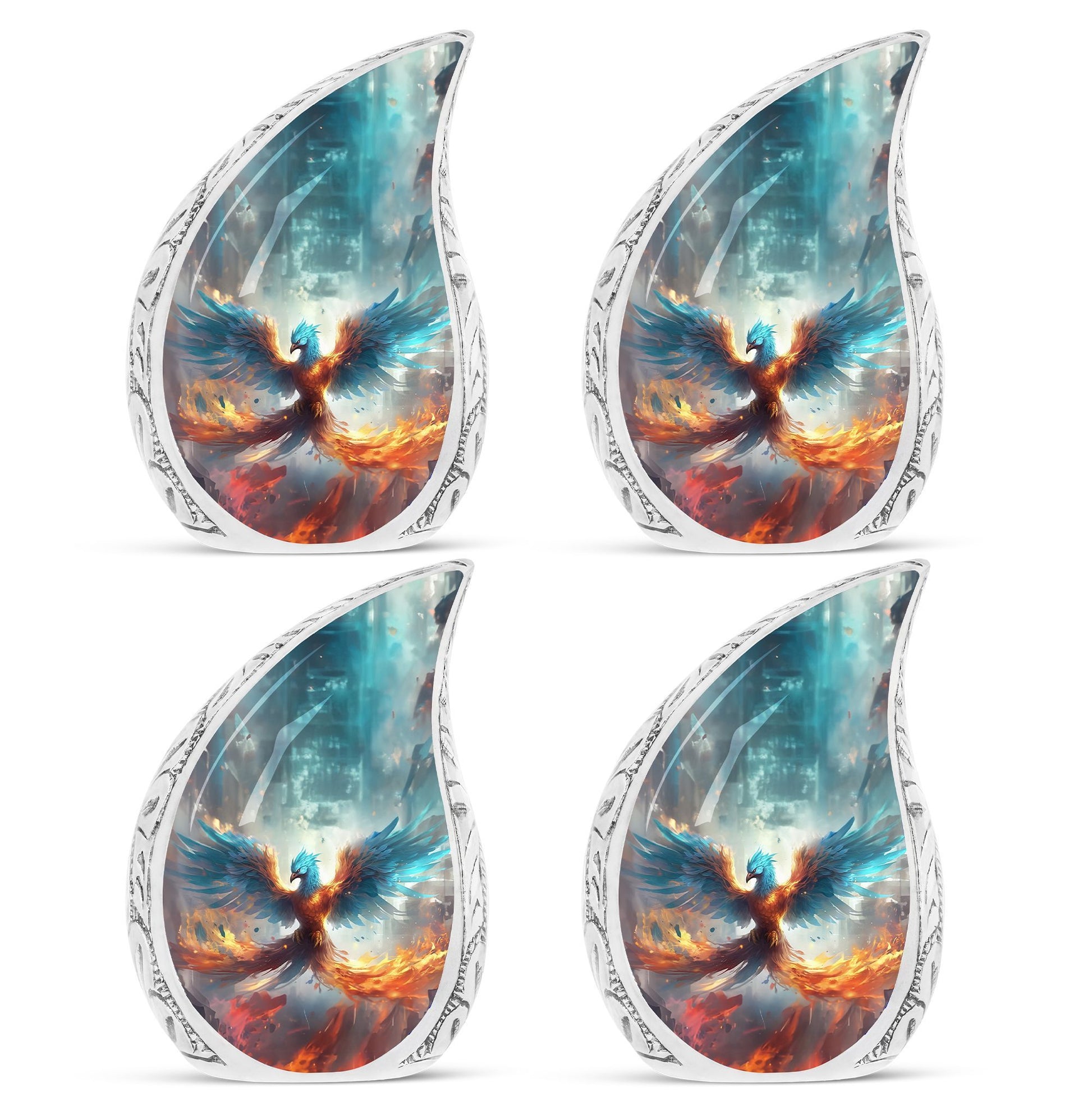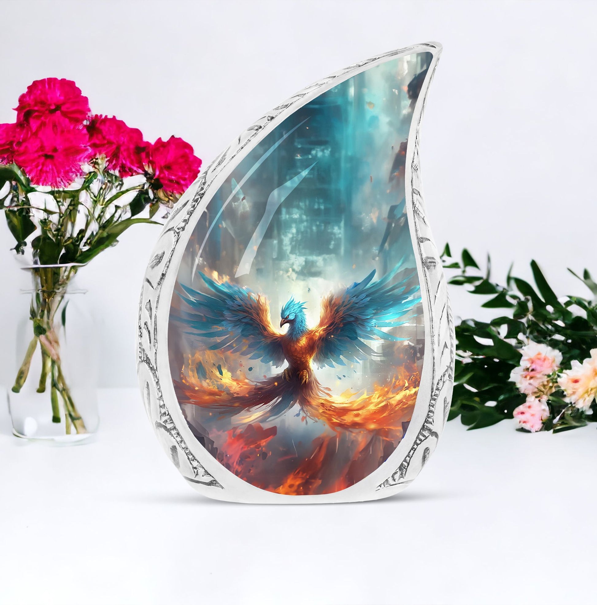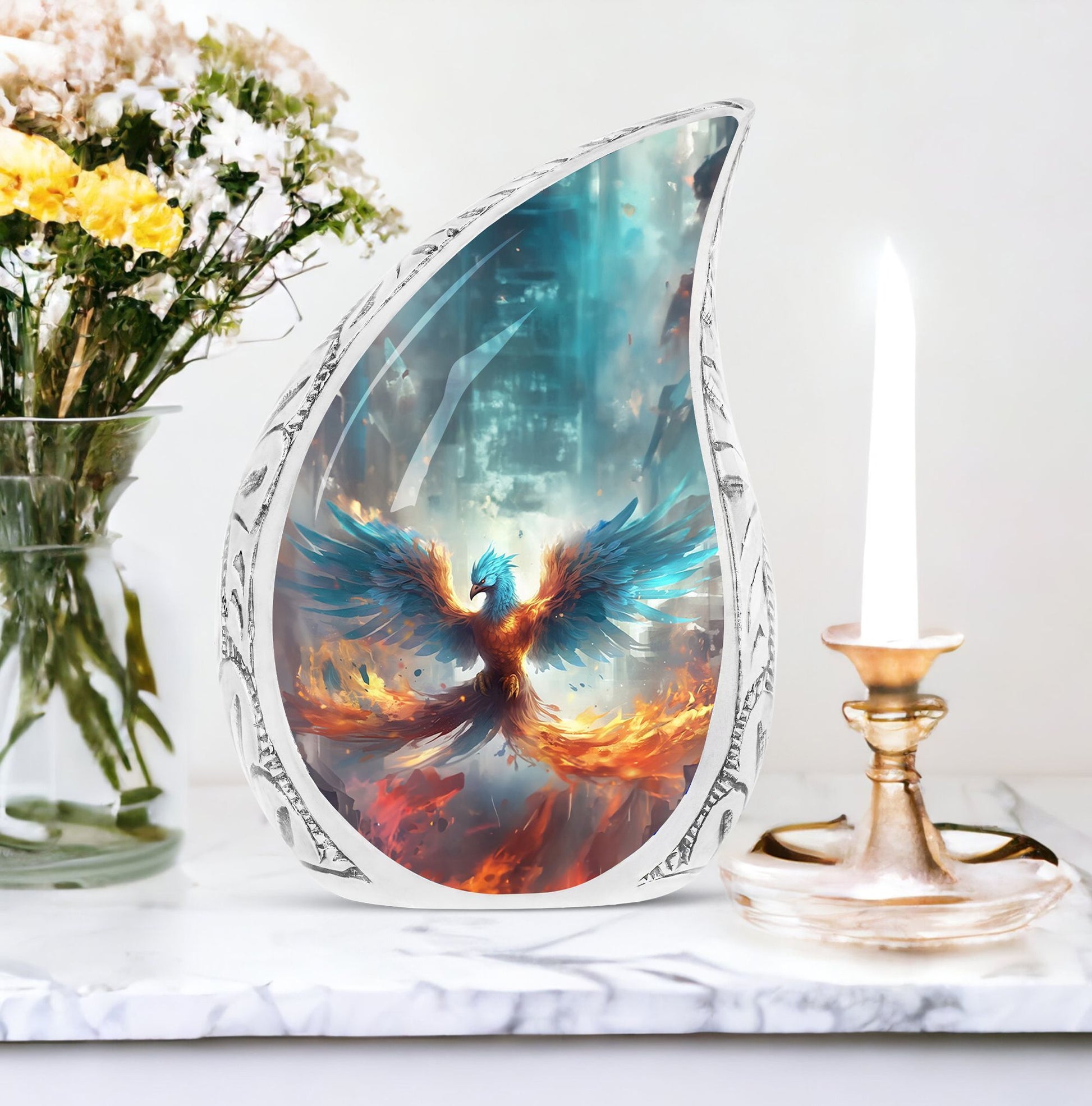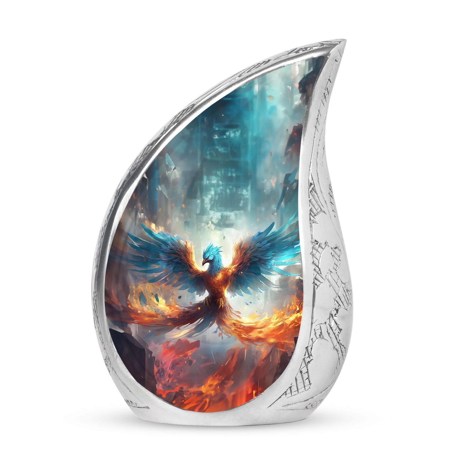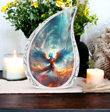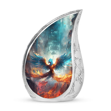 Discover the serenity and elegance of our Blue Phoenix Cremation Urn, a remarkable representation of superior craftsmanship in the adult urns category. This exceptional cremation urn, engineered to perfect dimensions of 10 inches in height, provides a considerable capacity of 200 cubic inches, thoughtfully accommodating the ashes of your beloved ones. Crafted from high-quality Aluminium, this urn weighs a sturdy 3.3 pounds attributing to its substantial presence and longevity. The urn comes nestled in a delicate velvet pouch, providing a dignified containment for the ashes. The intricacy of this Large Urn transcends beyond its form, offering a unique customization feature. It allows you to personalize your piece with engraved names, etching a lasting memory. Steer clear from the conventional and embrace the uncommon sophistication that this modern urn for human ashes gracefully offers. Immerse in honoring their cherished life and love with this distinctively memorable Ashes Holder, often revered as top-notch in Burial Urns for Ashes.