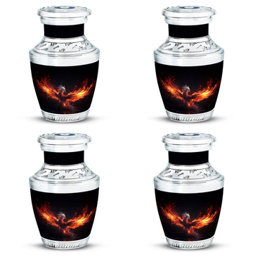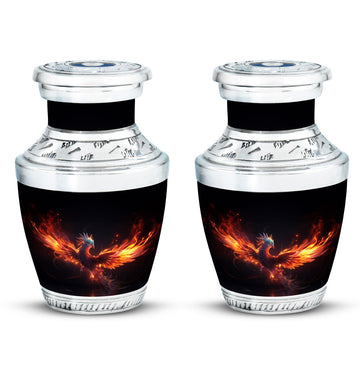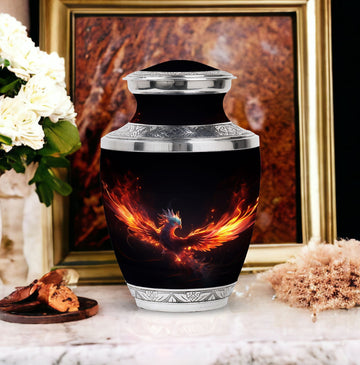 Discover peace and tranquility with our Blue Phoenix Urns for Ashes. These large, 10-inch tall Custom Urns are perfect for commemorating the life of a loved one. Crafted from durable aluminium, the Classic Urn offers the perfect balance of strength and elegance. This cremation urn can be personalized with engraved names, making it a truly unique memorial. With a generous capacity of 200 cubic inches, it has plenty of space to securely contain the ashes. Weighing in at 3.3 pounds and having a compact size of 3 inches, it's easy to handle and store. It comes with a velvet pouch for containment of ashes, resulting in an enhanced and dignified presentation. Our Metal Cremation Urns are more than just vessels, they are timeless keepsakes that remember loved ones in the most respectful way. Perfect for burial ceremonies or as a keepsake at home, our Personalized Urns for Human Ashes resonate with memorable legacies and lasting love.
