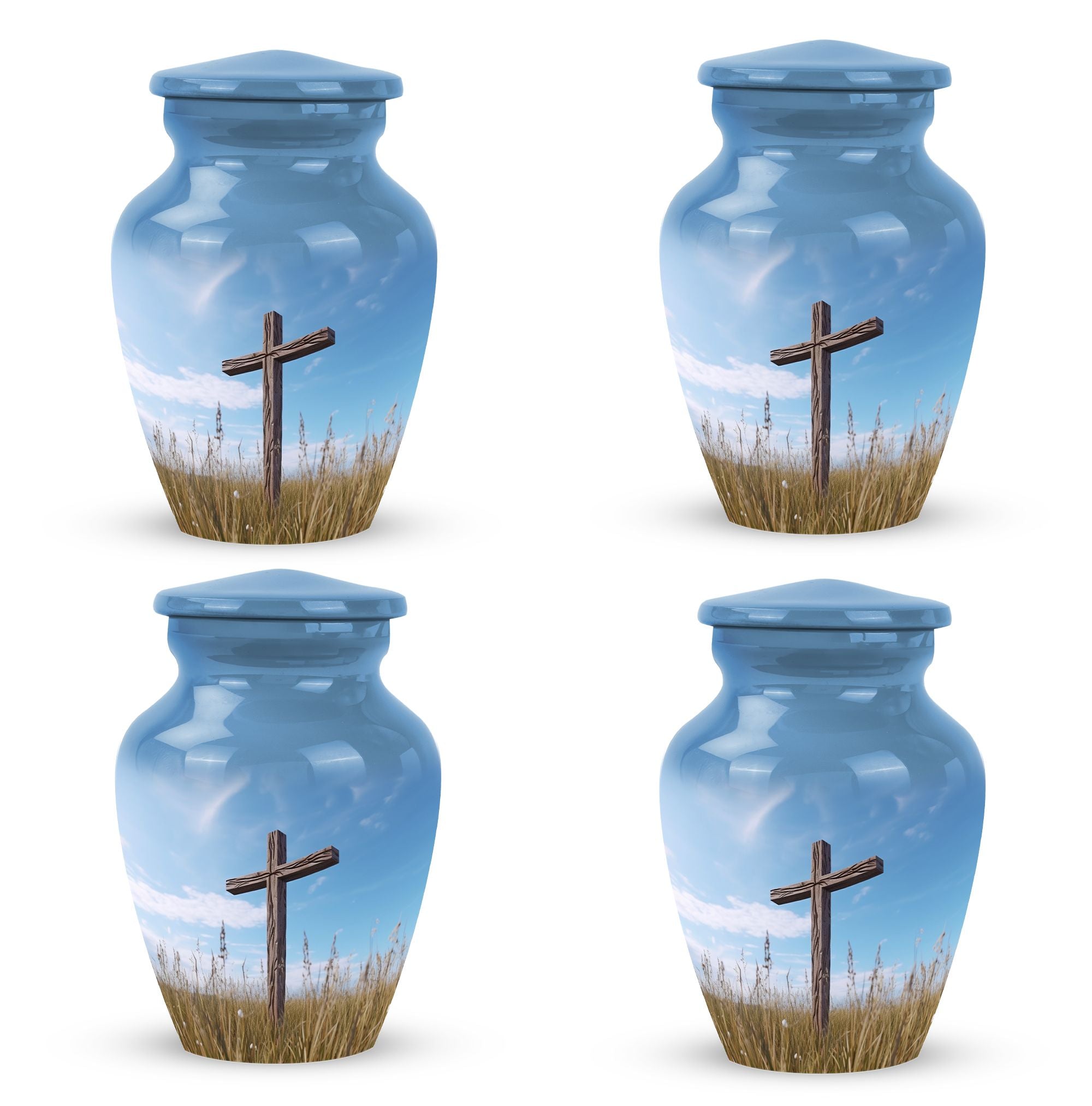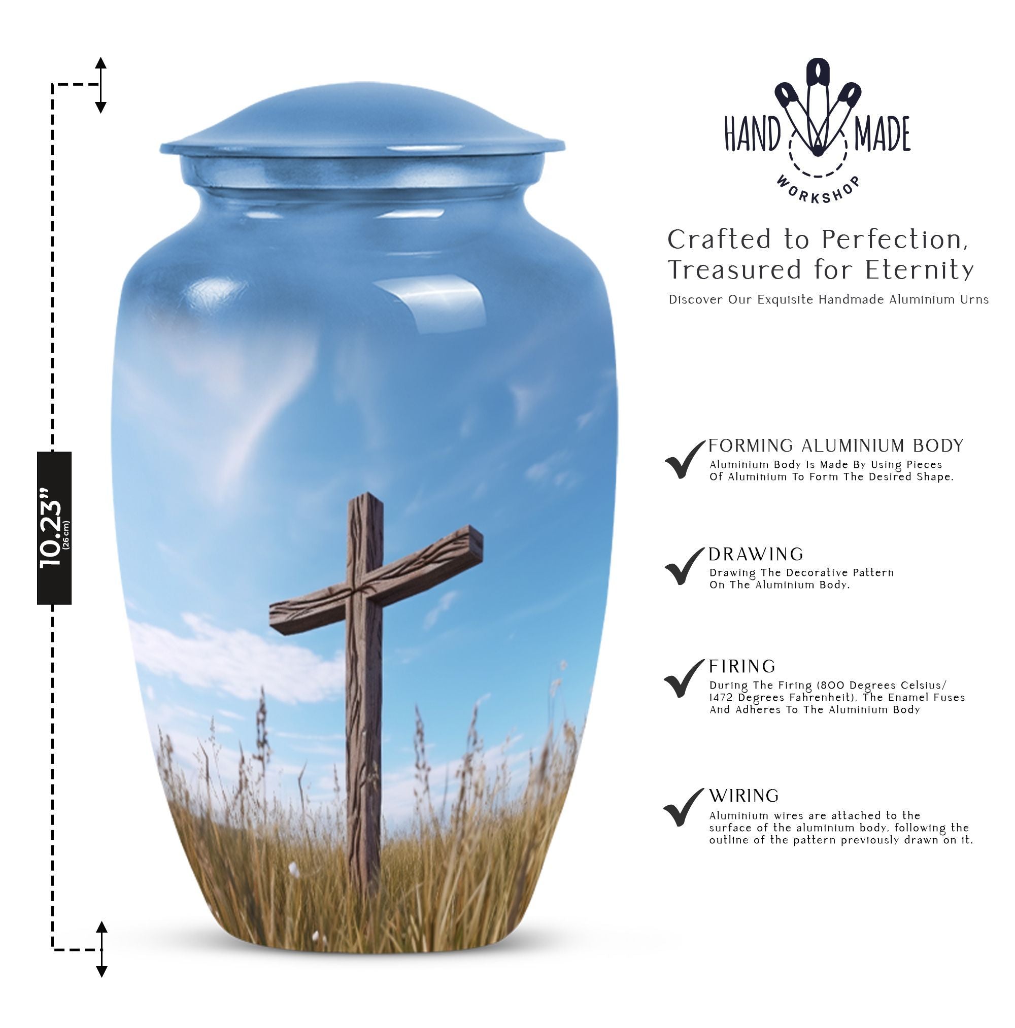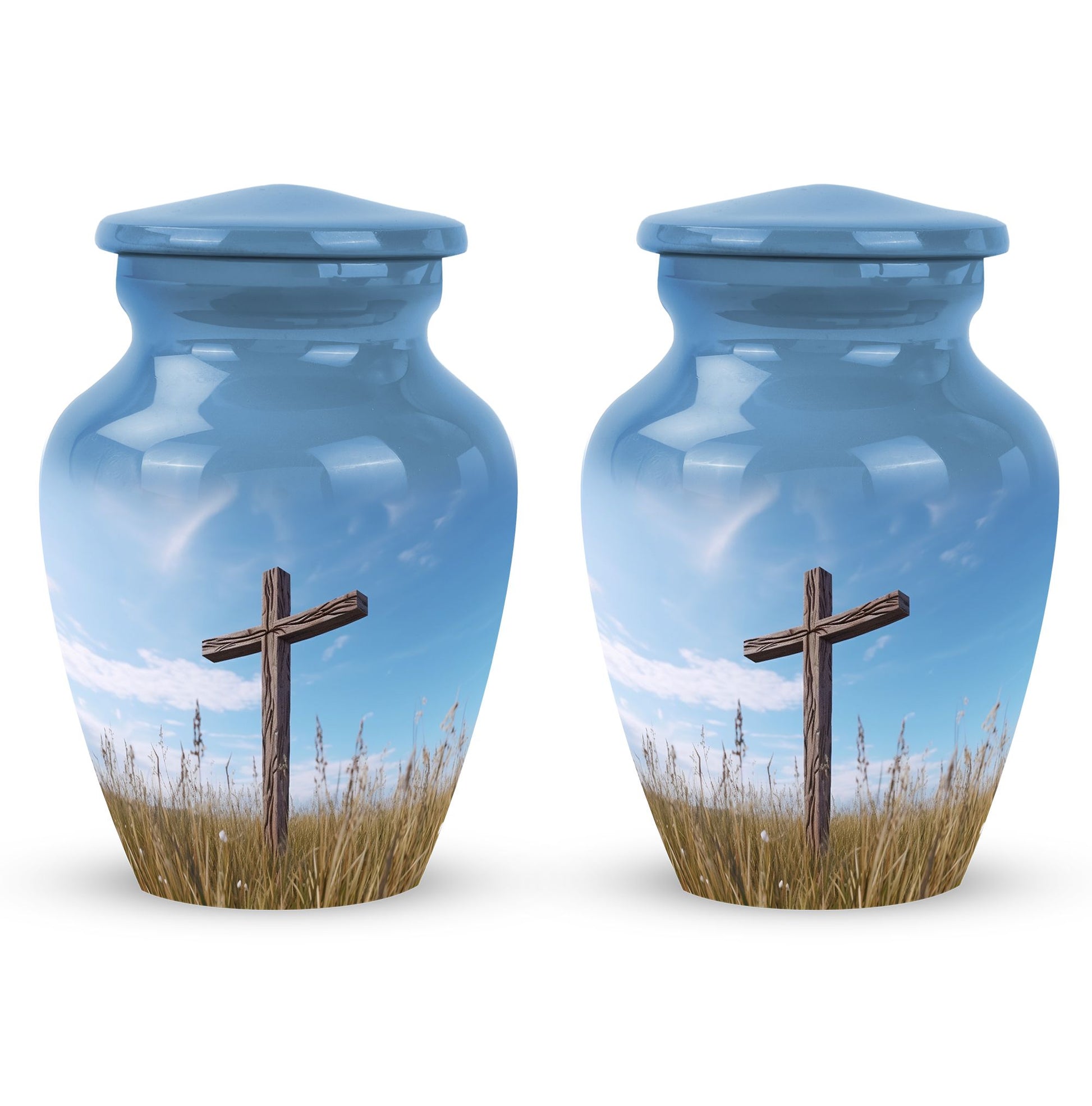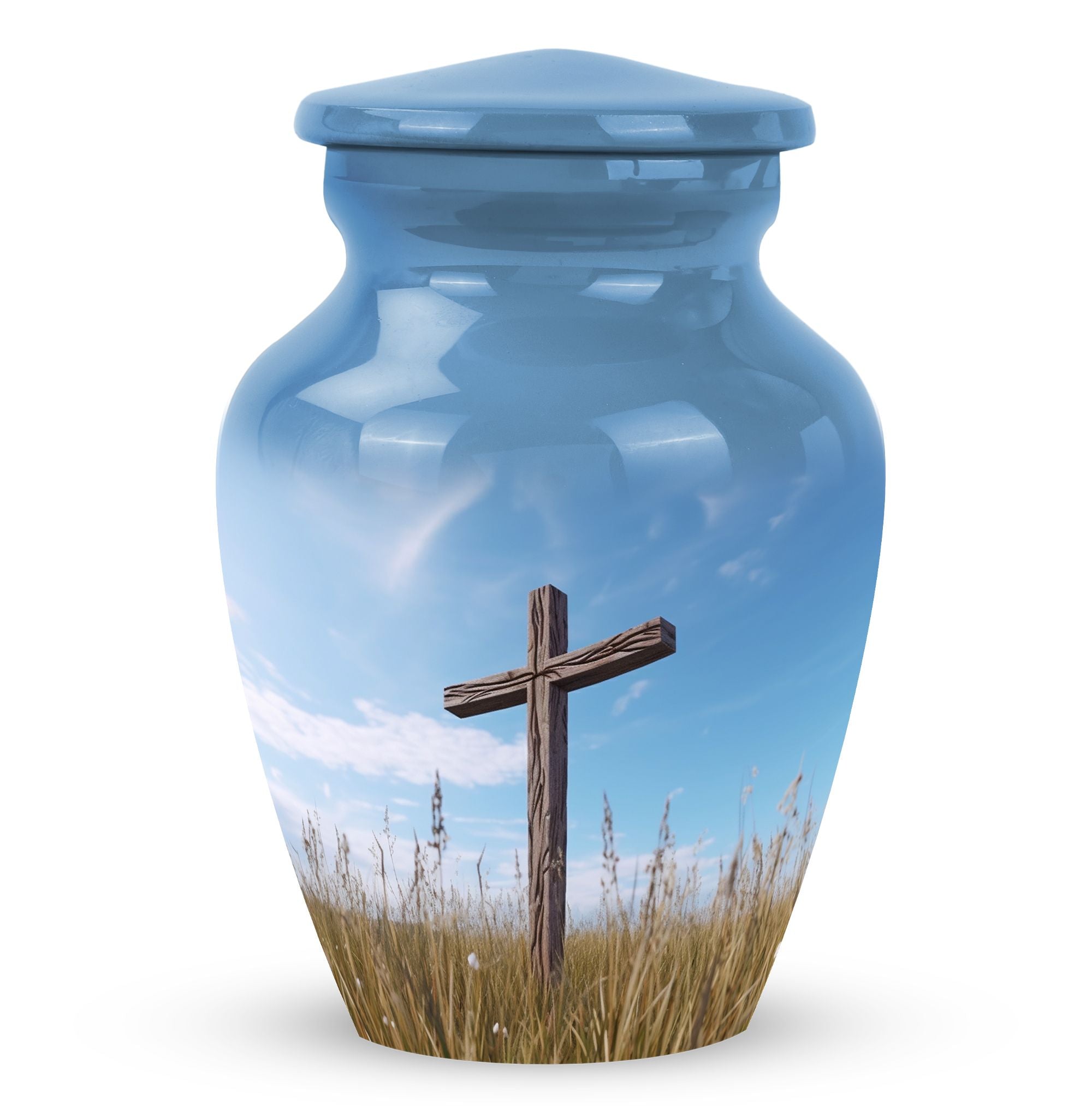Elegance merged with solemn respect and love is what you get in the Christ Urn in blue sky Cremation Urn. This classically designed cremation urn is large, tastefully accommodating up to 200 cubic inches. With a humble weight of 3.3 pounds and standing 10 inches tall, this aluminium urn is perfect for a deflected stature. Its 3 inch size is suitable for various spaces, making it easier to place without any difficulty. The package contains a plush velvet pouch that safely contains the ashes of your treasured one. Offering you an excellent canvas to immortalize memories, the urn allows you to personalize with engraved names. This Large Urn not only serves as a unique urn for dads but is also a fluent tribute to any loved one who has passed on. Crafted with meticulous detail and respect, this urn truly stands out as a modern monument to a timeless bond. All these key elements make the 'Christ Urn in blue sky Cremation Urn' not just a cremation container for ashes, but an appealing commemorative piece that honours and celebrates a life lived.