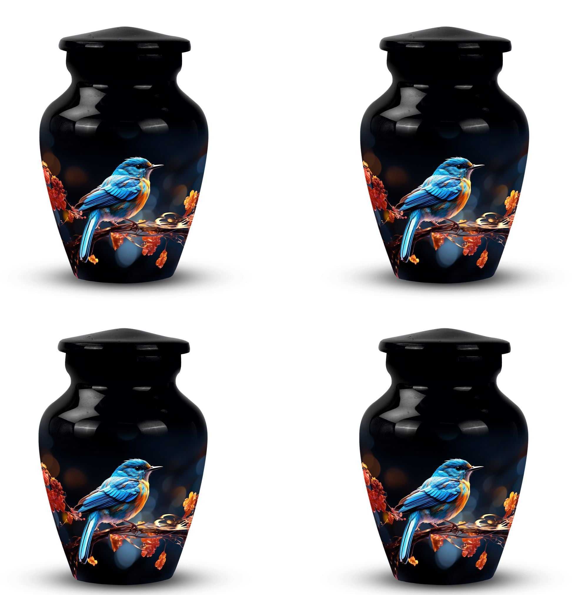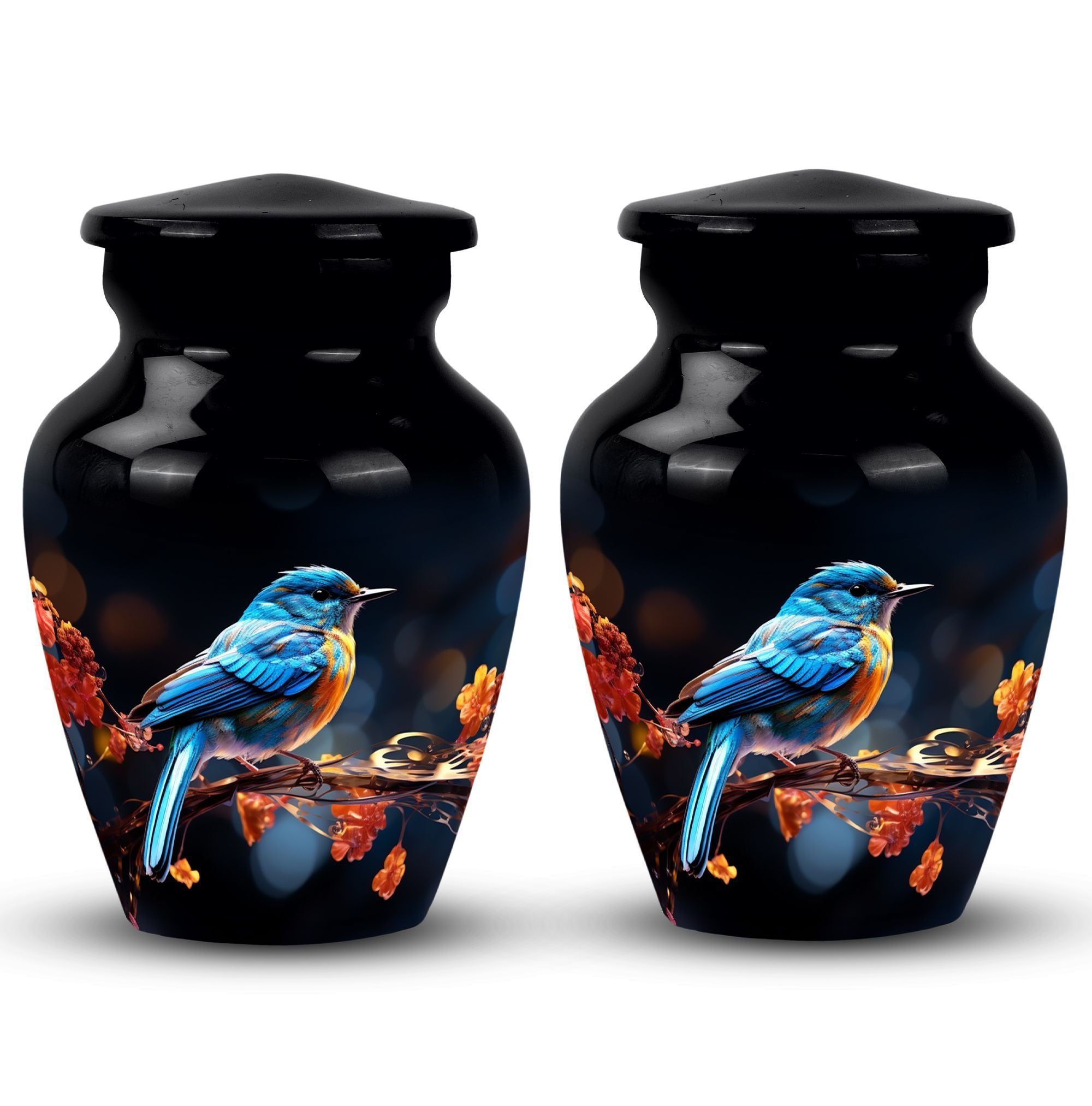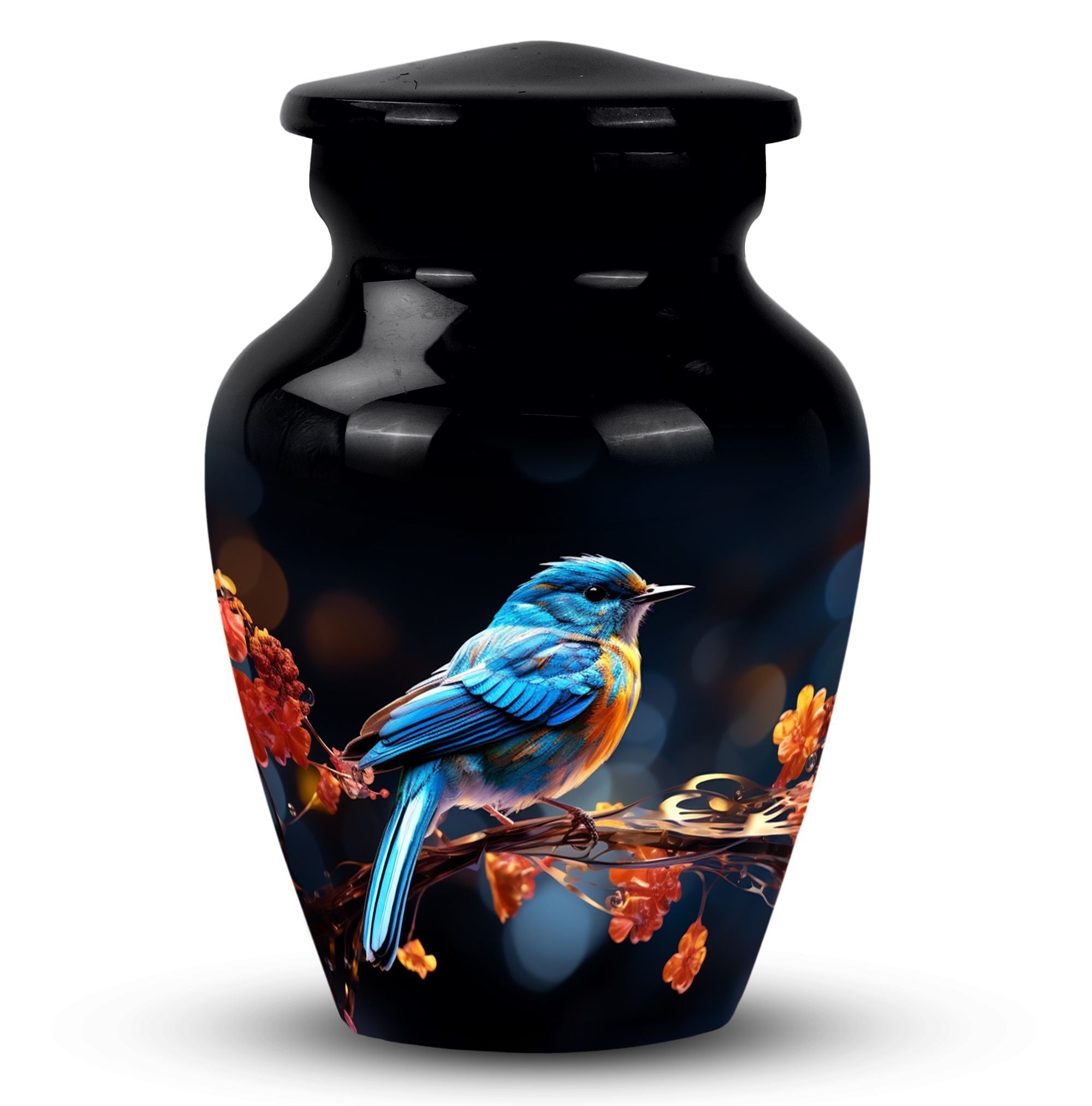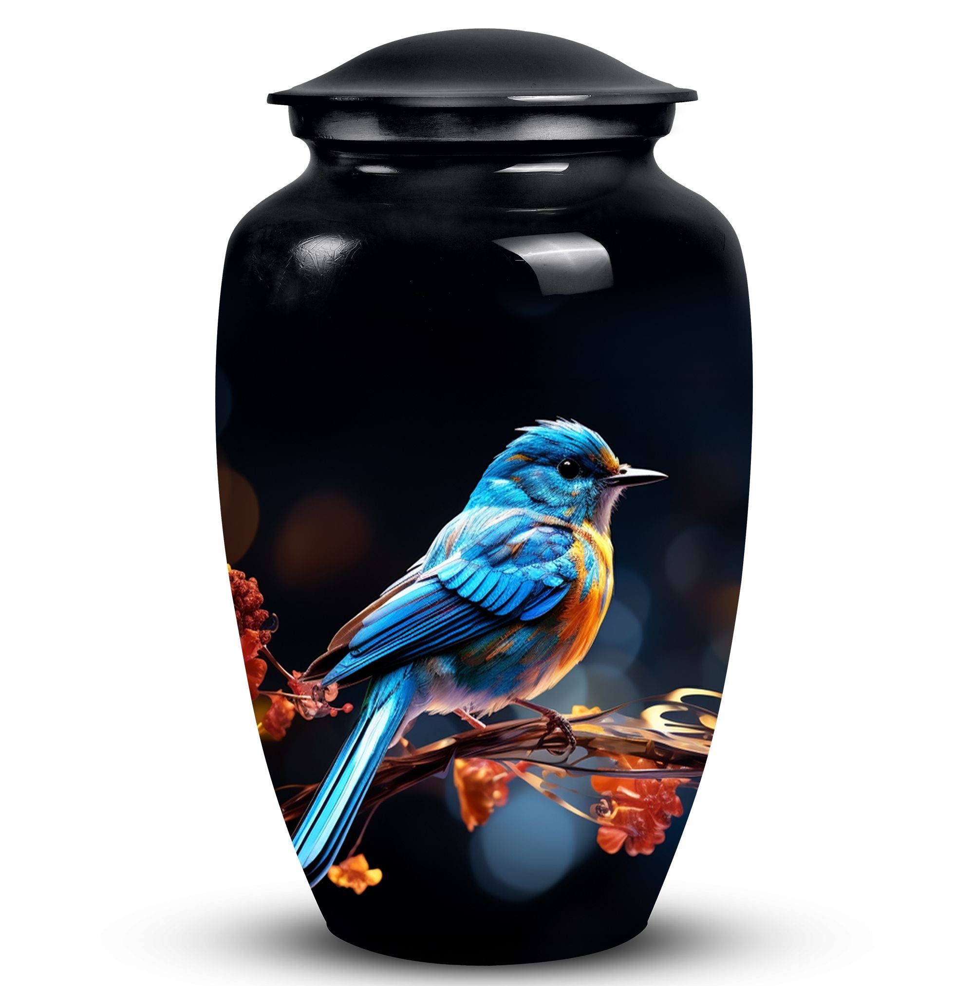 Behold the Blue Sparrow Urns for Human Ashes - a fitting tribute to your loved ones who've moved on to their eternal journey. More than just memorial gifts, this cremation urn is built to stand the test of time. Cast from sturdy aluminium and weighing in at just 3.3 pounds, each urn is meticulously crafted to reflect a unique sentimental value. Standing tall at 10 inches in height, and holding up to 200 cubic inches, this Large Urn, which comes inclusive of a velvet pouch for comforting containment of ashes, is a symbol of reverence and respect. Personalize it with engraved names, making it an irreplaceable keepsake for remembering Dad or Mom. The 3 Inch size lends grandeur without commanding too much space. As Metal Urns for Human Ashes go, our unique urns stand out for their respectful elegance. A fitting testimonial for those who liked Decorative Urns for Human Ashes. Both a respectful tribute to the departed and a beacon of comfort for the living, the Blue Sparrow Urn is a symbol of enduring love, and an assurance that those who've left are always in our thoughts.