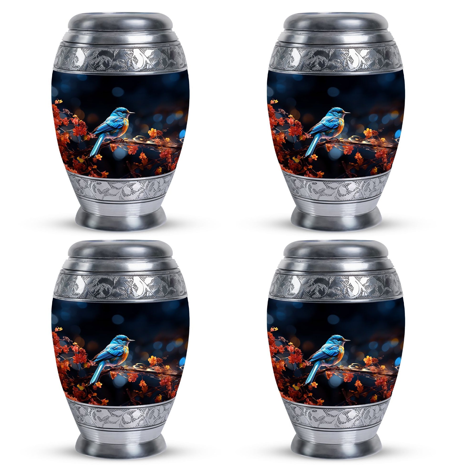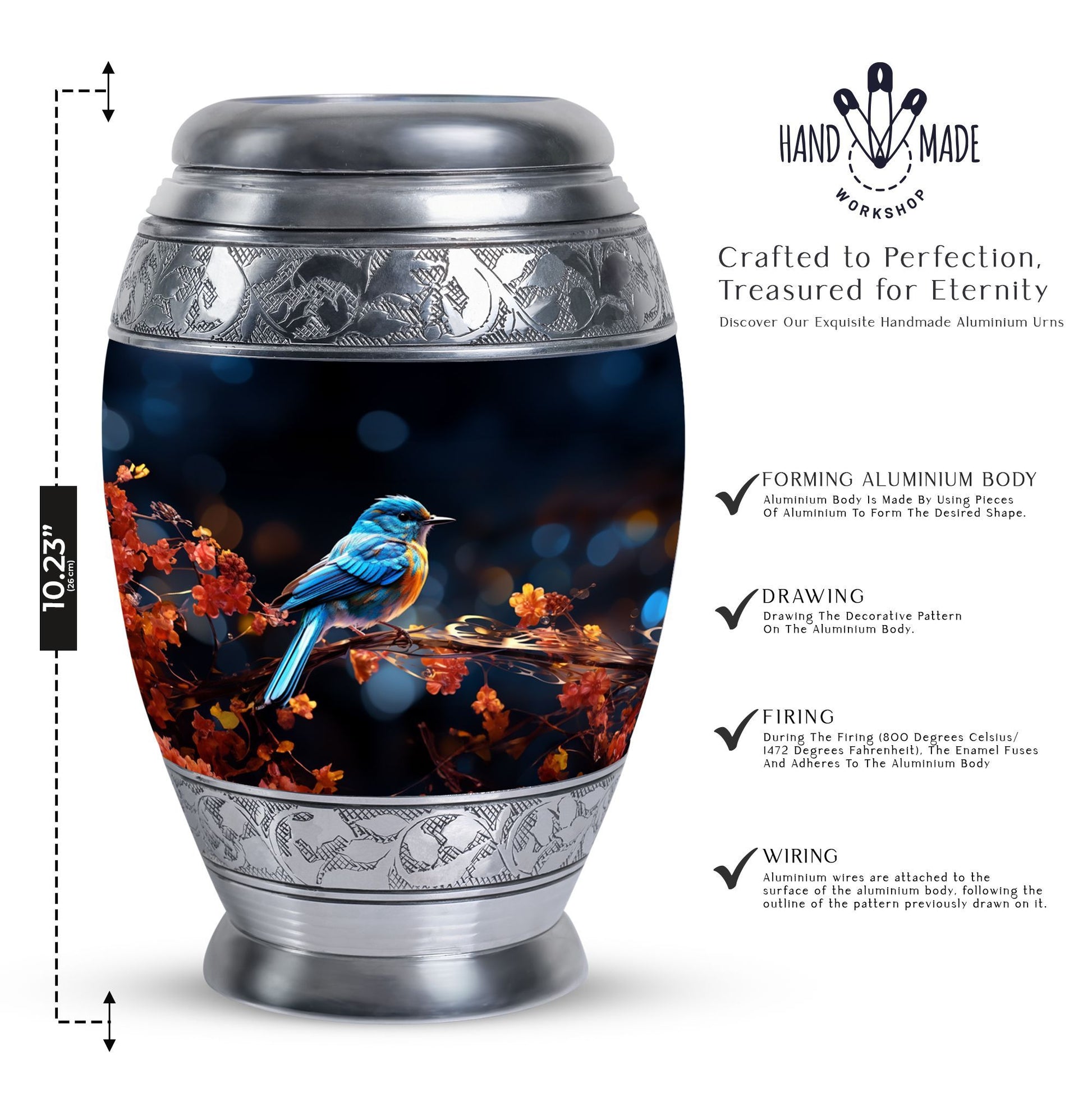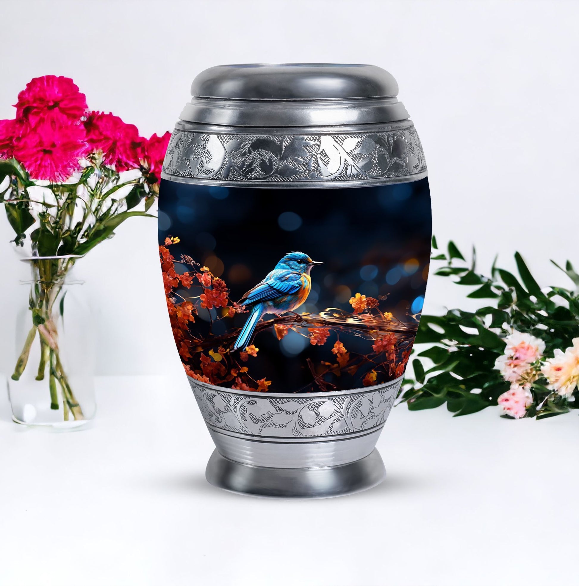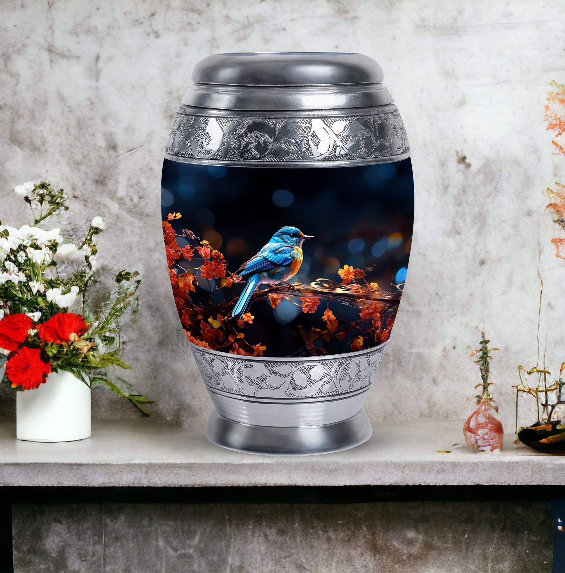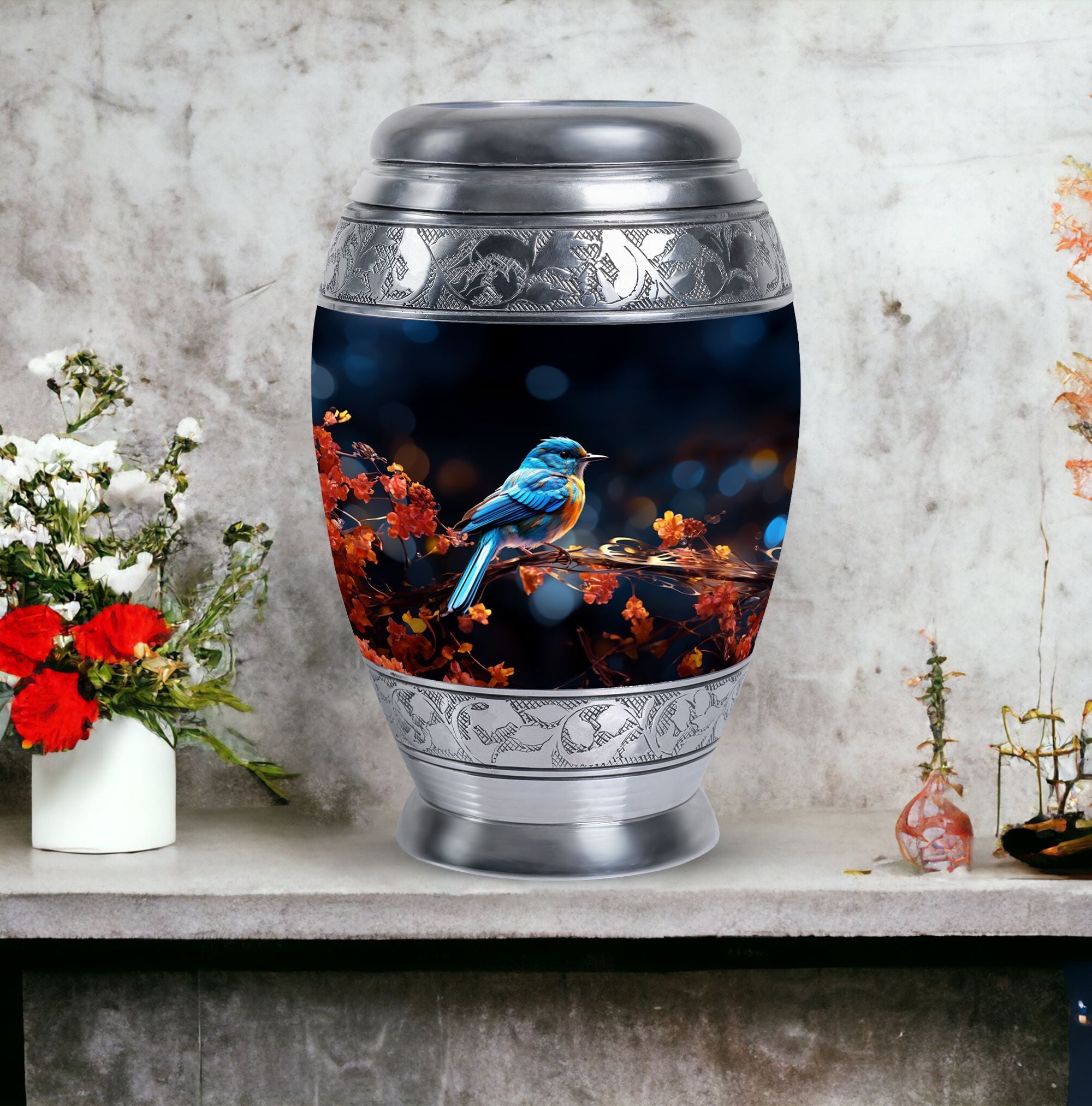 Endow your loved ones with a prestigious resting place using our Blue Sparrow Large Urns for Human Ashes. Ideal for both adults and seniors, these memorial gifts offer a unique means of expressing your condolences while cherishing those who mean a lot to us. At 10 inches tall and a weight of 3.3 pounds, this 3-inch cremation urn comes in a classic urn design and is inherently magnificent. Crafted with utmost precision from premium-quality Aluminium, the urn's capacity is 200 cubic inches, demonstrating its large size. On receiving your order, you will find your urn encased in a delicate velvet pouch to safely contain the ashes. For a hands-on touch, take advantage of our customization feature to personalize the urn with engraved names. This product is an exceptional choice if you're seeking Unique Urns for Dad or Decorative Urns for Human Ashes. With its subtle design and unmatched quality, this organically exclusive piece serves as an excellent Urn for Ashes for Mom. Remember your loved ones in a special way with our product that combines love, respect, and dignity.