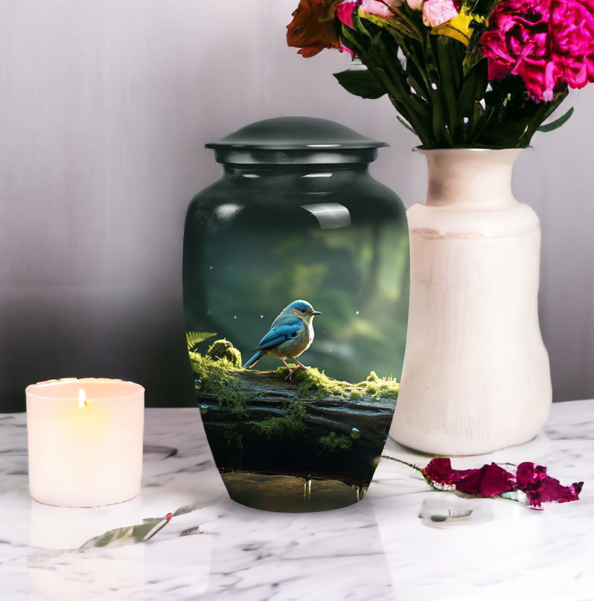 Remember your loved ones with our carefully crafted 'Blue Sparrow Cremation Urn.' The elegant 10-inch tall piece, weighing just 3.3 pounds, ebbs a classic and comforting presence. The Large Urn's construction from durable aluminium ensures it maintains its sleek appearance over time. With a capacity of 200 cubic inches, this urn suitably holds human cremation ashes. For an extra touch of sentimentality, personalization options are available with engraved names. The urn arrives with a velvet pouch for containment of ashes, further providing a dignified storage solution. This tailored keepsake also fits into the 'memorial urns' category, seamlessly blending tradition and modernity. As a noteworthy mention, our 'Blue Sparrow Cremation Urn' is suitable for those searching for 'Modern Urns for Ashes' or 'Metal Urns for Ashes.