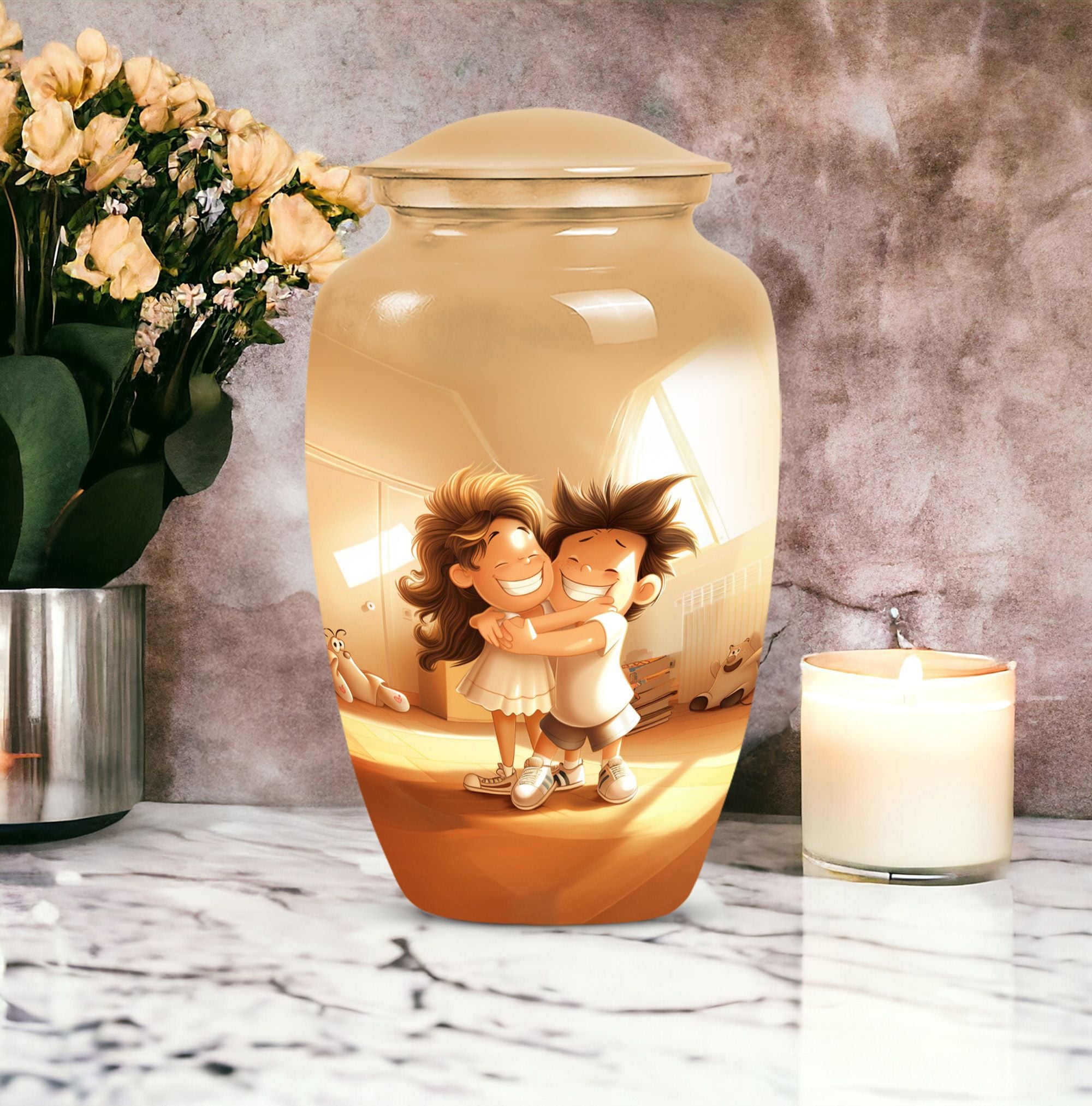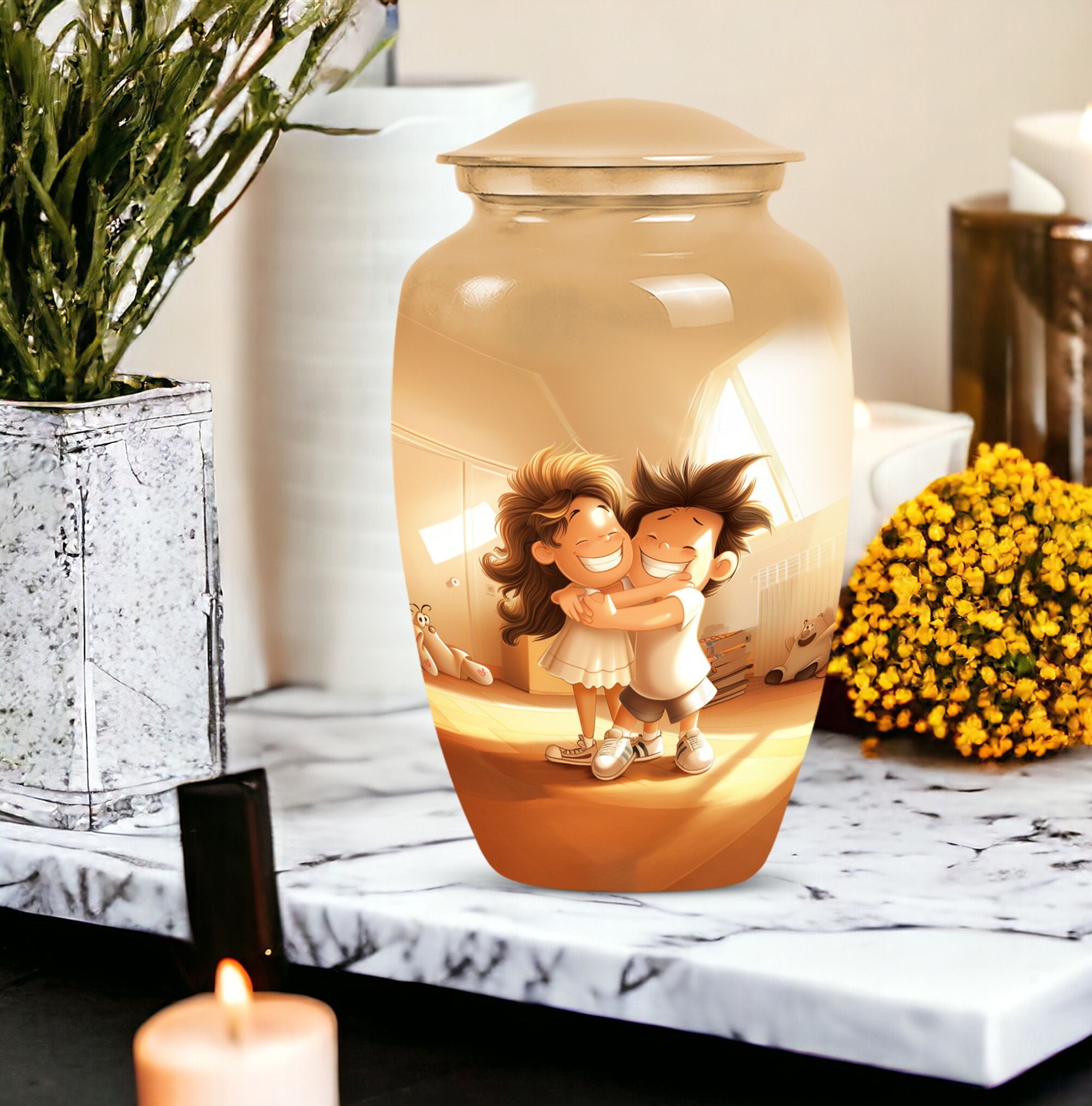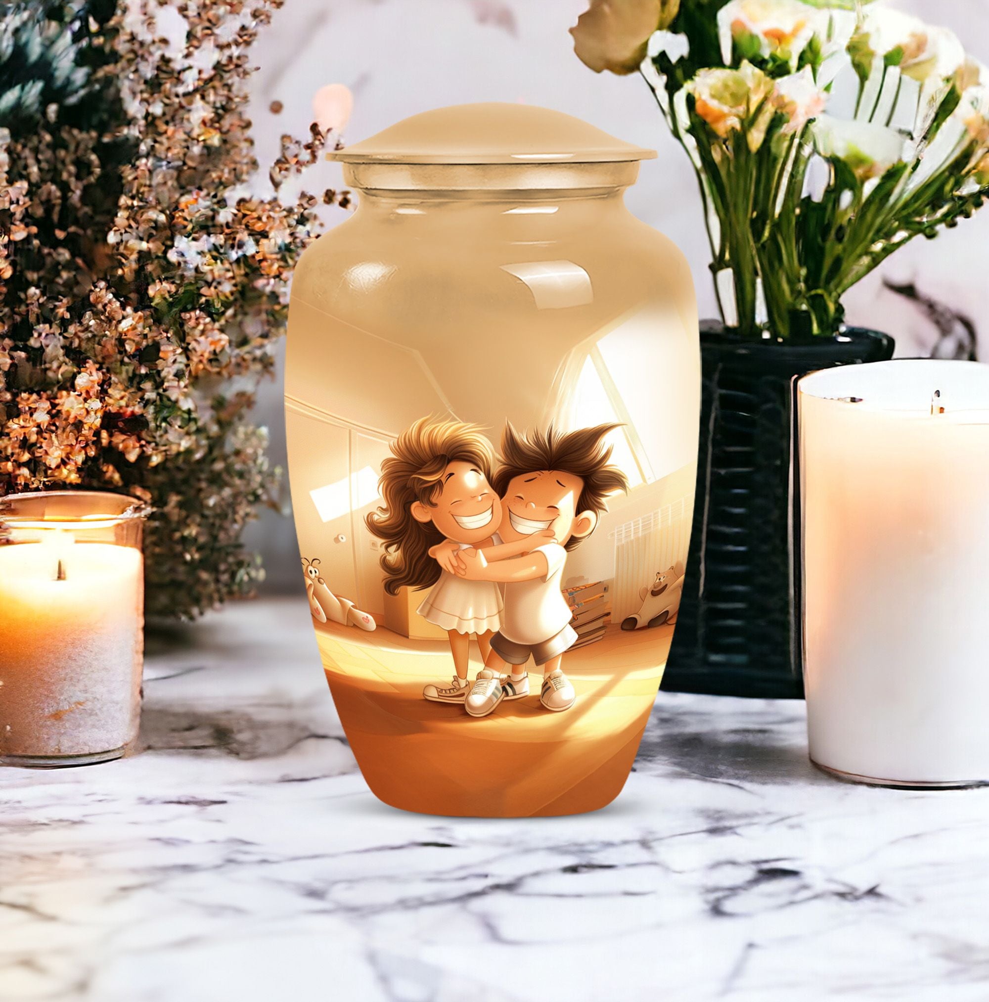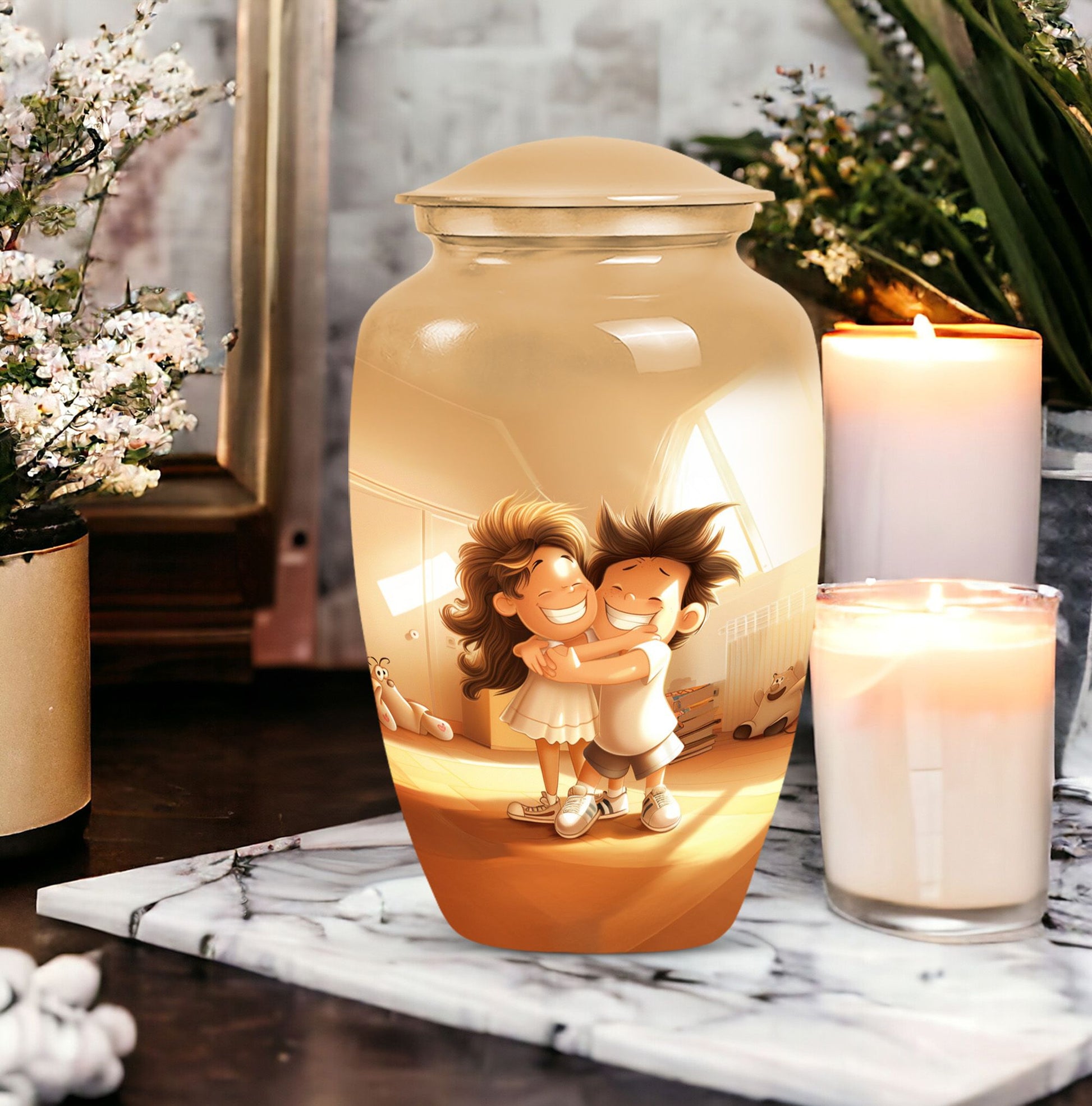Immerse yourself in the timeless and abstract beauty of our Aluminium-made 10 inch brother and sister urn, a magnificent commemorative vessel for burial ashes. Not just a burial urn for cremation ashes, this large urn is also a memorial tribute, a poignant memento to remind us of the bond between siblings even after their time on this physical plane. Weighing at 3.3 pounds, this urn possesses an inherent stability, making it a secure and fitting resting place for your loved ones. Its scene-stealing, classic urn design effortlessly merges the old with the new, resulting in a piece that resonates with people across all ages. It also comes with a velvet pouch, a safe and snug container for ashes. Should you wish to give this item a more personal touch, name engraving customization is also available. Capable of containing 200 cubic inches in volume, every inch of this urn has been skillfully crafted. For those in the market for cremation urns for human ashes, this product, featuring striking aesthetic qualities, presents a perfect mix of form and function.