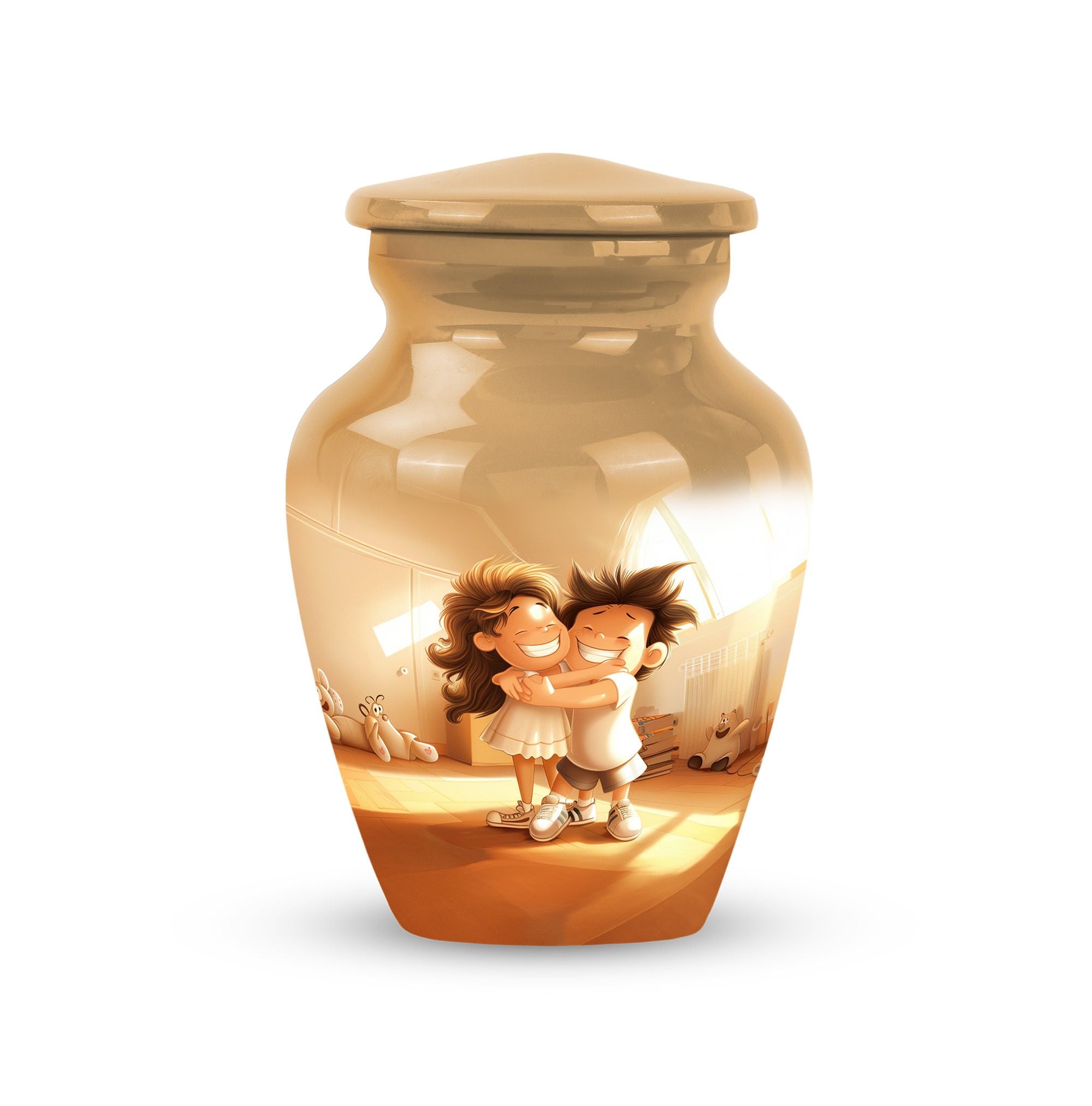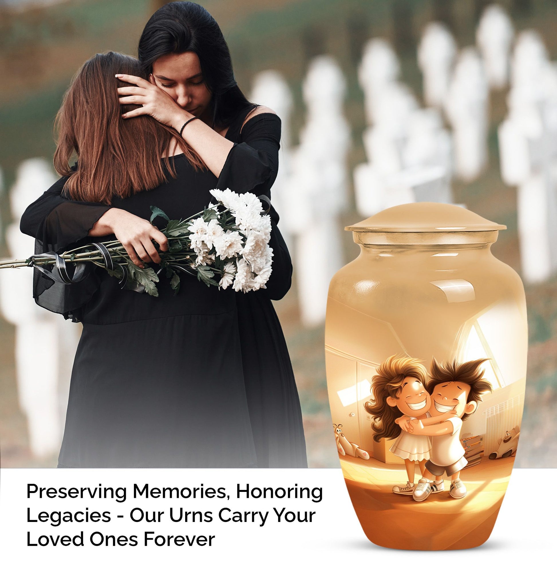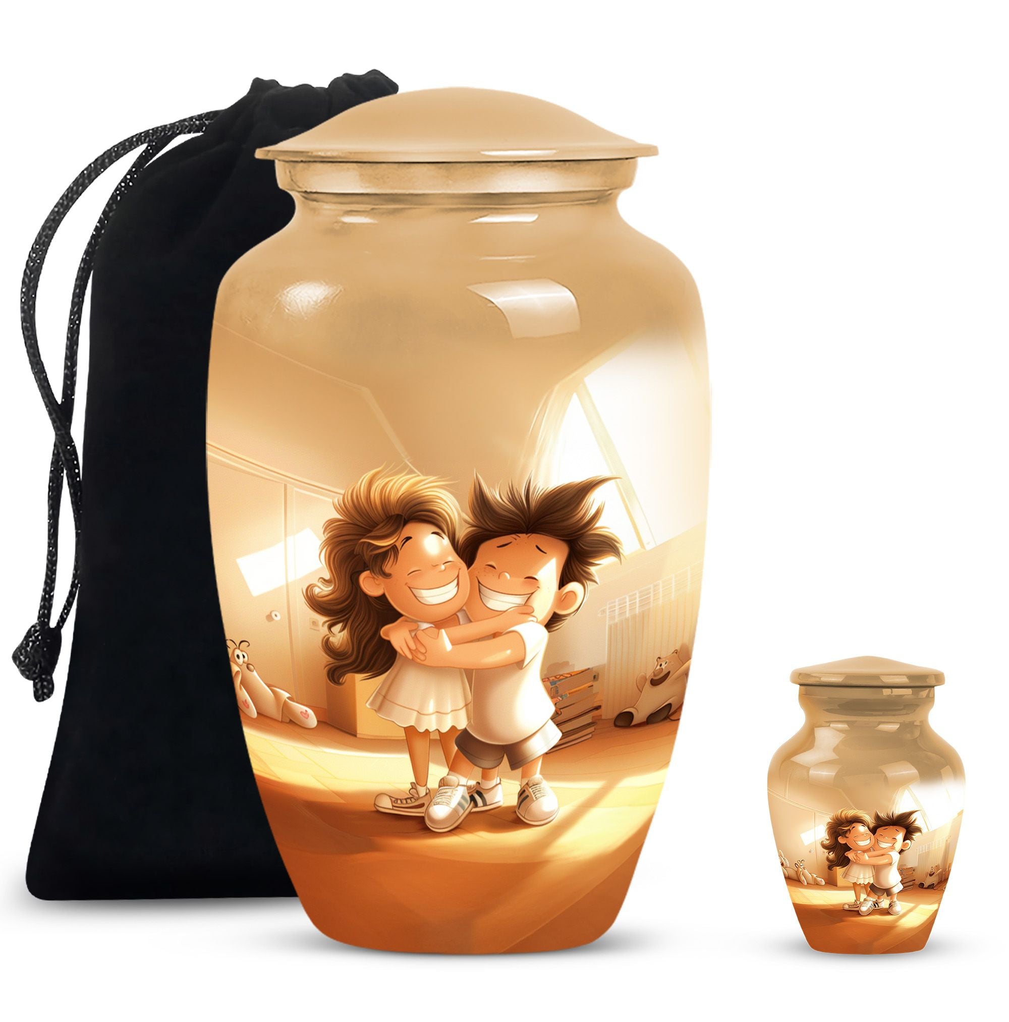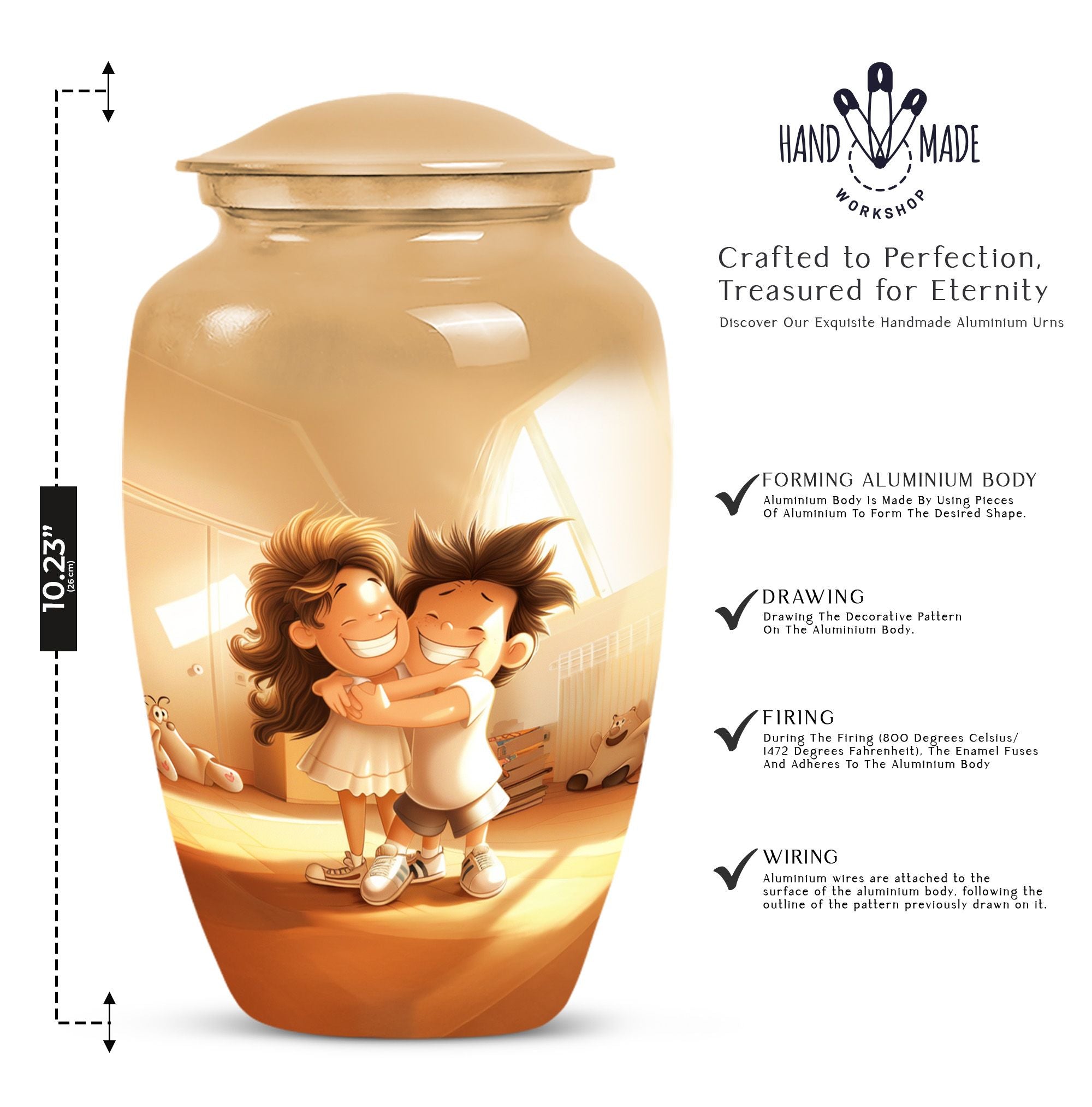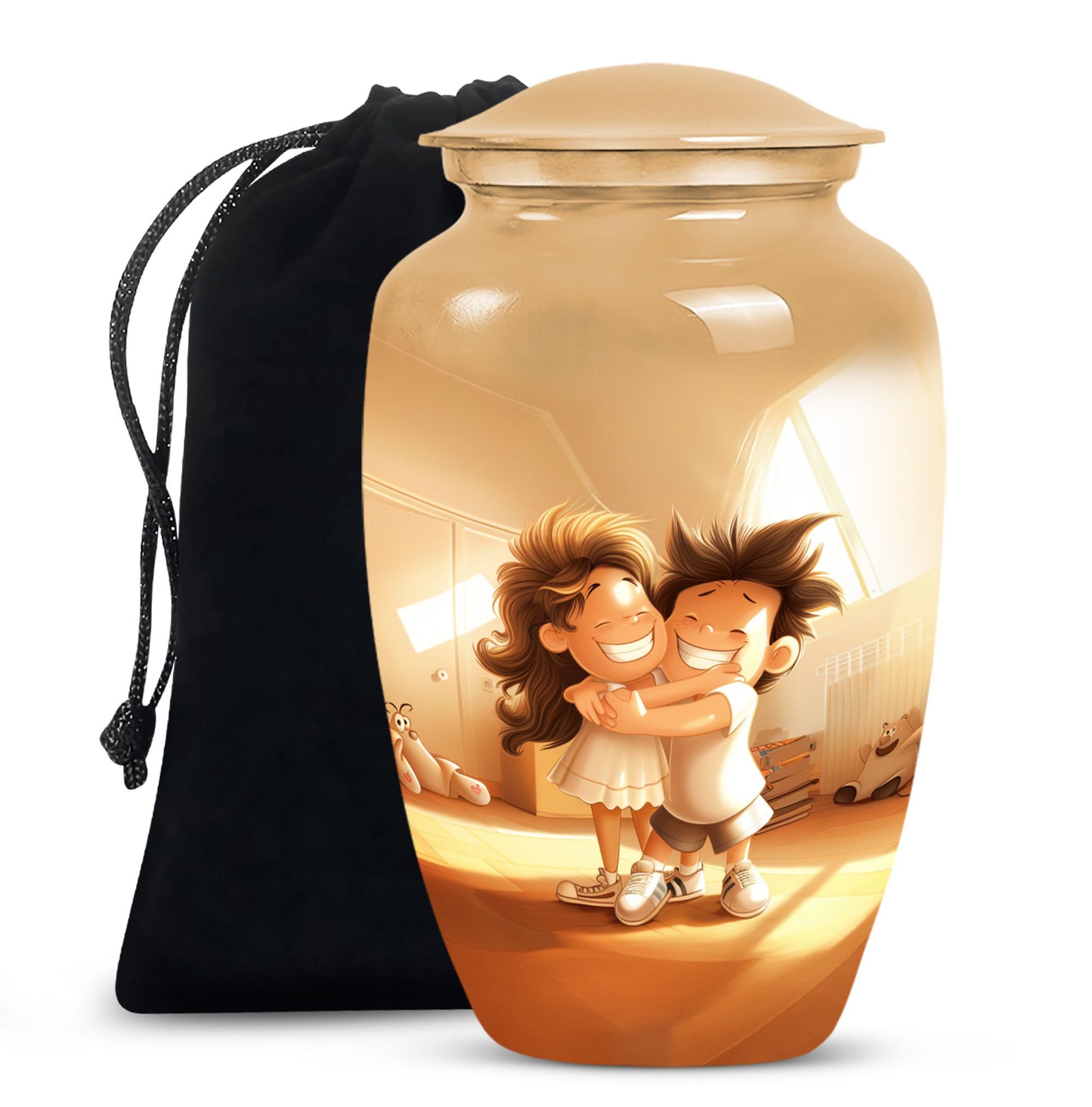 Immerse yourself in the timeless and abstract beauty of our Aluminium-made 10 inch brother and sister urn, a magnificent commemorative vessel for burial ashes. Not just a burial urn for cremation ashes, this large urn is also a memorial tribute, a poignant memento to remind us of the bond between siblings even after their time on this physical plane. Weighing at 3.3 pounds, this urn possesses an inherent stability, making it a secure and fitting resting place for your loved ones. Its scene-stealing, classic urn design effortlessly merges the old with the new, resulting in a piece that resonates with people across all ages. It also comes with a velvet pouch, a safe and snug container for ashes. Should you wish to give this item a more personal touch, name engraving customization is also available. Capable of containing 200 cubic inches in volume, every inch of this urn has been skillfully crafted. For those in the market for cremation urns for human ashes, this product, featuring striking aesthetic qualities, presents a perfect mix of form and function.