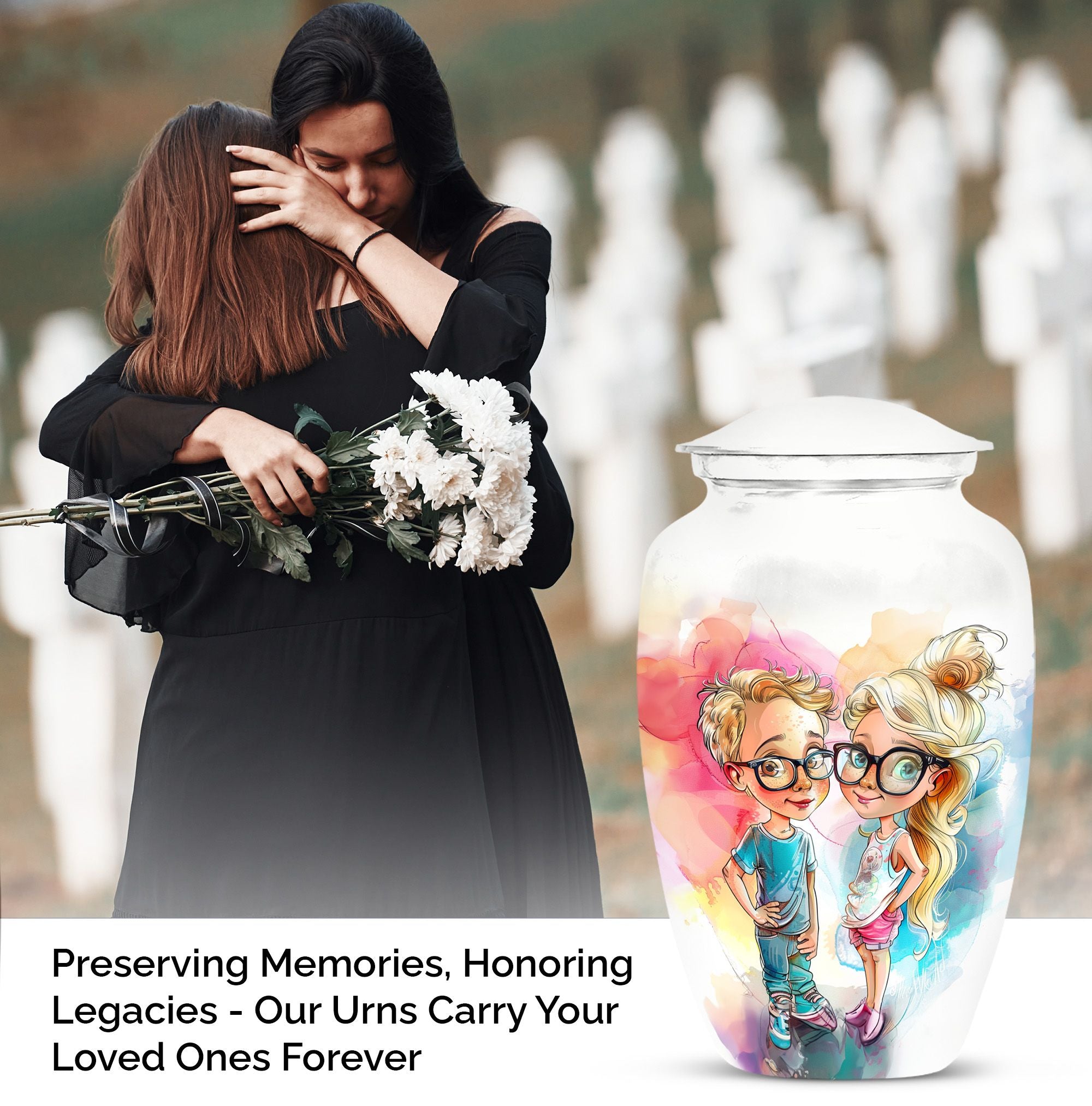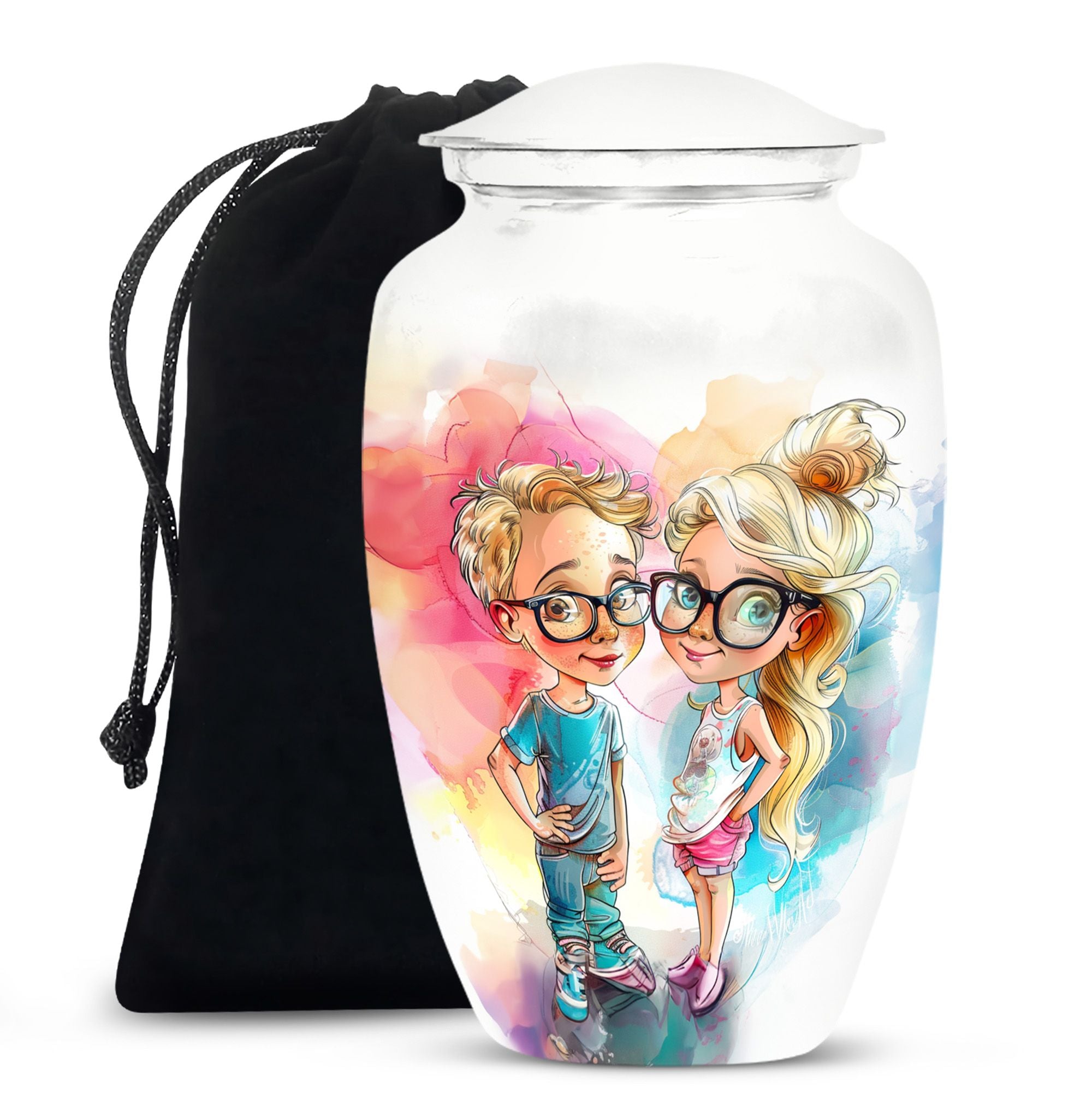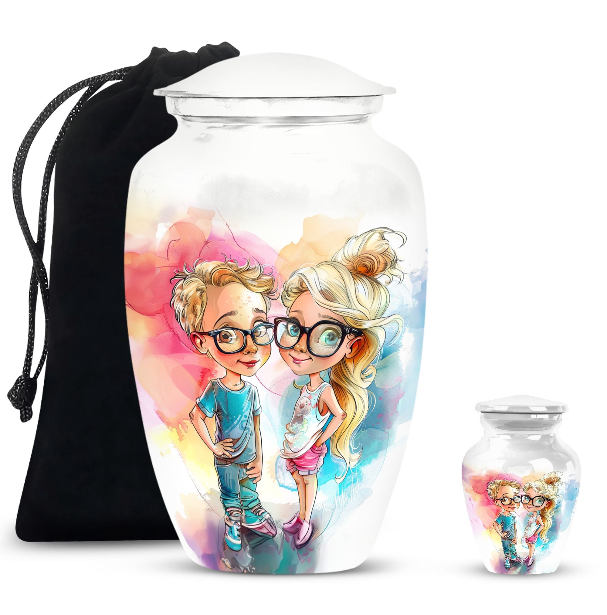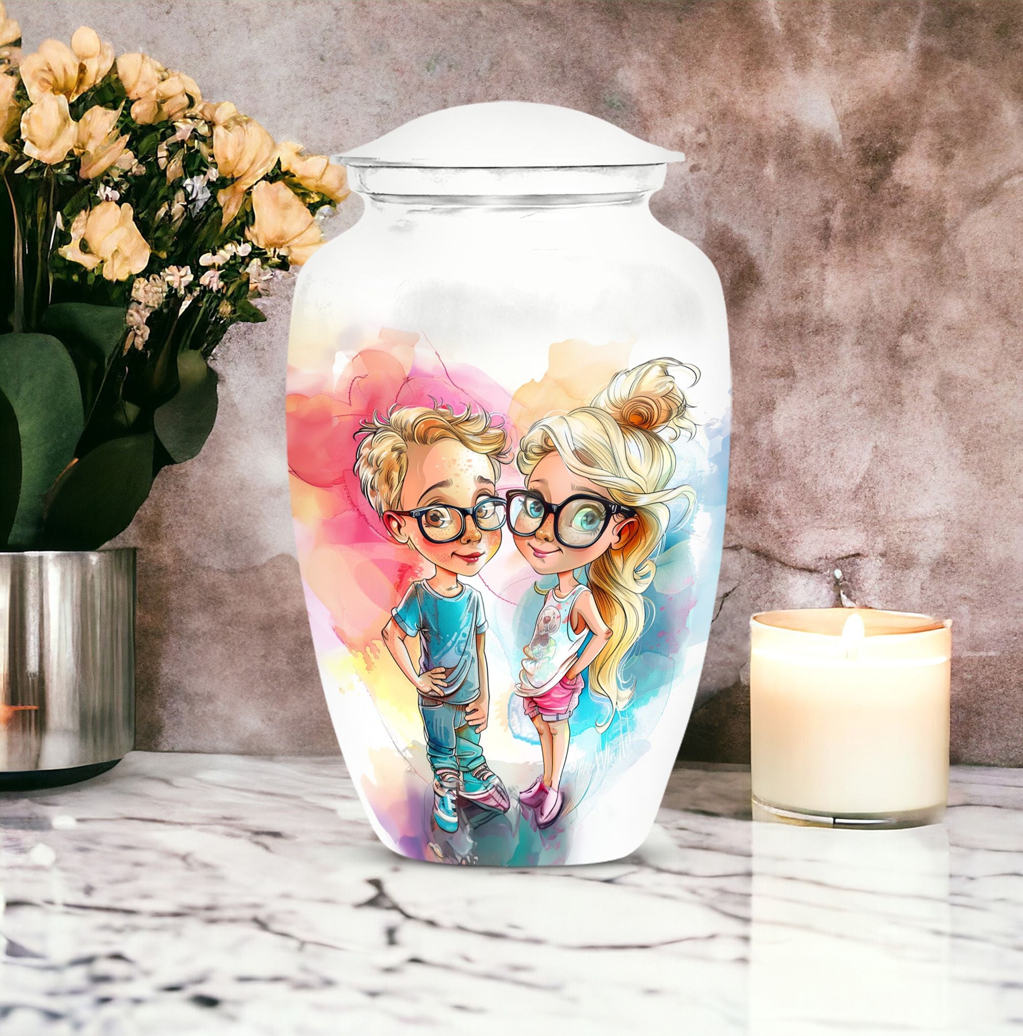 Make a profound homage to your departed loved one with our graceful 'Brother and Sister' urn, an embodiment of timelessness and tranquility. Crafted meticulously from sturdy Aluminium, this large urn strikes a delicate balance between durability and elegance. Measuring 10 inches in height with a generous capacity of 200 cubic inches, it can dutifully contain adult size cremation ashes. Despite its size, this urn weighs just 3.3 pounds, making it easy to transport or reposition as you see fit. An abstract theme graces the urn, charging it with a transcendent and ethereal appeal. We understand that personalization is an essential part of grieving and honor, so we offer the provision to personalize the urn with engraved names. To safeguard the ashes, each order also includes a velvet pouch. Whether you prefer the conventional terms 'cremation adult urns for human ashes men,' 'burial urns for cremation ashes,' or 'human ash adult urns,' our Classic Urn is a perfect choice to honor and remember your loved one.