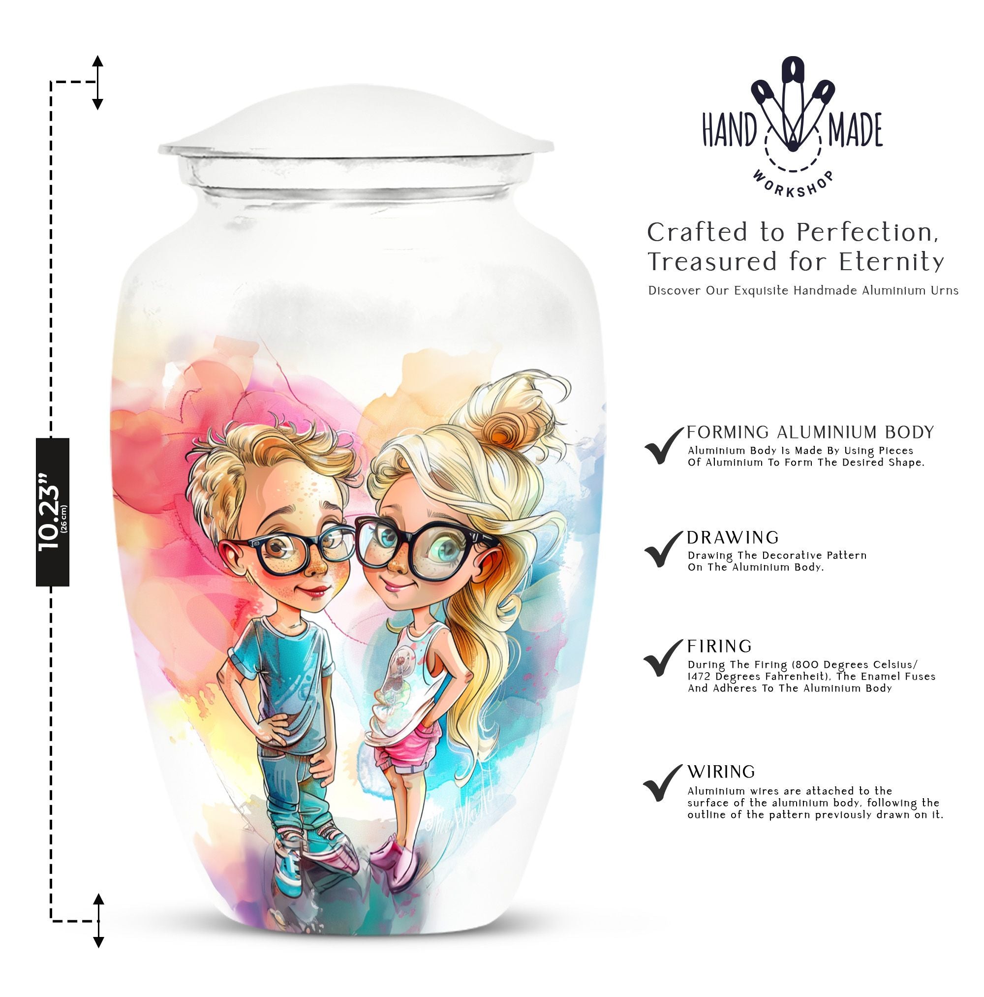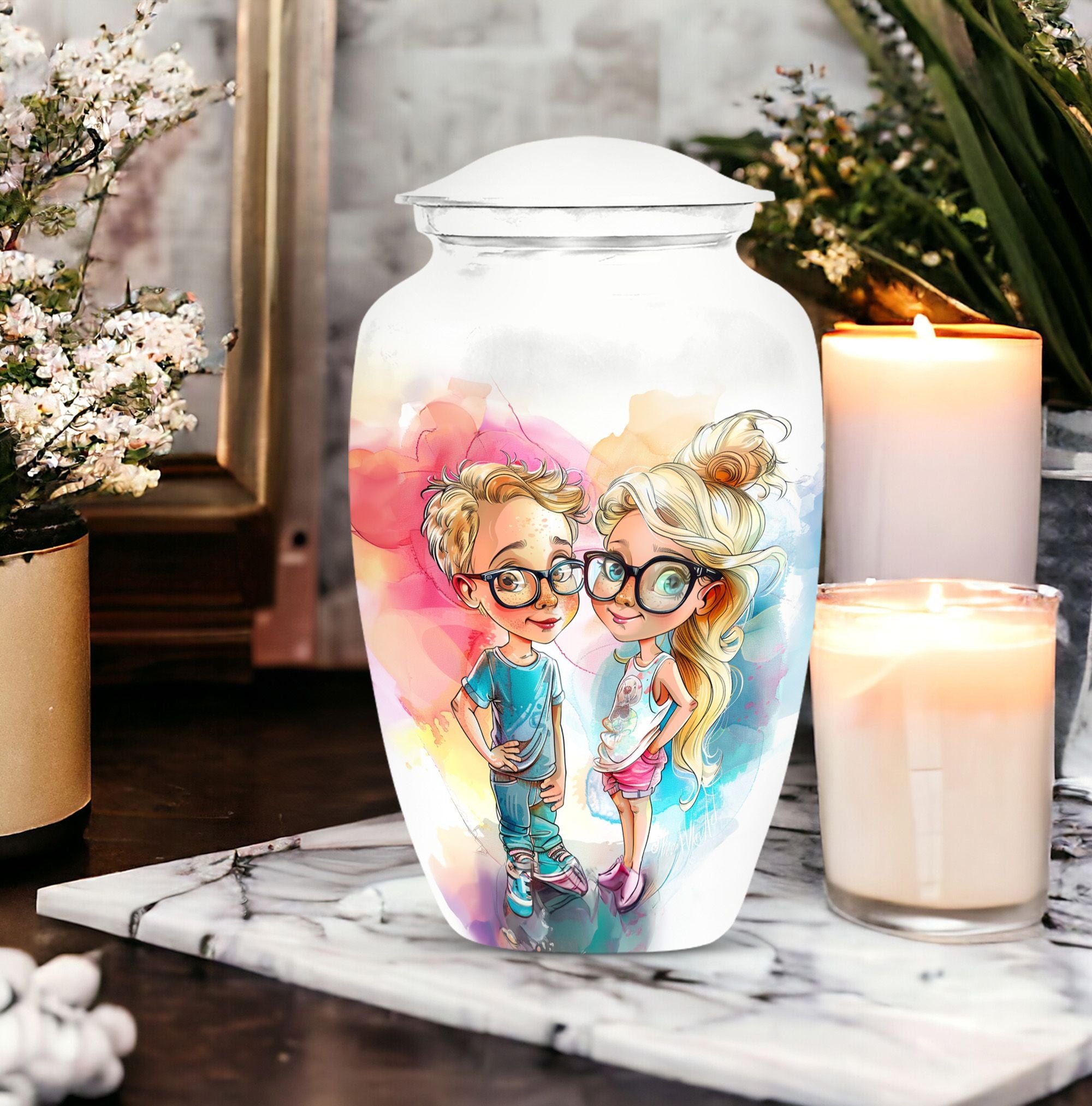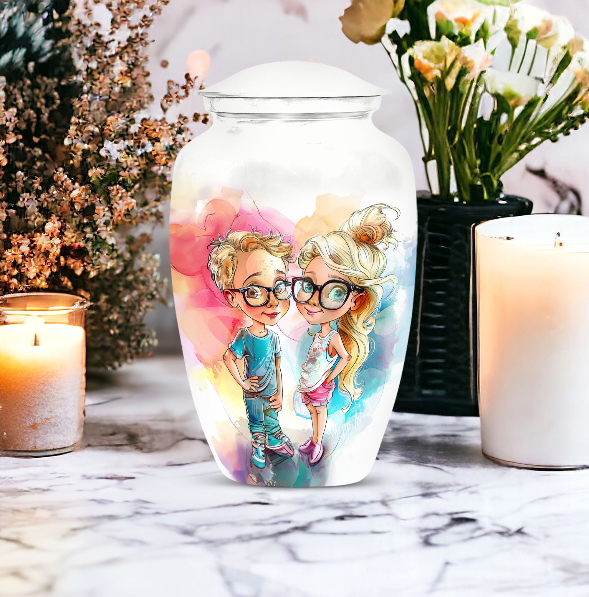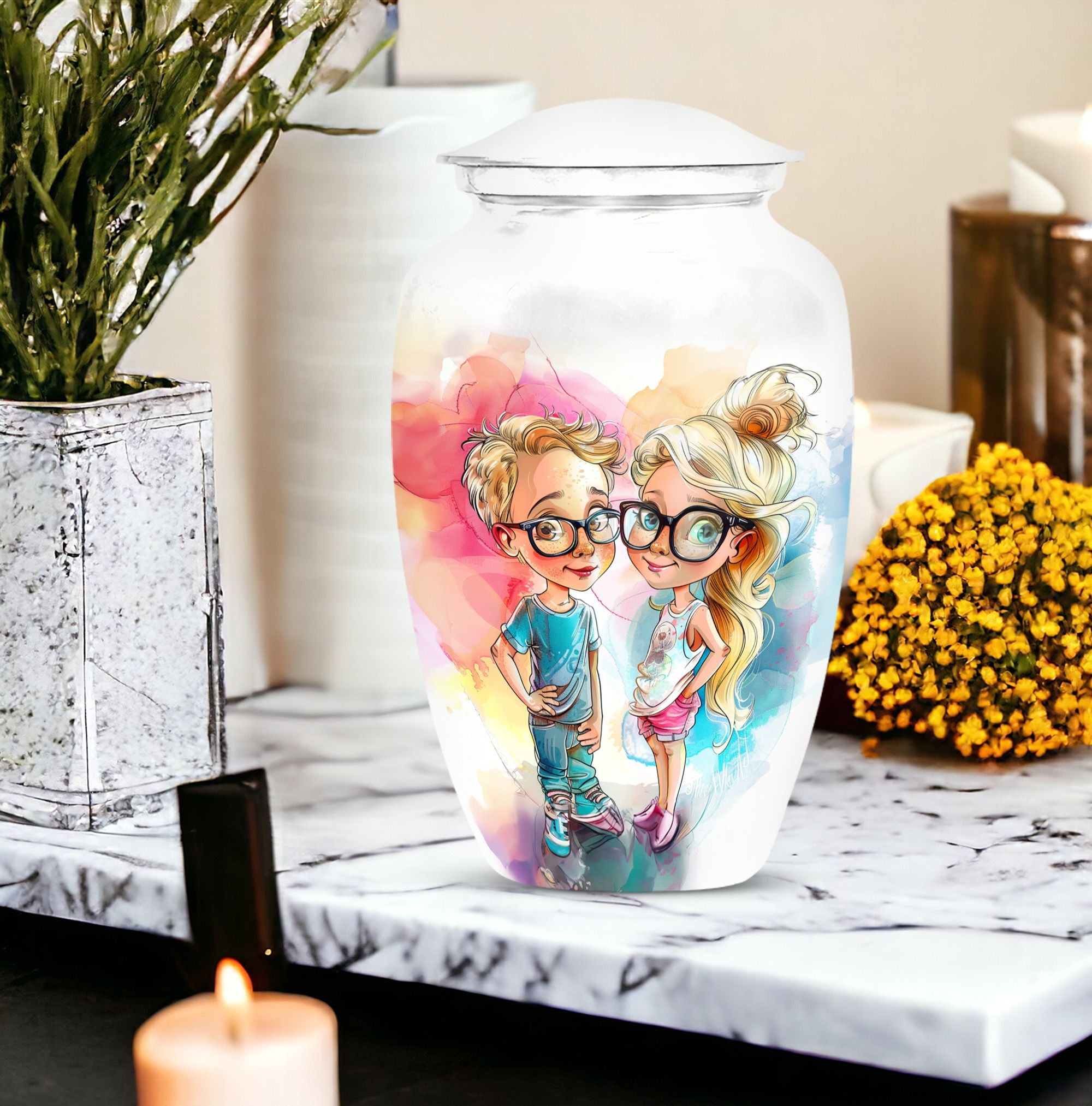 Make a profound homage to your departed loved one with our graceful 'Brother and Sister' urn, an embodiment of timelessness and tranquility. Crafted meticulously from sturdy Aluminium, this large urn strikes a delicate balance between durability and elegance. Measuring 10 inches in height with a generous capacity of 200 cubic inches, it can dutifully contain adult size cremation ashes. Despite its size, this urn weighs just 3.3 pounds, making it easy to transport or reposition as you see fit. An abstract theme graces the urn, charging it with a transcendent and ethereal appeal. We understand that personalization is an essential part of grieving and honor, so we offer the provision to personalize the urn with engraved names. To safeguard the ashes, each order also includes a velvet pouch. Whether you prefer the conventional terms 'cremation adult urns for human ashes men,' 'burial urns for cremation ashes,' or 'human ash adult urns,' our Classic Urn is a perfect choice to honor and remember your loved one.