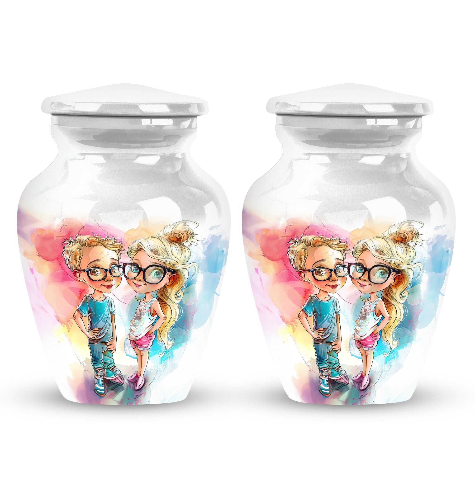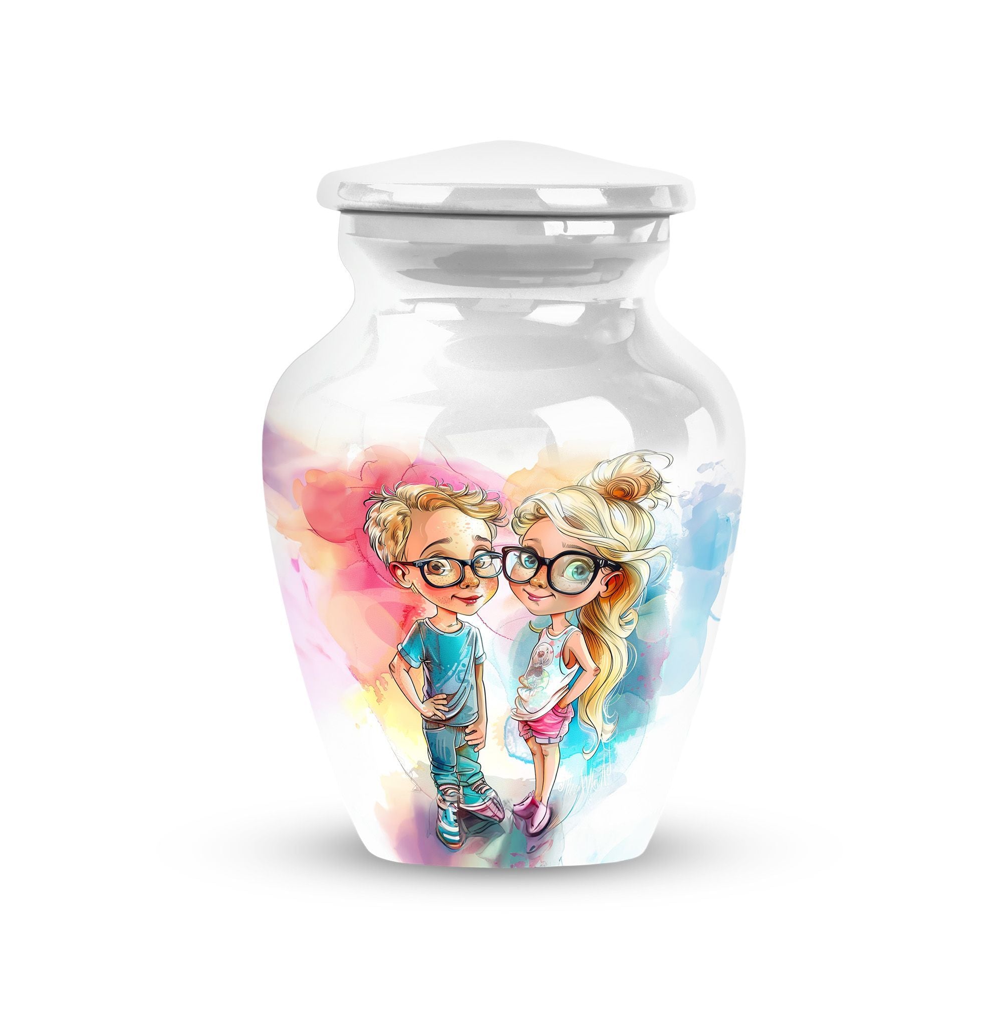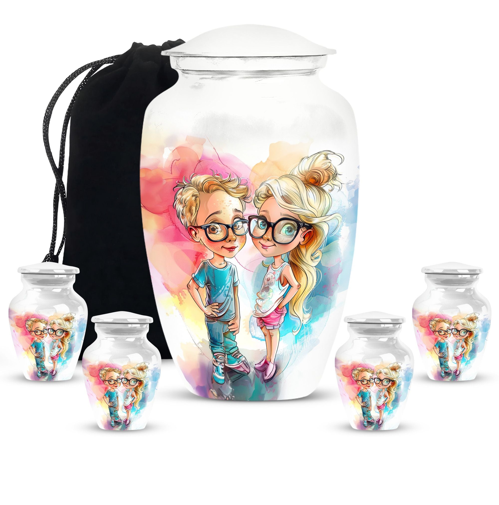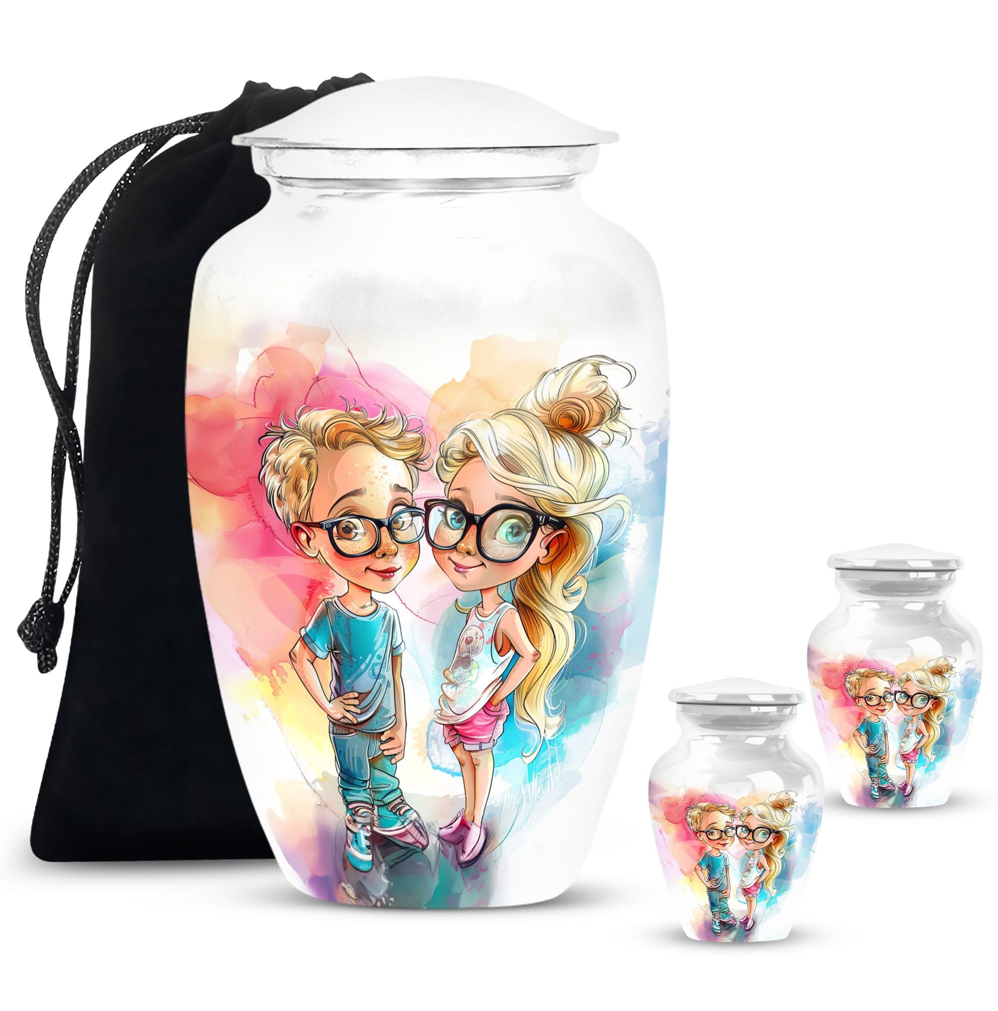 Make a profound homage to your departed loved one with our graceful 'Brother and Sister' urn, an embodiment of timelessness and tranquility. Crafted meticulously from sturdy Aluminium, this large urn strikes a delicate balance between durability and elegance. Measuring 10 inches in height with a generous capacity of 200 cubic inches, it can dutifully contain adult size cremation ashes. Despite its size, this urn weighs just 3.3 pounds, making it easy to transport or reposition as you see fit. An abstract theme graces the urn, charging it with a transcendent and ethereal appeal. We understand that personalization is an essential part of grieving and honor, so we offer the provision to personalize the urn with engraved names. To safeguard the ashes, each order also includes a velvet pouch. Whether you prefer the conventional terms 'cremation adult urns for human ashes men,' 'burial urns for cremation ashes,' or 'human ash adult urns,' our Classic Urn is a perfect choice to honor and remember your loved one.